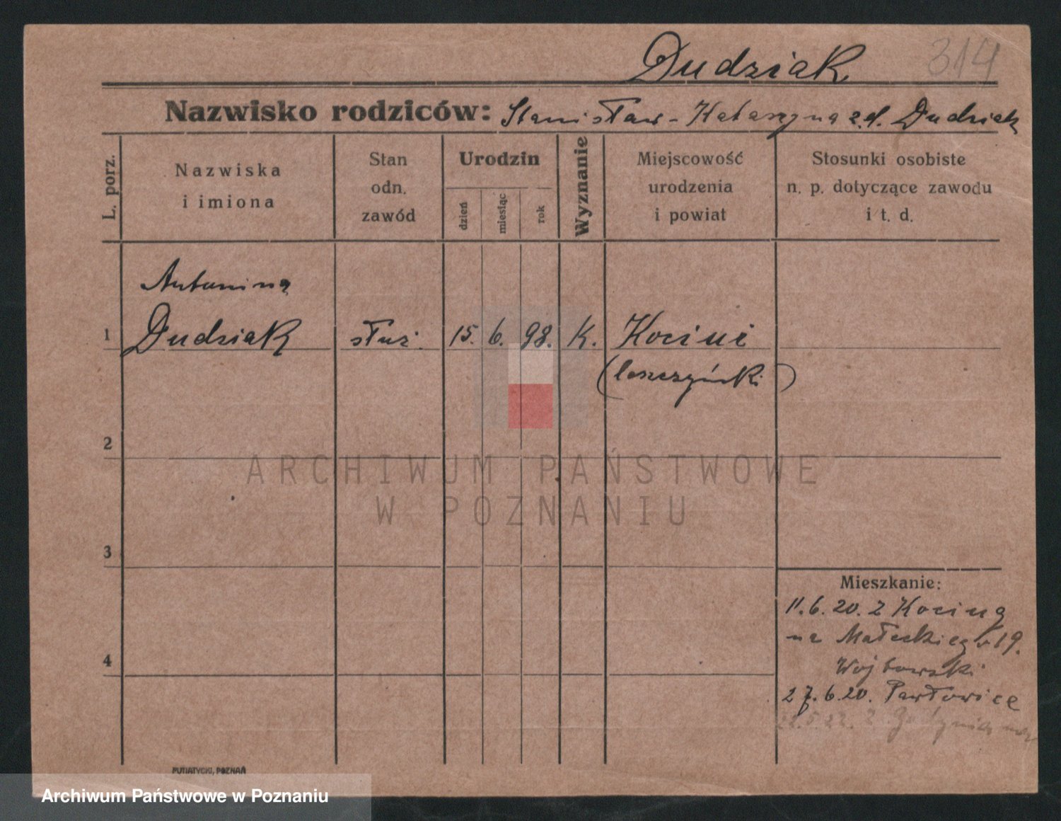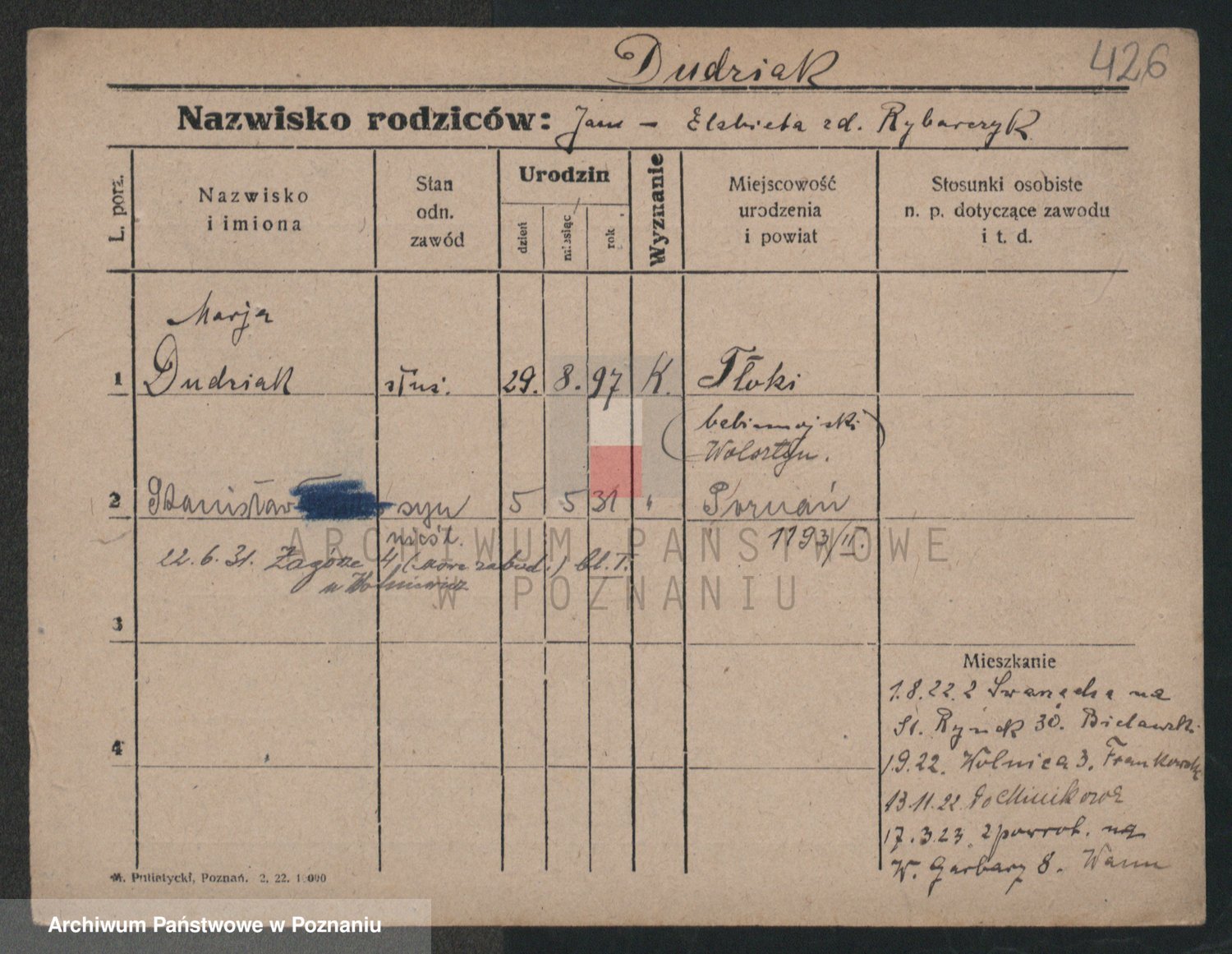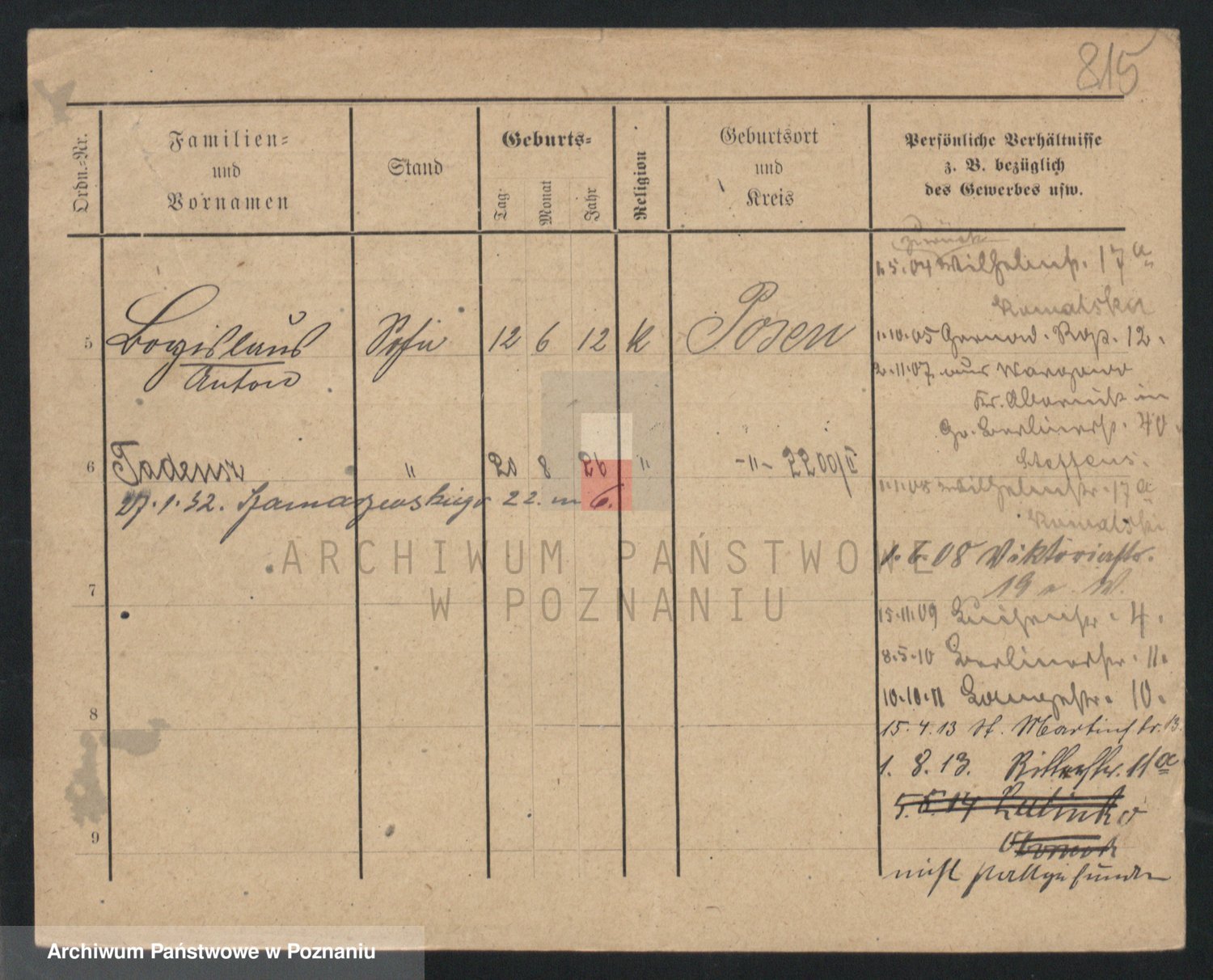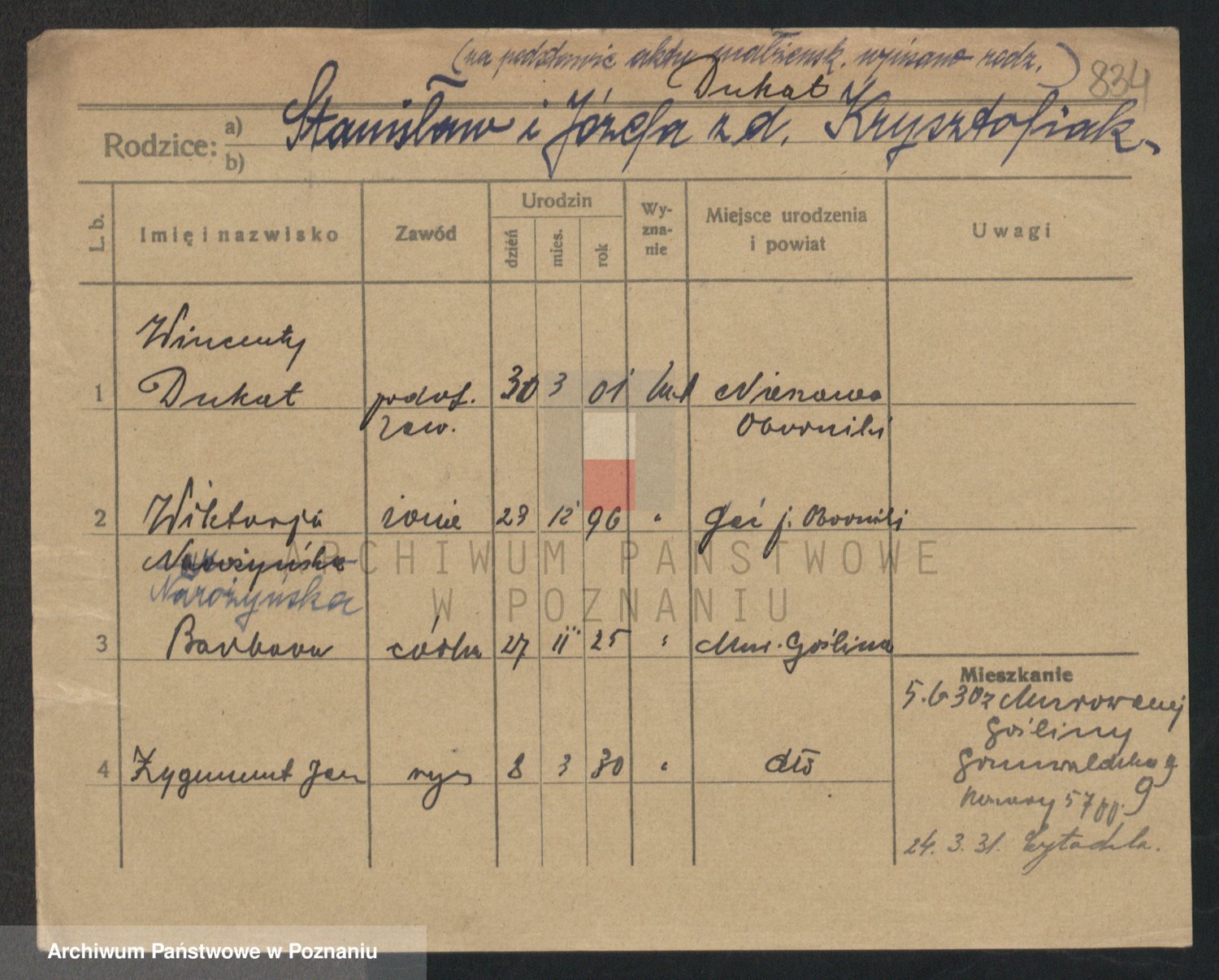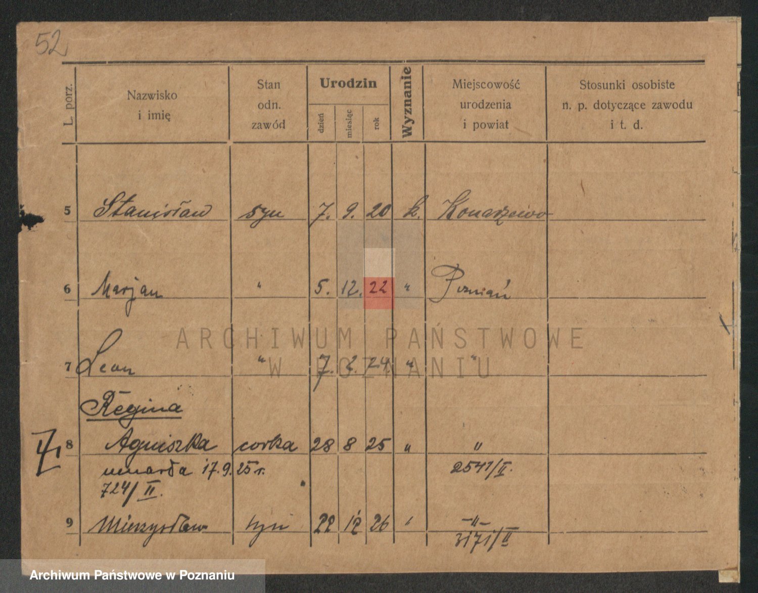 Podgląd karty osobowej dostępny jest po kliknięciu na nazwisko lub ikonkę karty. Można dokonywać powiększenia (ikony na górze) lub przechodzić między kolejnymi skanami (strzałki po bokach).