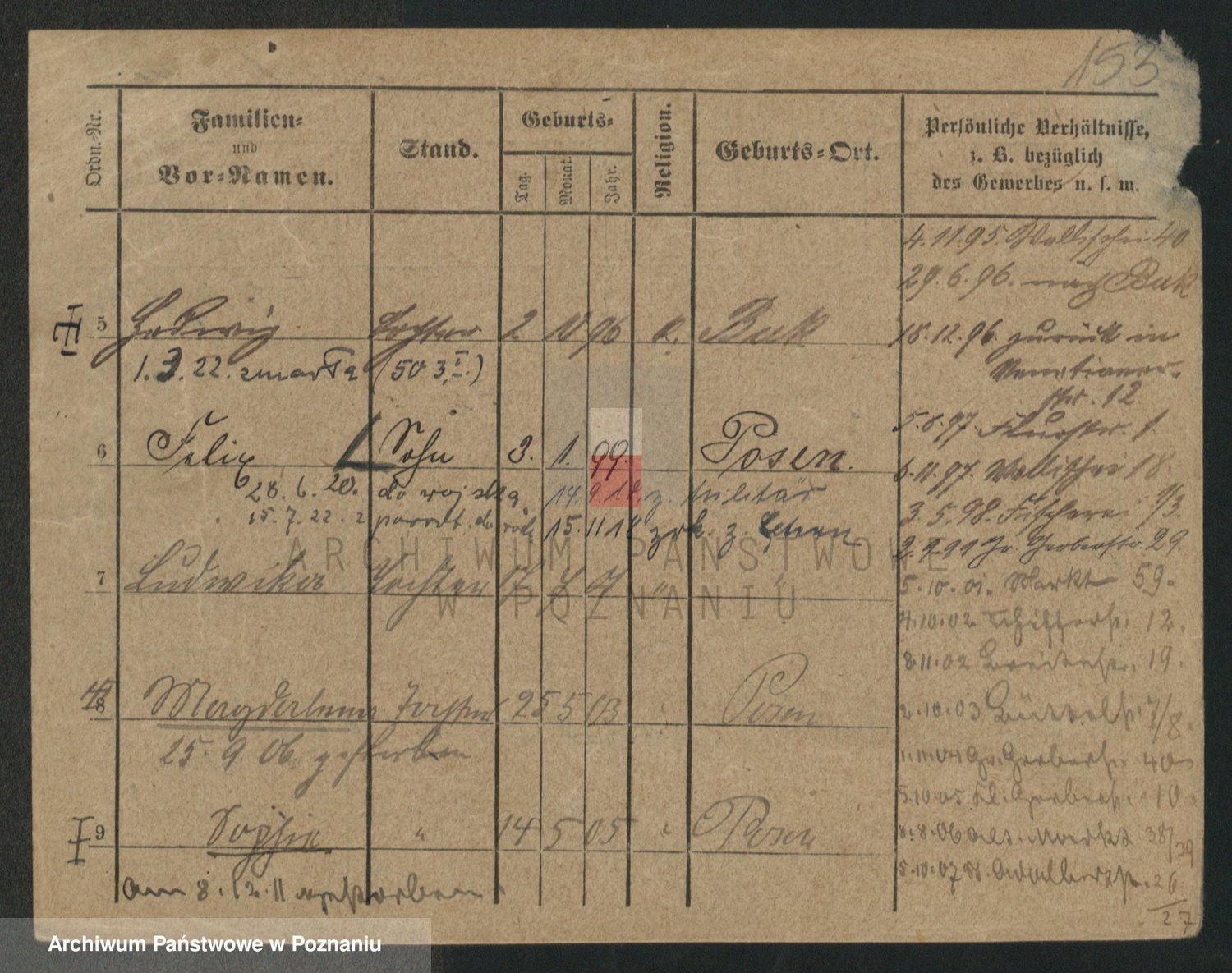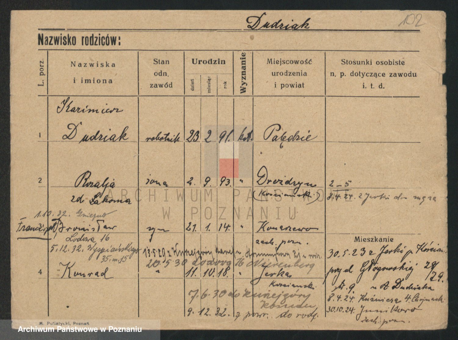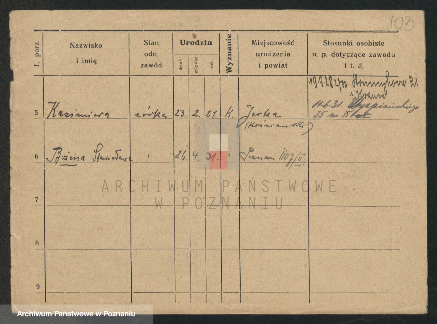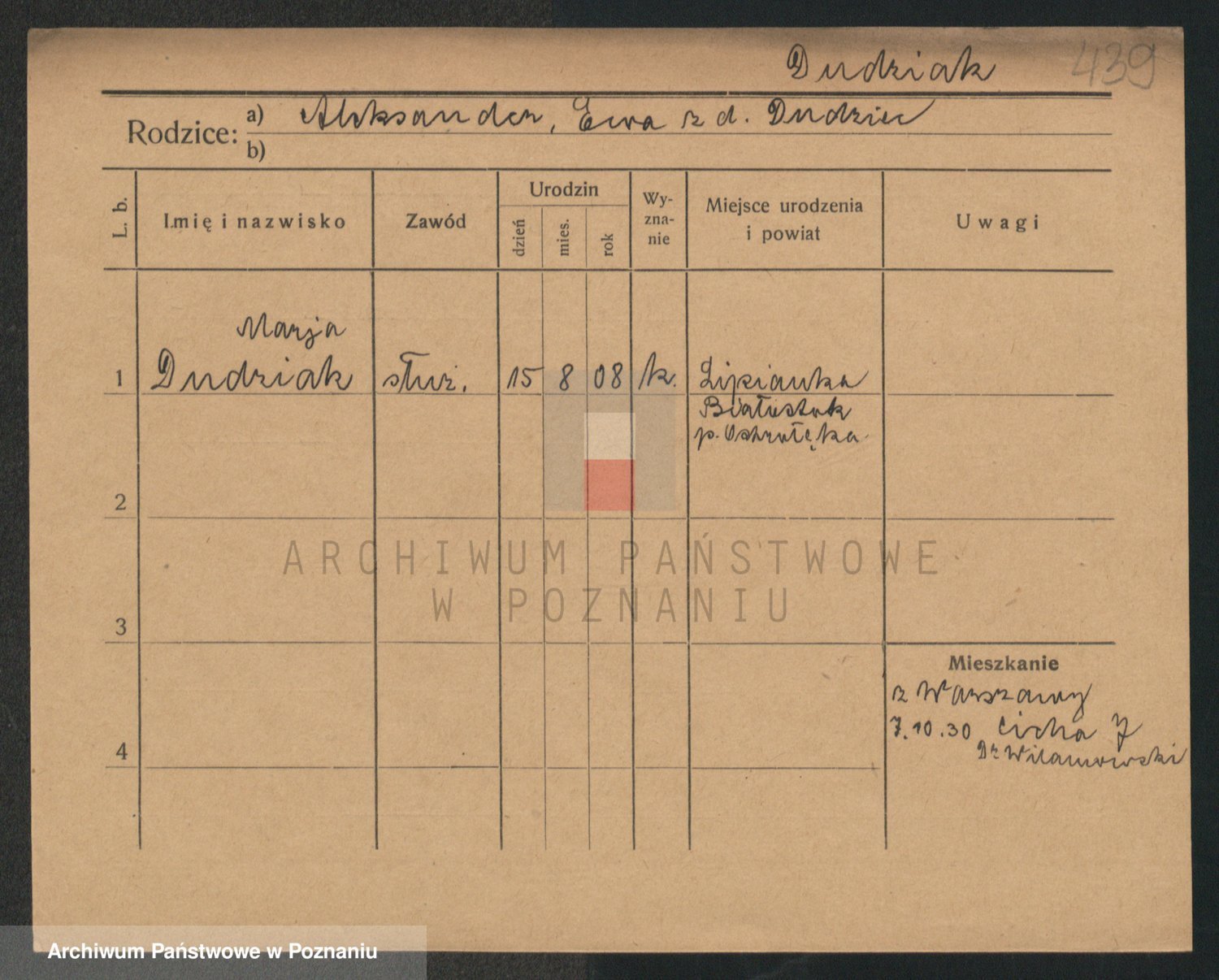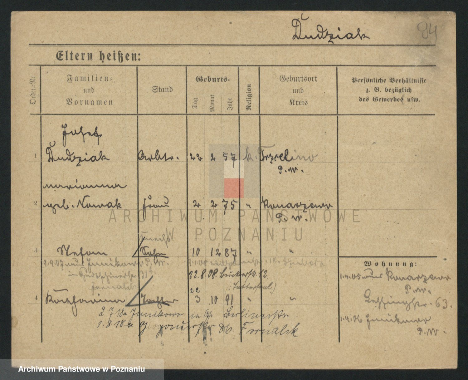 Podgląd karty osobowej dostępny jest po kliknięciu na nazwisko lub ikonkę karty. Można dokonywać powiększenia (ikony na górze) lub przechodzić między kolejnymi skanami (strzałki po bokach).