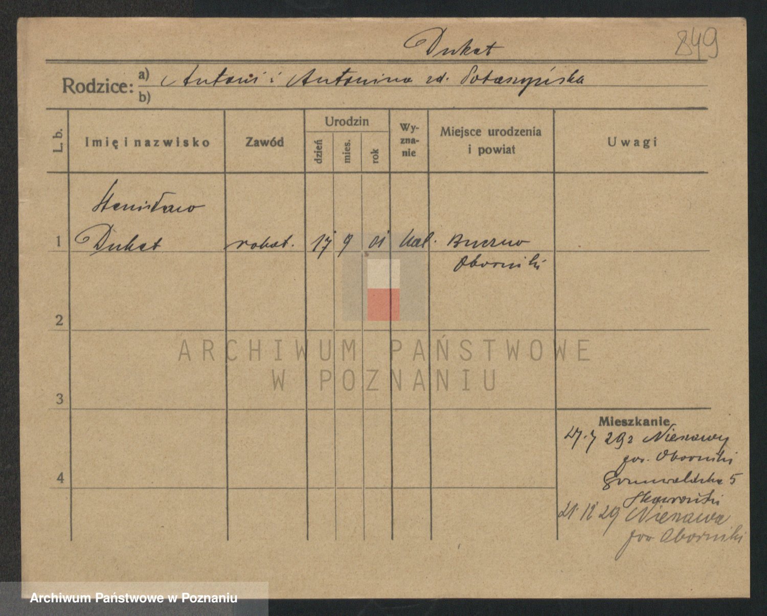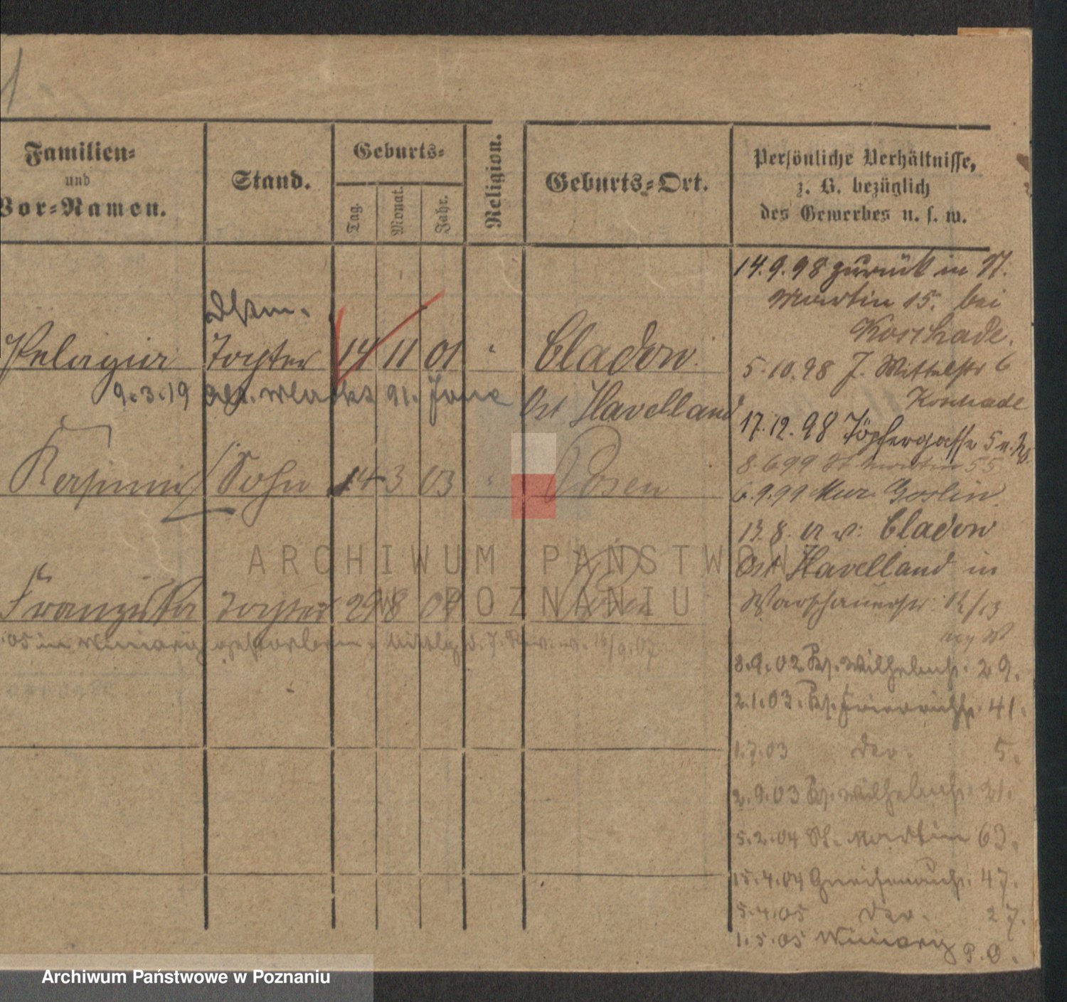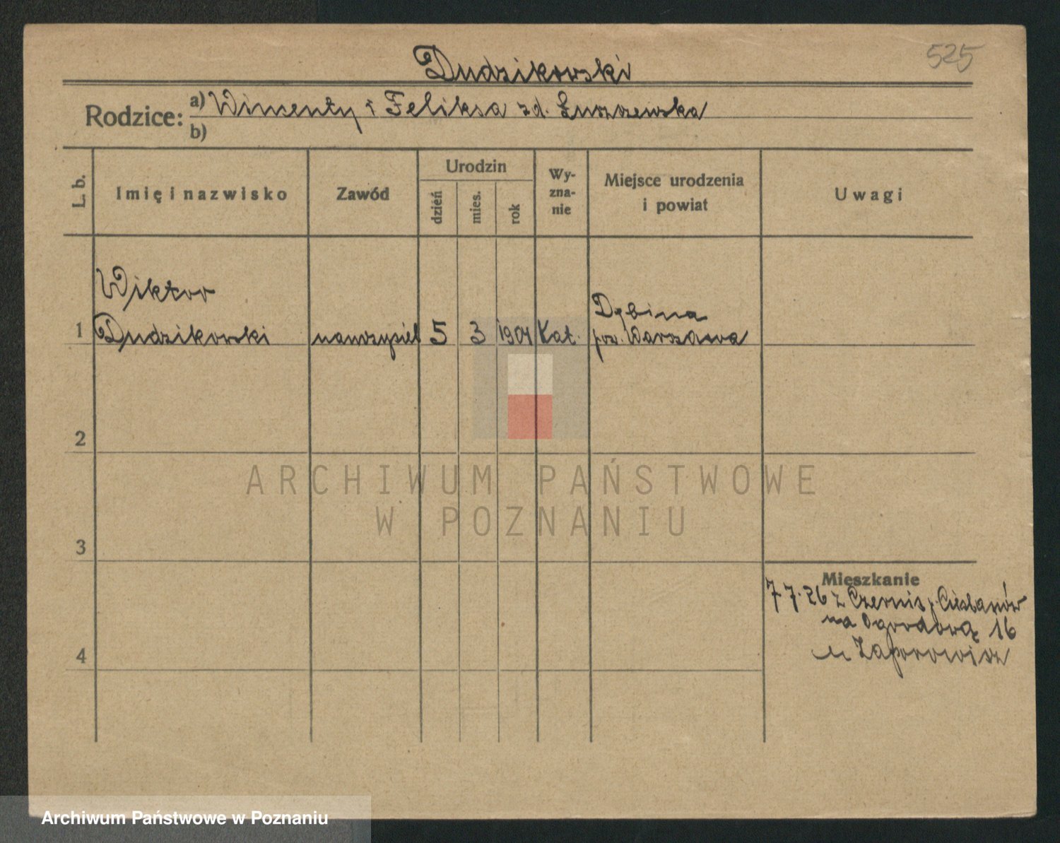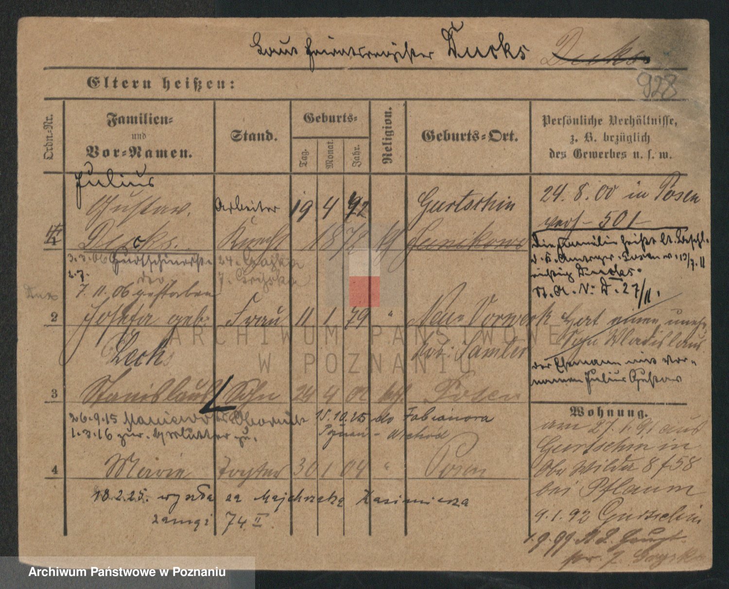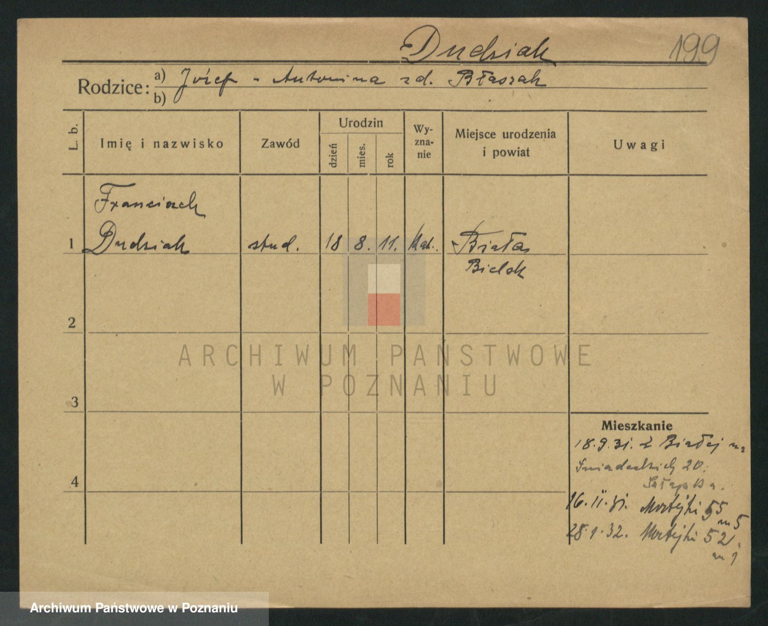 Podgląd karty osobowej dostępny jest po kliknięciu na nazwisko lub ikonkę karty. Można dokonywać powiększenia (ikony na górze) lub przechodzić między kolejnymi skanami (strzałki po bokach).