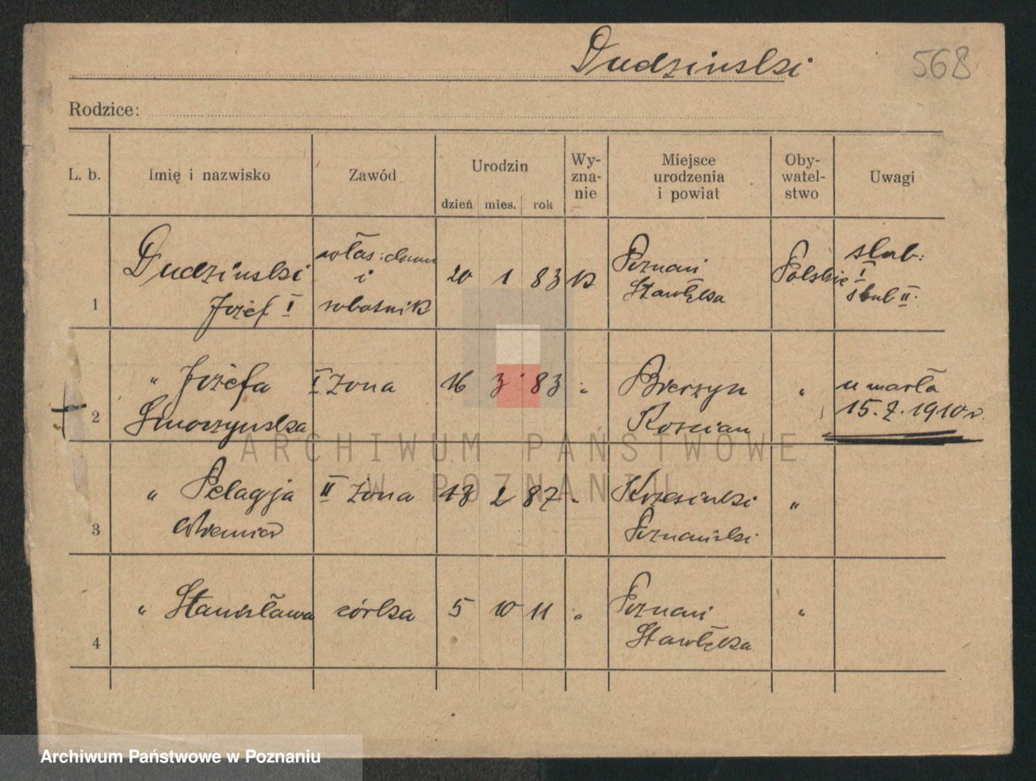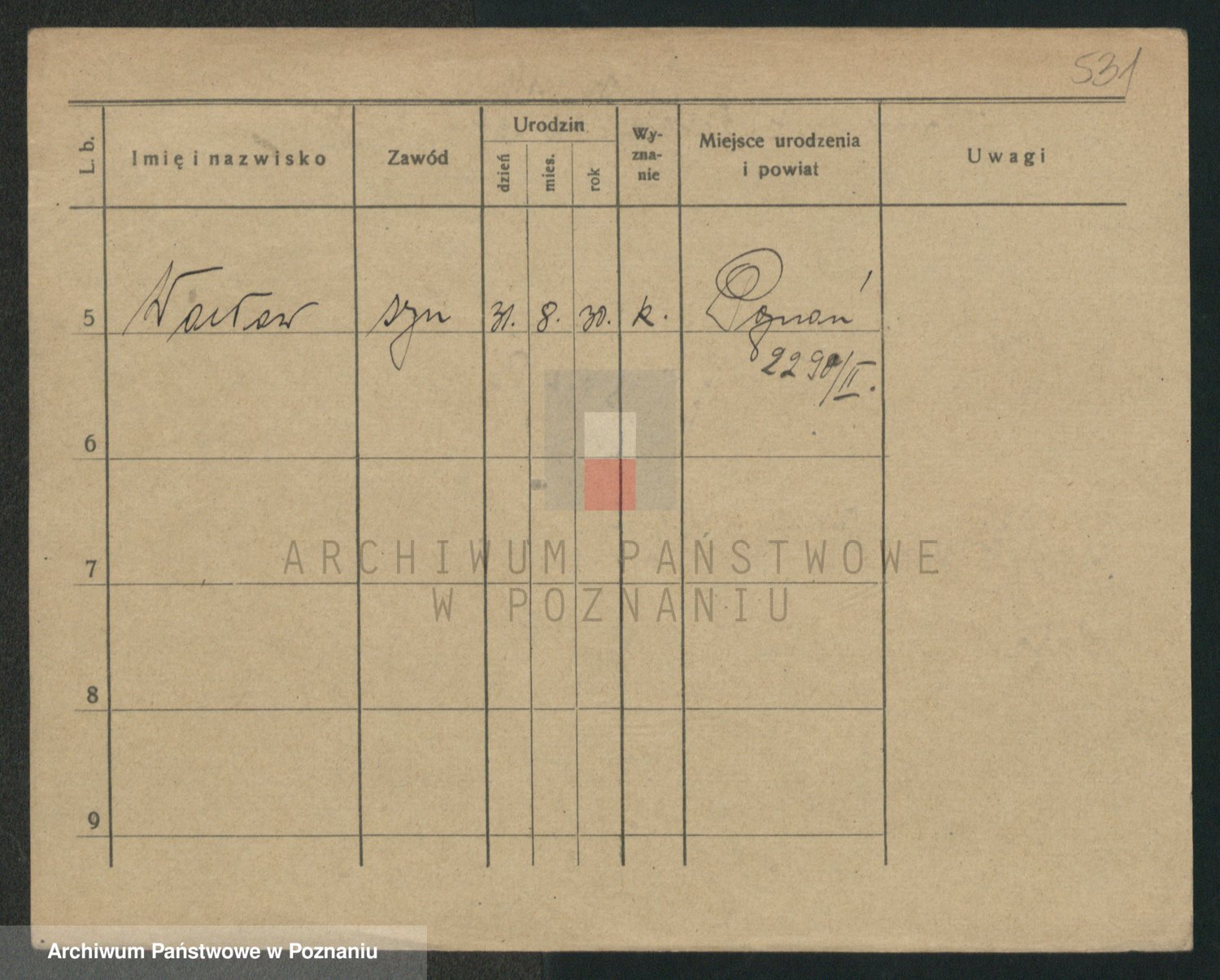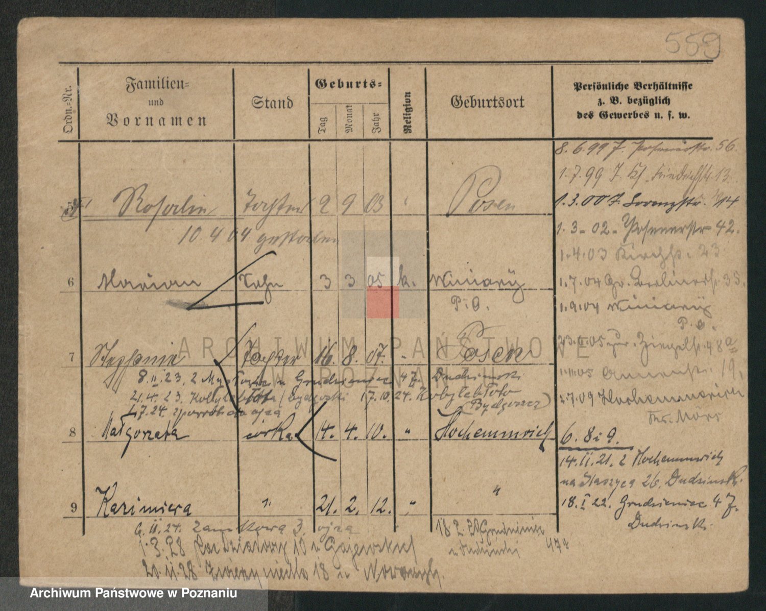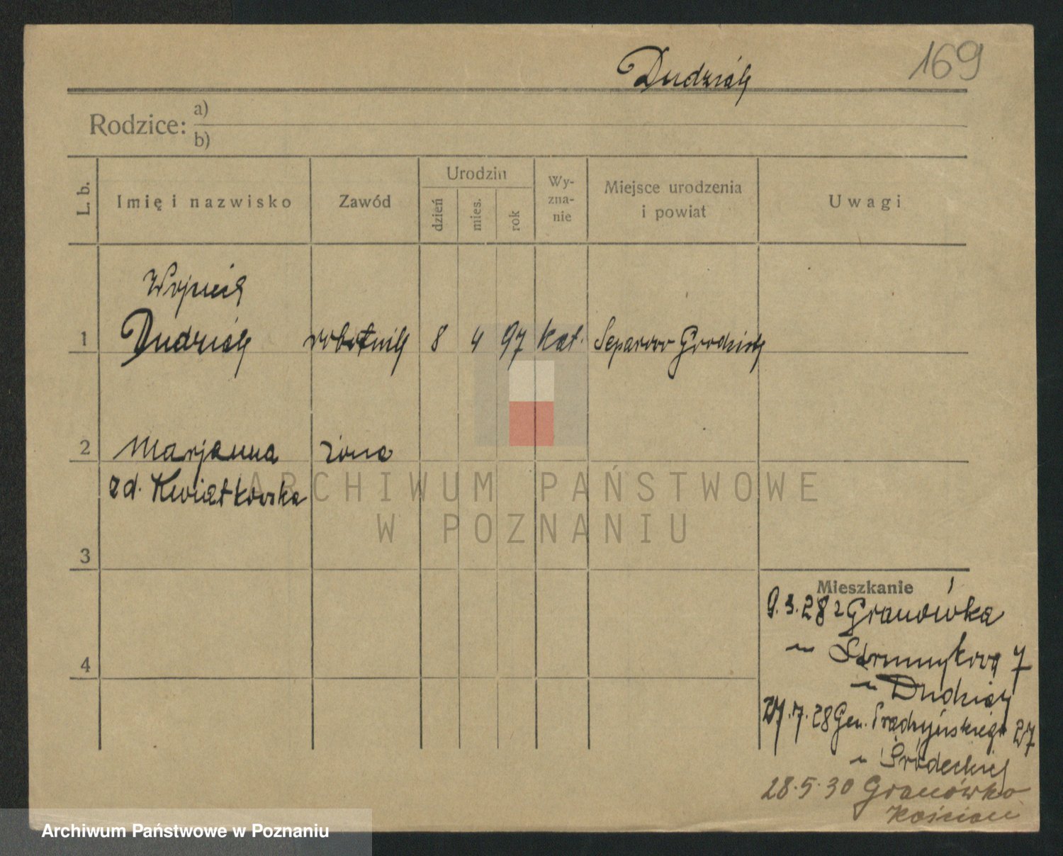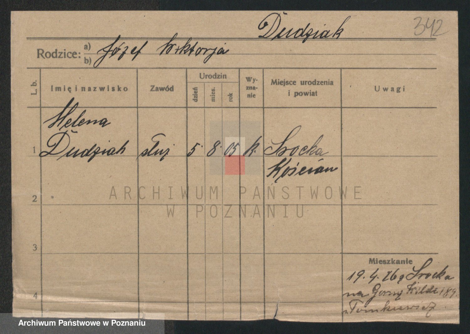 Podgląd karty osobowej dostępny jest po kliknięciu na nazwisko lub ikonkę karty. Można dokonywać powiększenia (ikony na górze) lub przechodzić między kolejnymi skanami (strzałki po bokach).