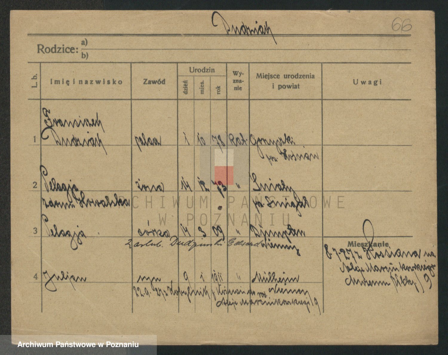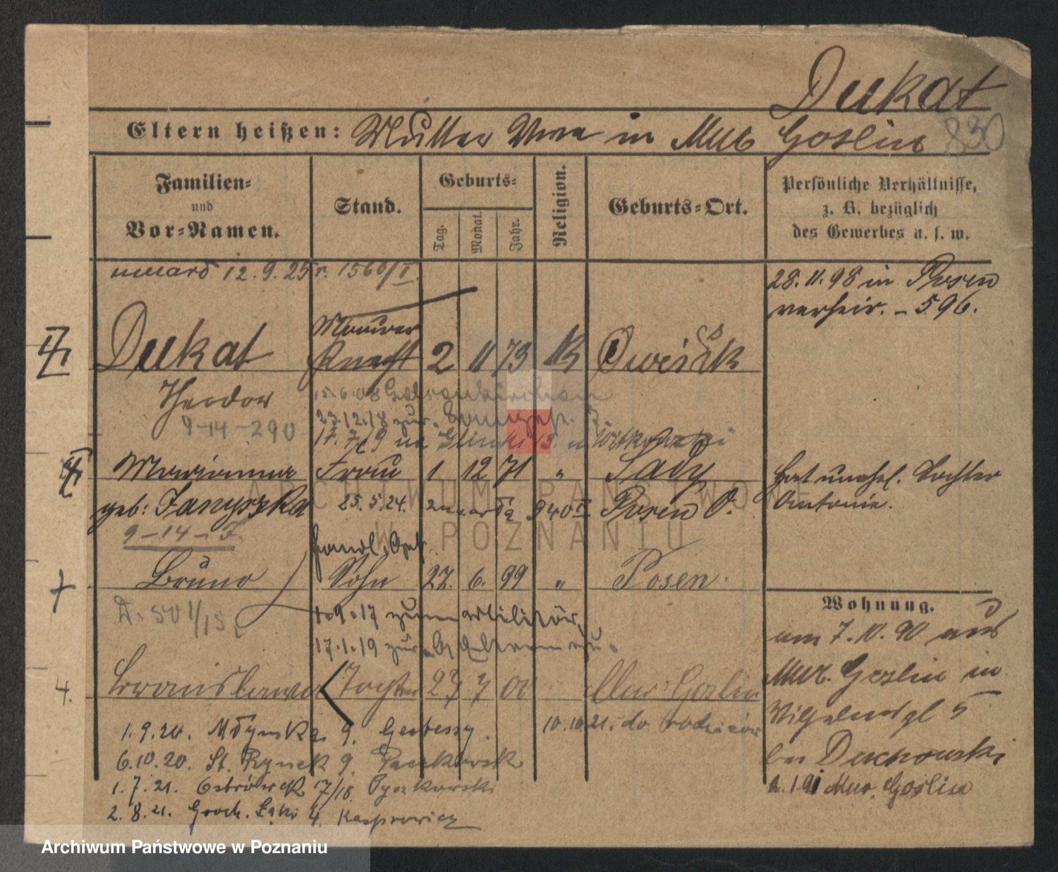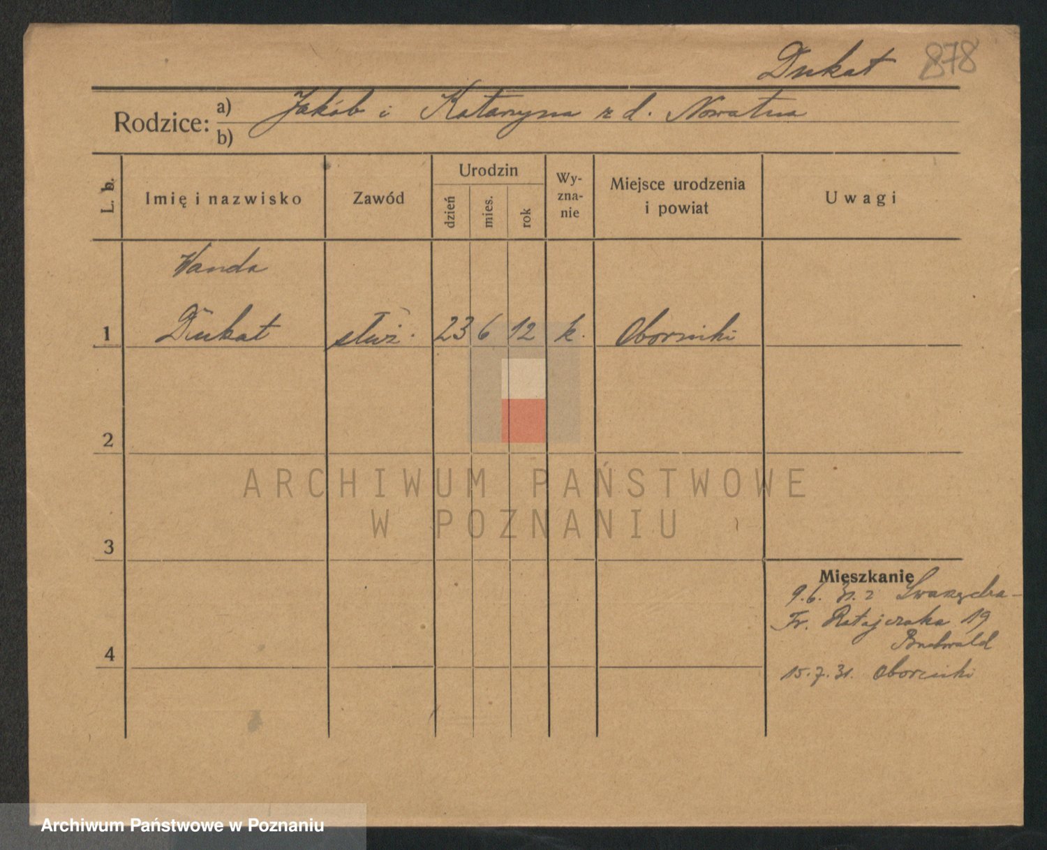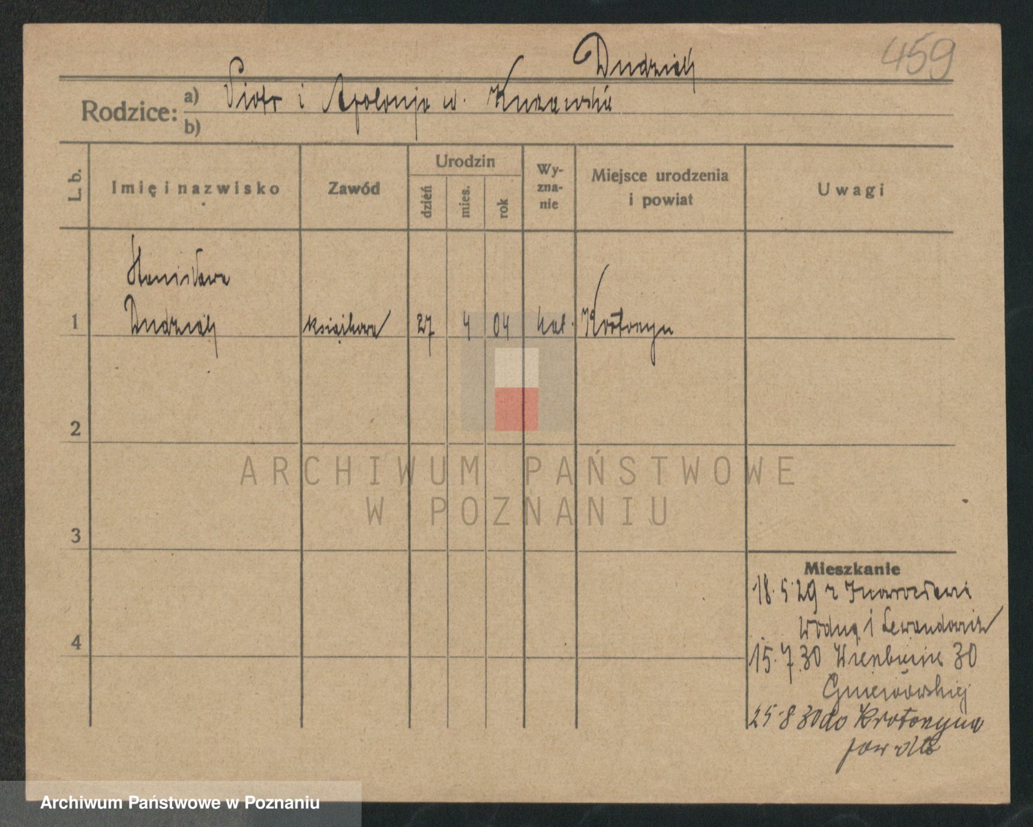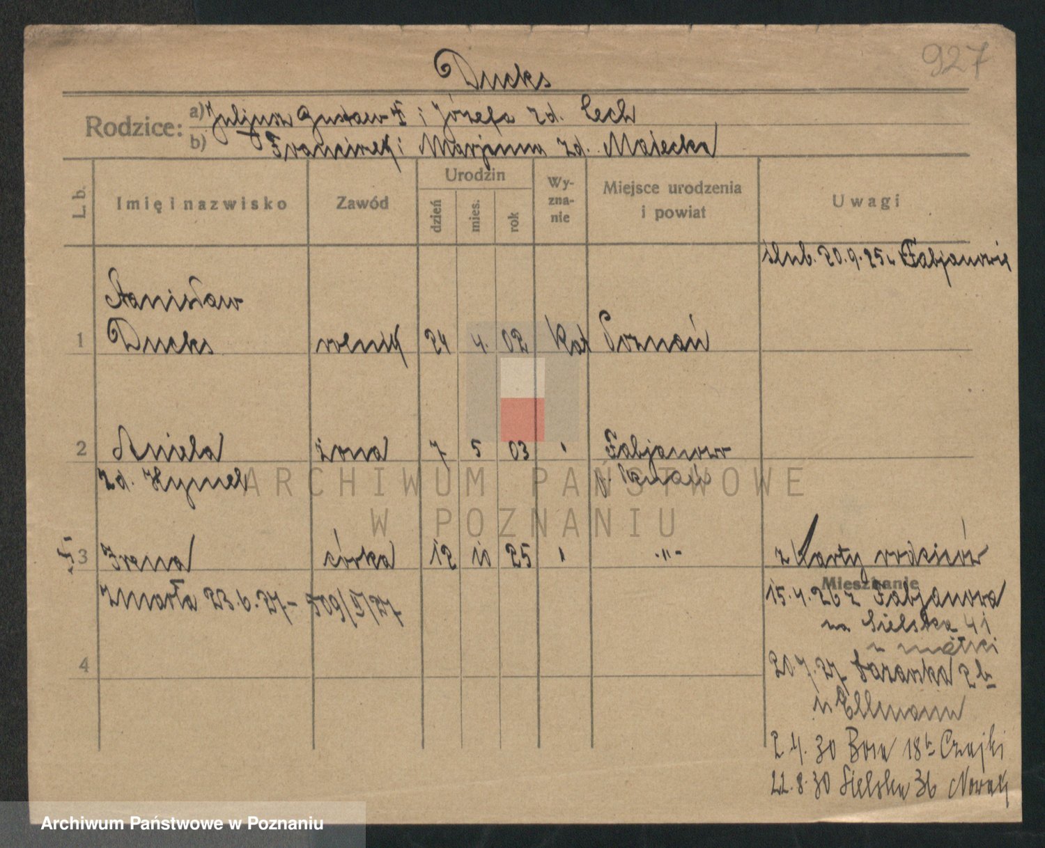 Podgląd karty osobowej dostępny jest po kliknięciu na nazwisko lub ikonkę karty. Można dokonywać powiększenia (ikony na górze) lub przechodzić między kolejnymi skanami (strzałki po bokach).