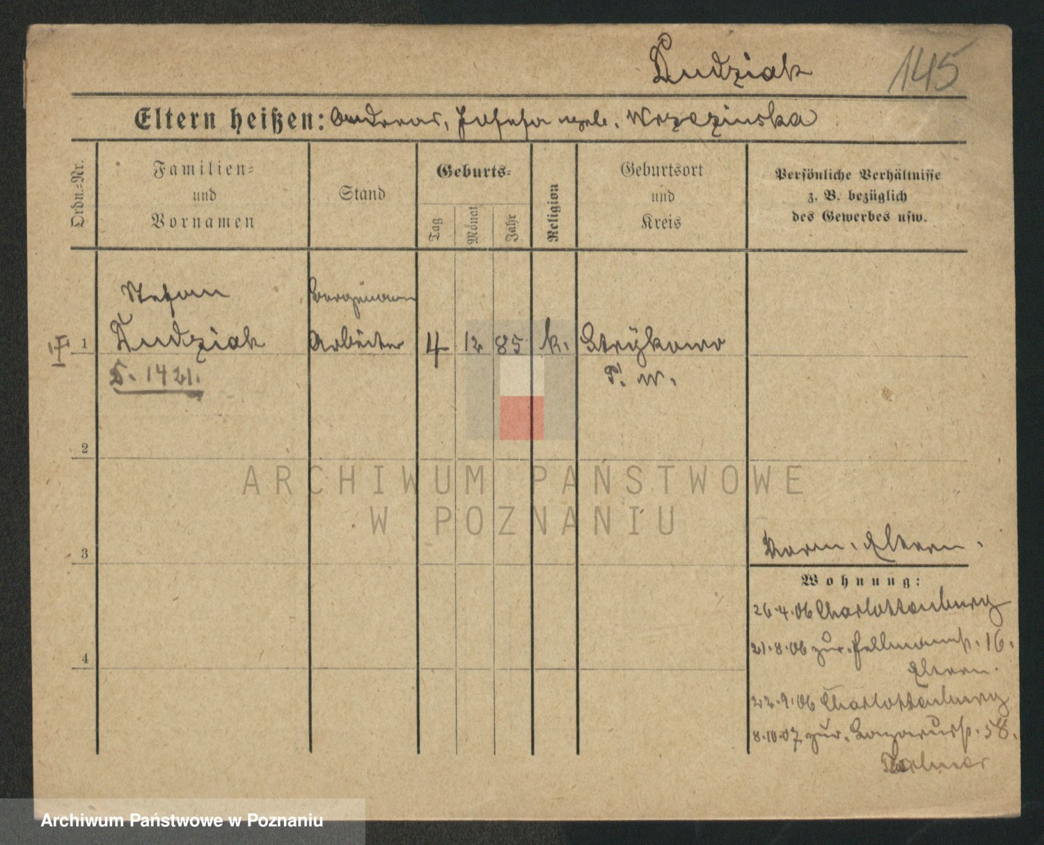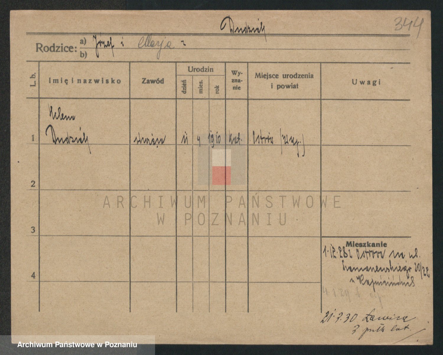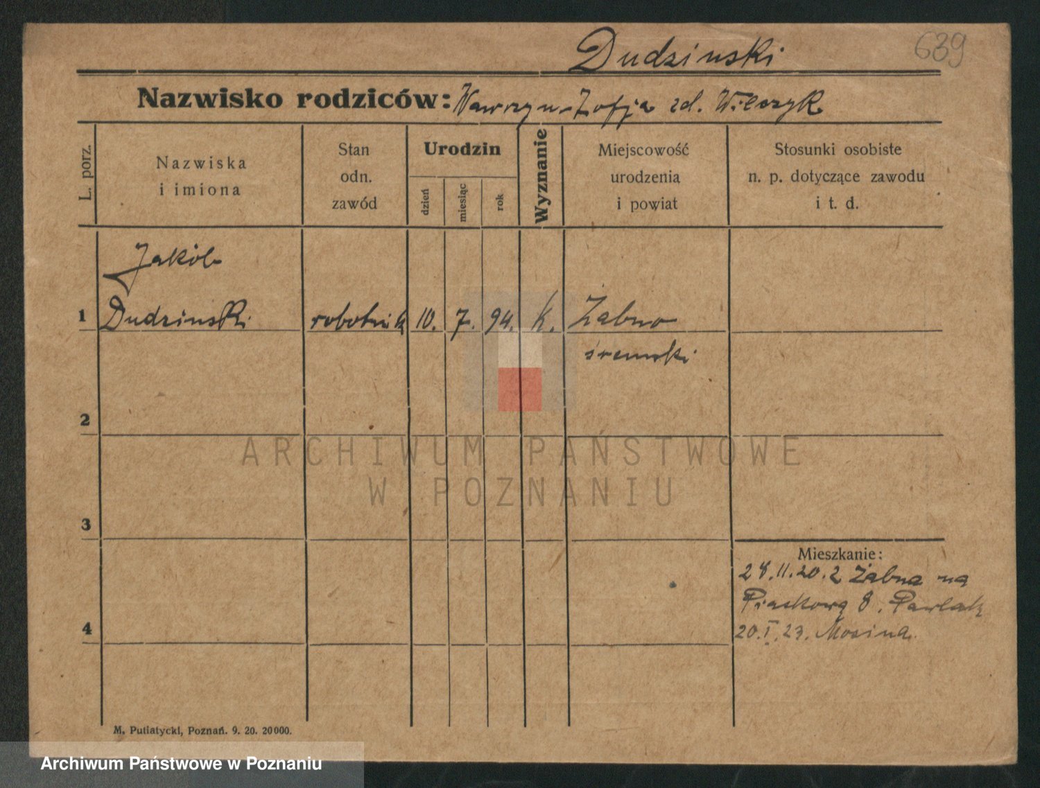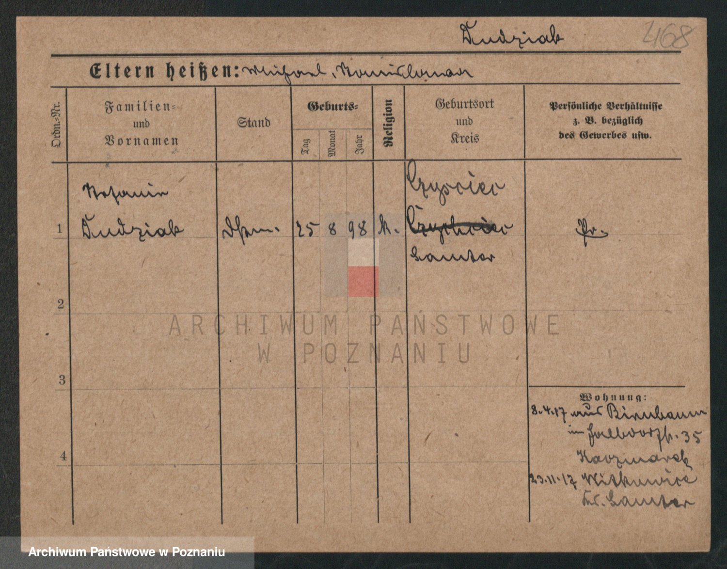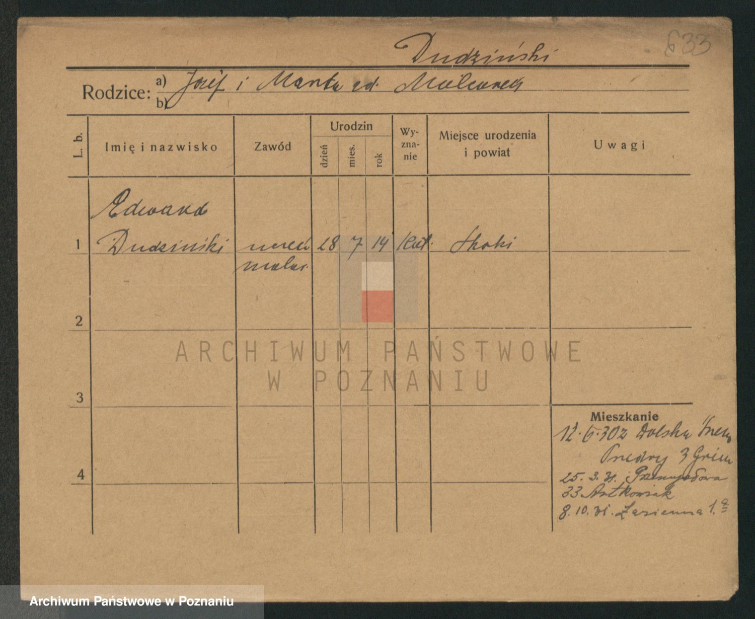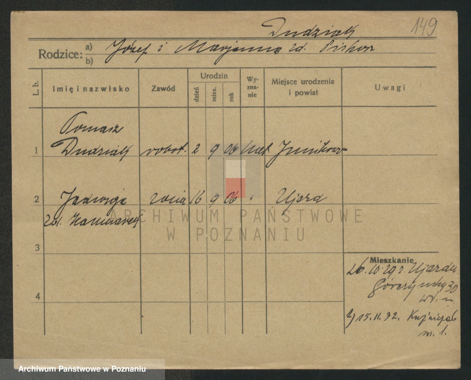 Podgląd karty osobowej dostępny jest po kliknięciu na nazwisko lub ikonkę karty. Można dokonywać powiększenia (ikony na górze) lub przechodzić między kolejnymi skanami (strzałki po bokach).