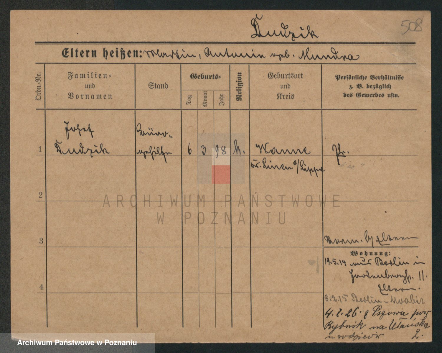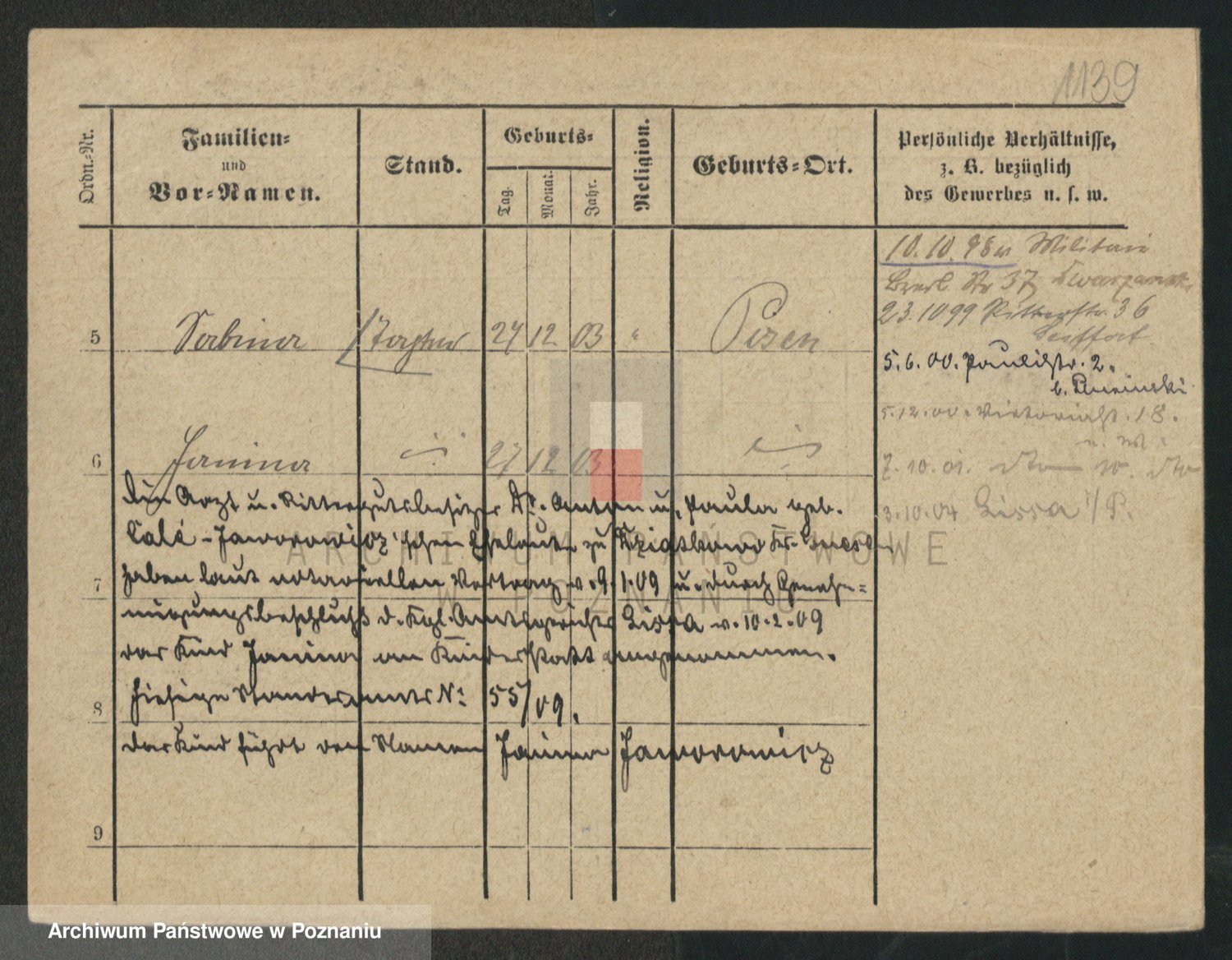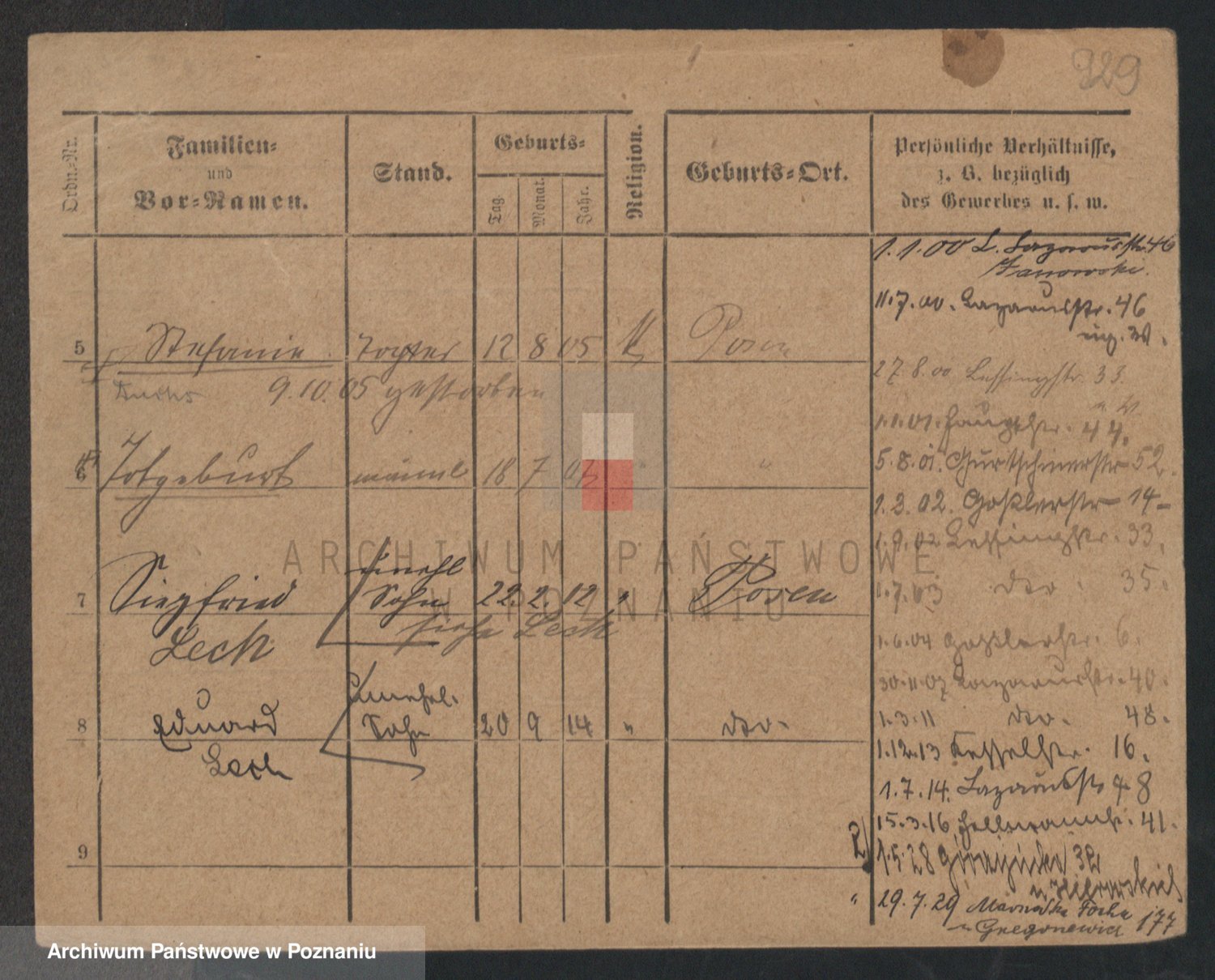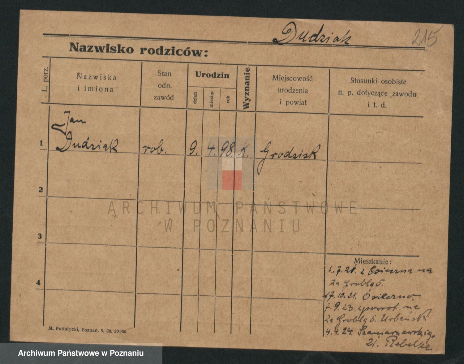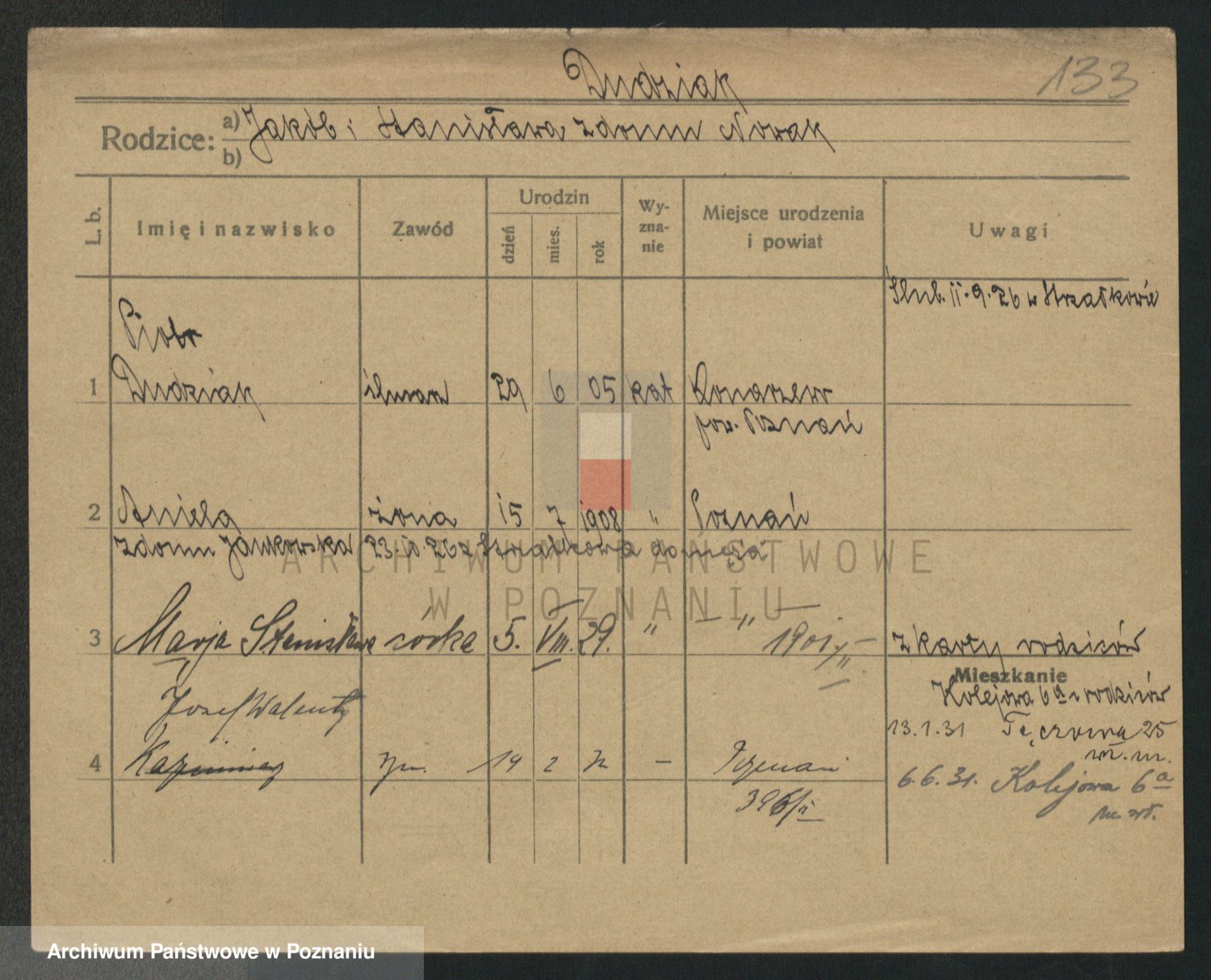 Podgląd karty osobowej dostępny jest po kliknięciu na nazwisko lub ikonkę karty. Można dokonywać powiększenia (ikony na górze) lub przechodzić między kolejnymi skanami (strzałki po bokach).