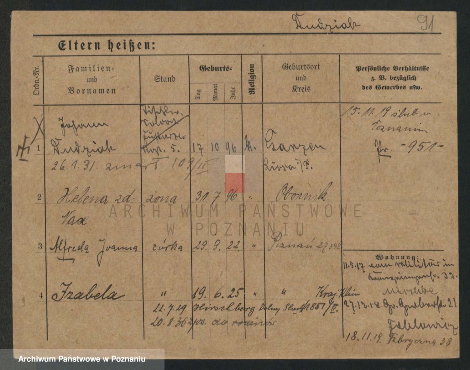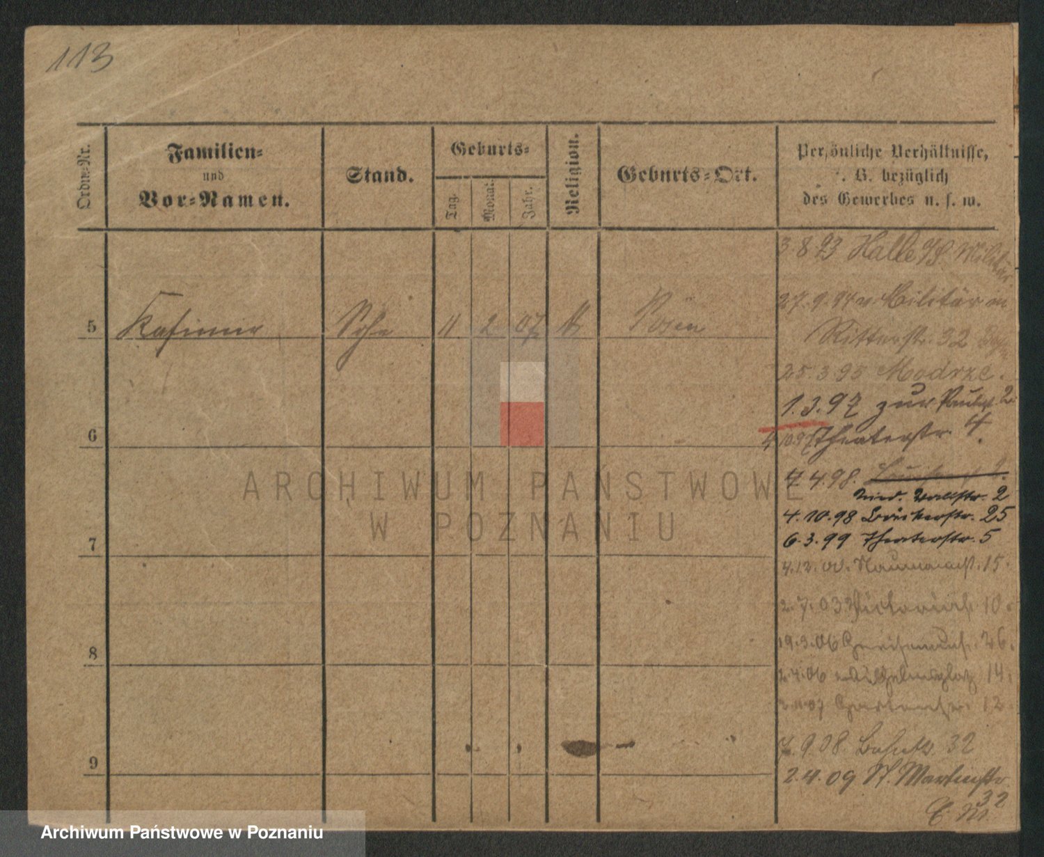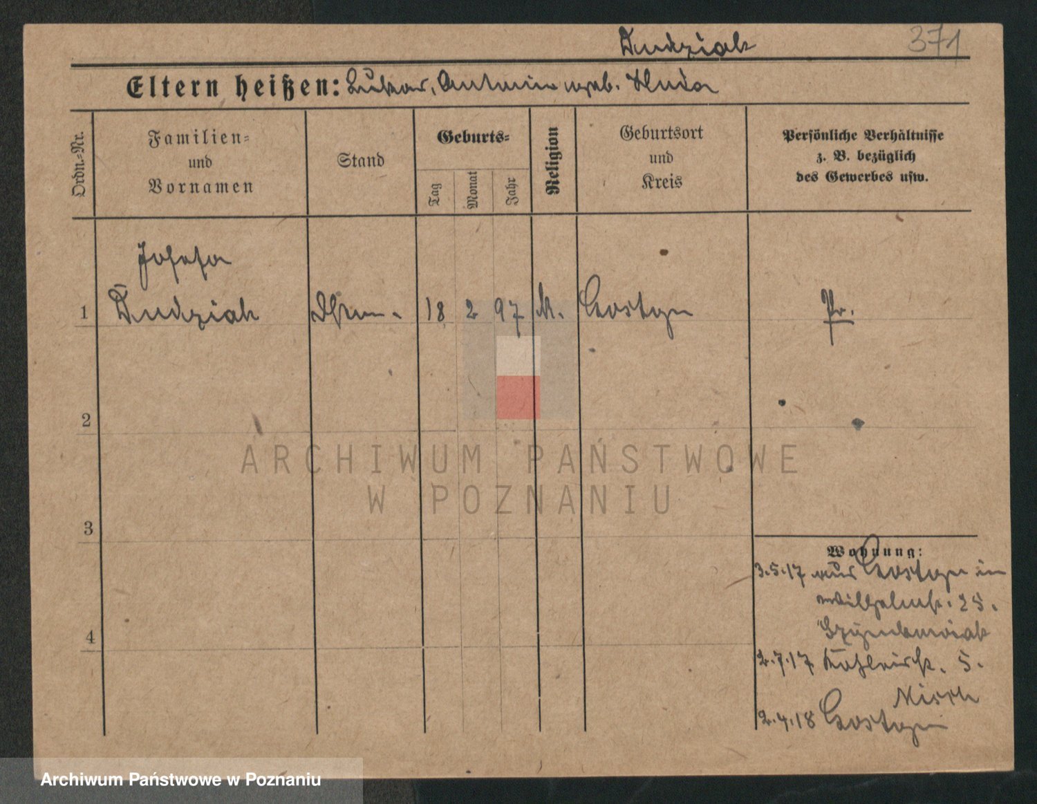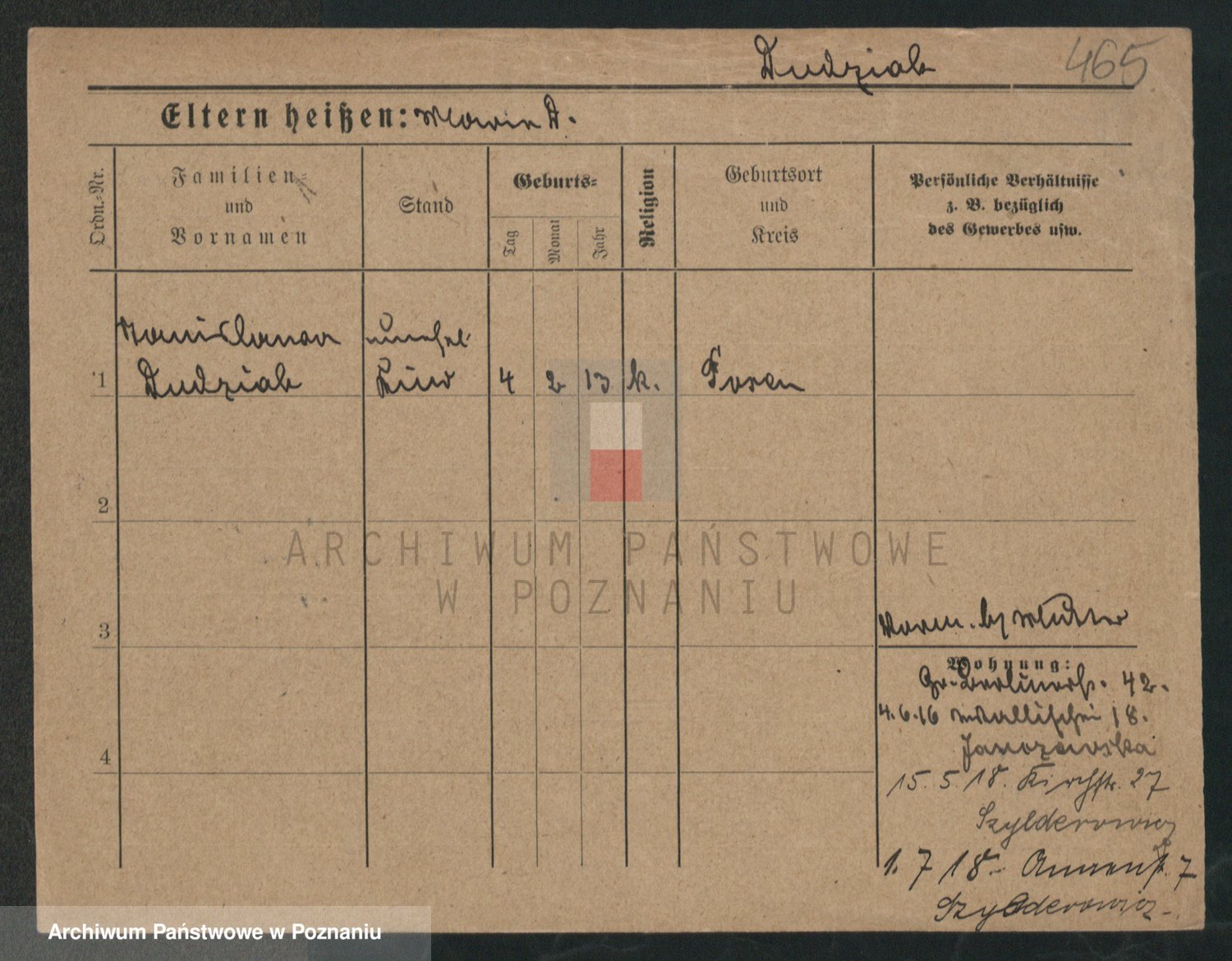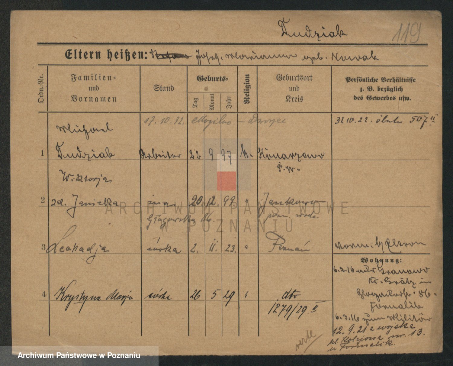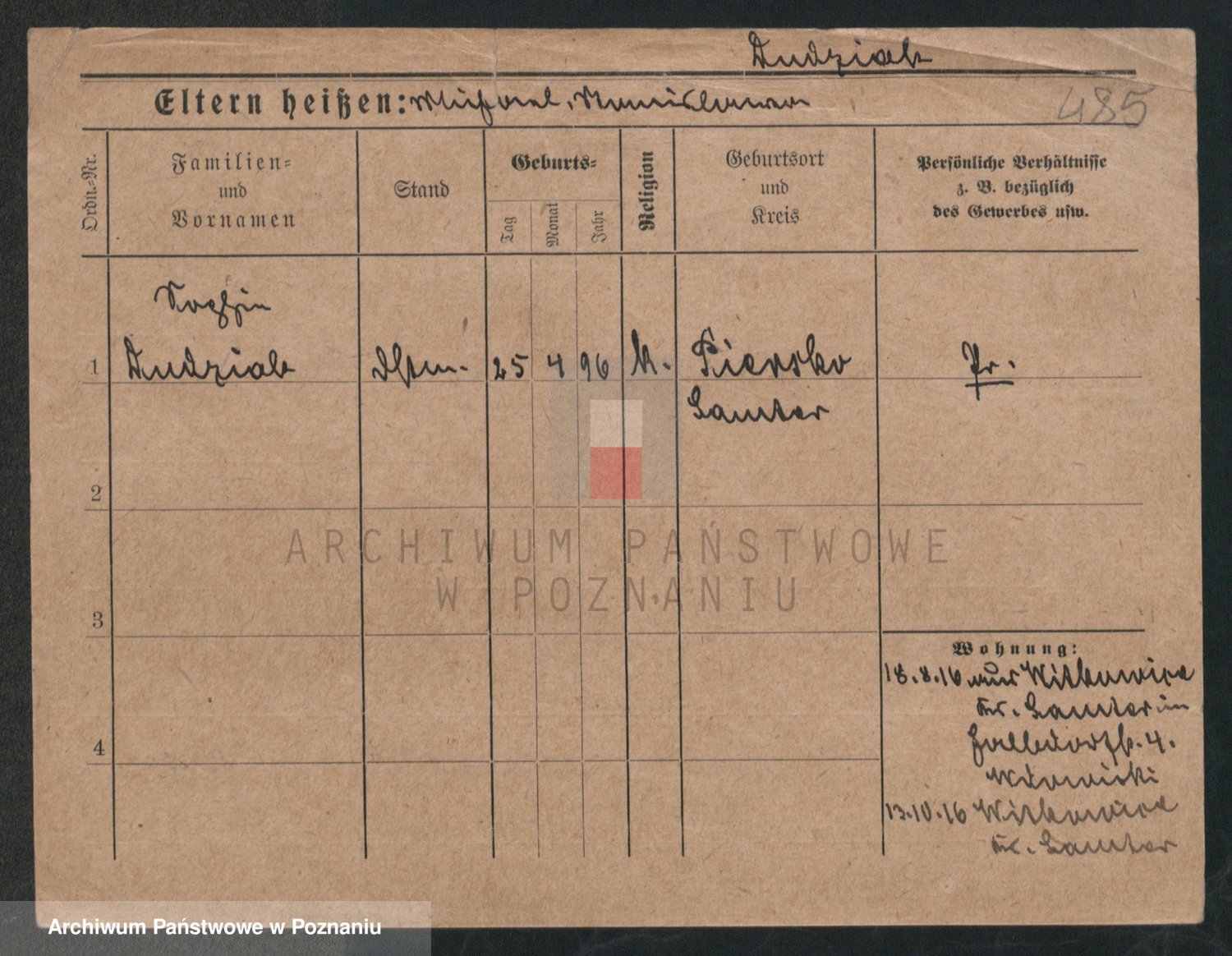Podgląd karty osobowej dostępny jest po kliknięciu na nazwisko lub ikonkę karty. Można dokonywać powiększenia (ikony na górze) lub przechodzić między kolejnymi skanami (strzałki po bokach).