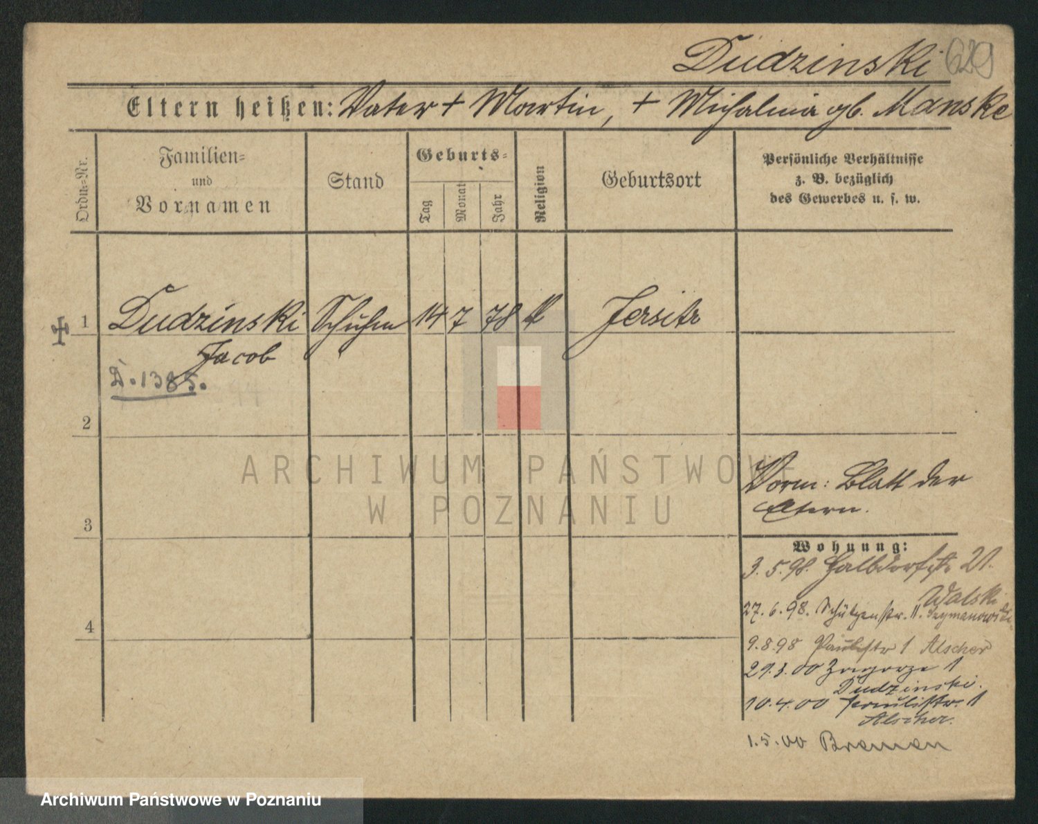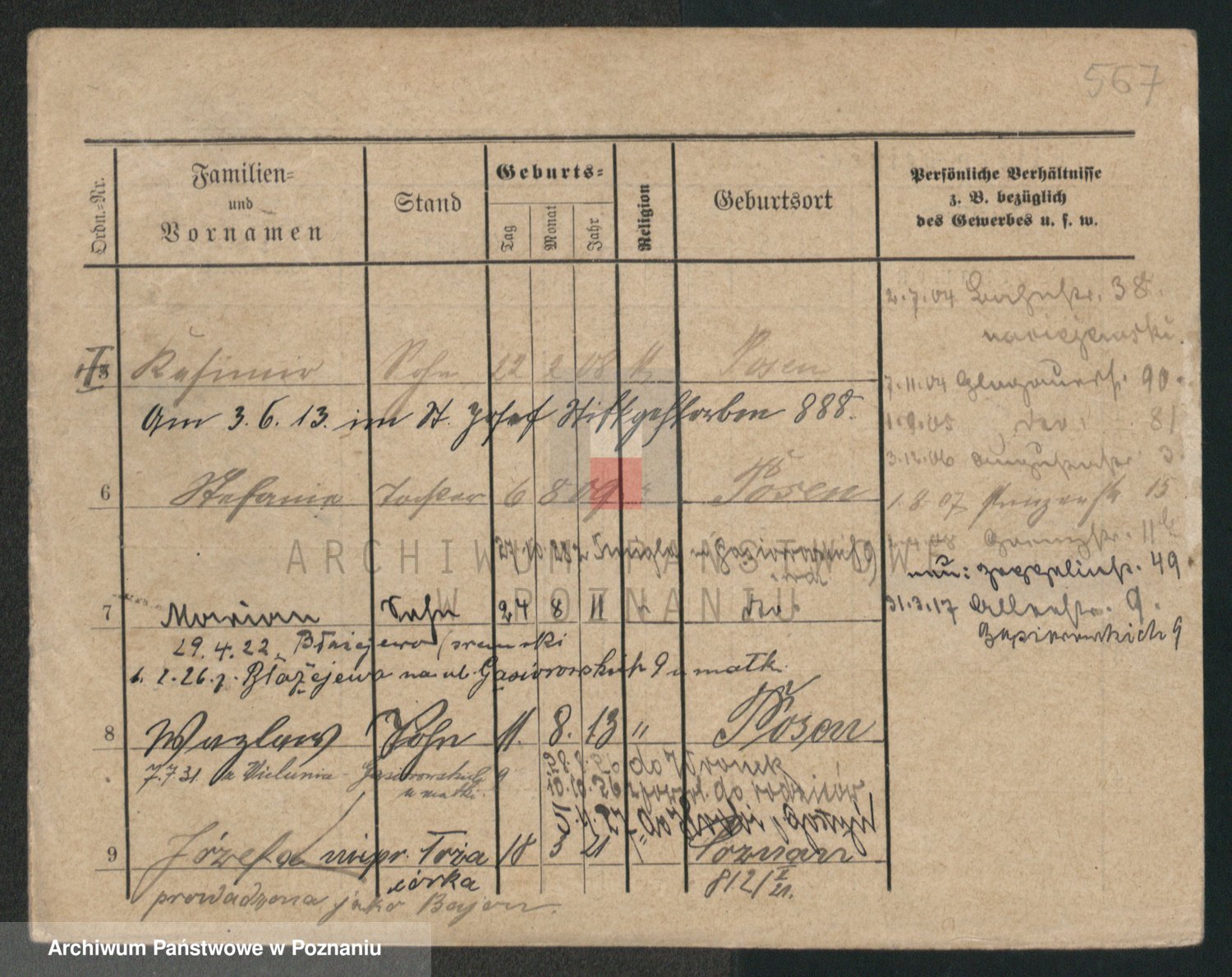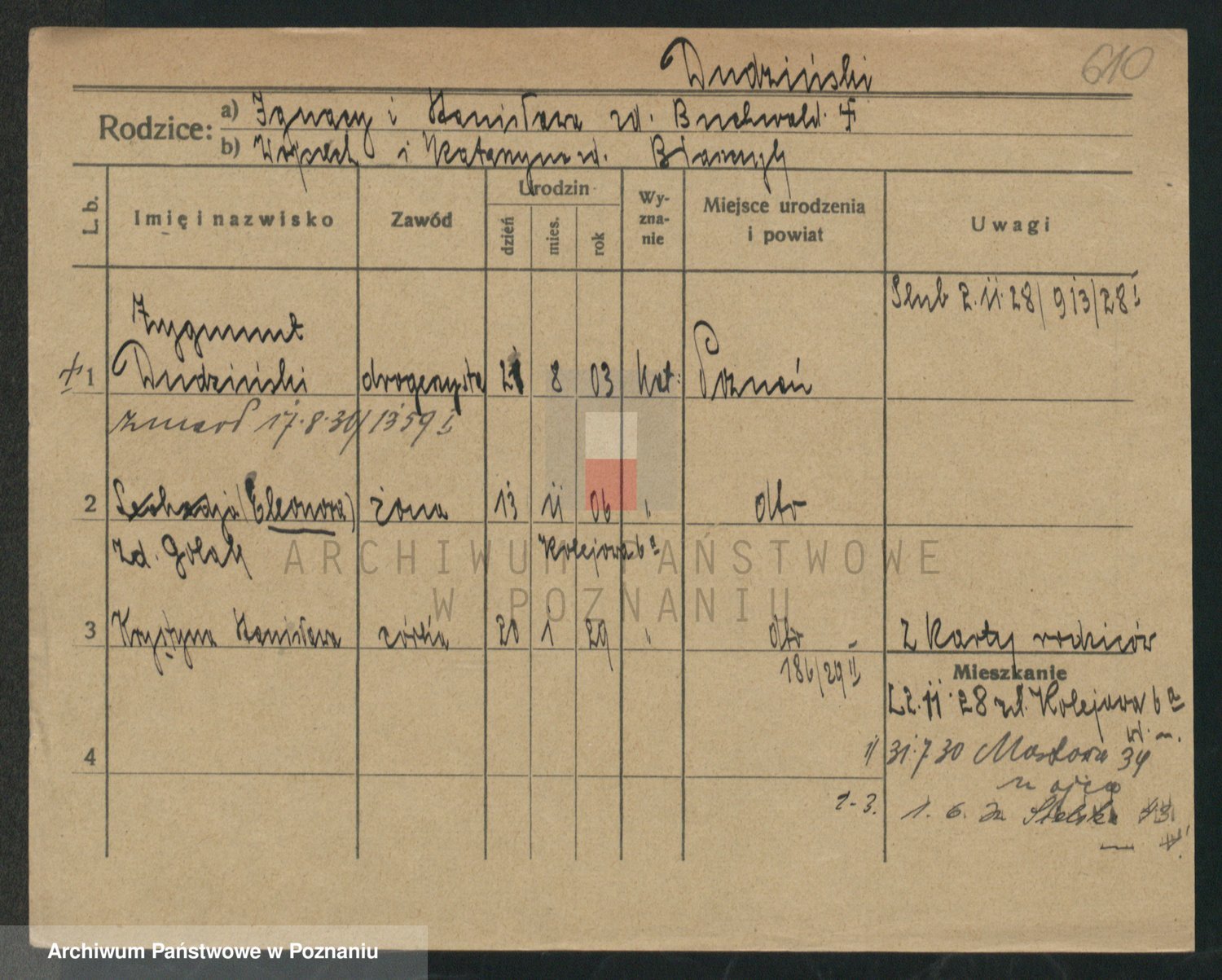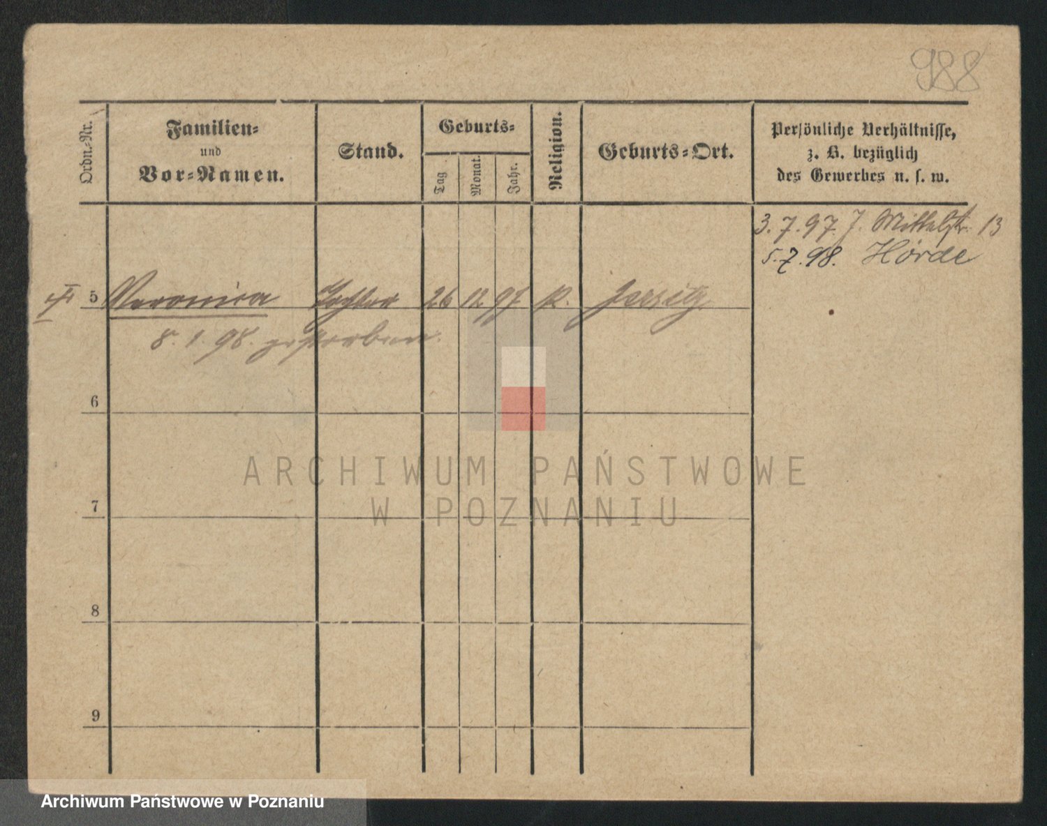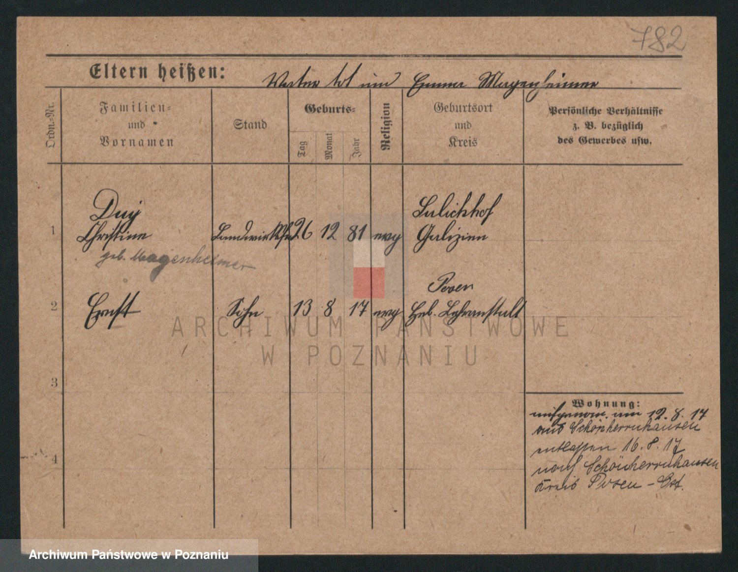 Podgląd karty osobowej dostępny jest po kliknięciu na nazwisko lub ikonkę karty. Można dokonywać powiększenia (ikony na górze) lub przechodzić między kolejnymi skanami (strzałki po bokach).
