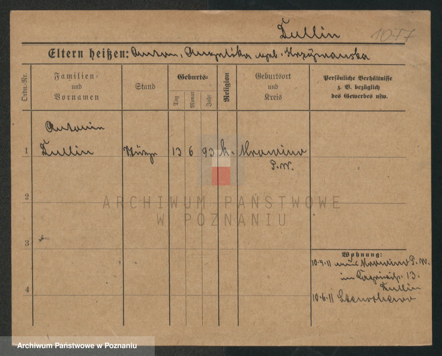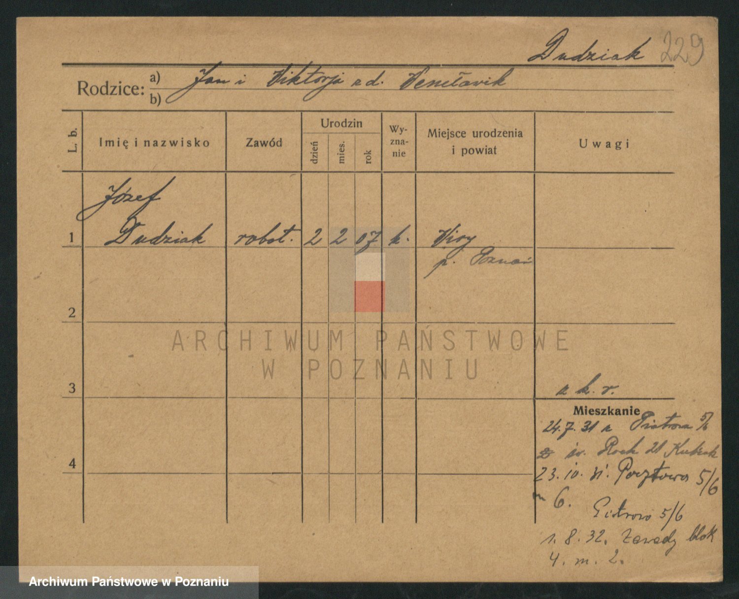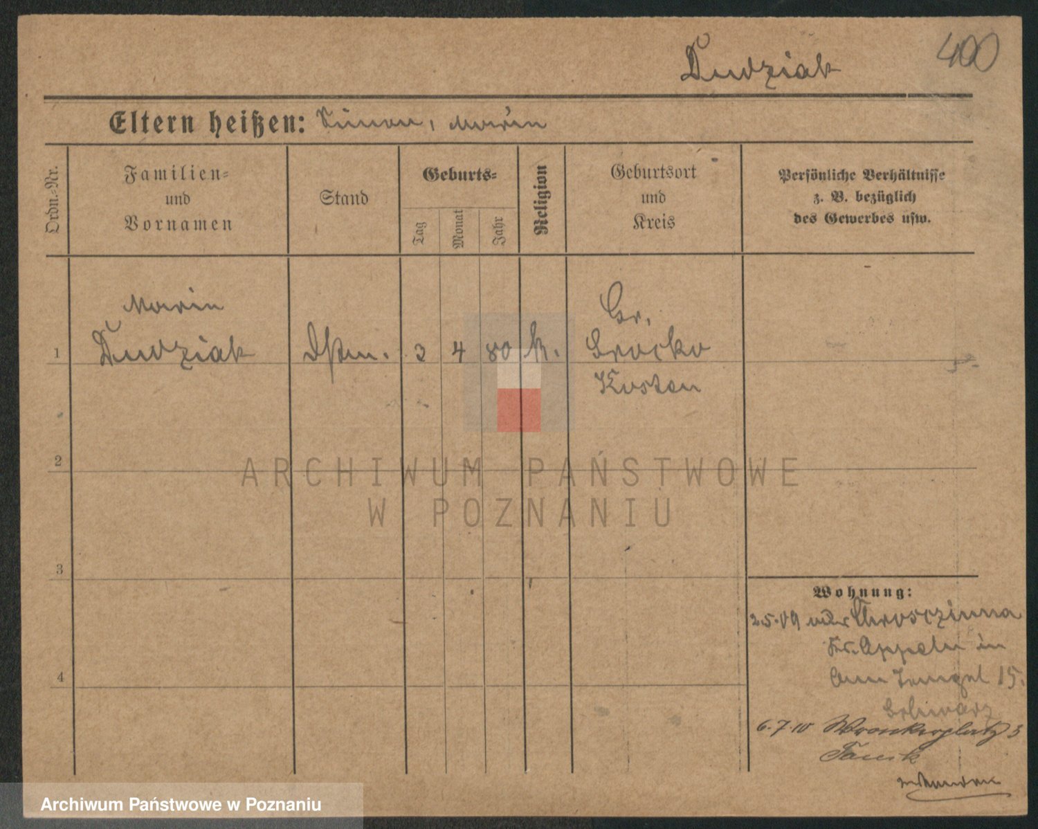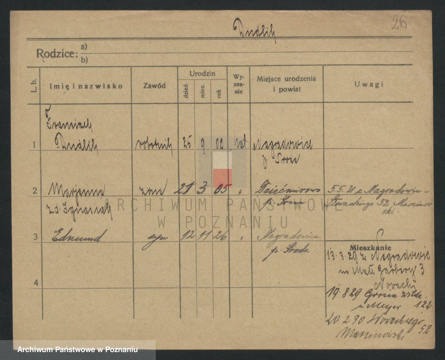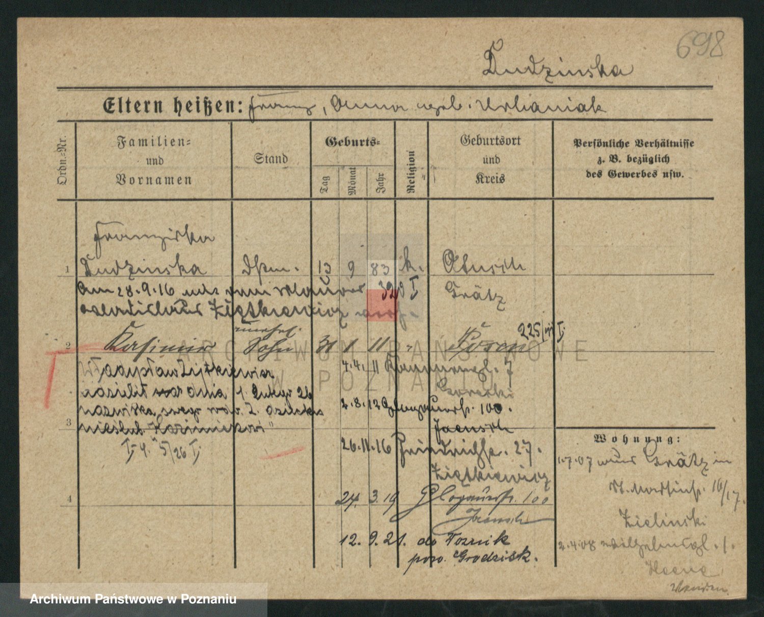 Podgląd karty osobowej dostępny jest po kliknięciu na nazwisko lub ikonkę karty. Można dokonywać powiększenia (ikony na górze) lub przechodzić między kolejnymi skanami (strzałki po bokach).