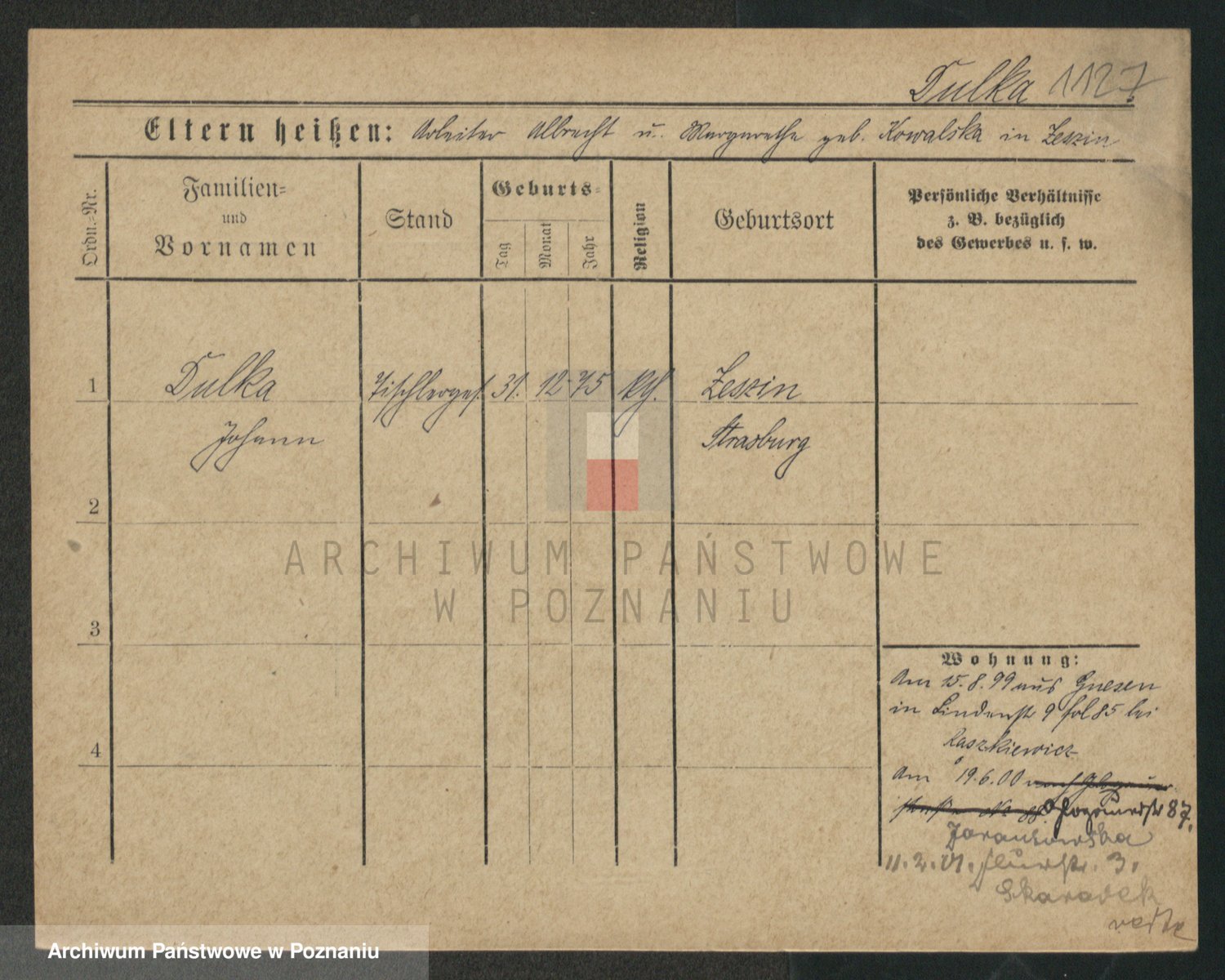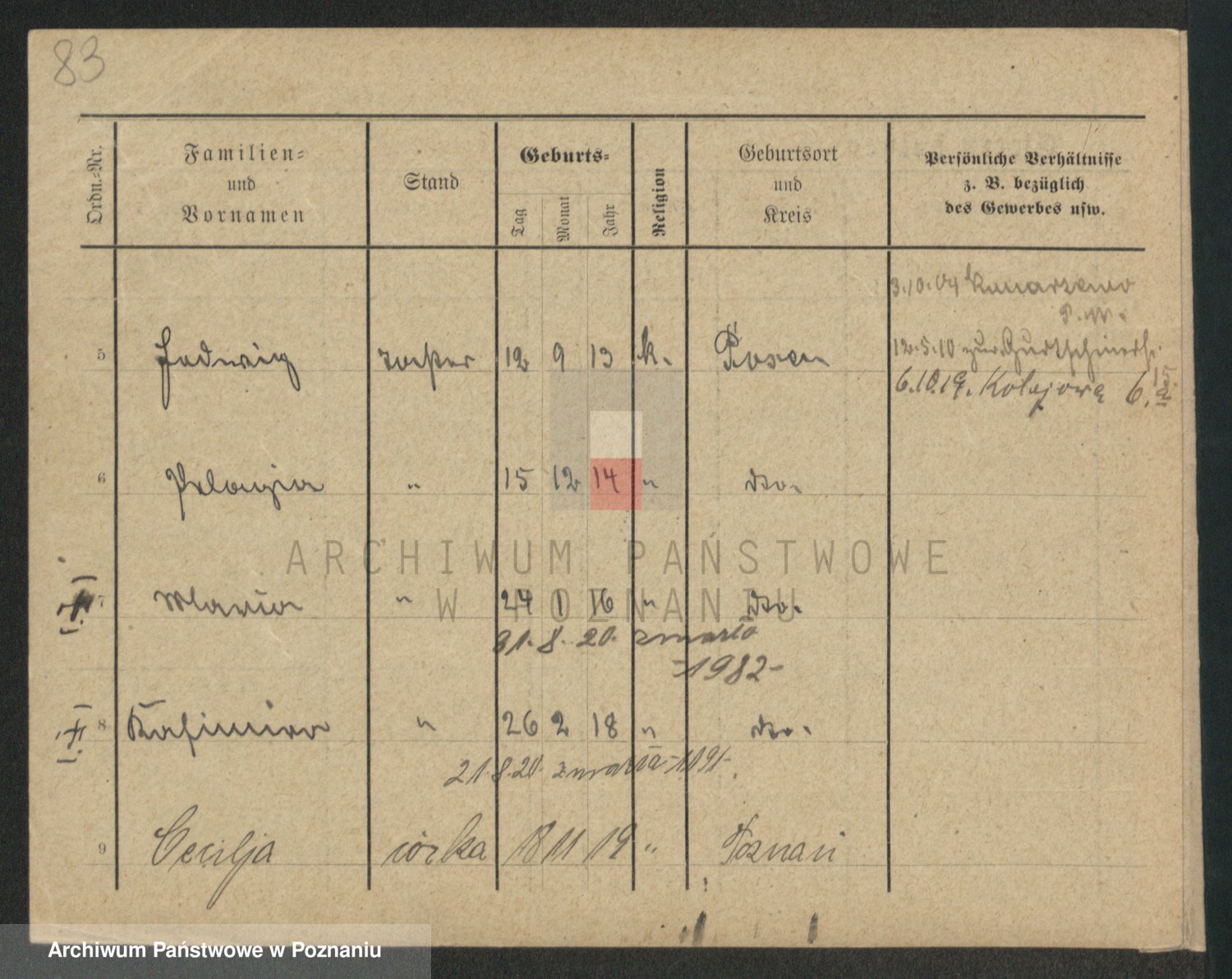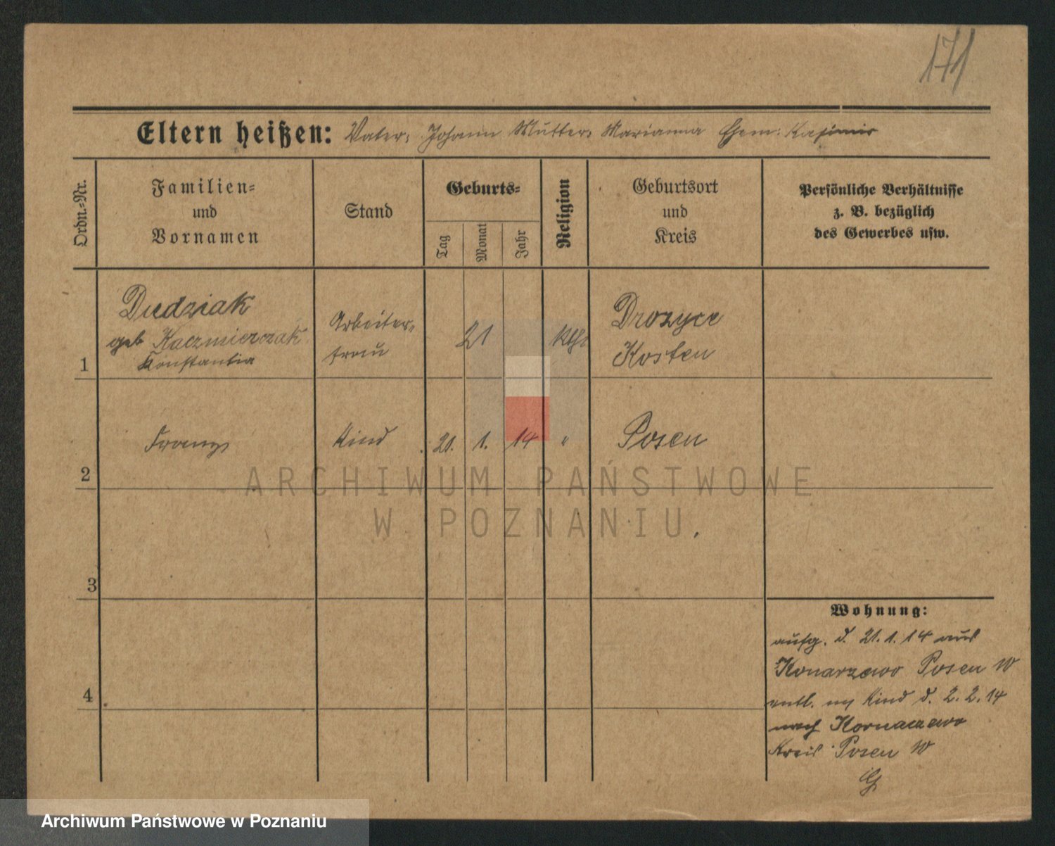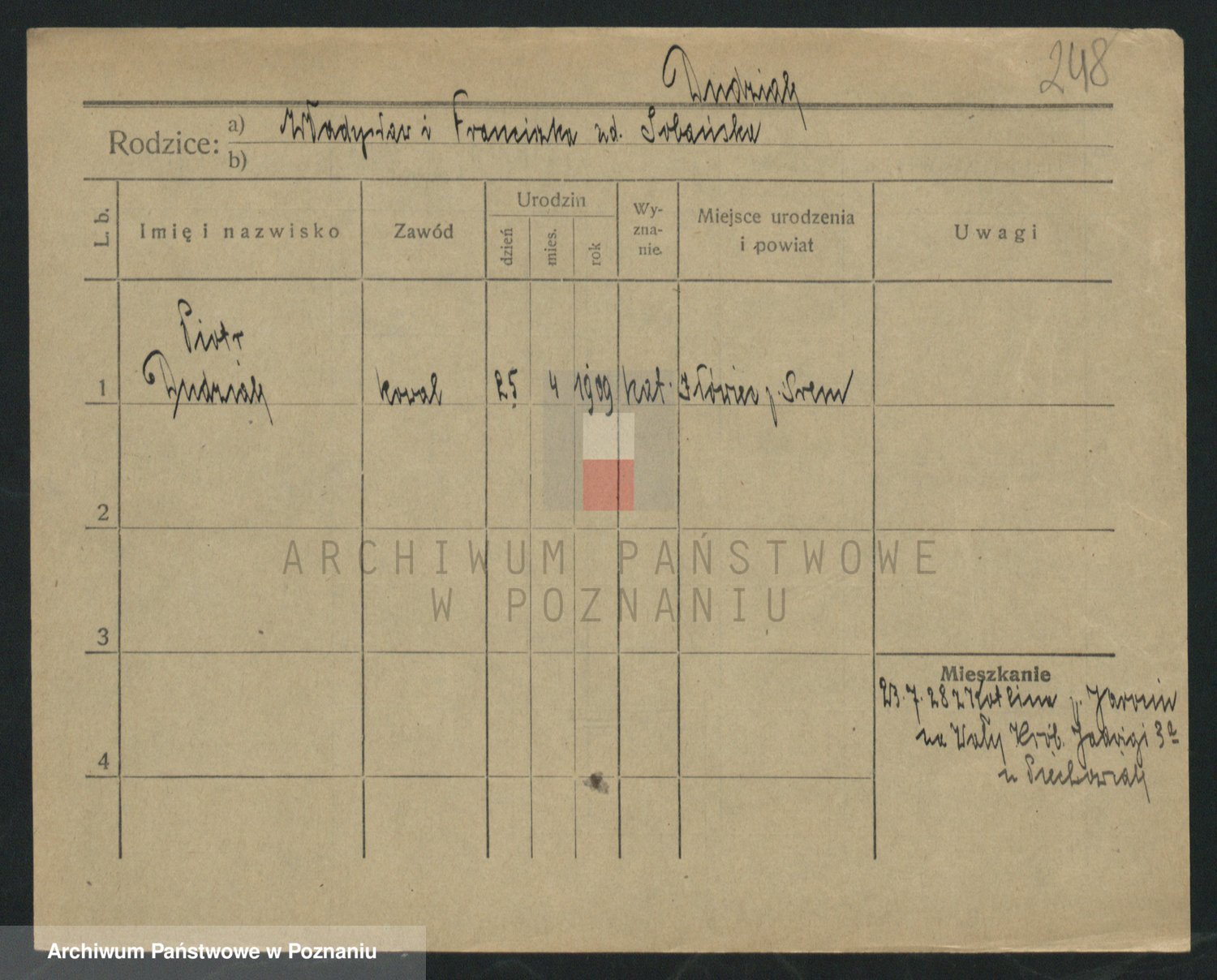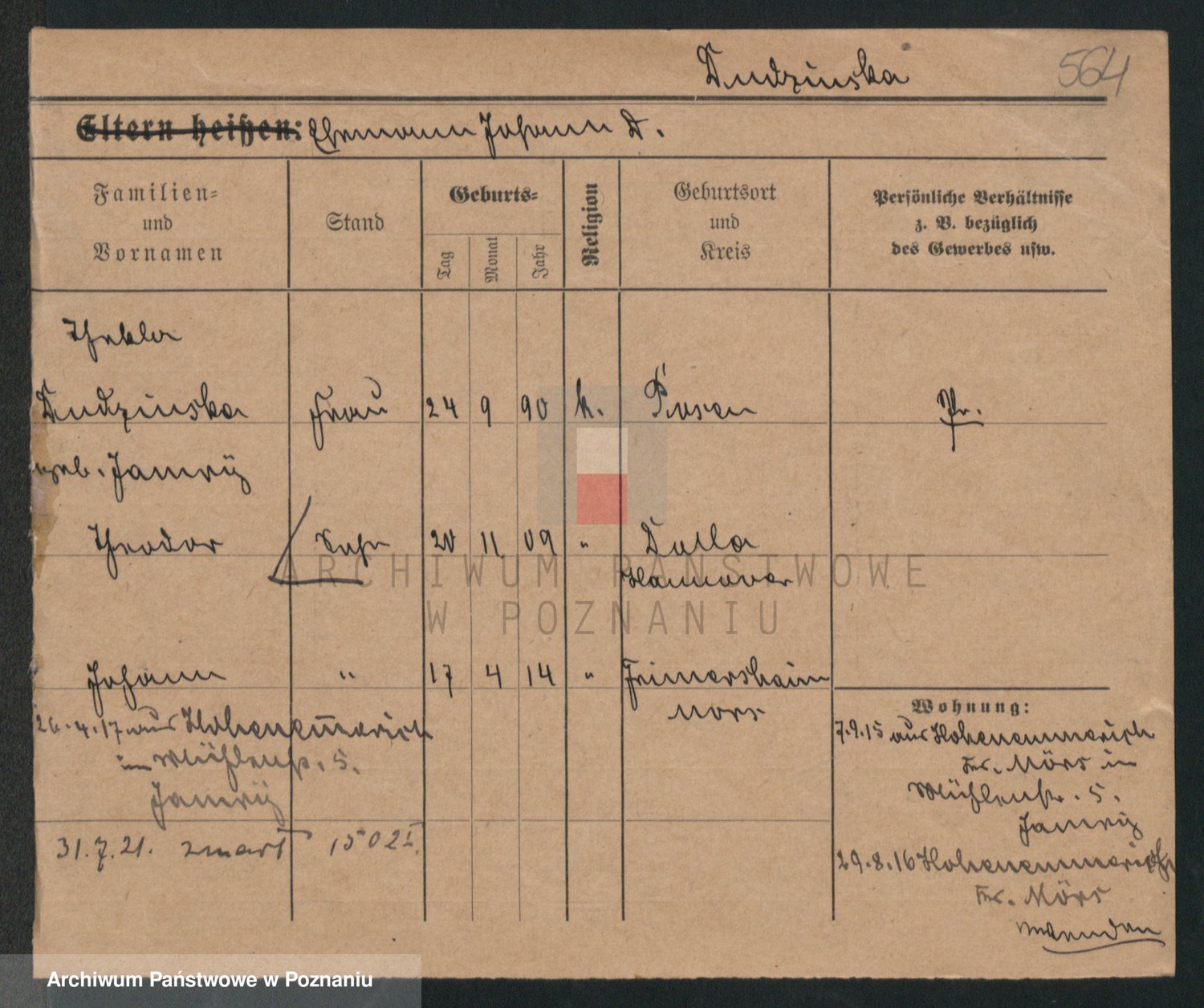 Podgląd karty osobowej dostępny jest po kliknięciu na nazwisko lub ikonkę karty. Można dokonywać powiększenia (ikony na górze) lub przechodzić między kolejnymi skanami (strzałki po bokach).
