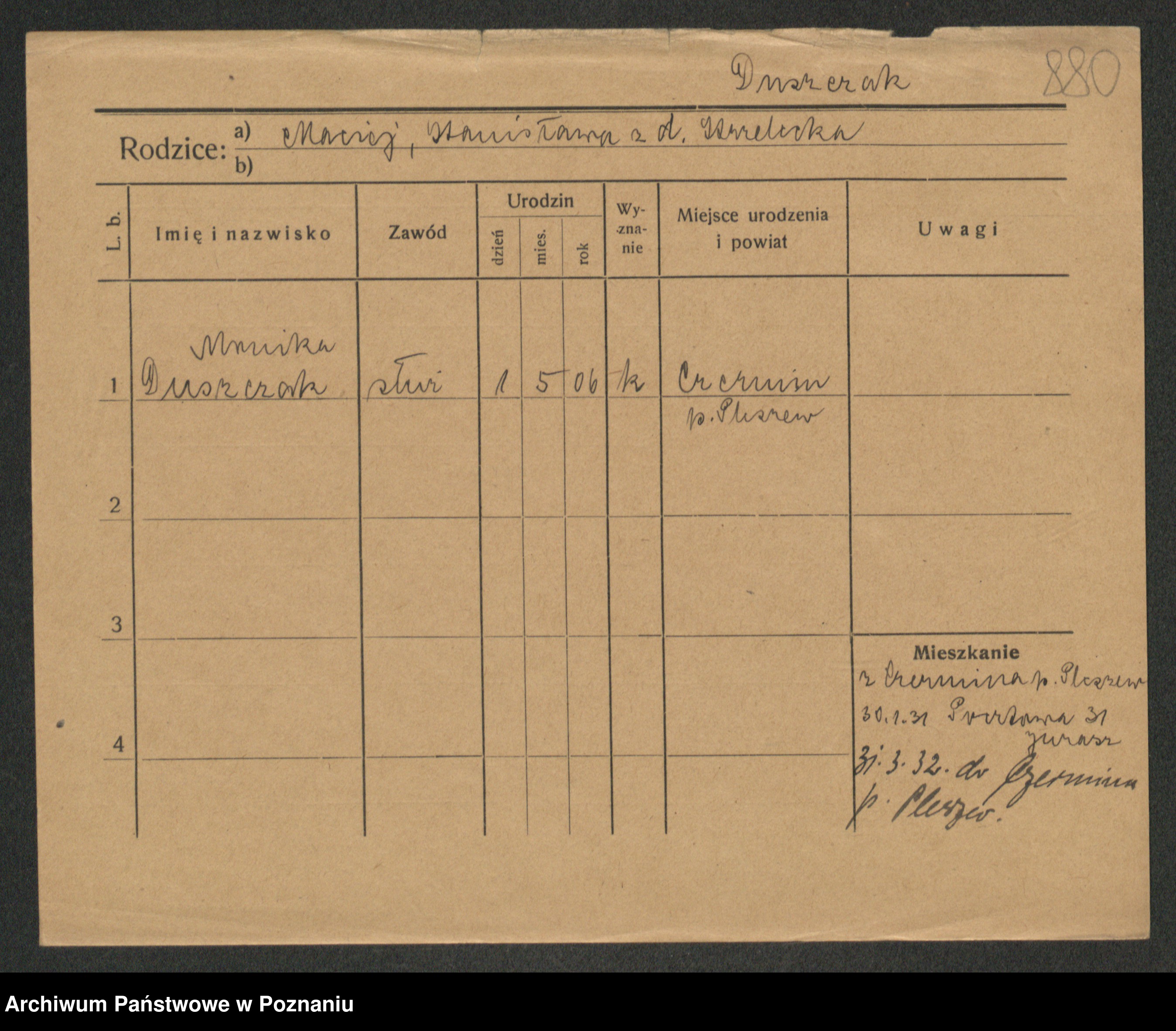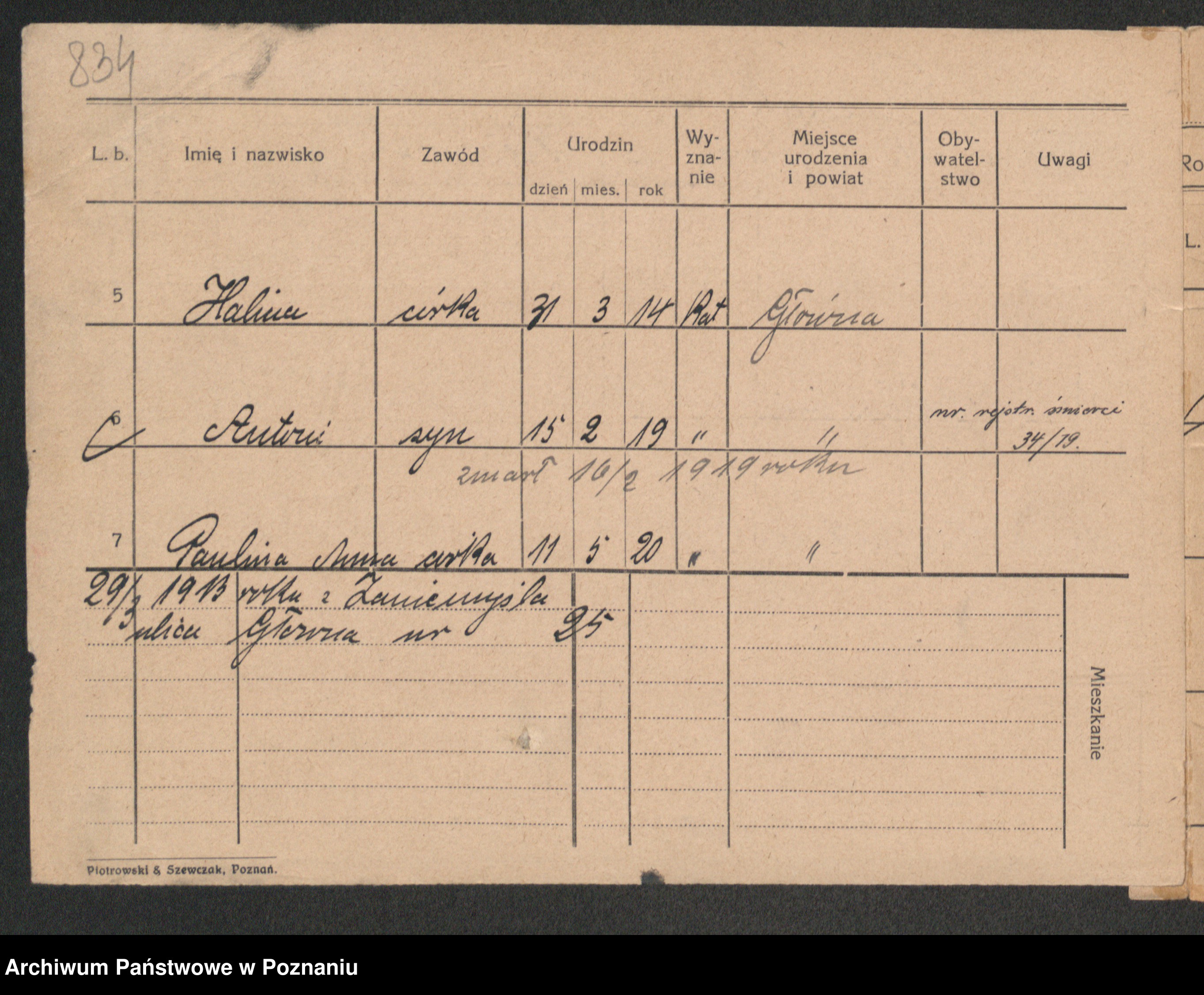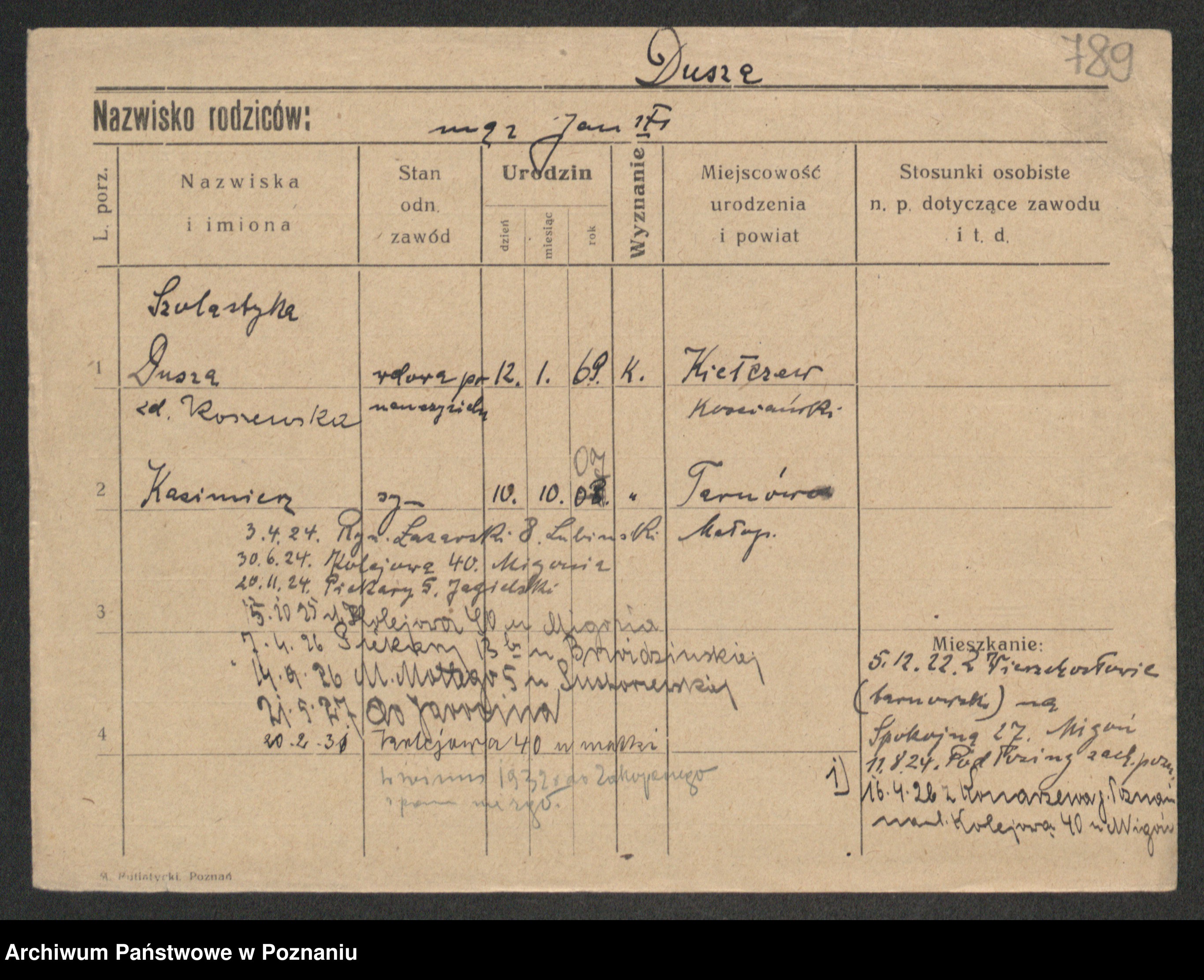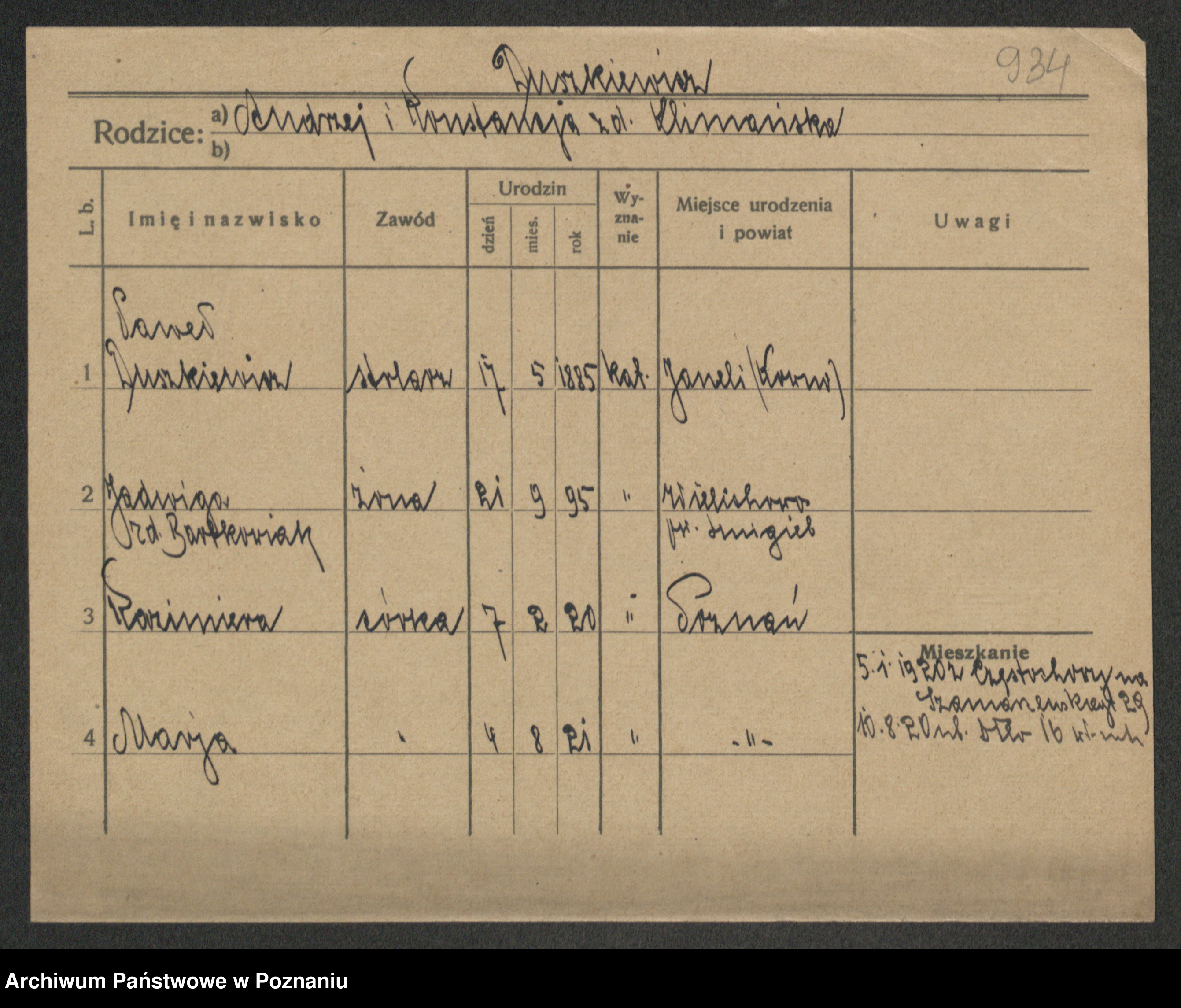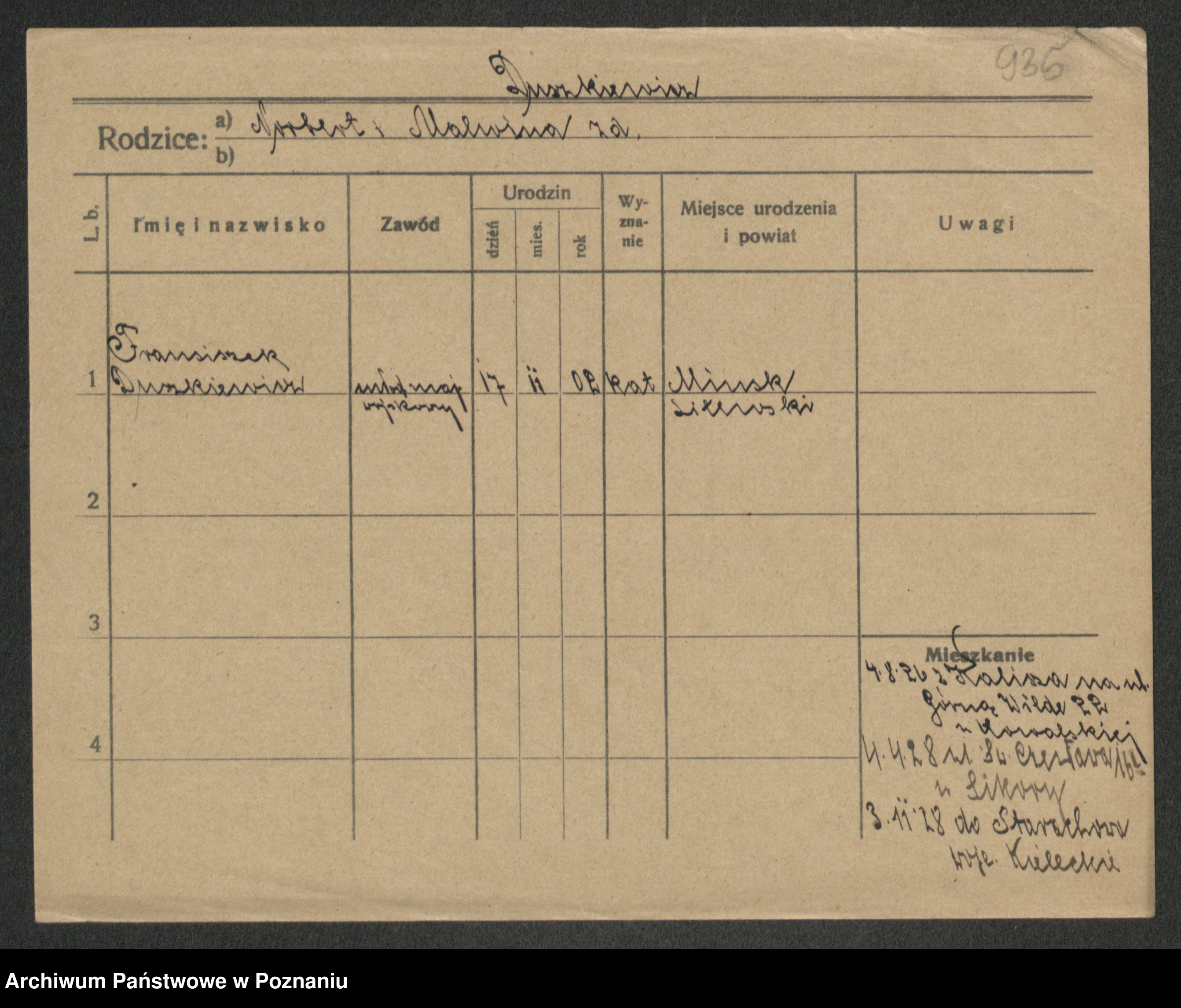 Podgląd karty osobowej dostępny jest po kliknięciu na nazwisko lub ikonkę karty. Można dokonywać powiększenia (ikony na górze) lub przechodzić między kolejnymi skanami (strzałki po bokach).