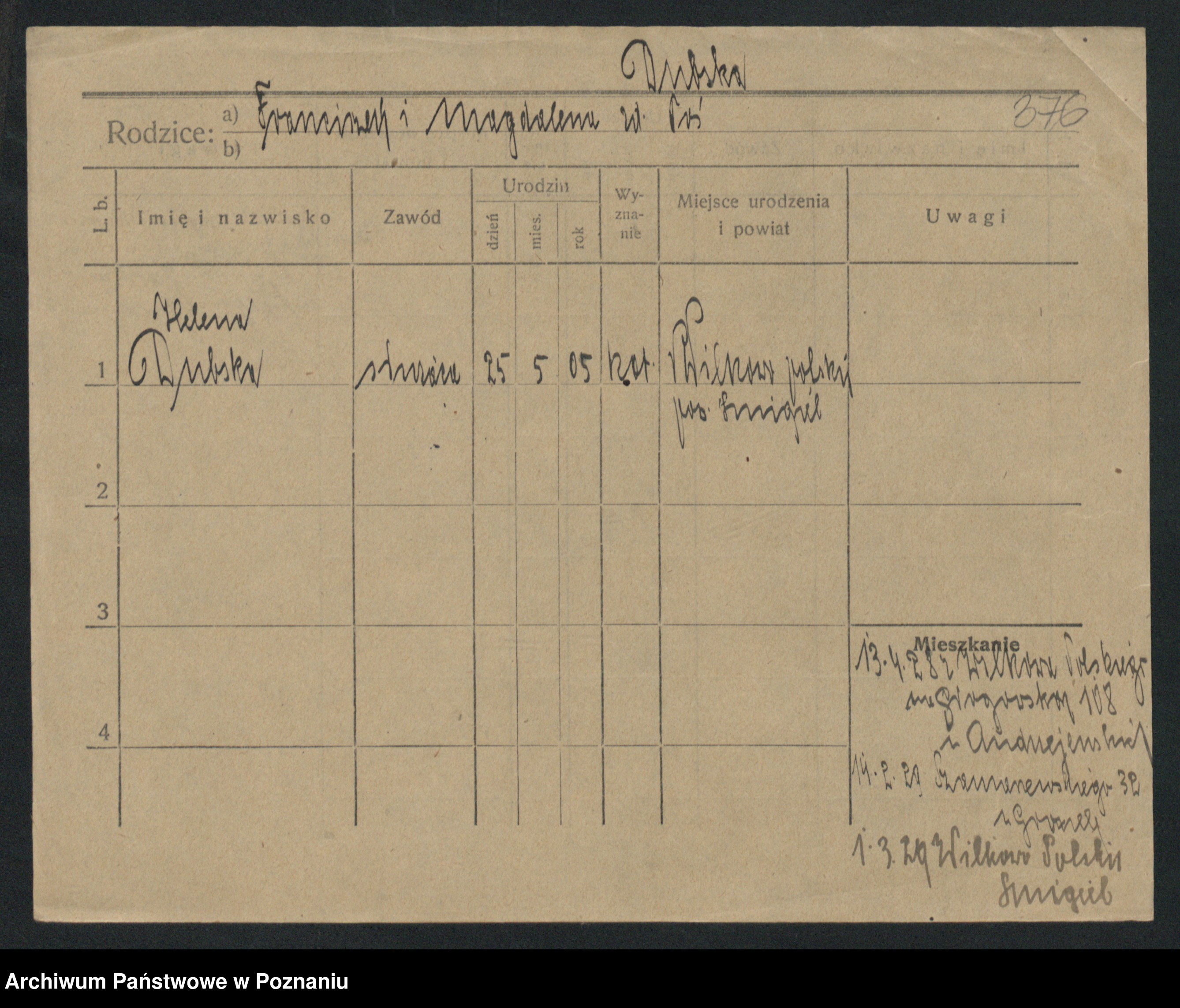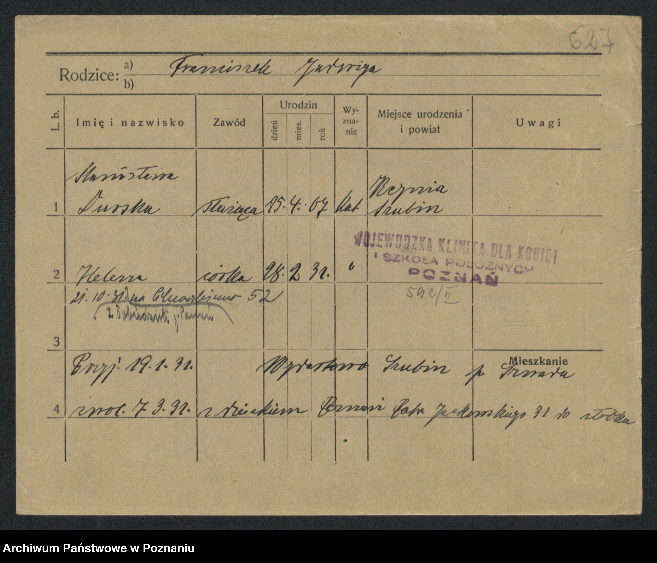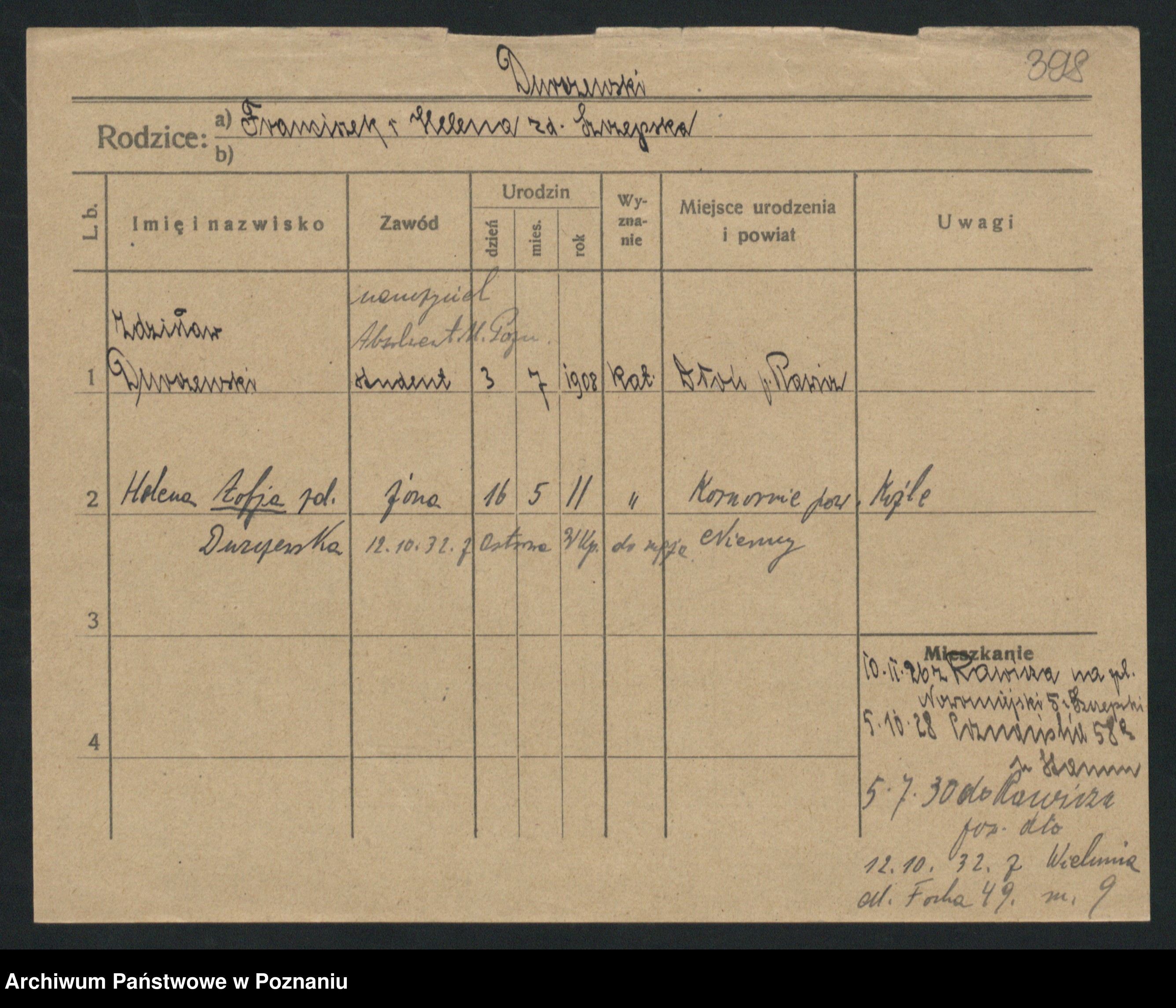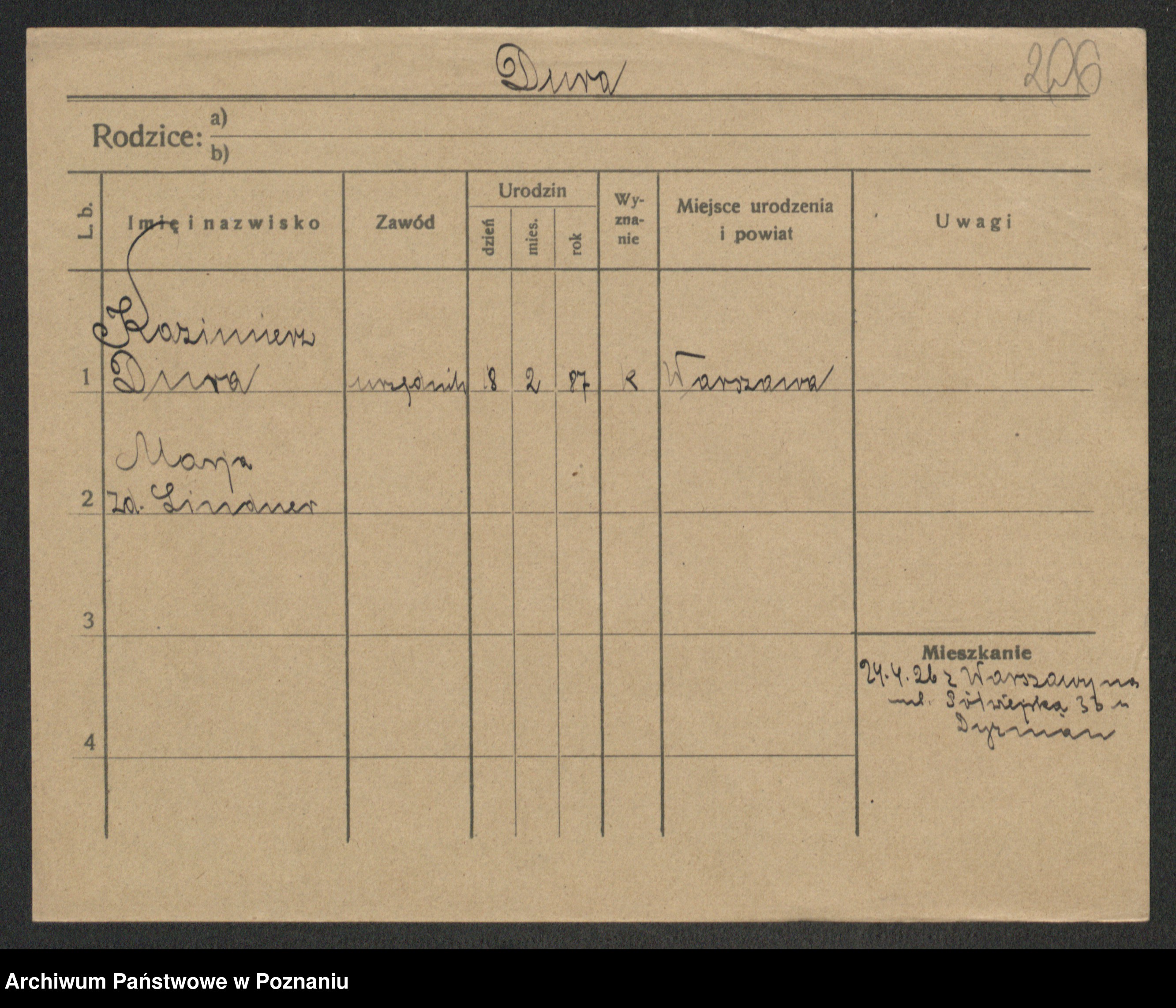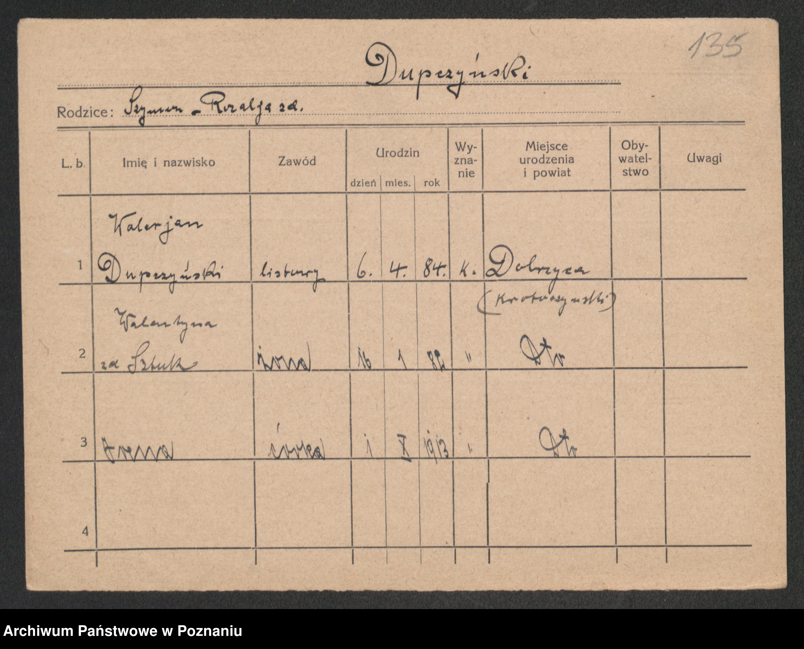 Podgląd karty osobowej dostępny jest po kliknięciu na nazwisko lub ikonkę karty. Można dokonywać powiększenia (ikony na górze) lub przechodzić między kolejnymi skanami (strzałki po bokach).