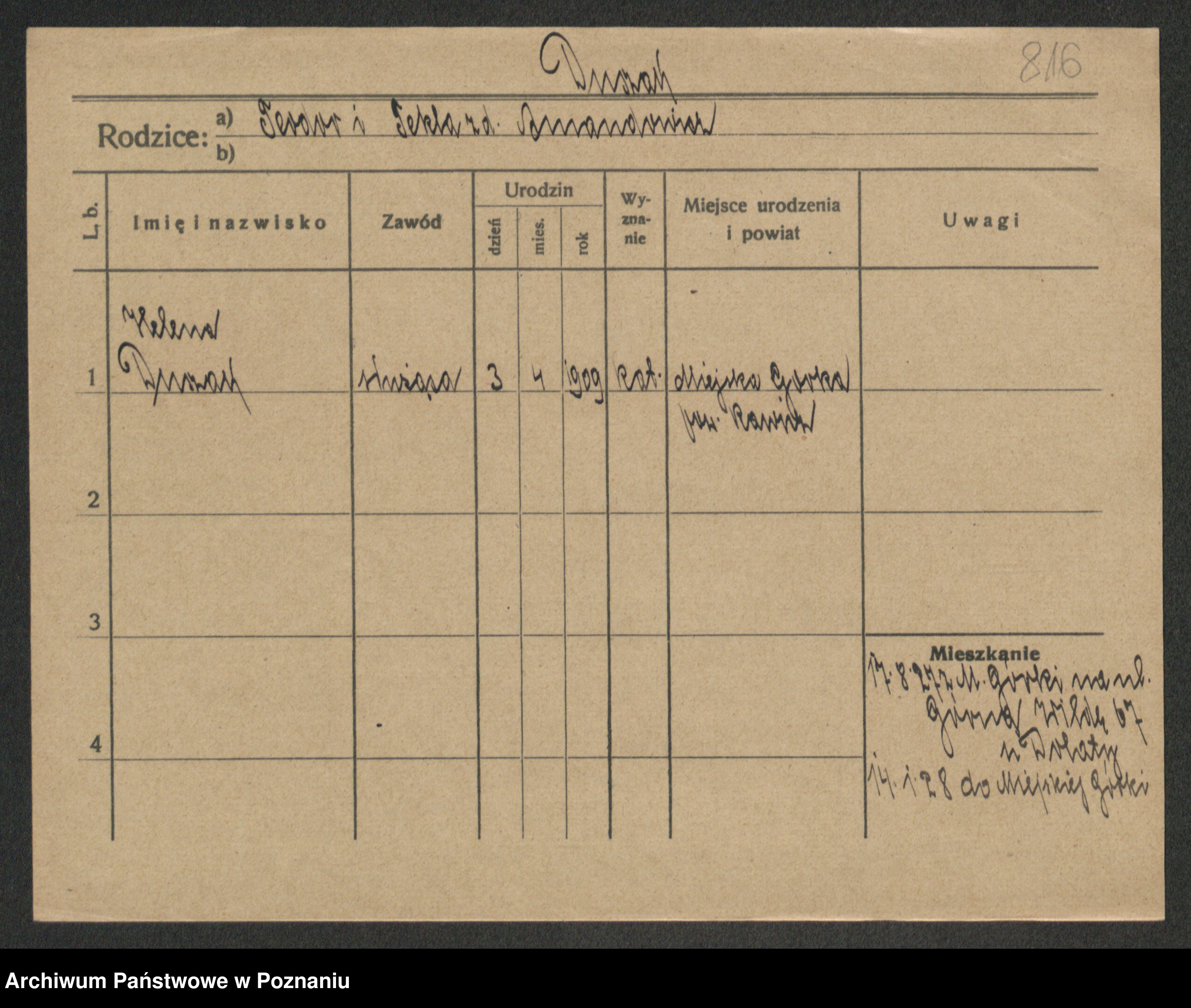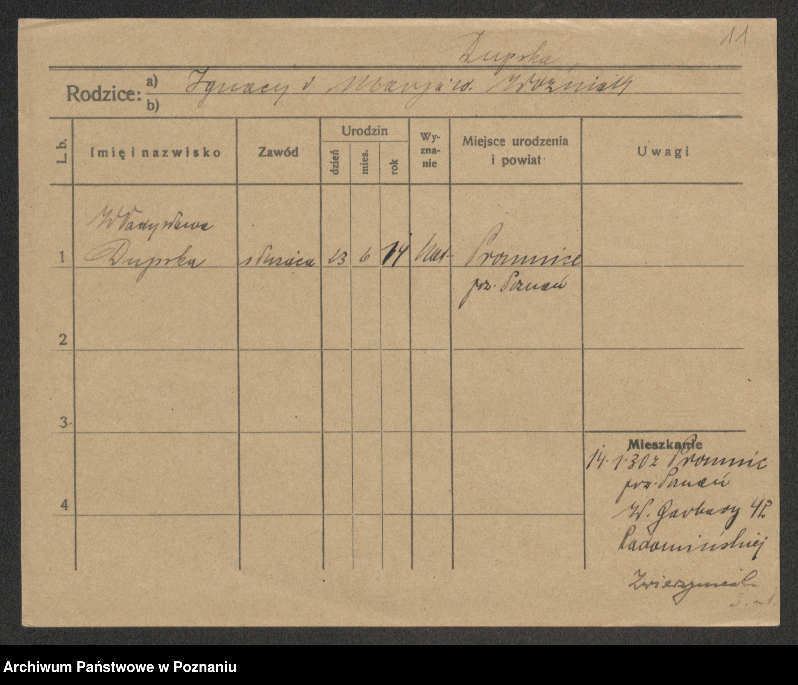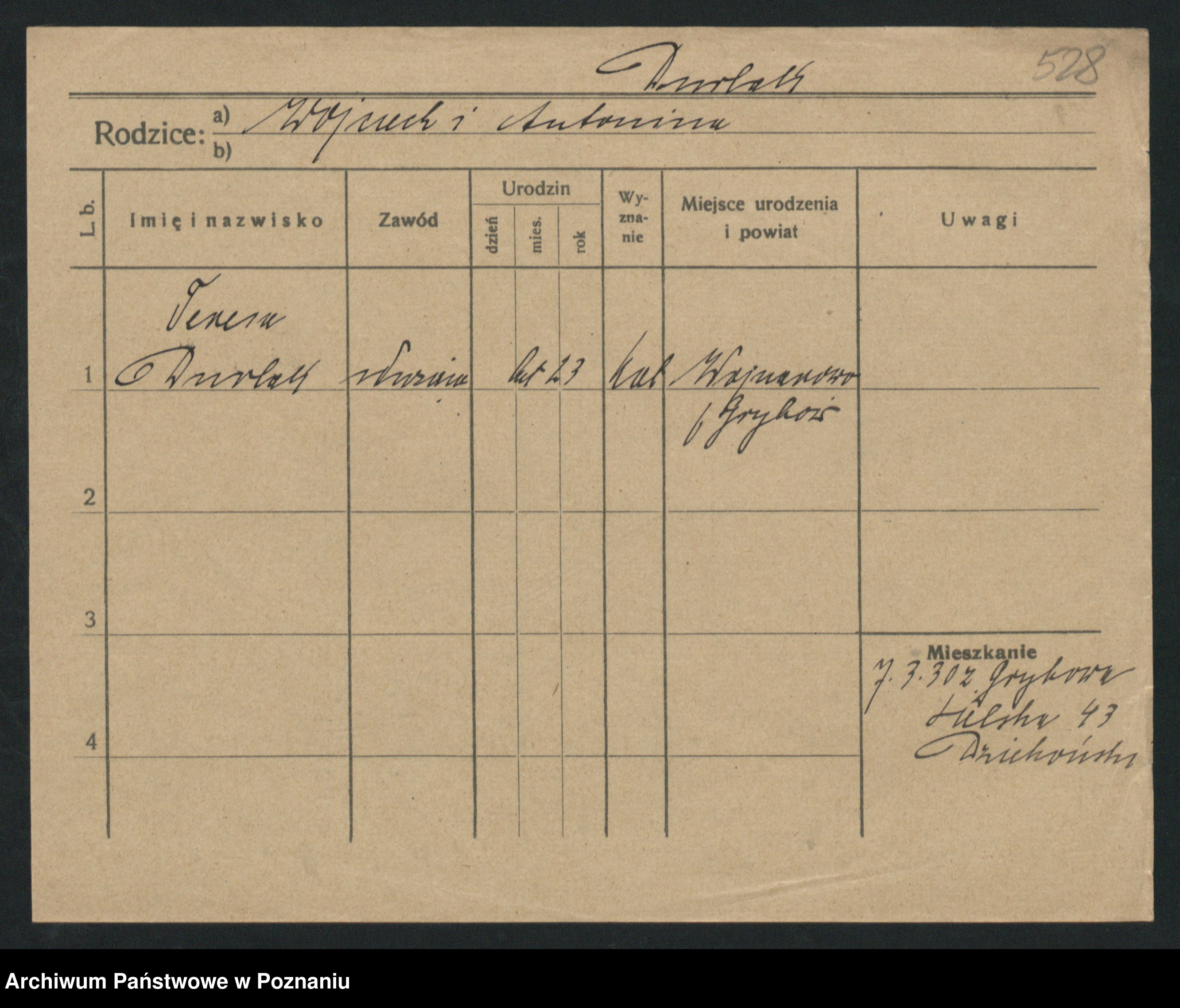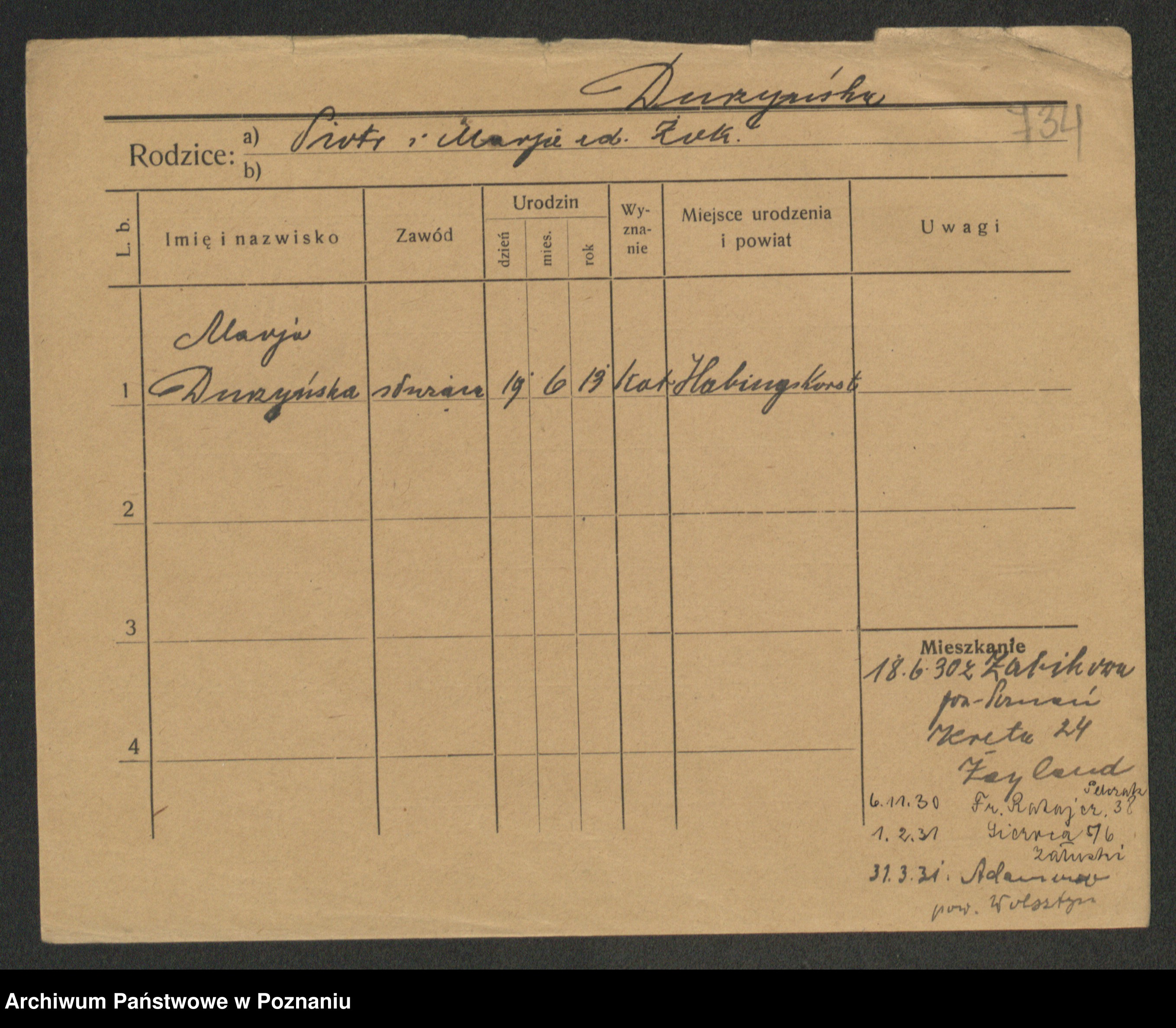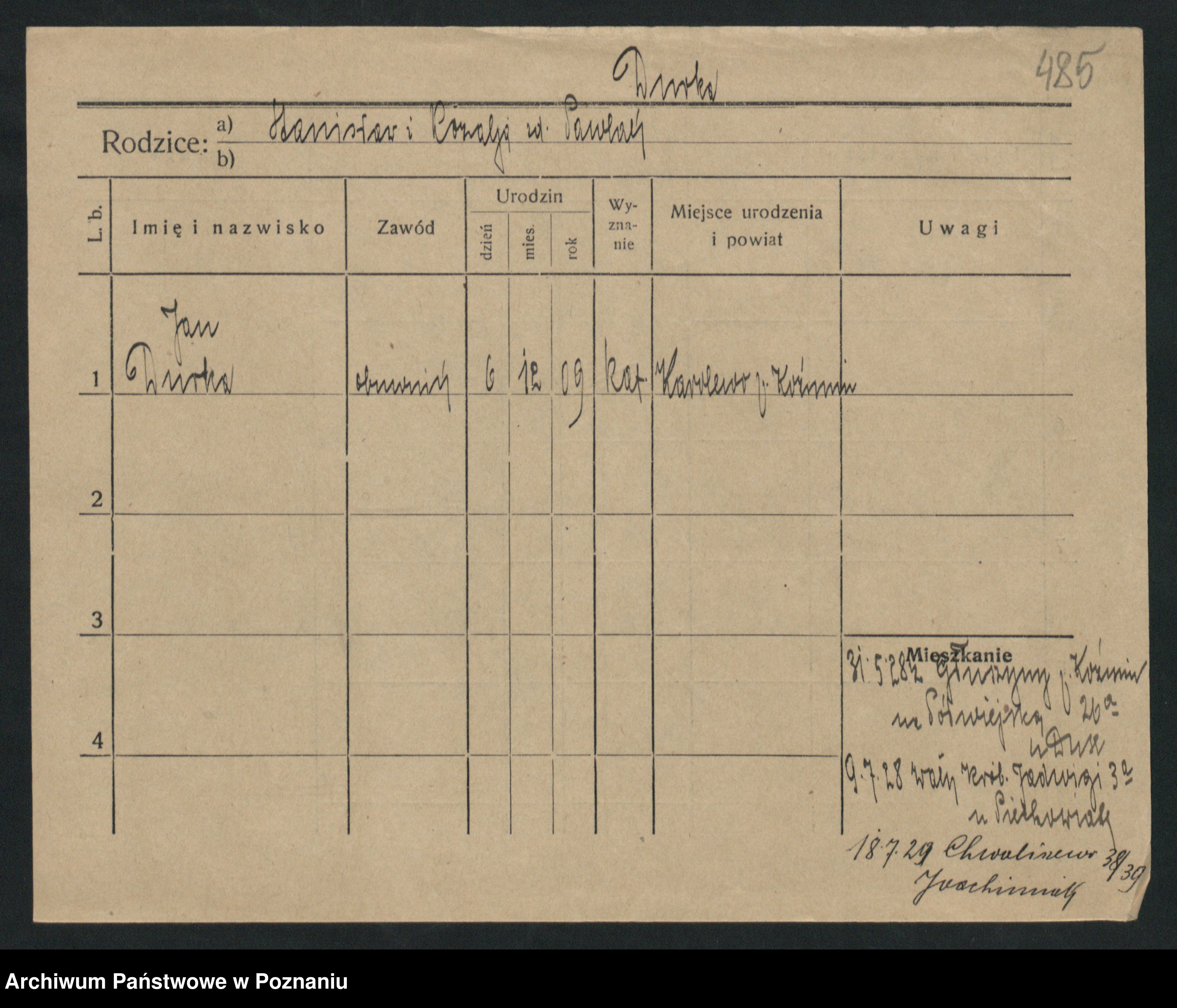 Podgląd karty osobowej dostępny jest po kliknięciu na nazwisko lub ikonkę karty. Można dokonywać powiększenia (ikony na górze) lub przechodzić między kolejnymi skanami (strzałki po bokach).