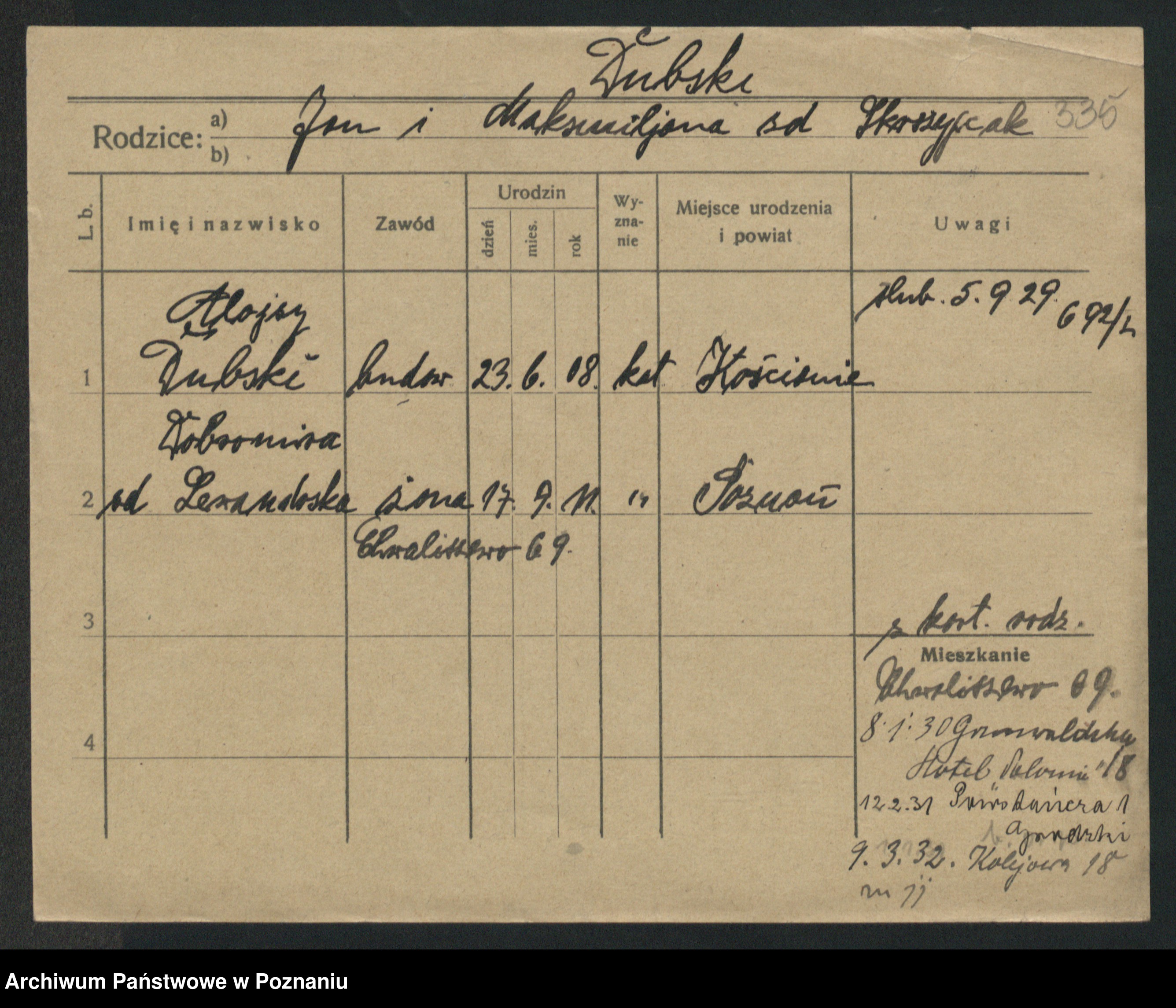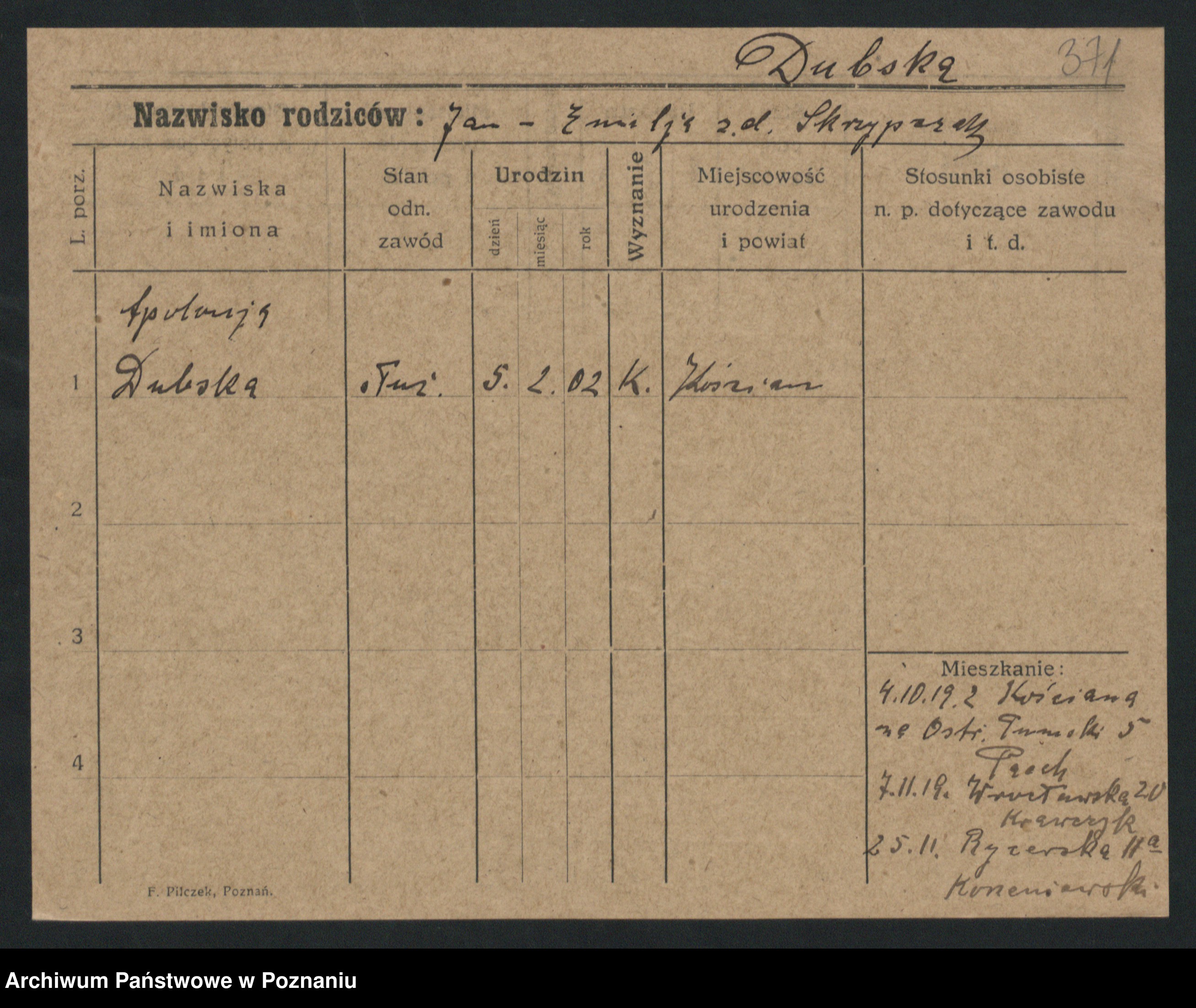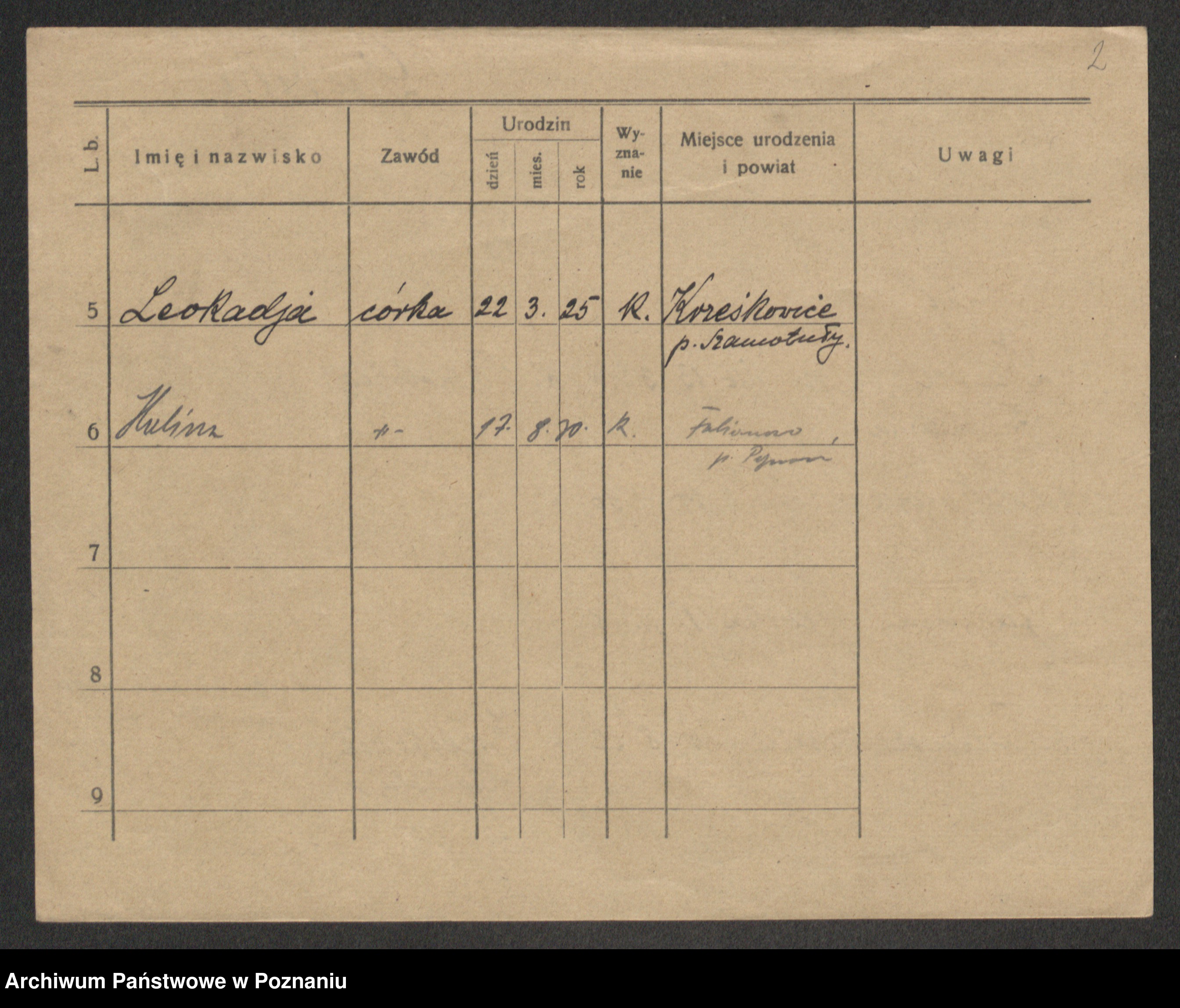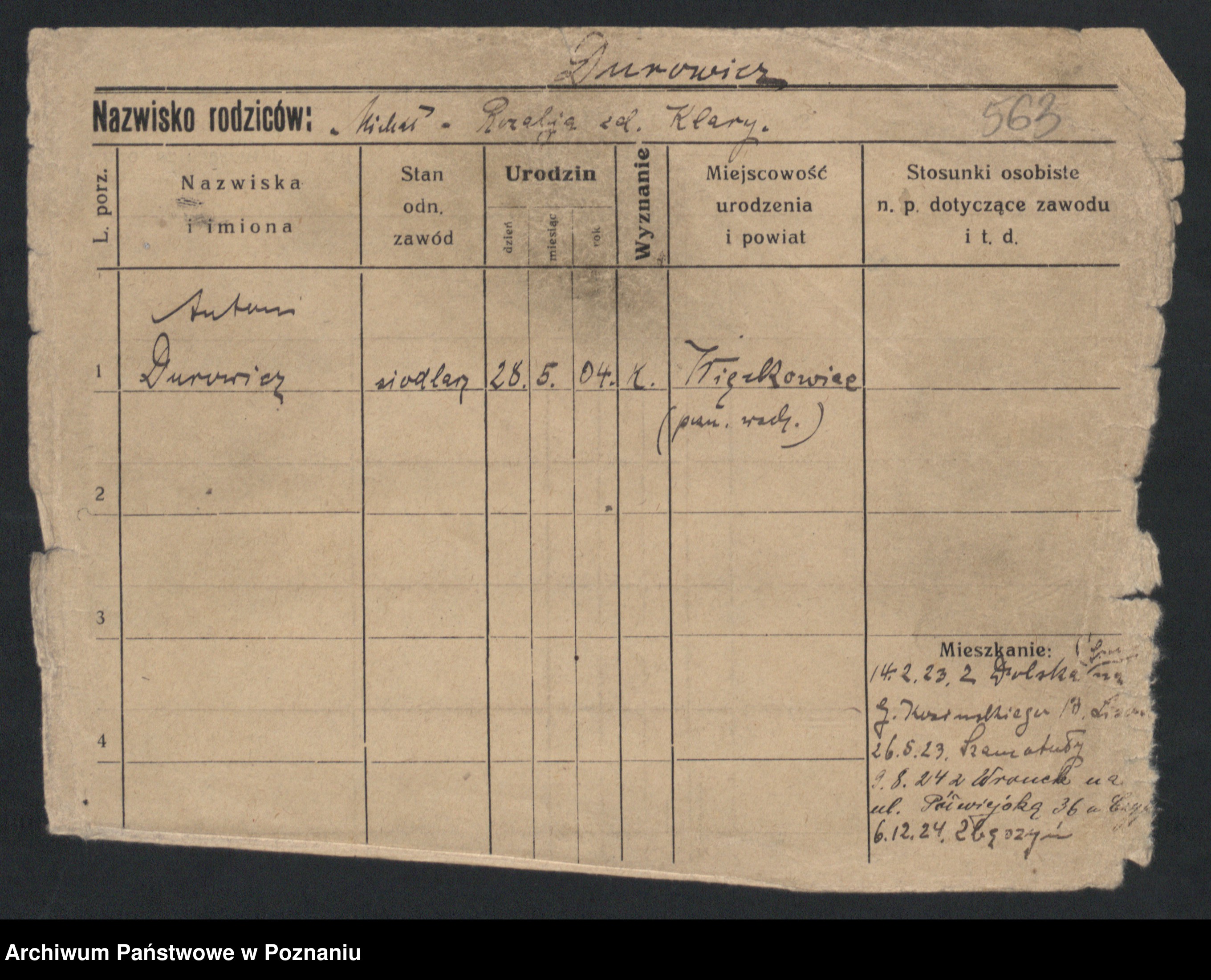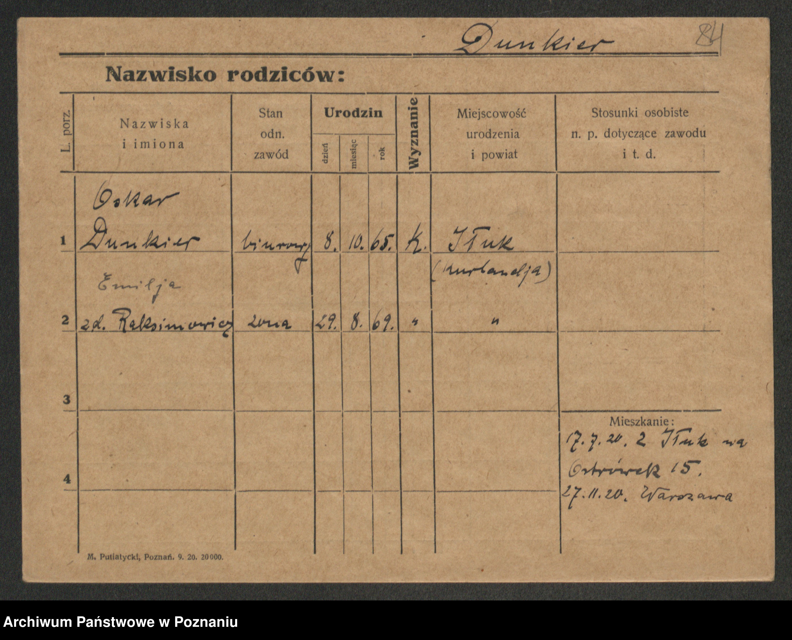 Podgląd karty osobowej dostępny jest po kliknięciu na nazwisko lub ikonkę karty. Można dokonywać powiększenia (ikony na górze) lub przechodzić między kolejnymi skanami (strzałki po bokach).