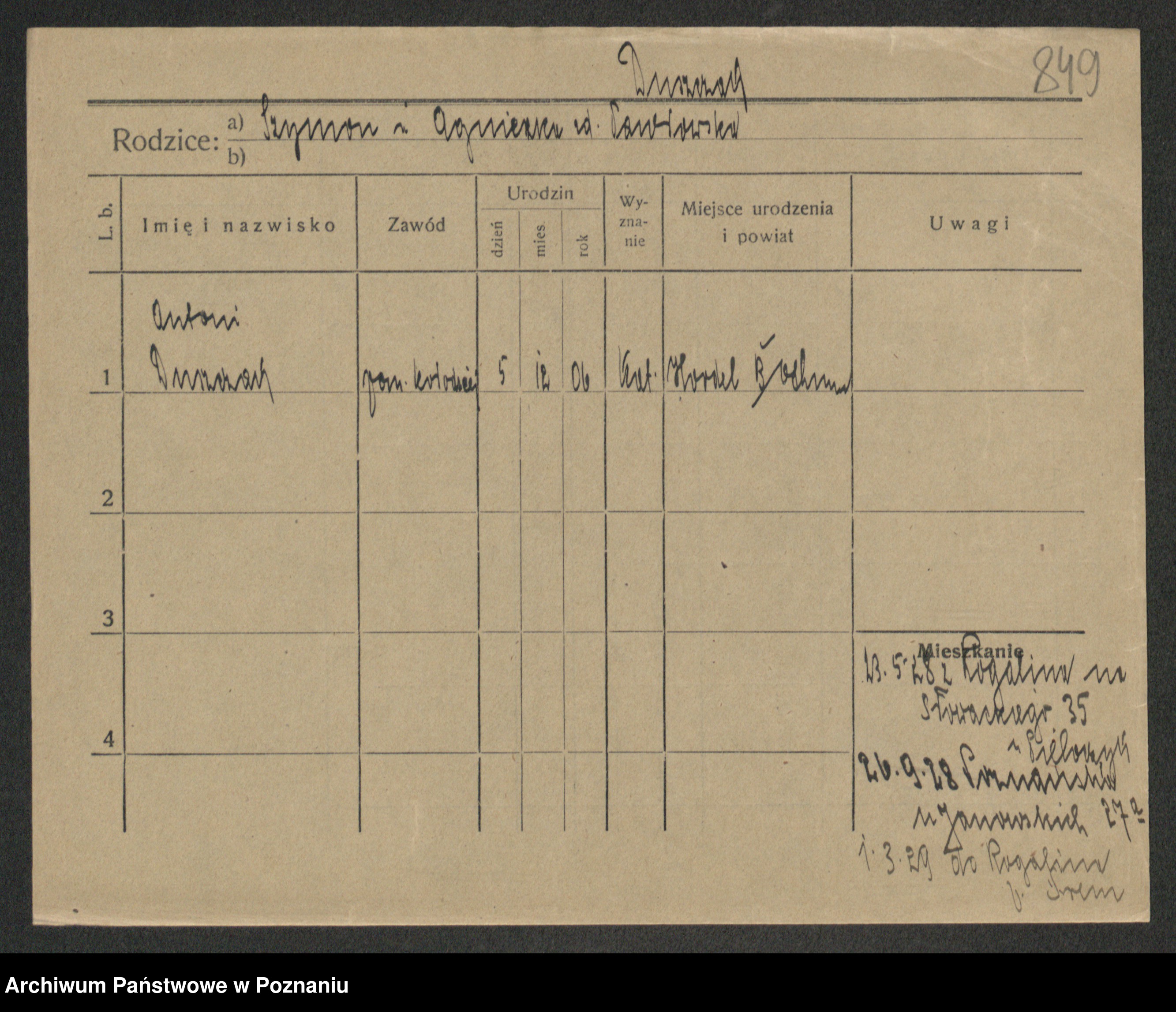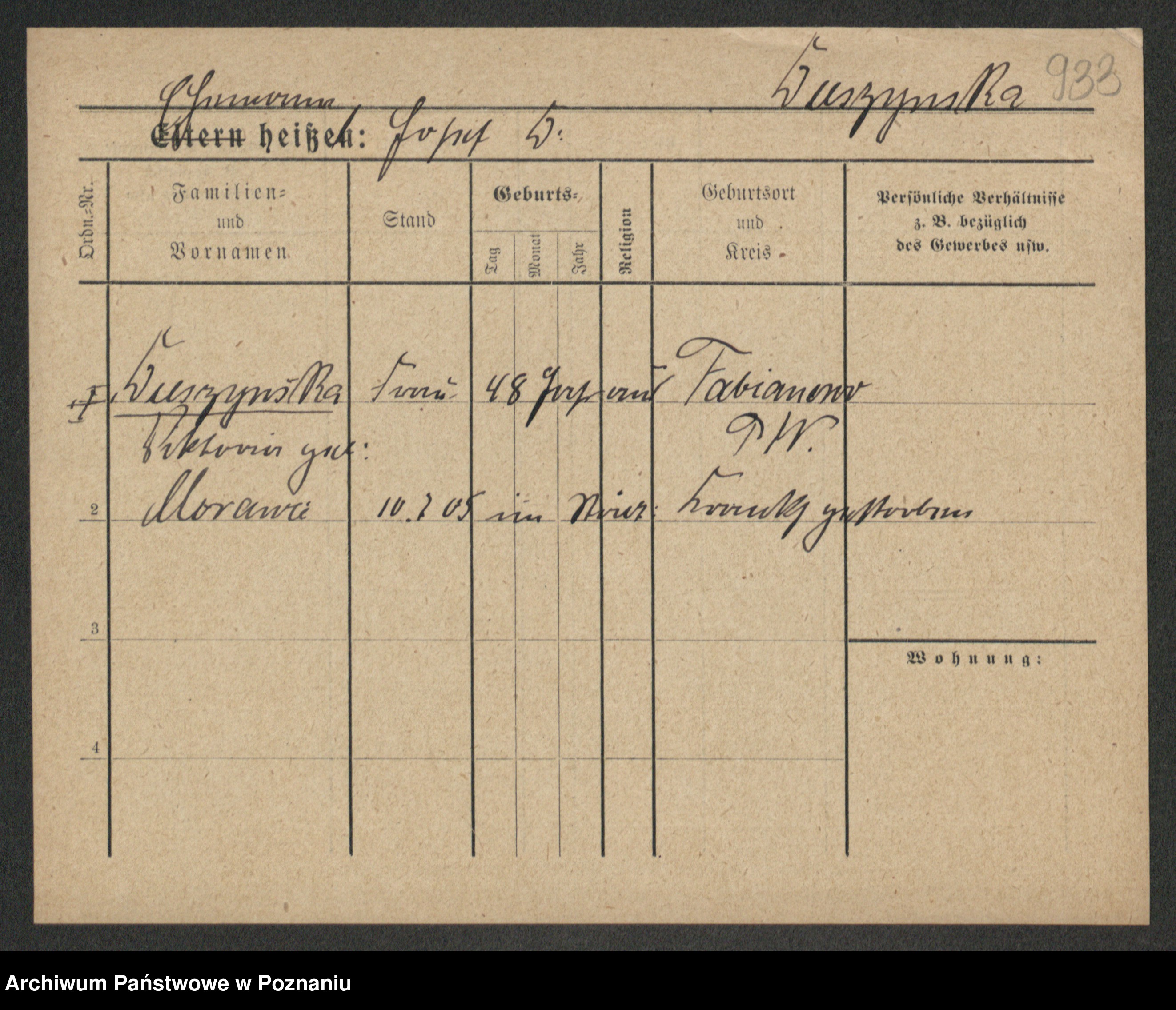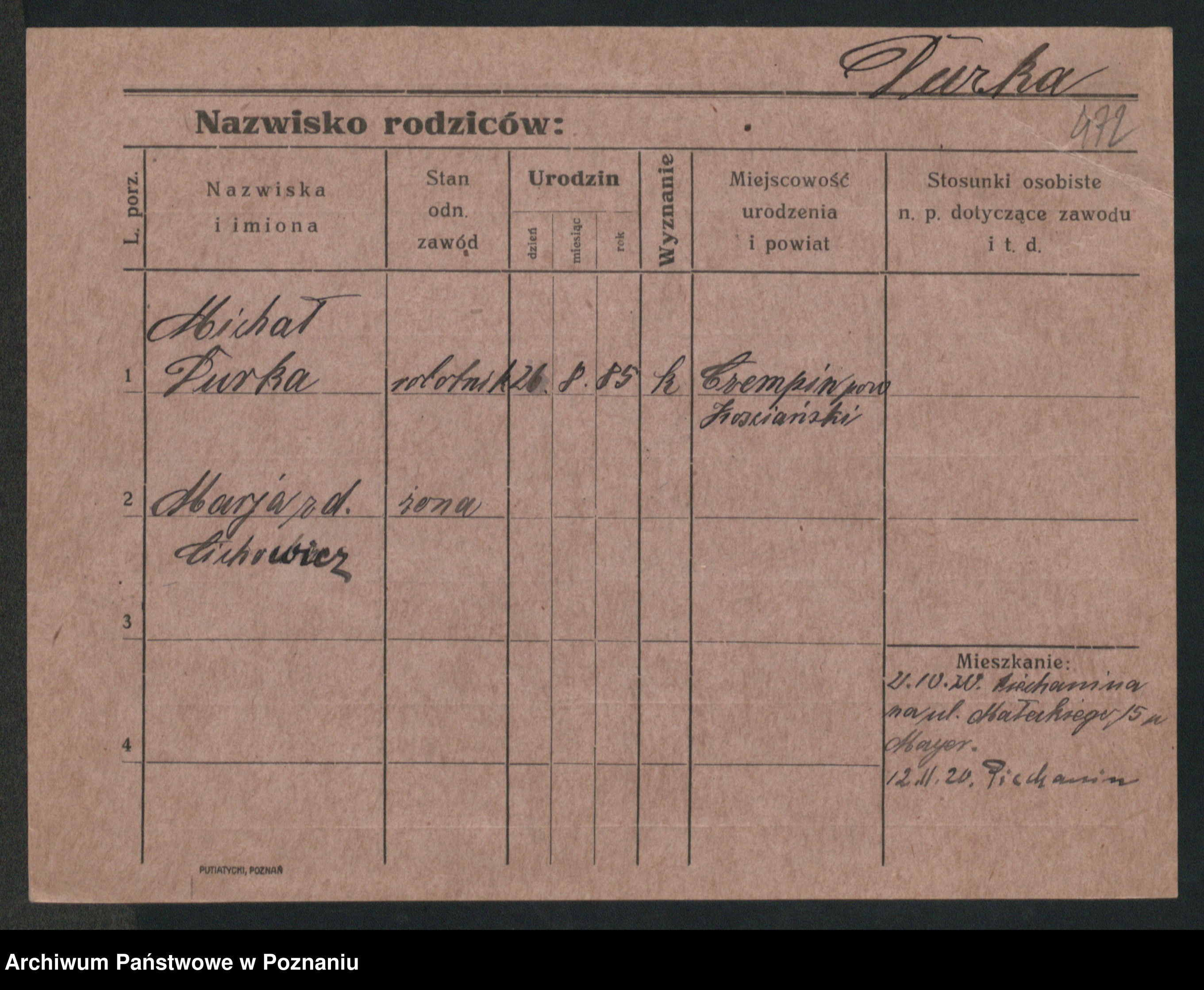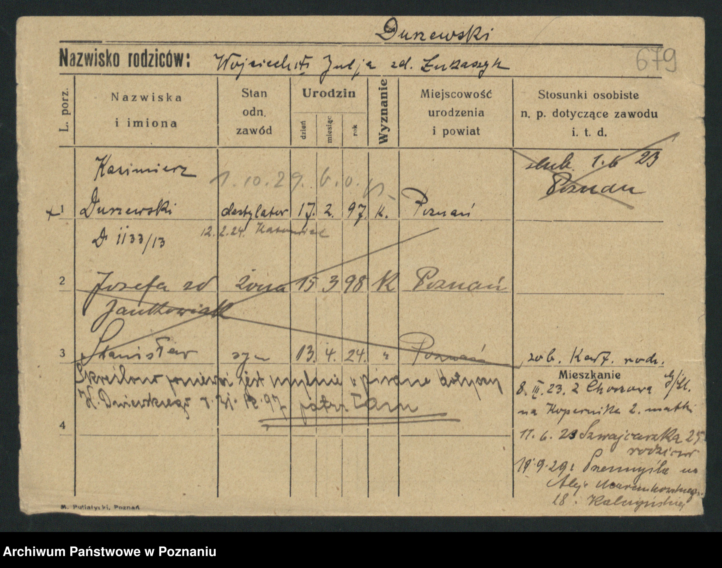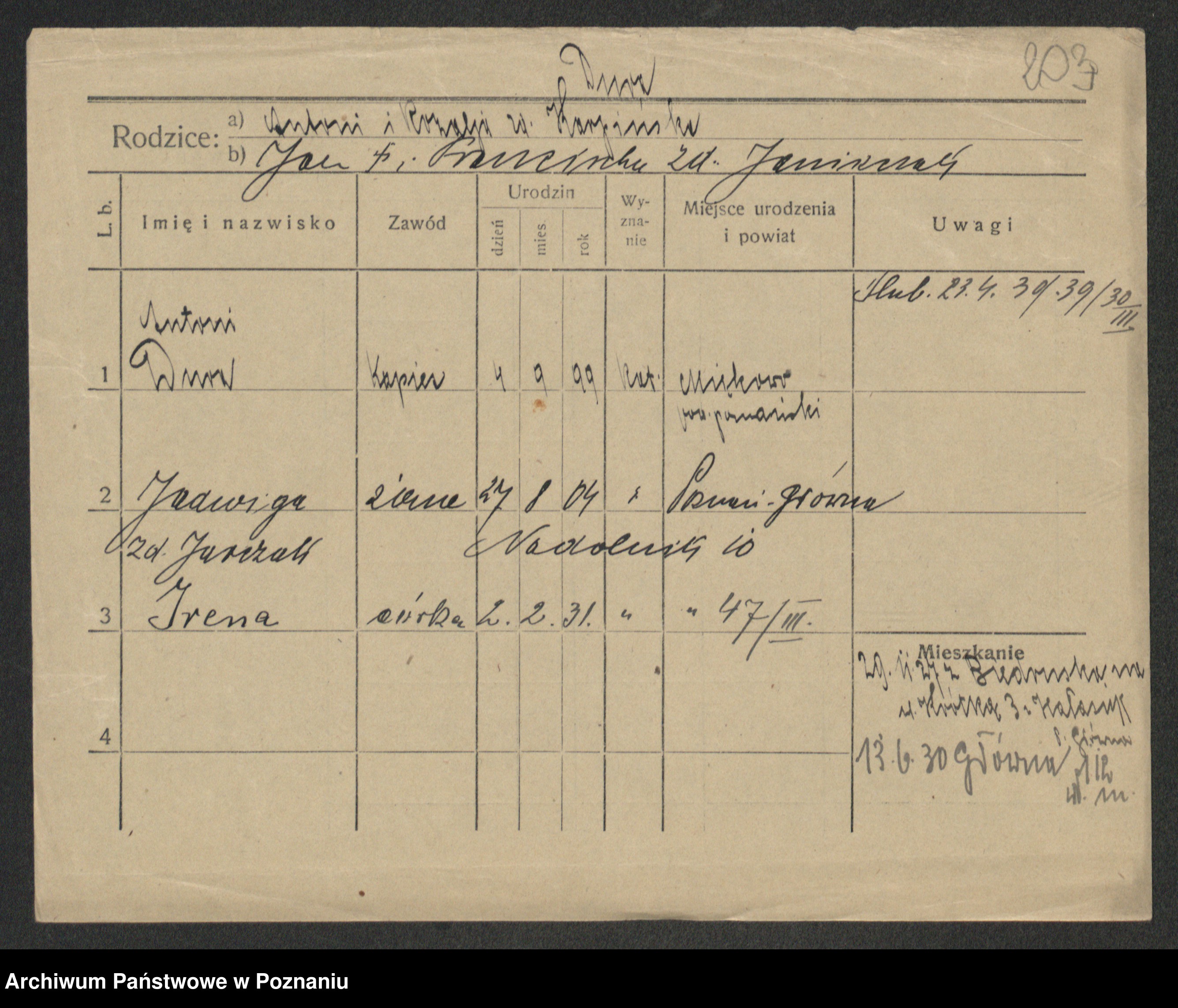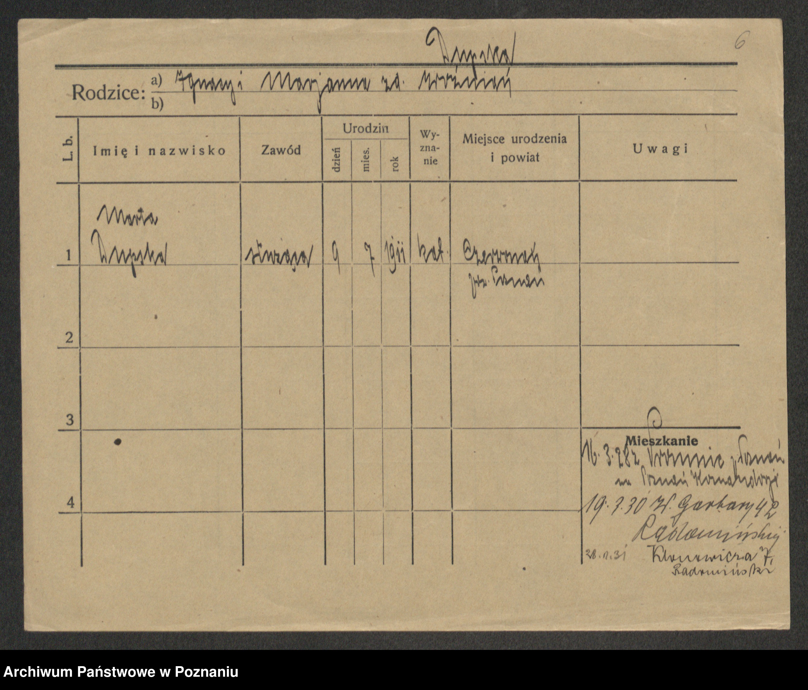 Podgląd karty osobowej dostępny jest po kliknięciu na nazwisko lub ikonkę karty. Można dokonywać powiększenia (ikony na górze) lub przechodzić między kolejnymi skanami (strzałki po bokach).