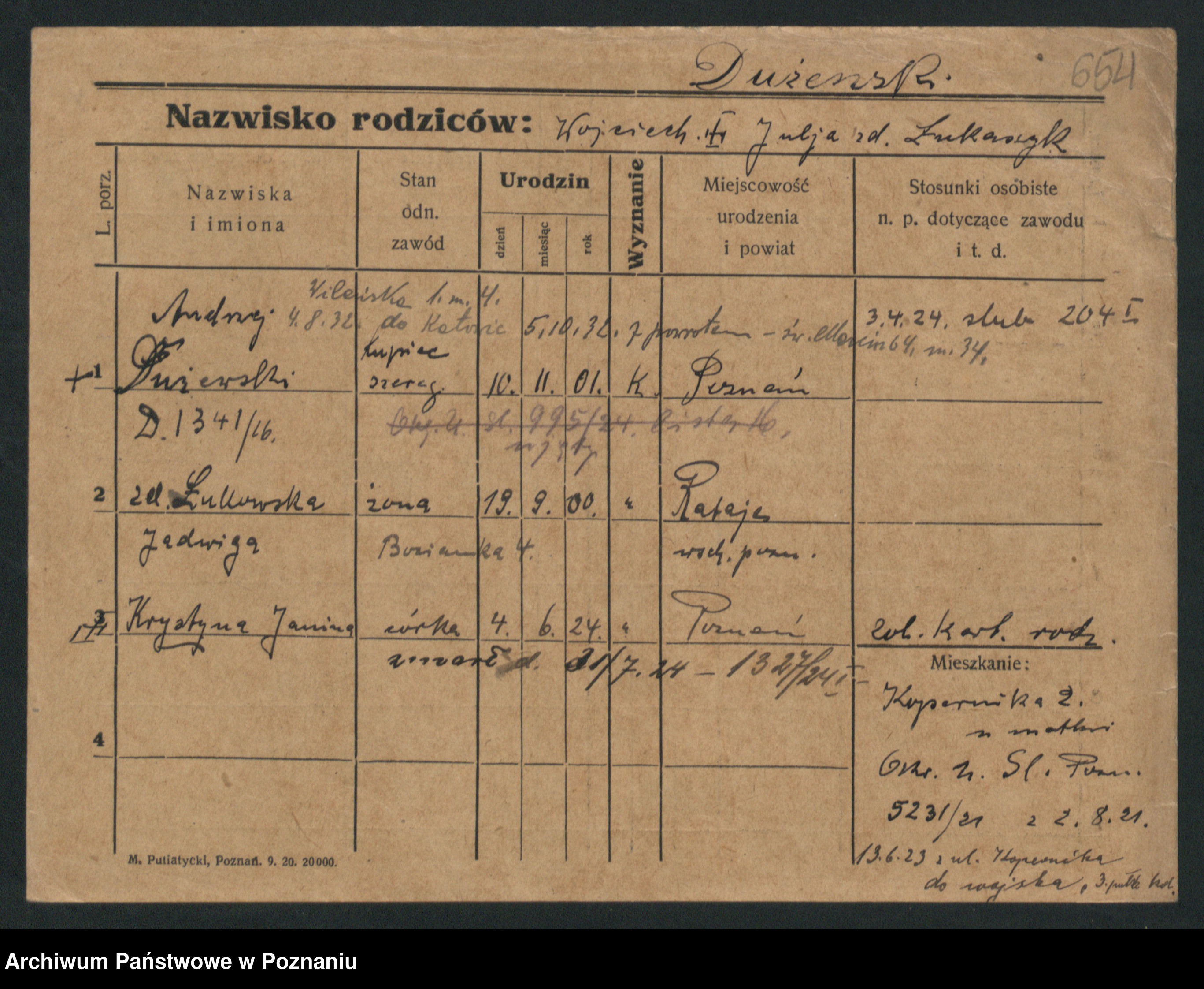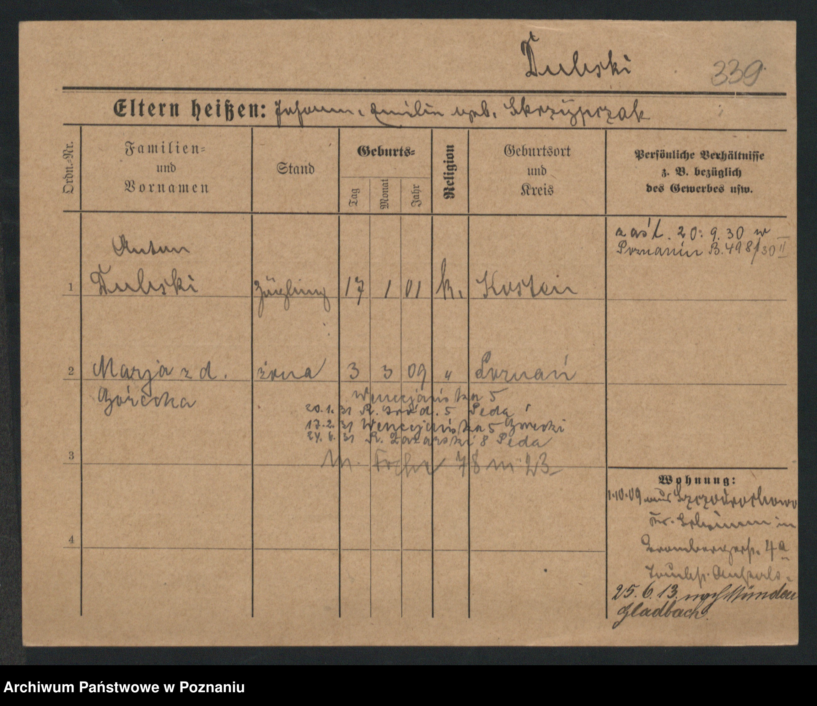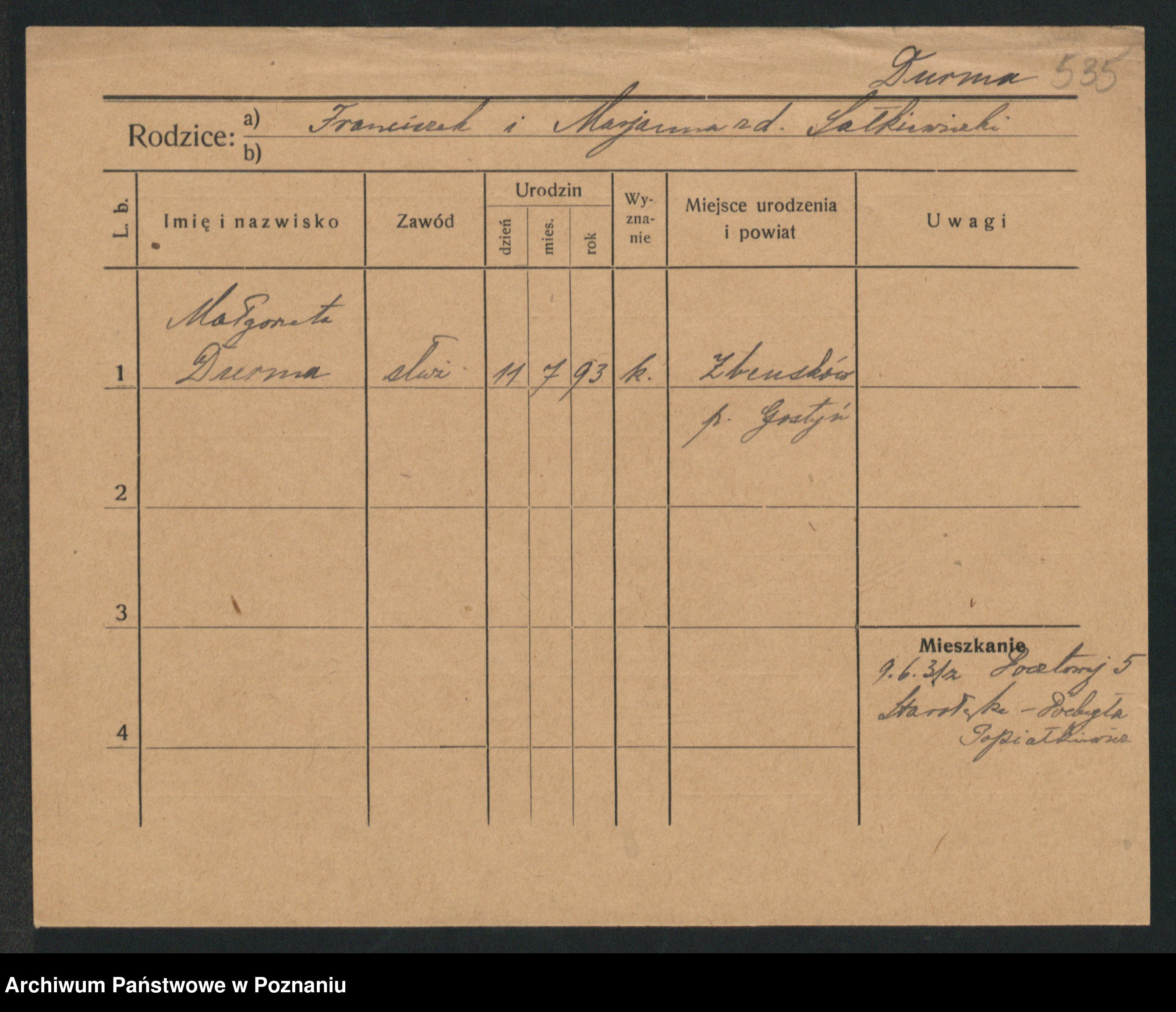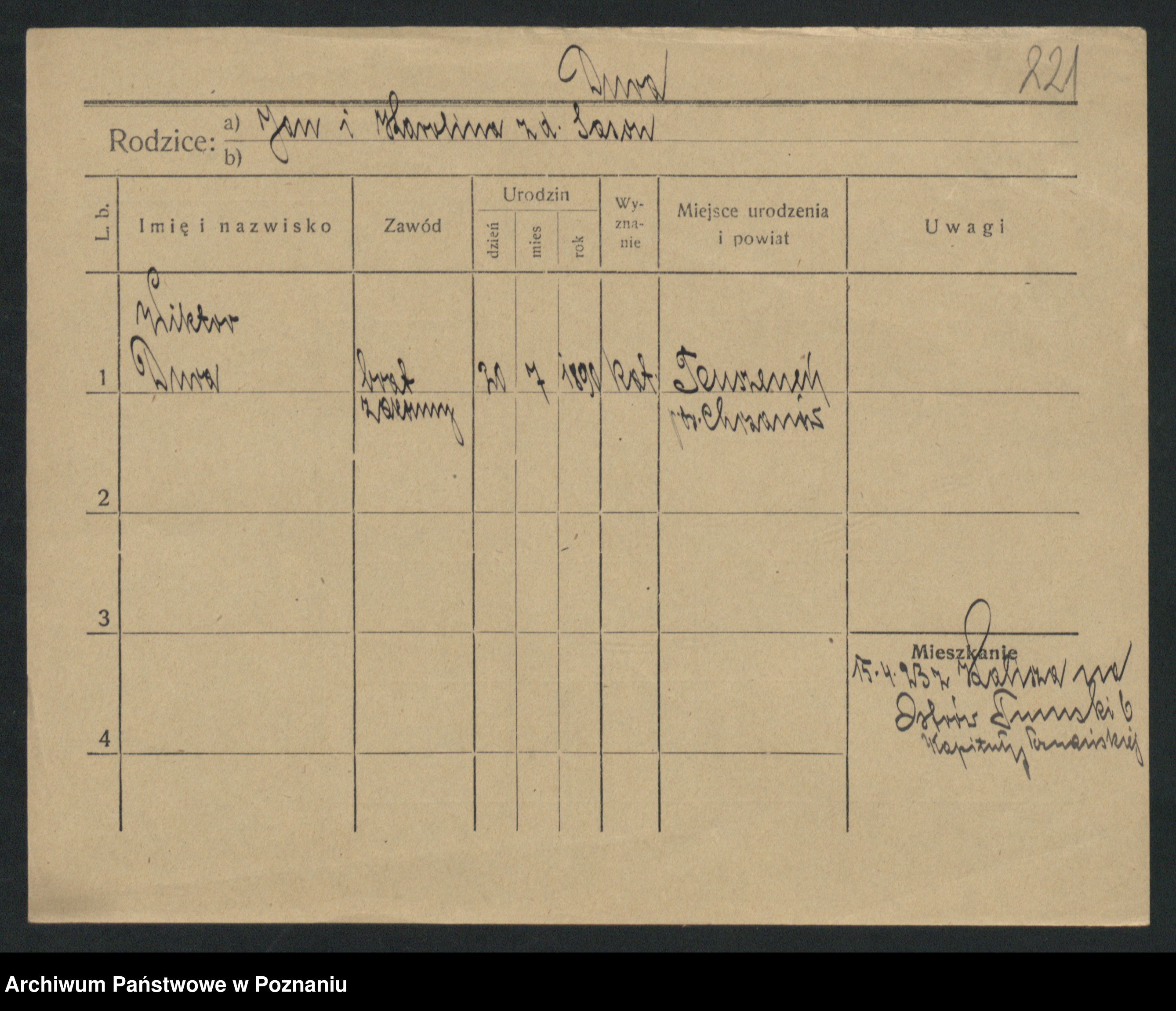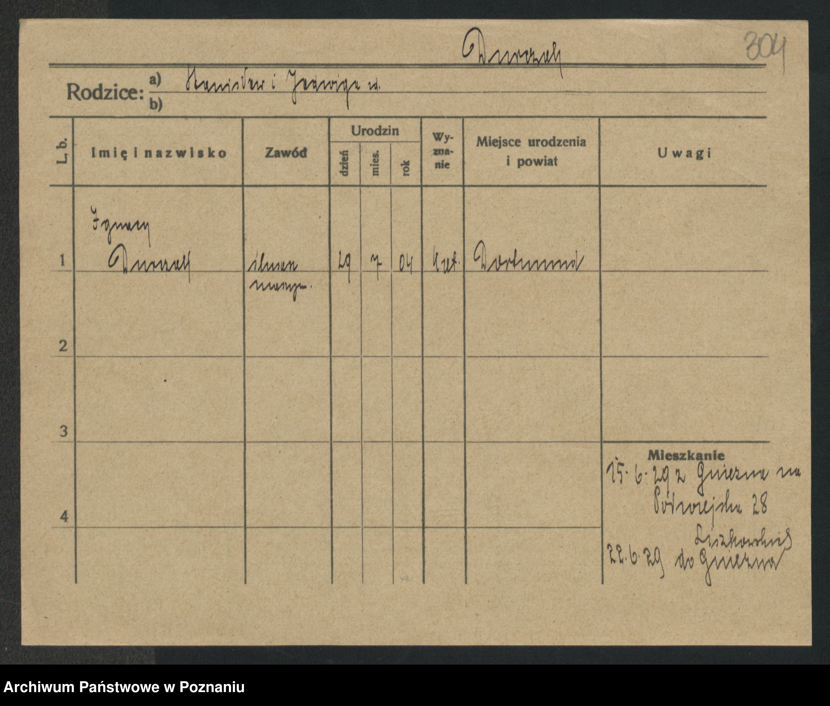 Podgląd karty osobowej dostępny jest po kliknięciu na nazwisko lub ikonkę karty. Można dokonywać powiększenia (ikony na górze) lub przechodzić między kolejnymi skanami (strzałki po bokach).
