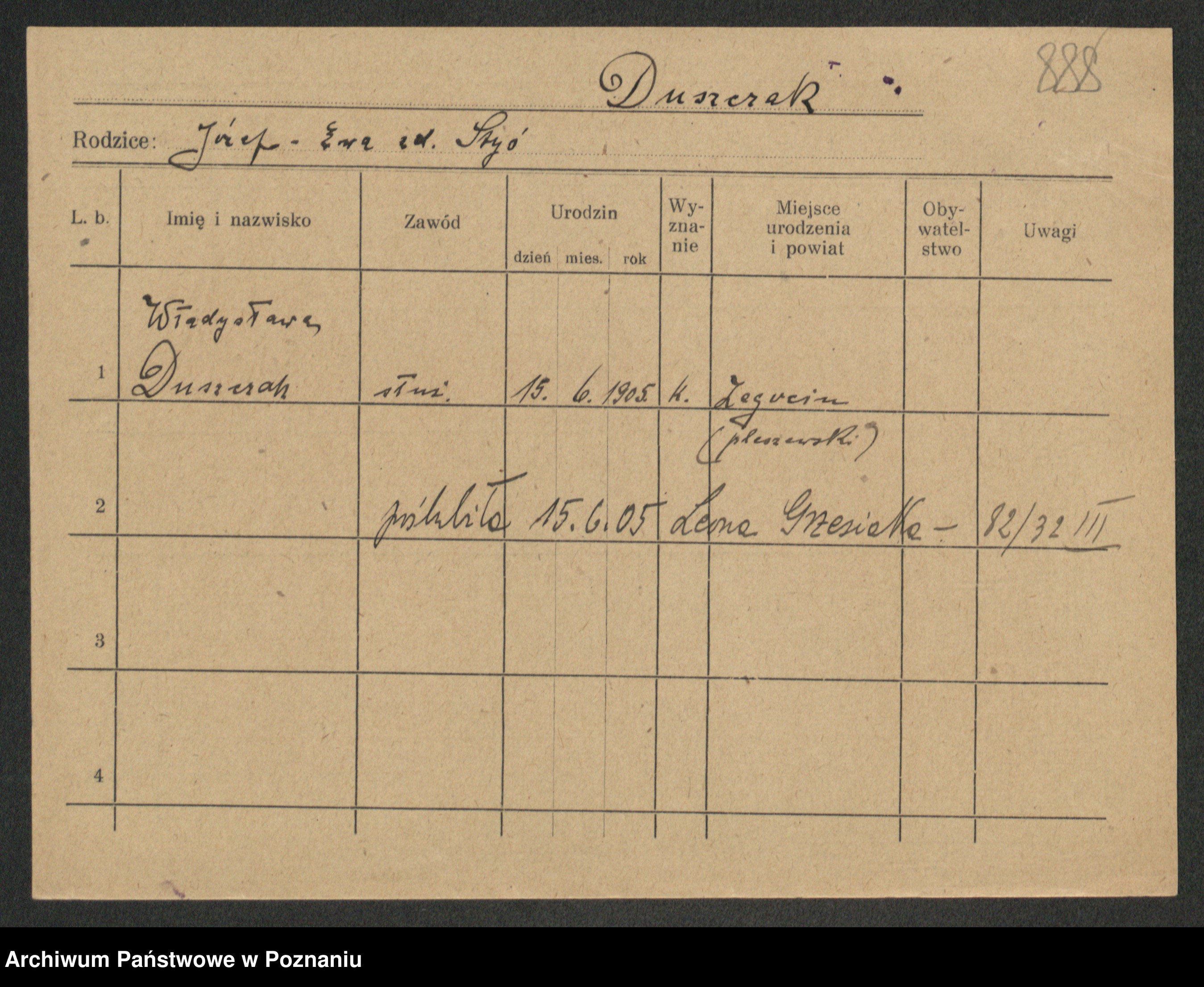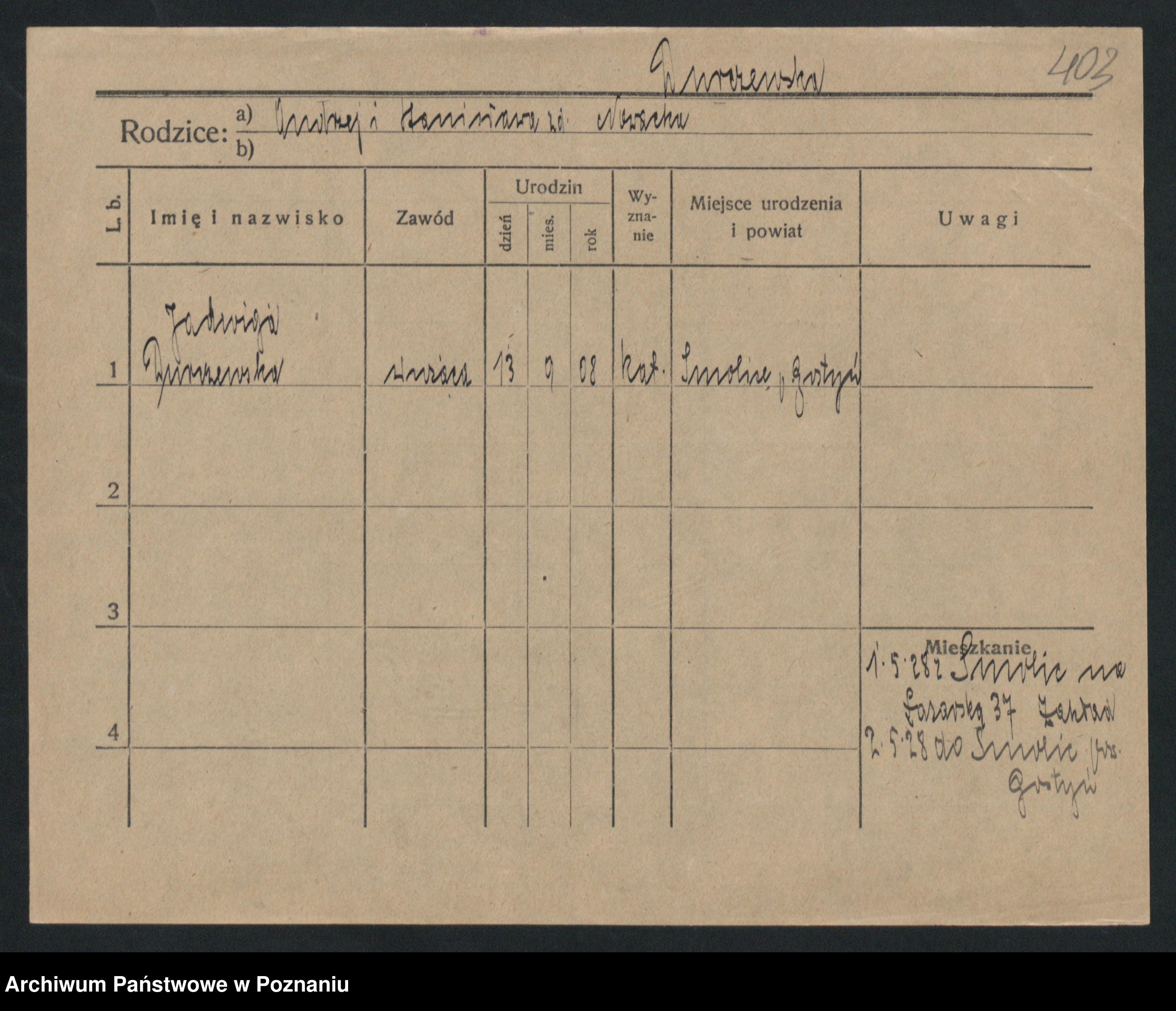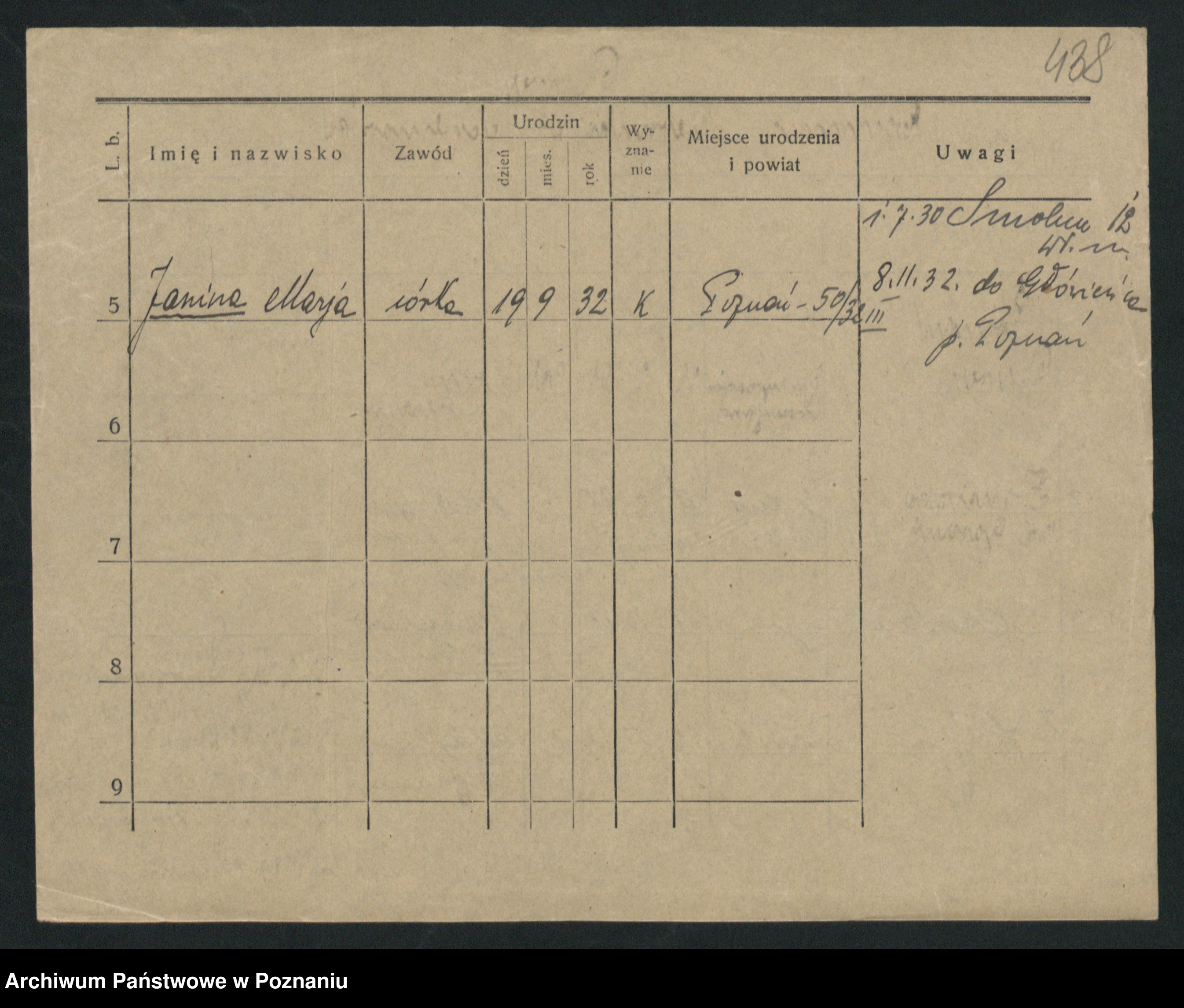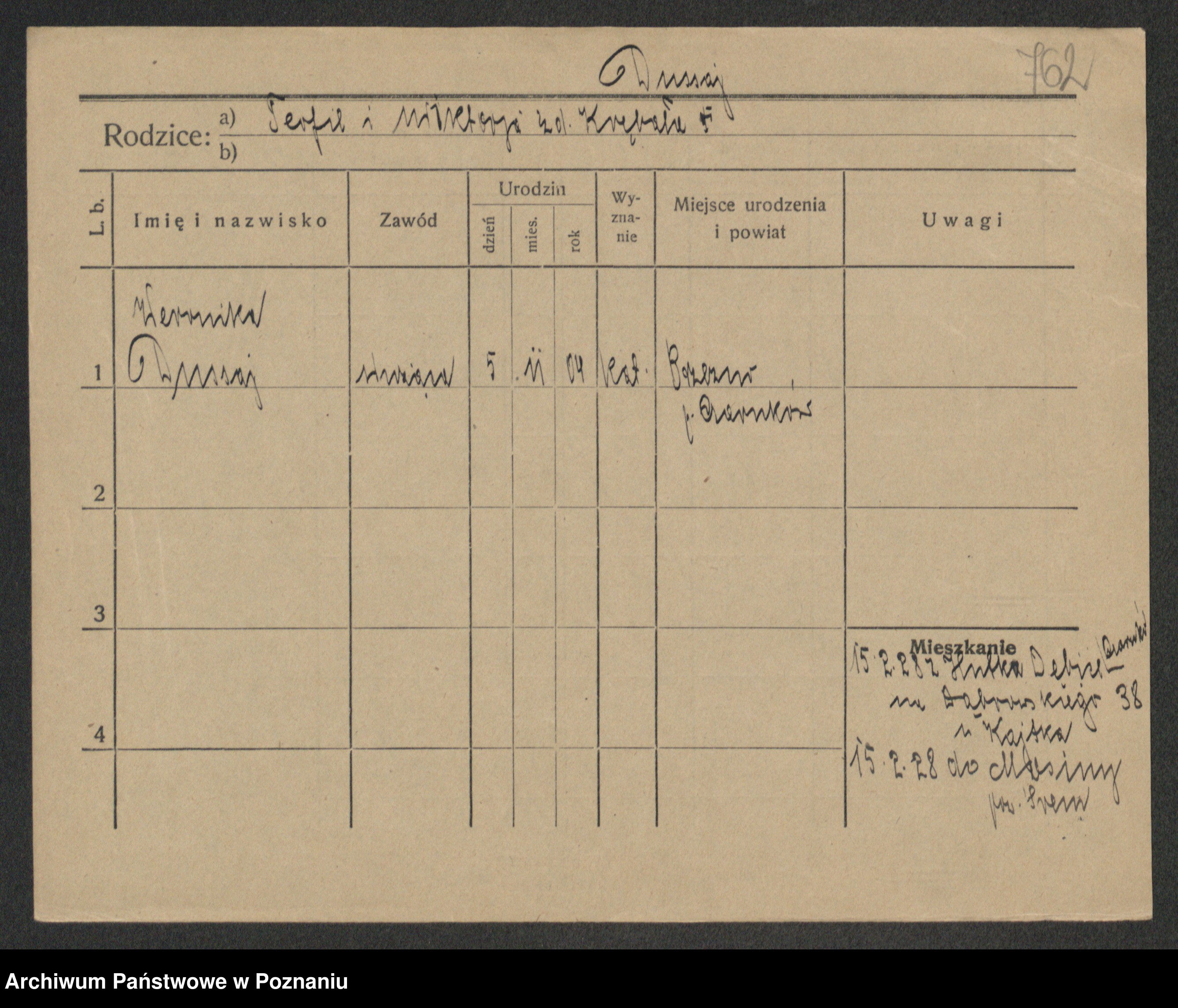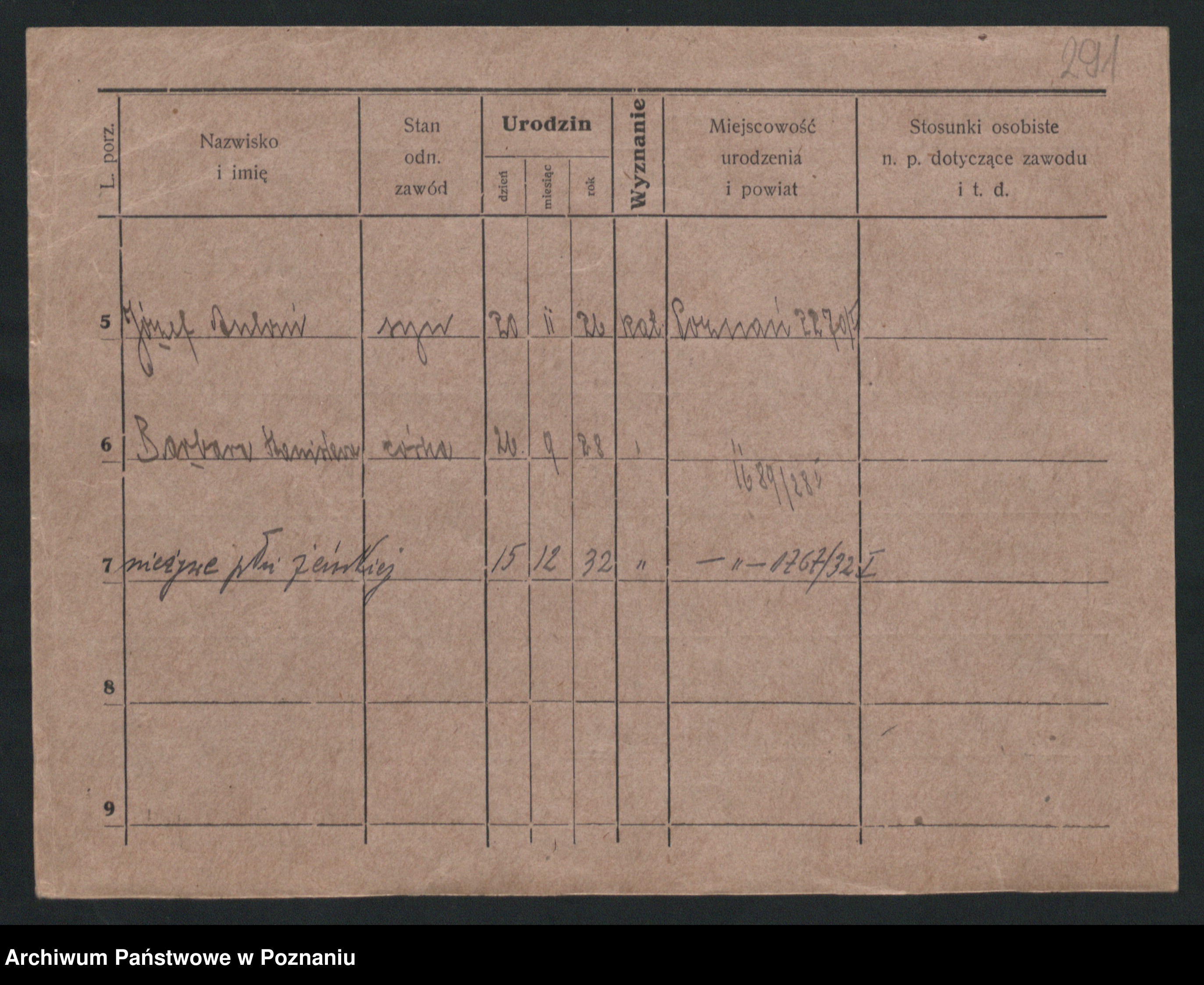 Podgląd karty osobowej dostępny jest po kliknięciu na nazwisko lub ikonkę karty. Można dokonywać powiększenia (ikony na górze) lub przechodzić między kolejnymi skanami (strzałki po bokach).
