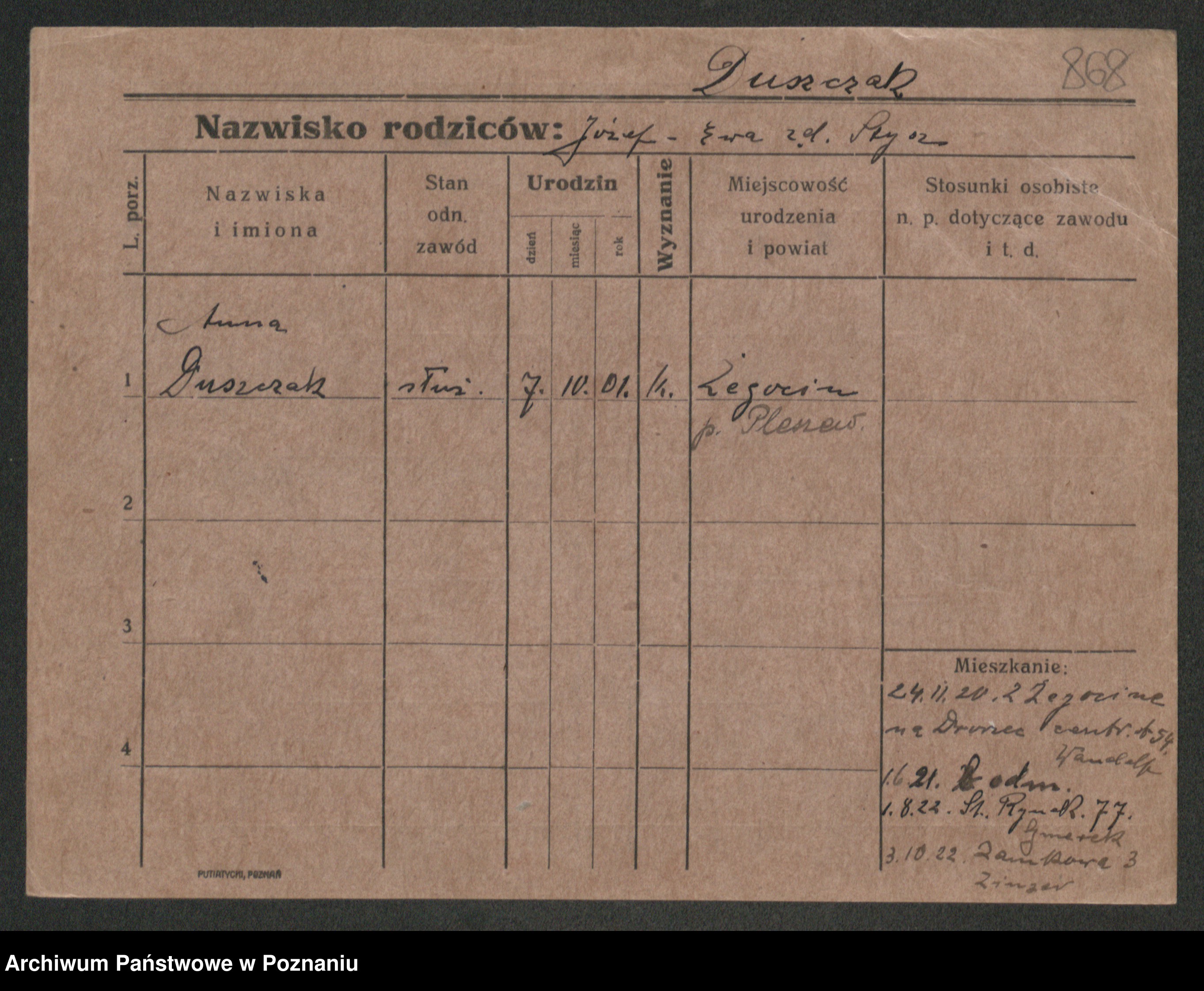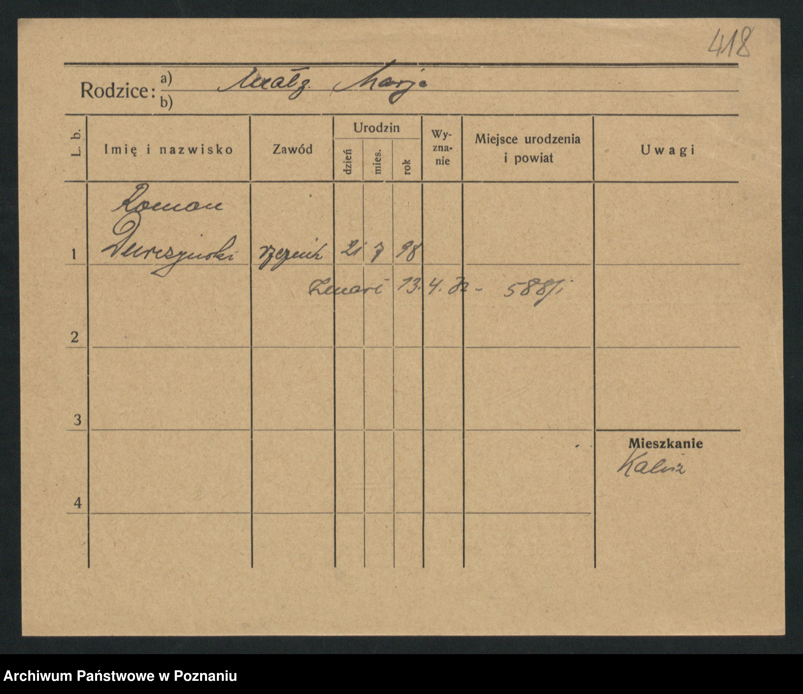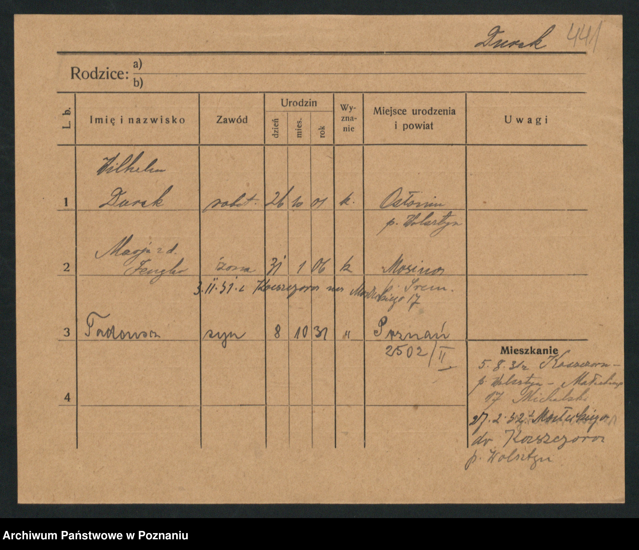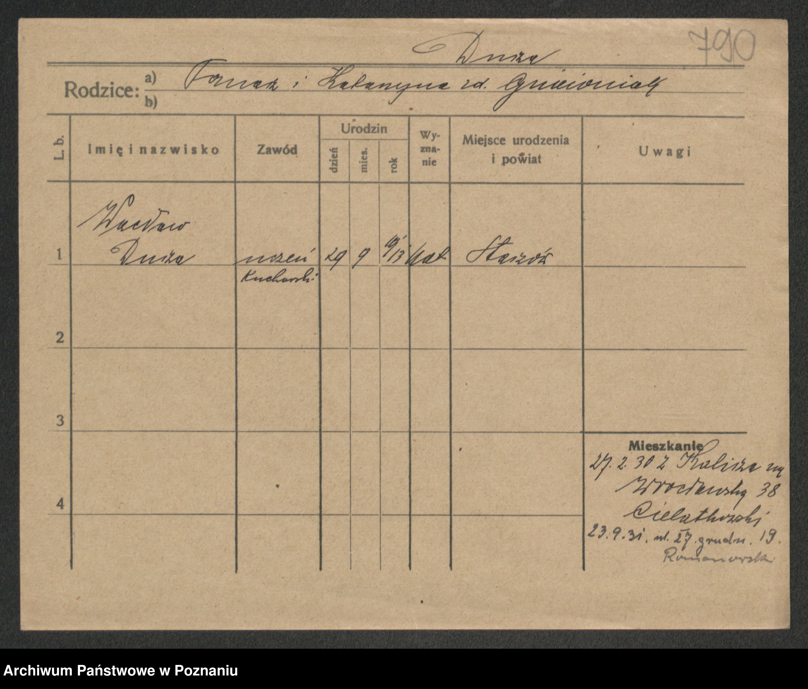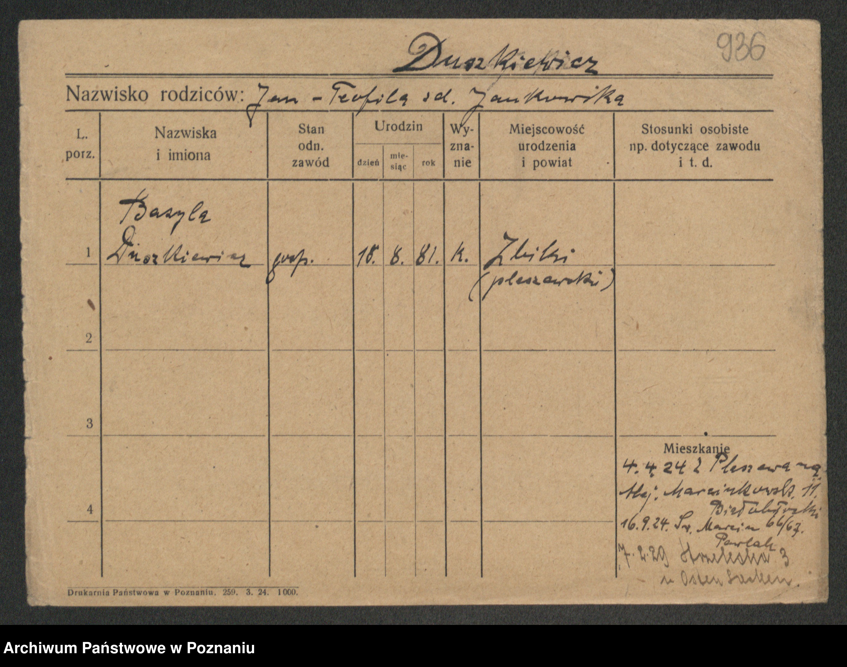 Podgląd karty osobowej dostępny jest po kliknięciu na nazwisko lub ikonkę karty. Można dokonywać powiększenia (ikony na górze) lub przechodzić między kolejnymi skanami (strzałki po bokach).