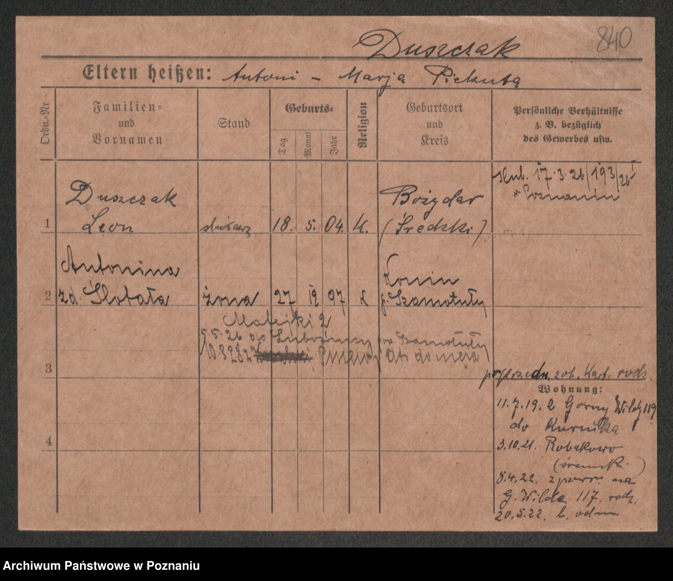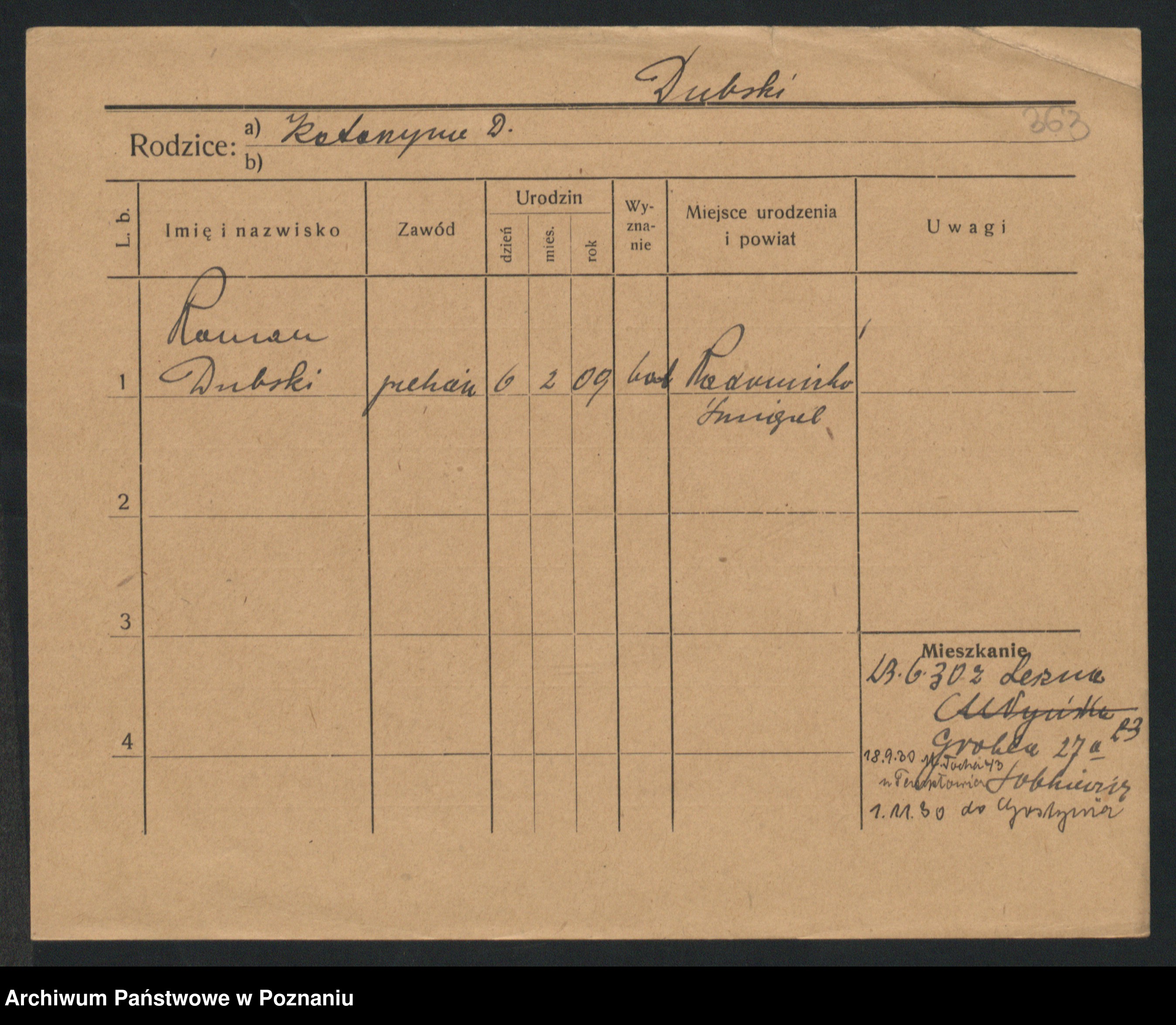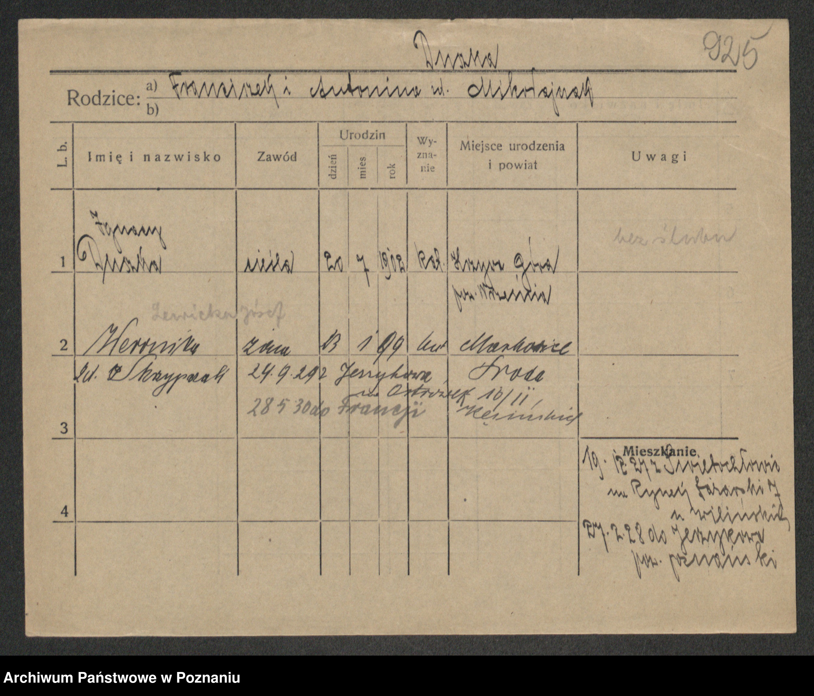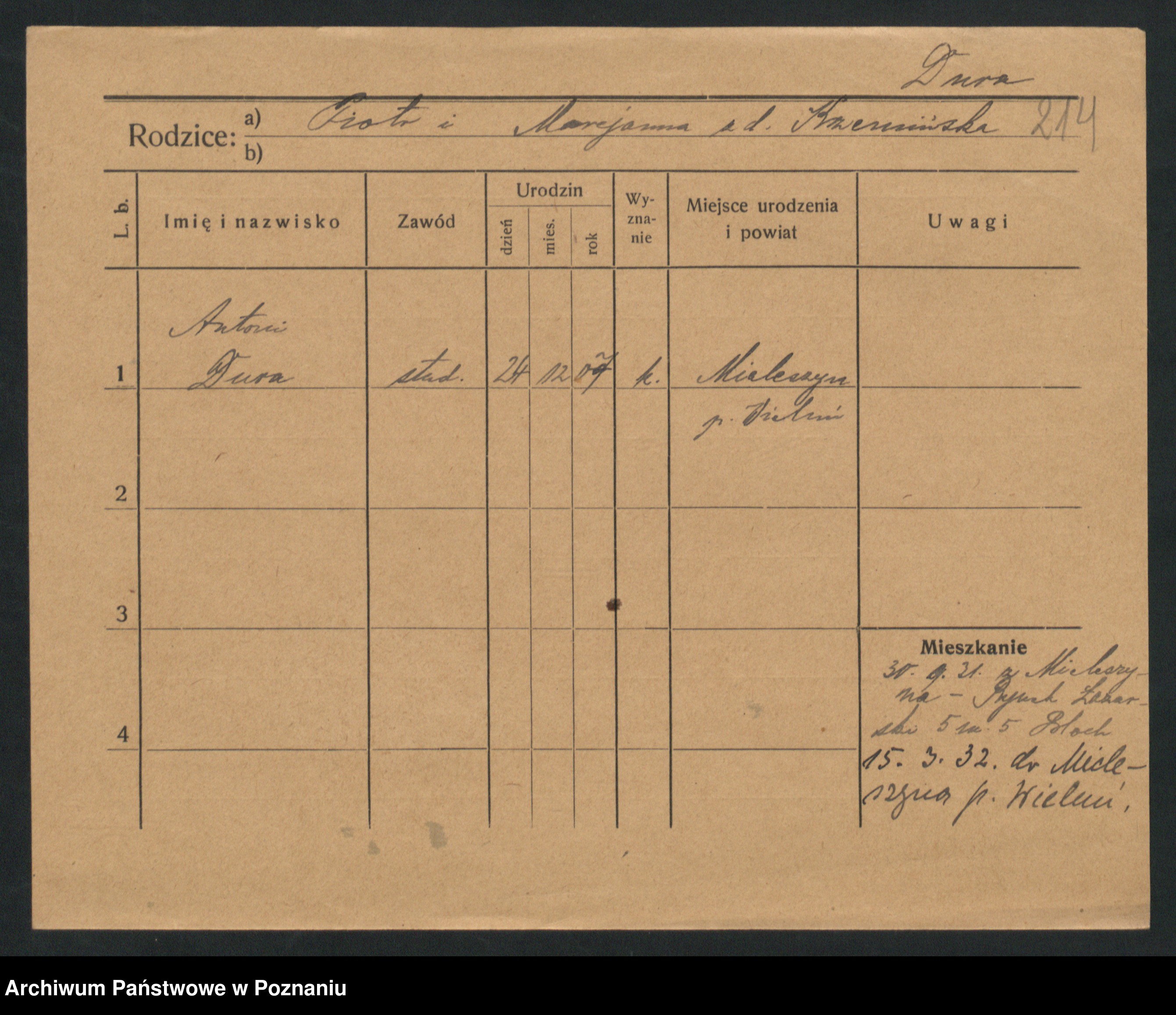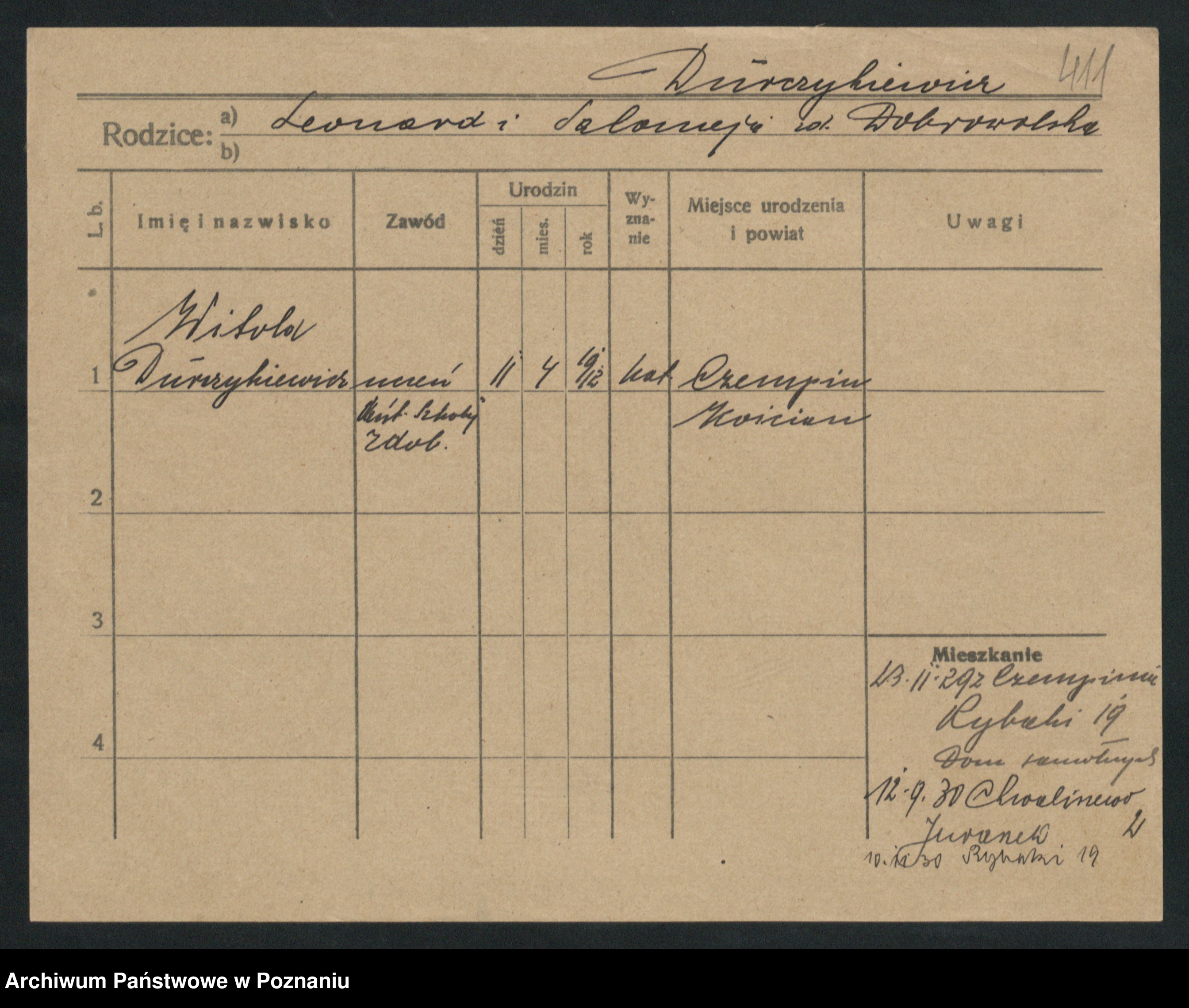 Podgląd karty osobowej dostępny jest po kliknięciu na nazwisko lub ikonkę karty. Można dokonywać powiększenia (ikony na górze) lub przechodzić między kolejnymi skanami (strzałki po bokach).