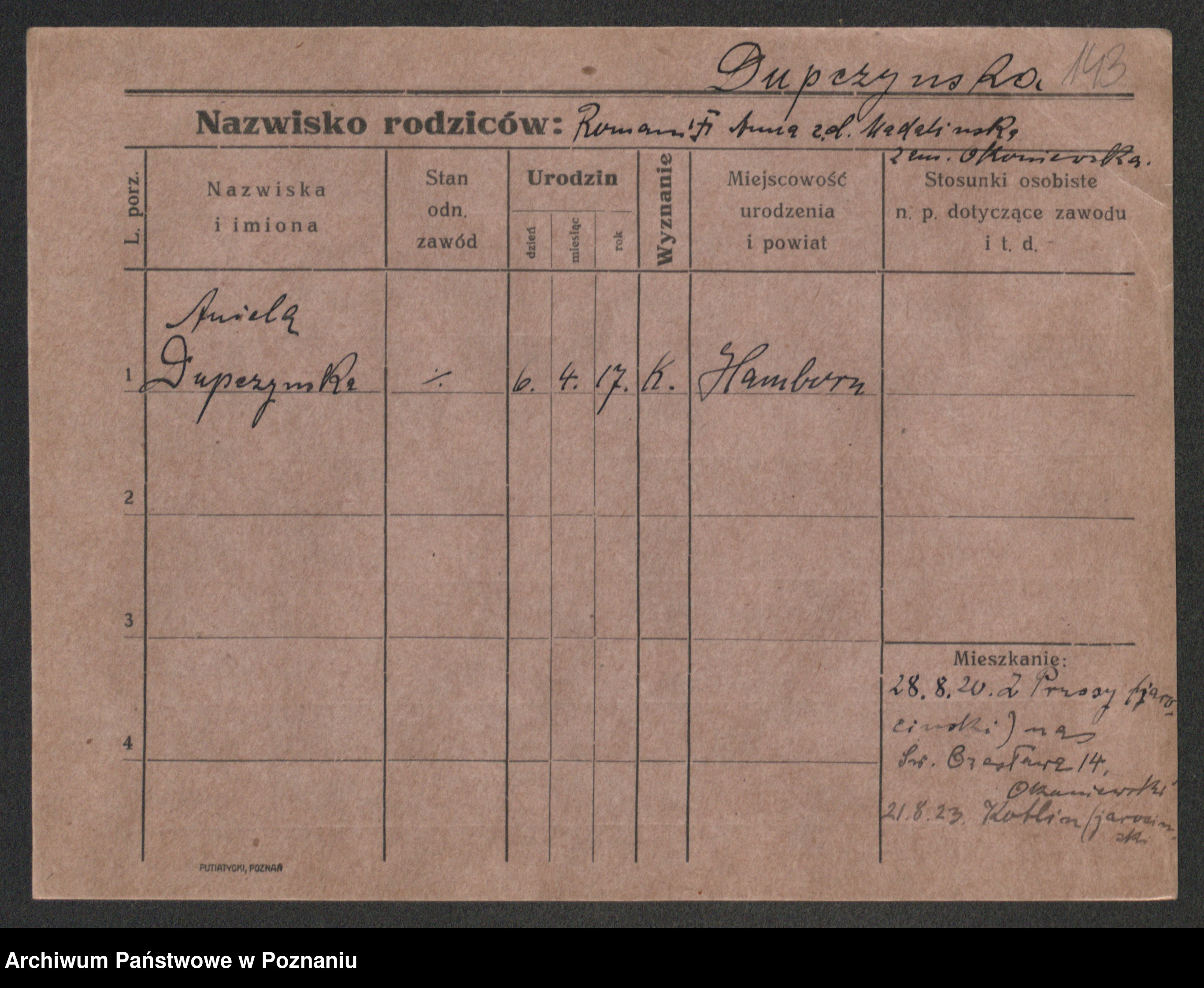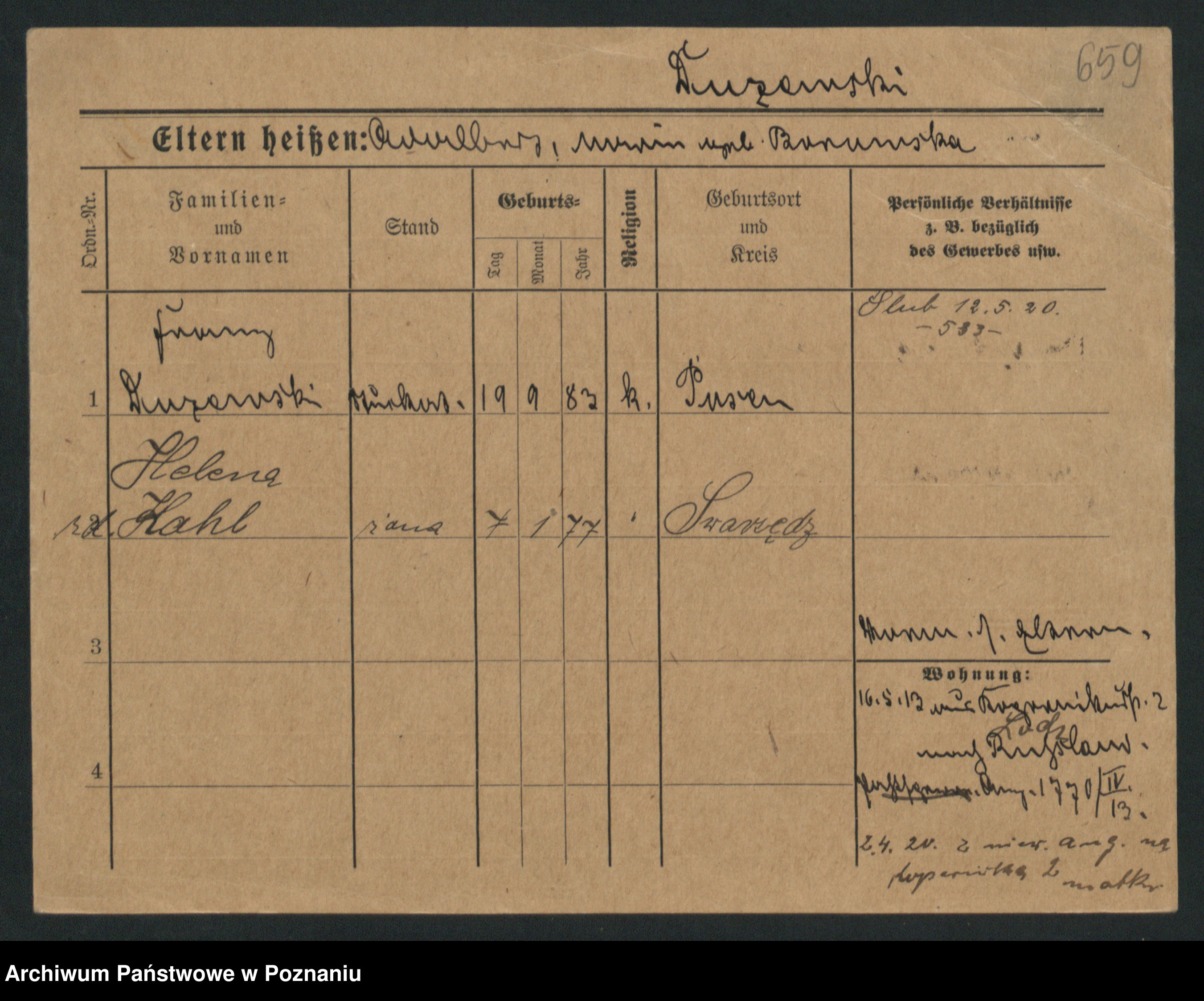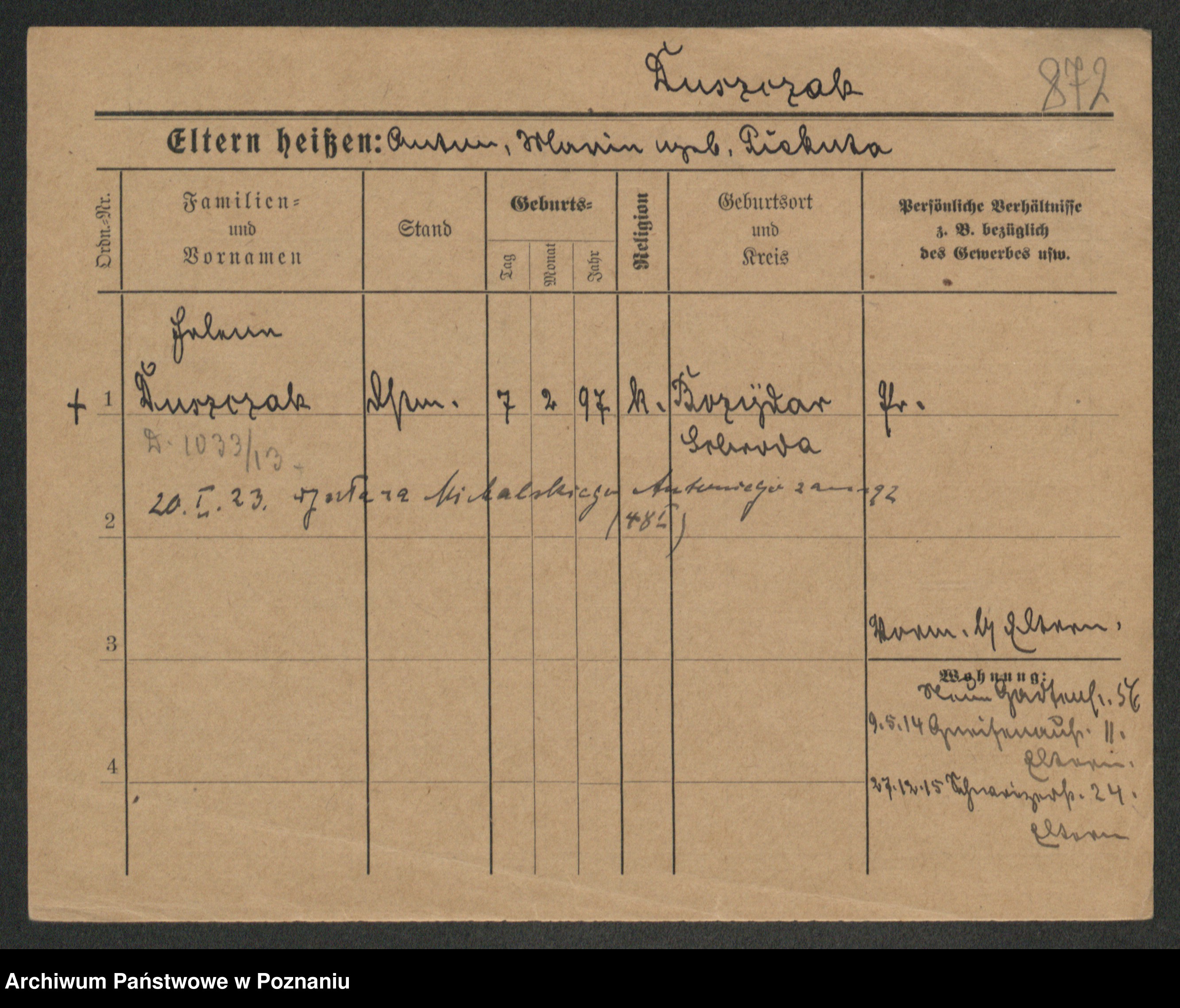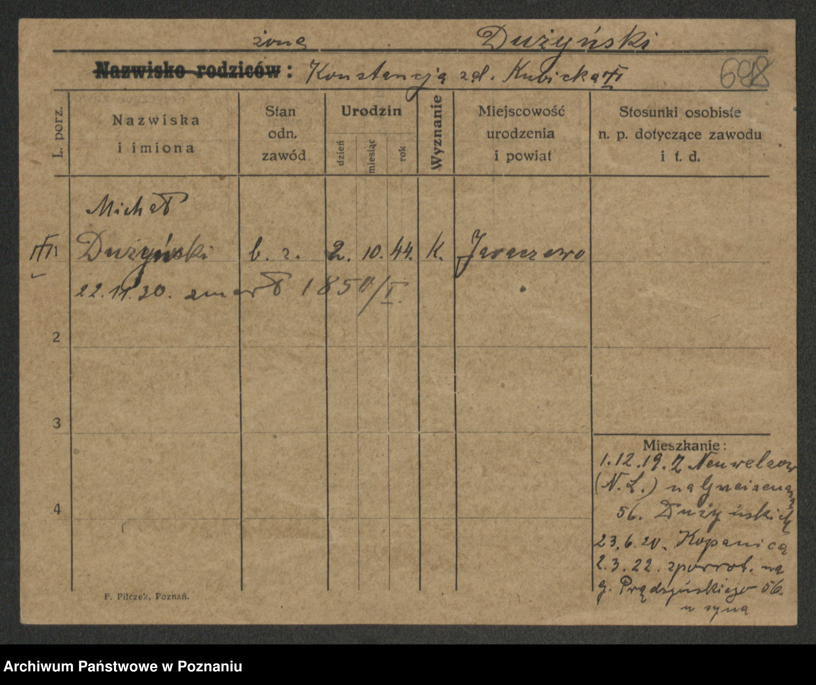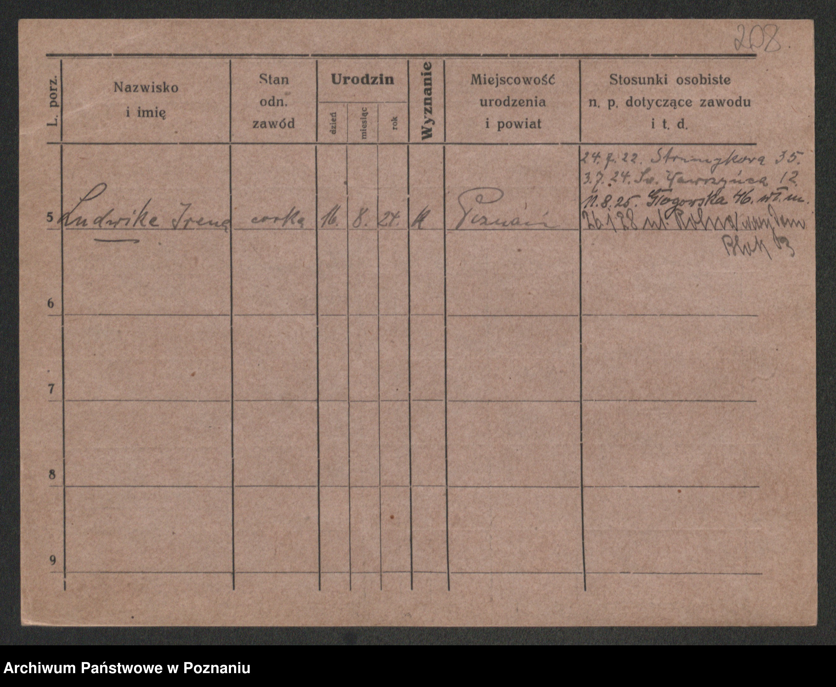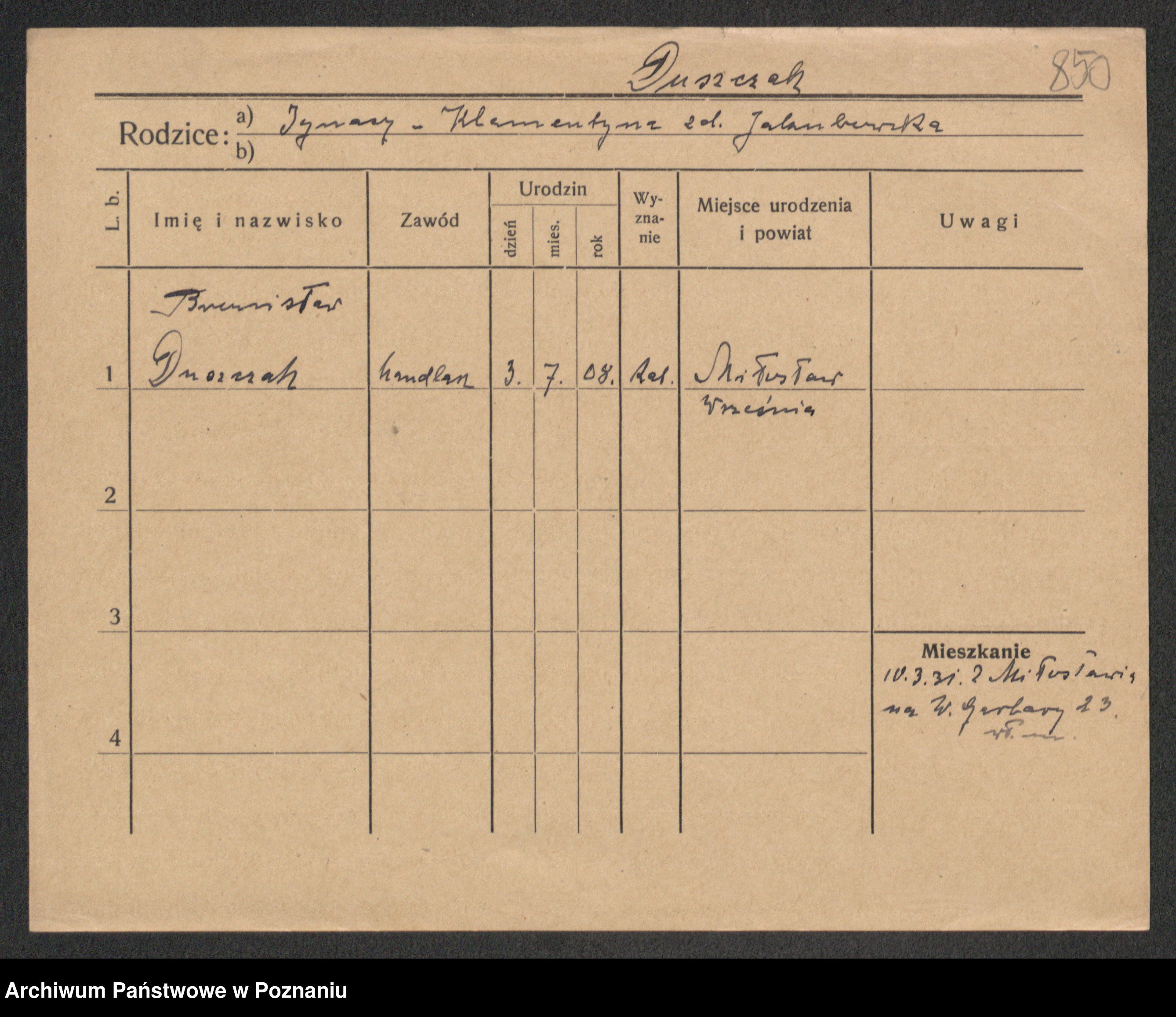 Podgląd karty osobowej dostępny jest po kliknięciu na nazwisko lub ikonkę karty. Można dokonywać powiększenia (ikony na górze) lub przechodzić między kolejnymi skanami (strzałki po bokach).