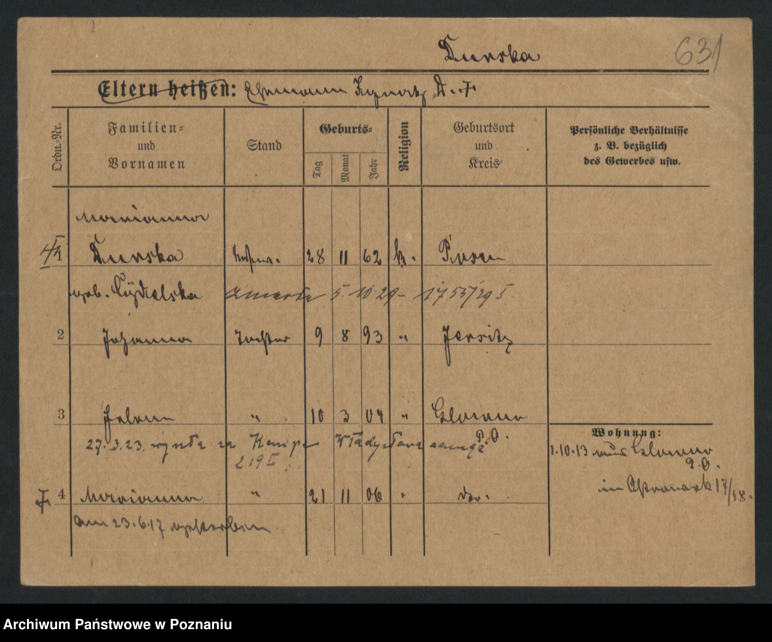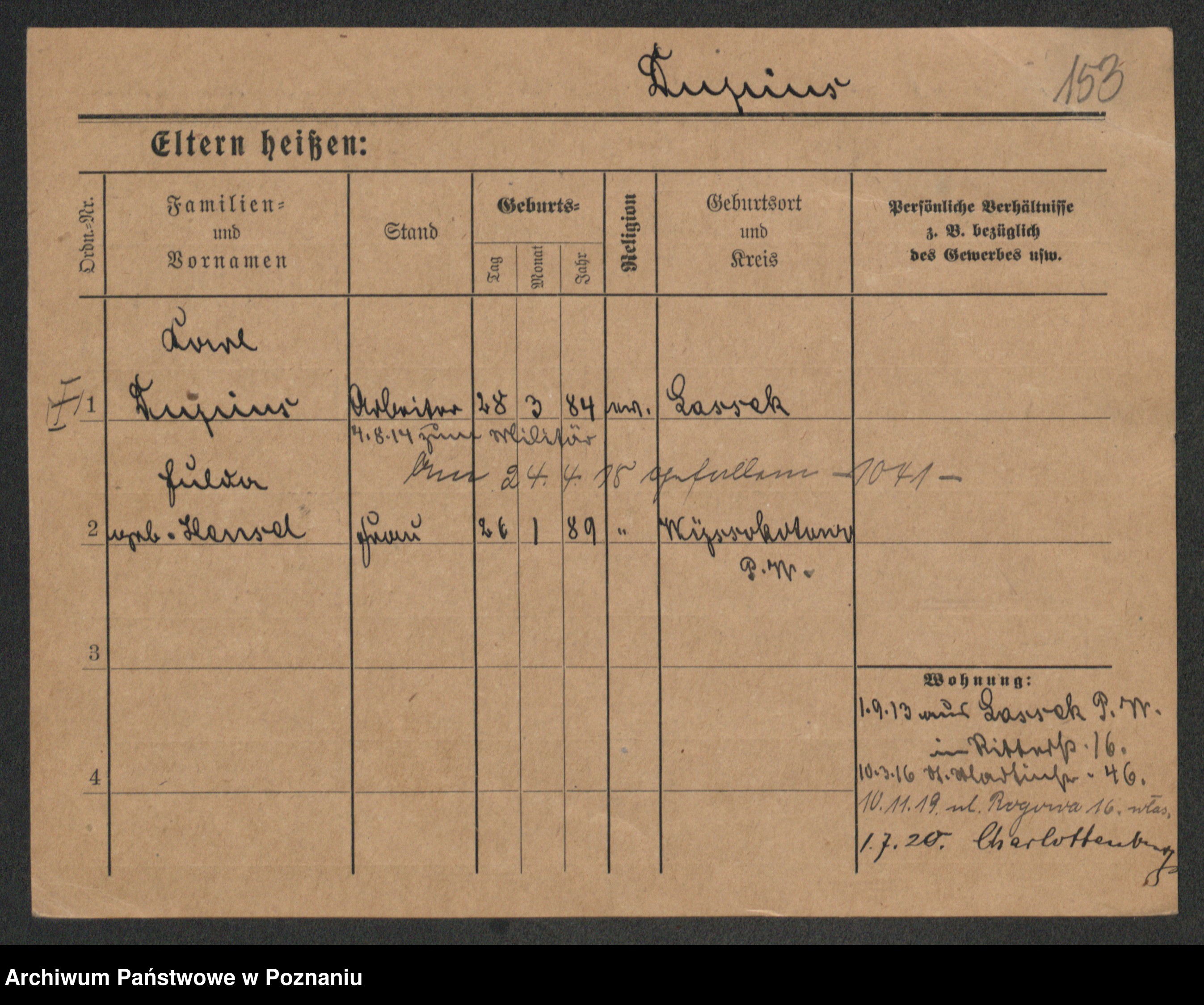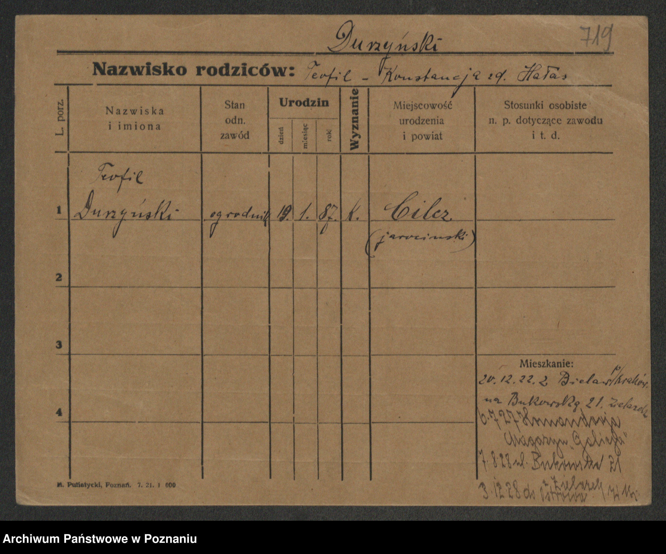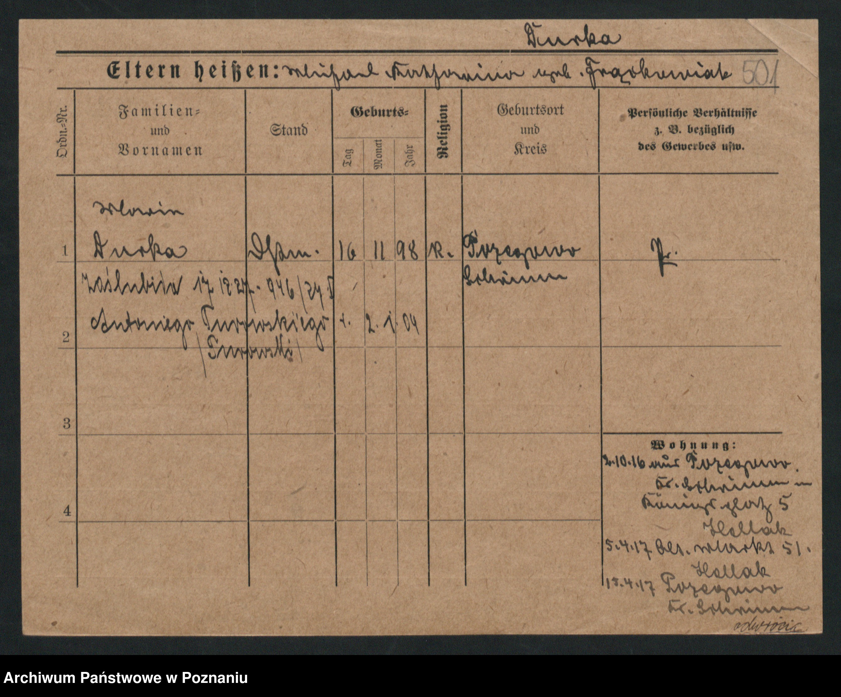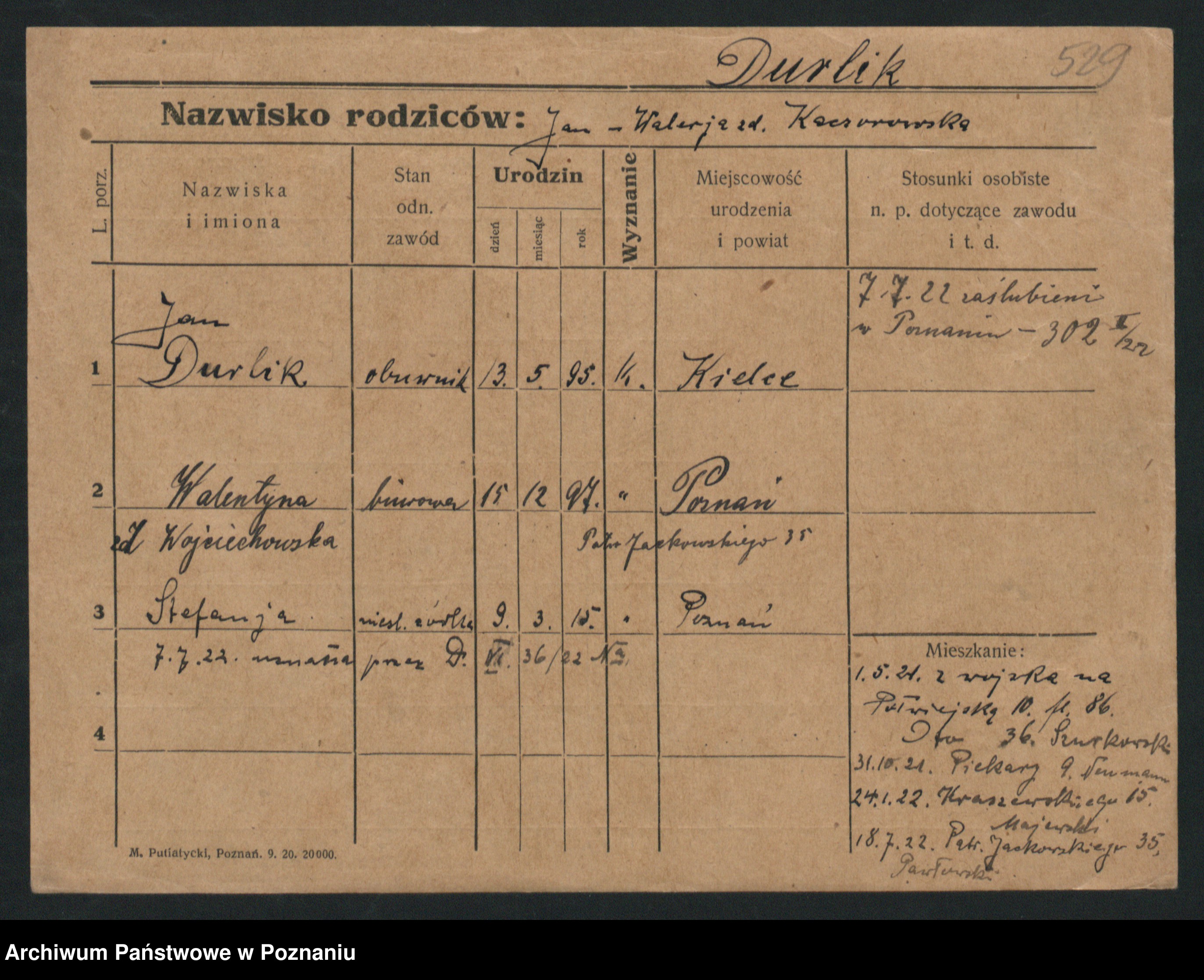 Podgląd karty osobowej dostępny jest po kliknięciu na nazwisko lub ikonkę karty. Można dokonywać powiększenia (ikony na górze) lub przechodzić między kolejnymi skanami (strzałki po bokach).
