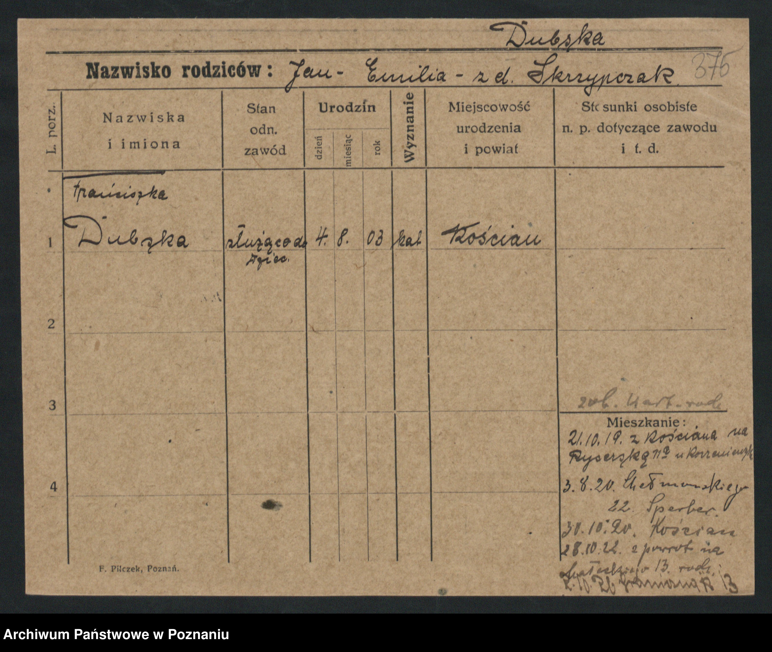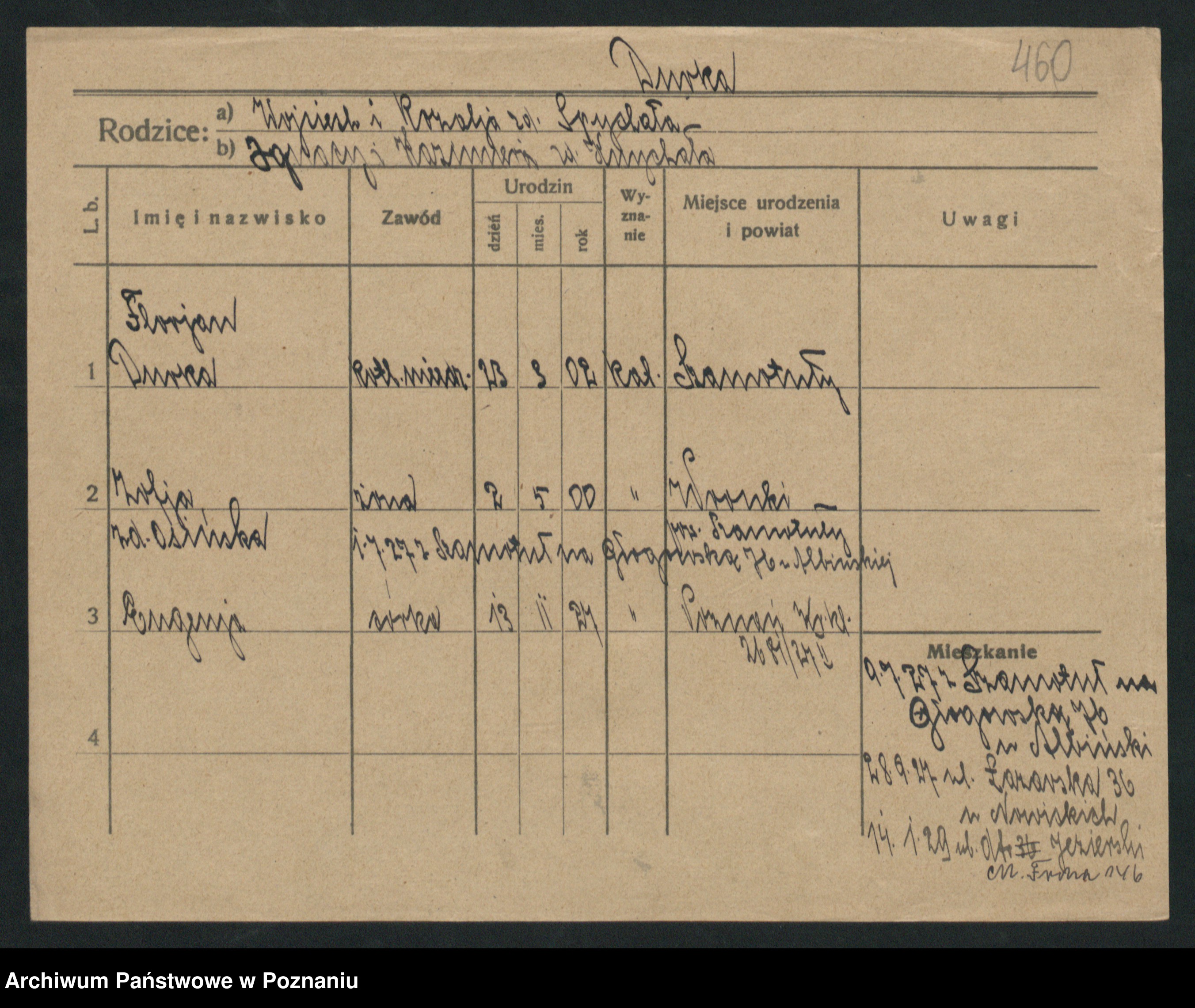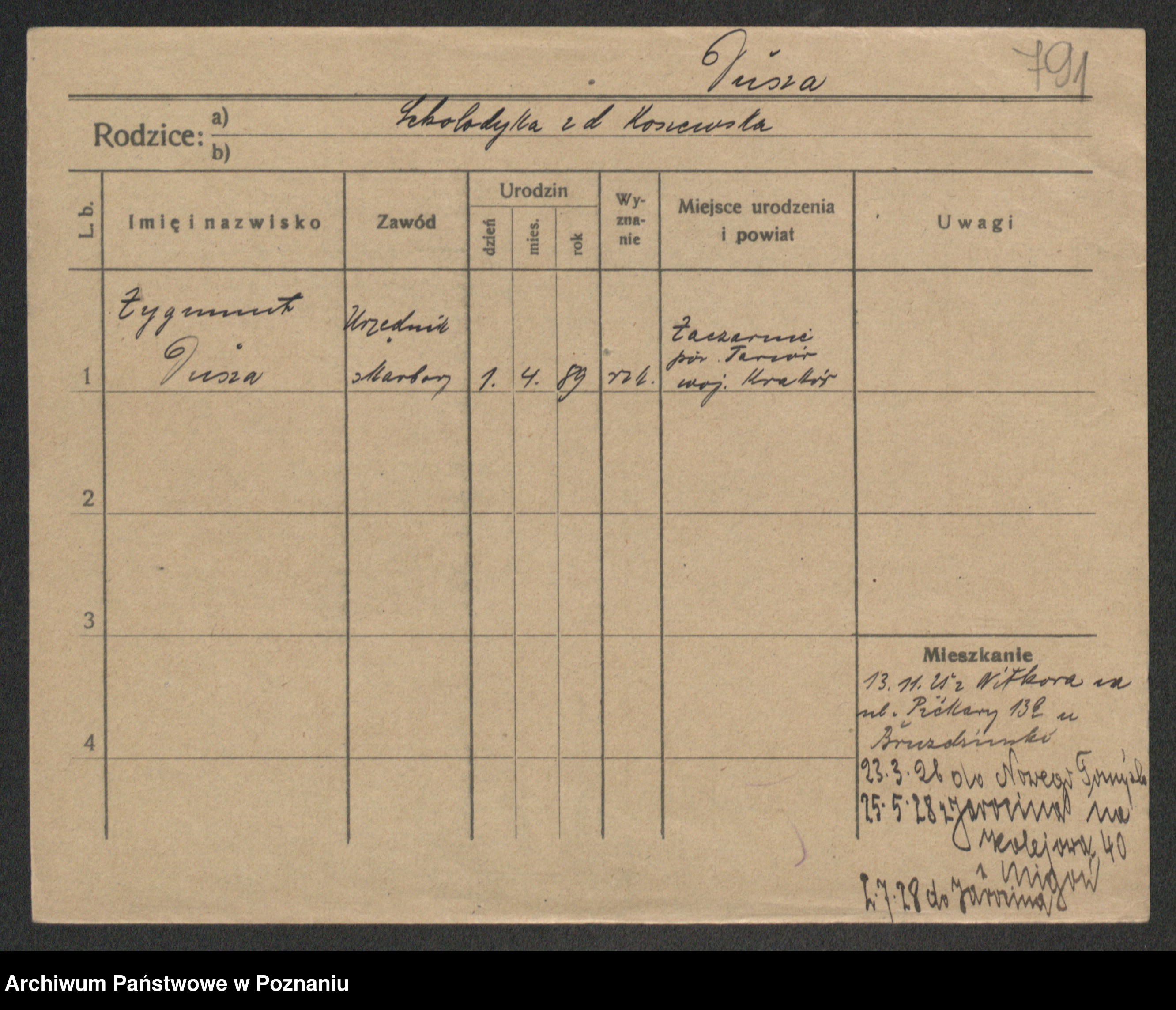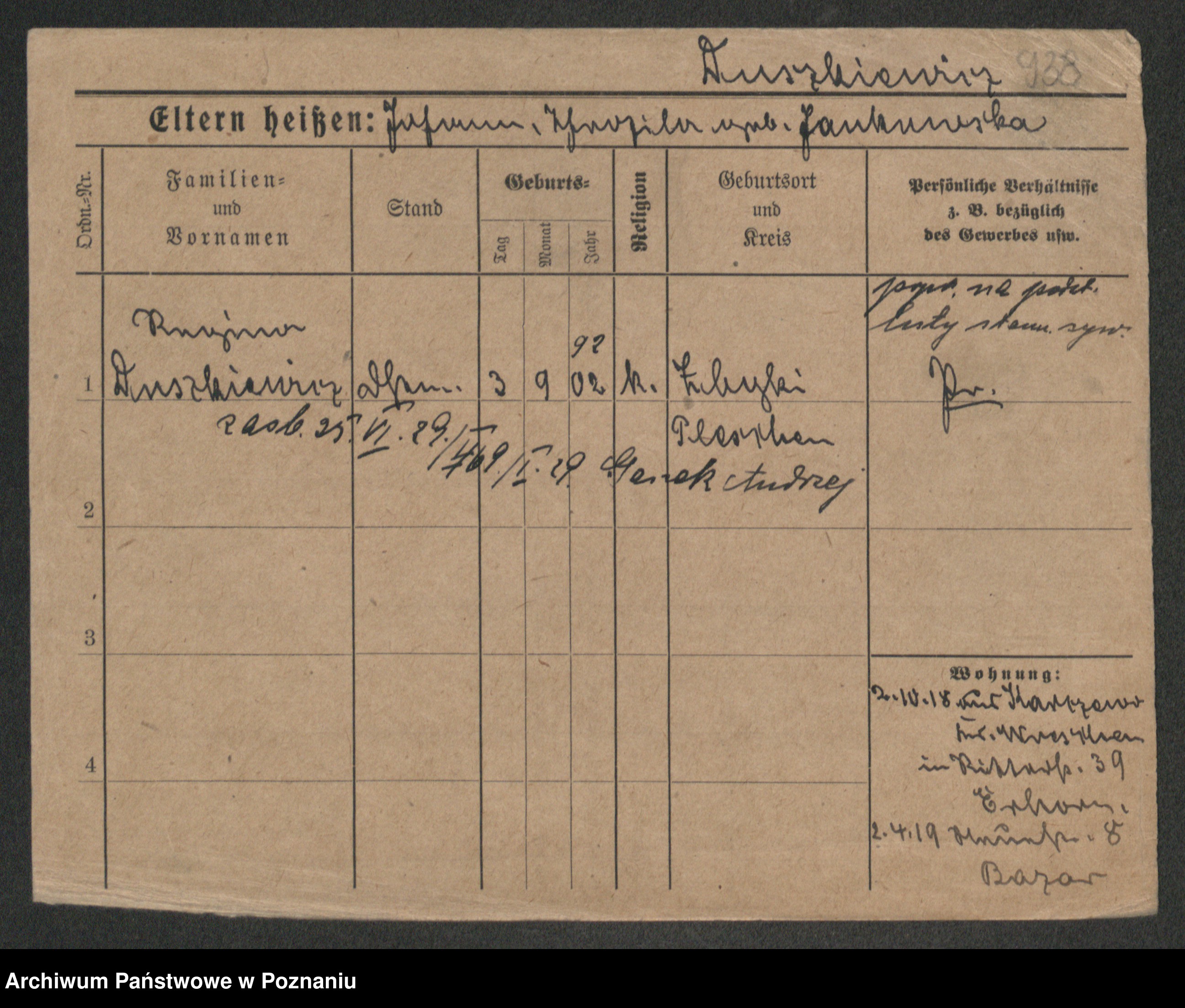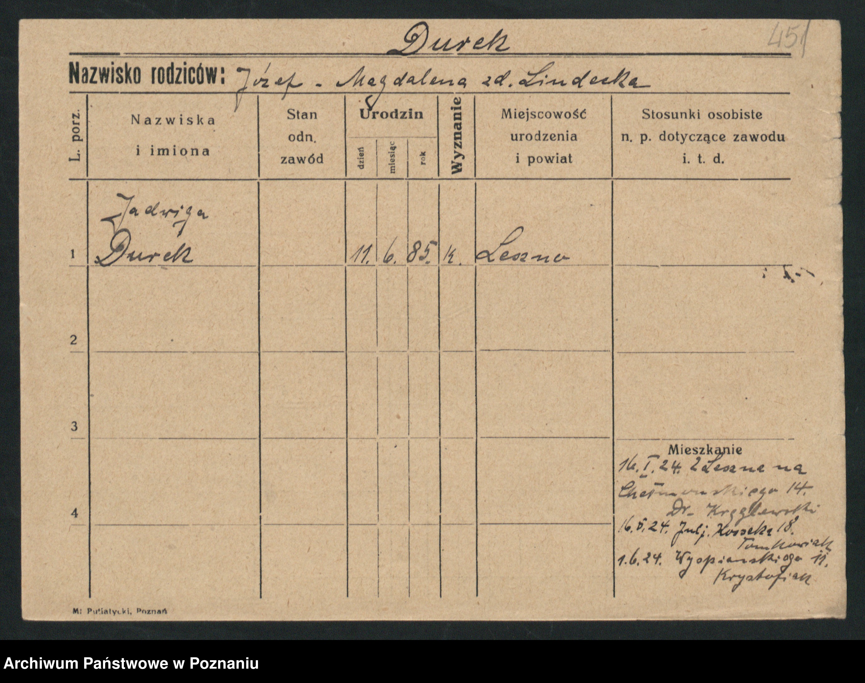 Podgląd karty osobowej dostępny jest po kliknięciu na nazwisko lub ikonkę karty. Można dokonywać powiększenia (ikony na górze) lub przechodzić między kolejnymi skanami (strzałki po bokach).