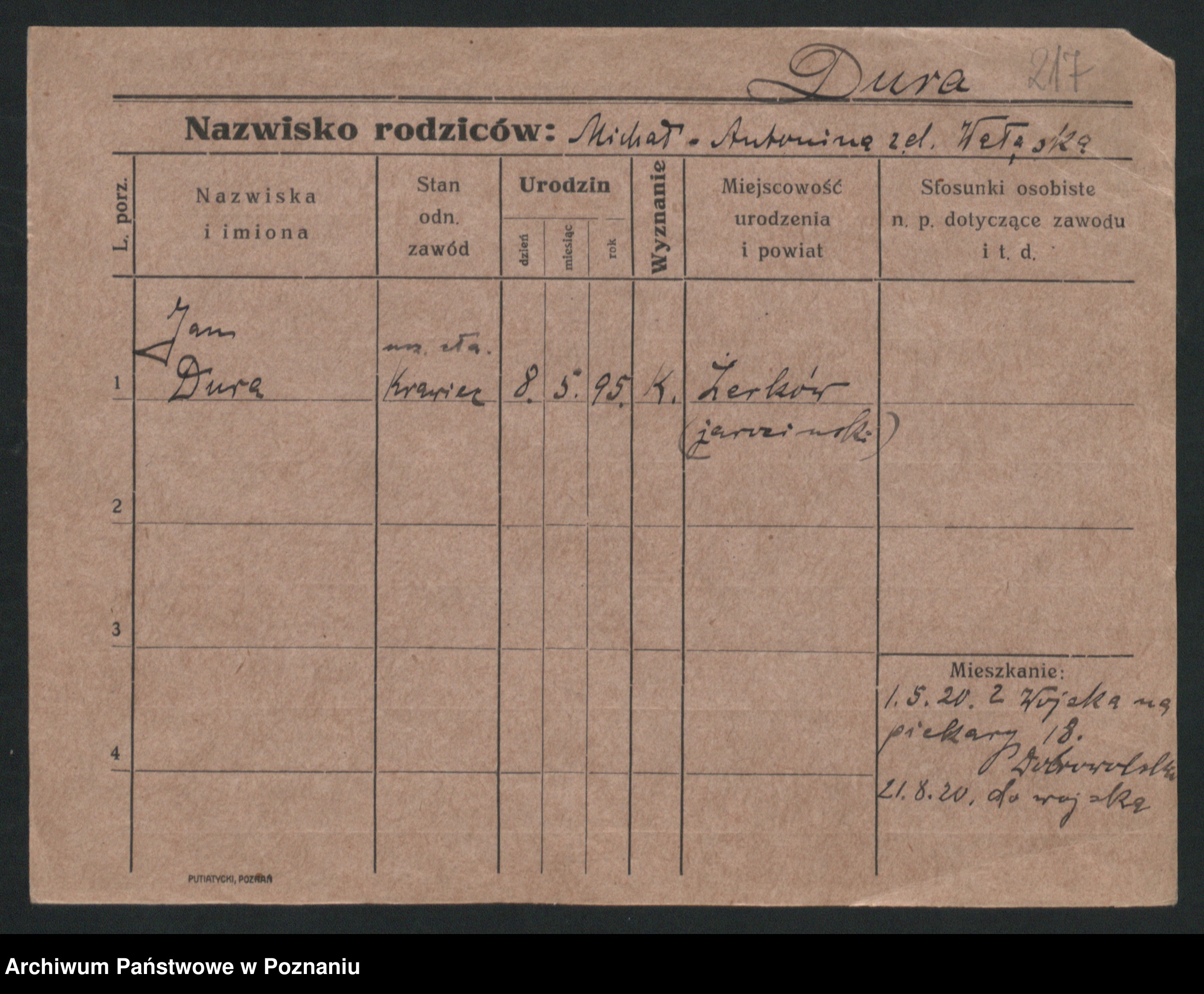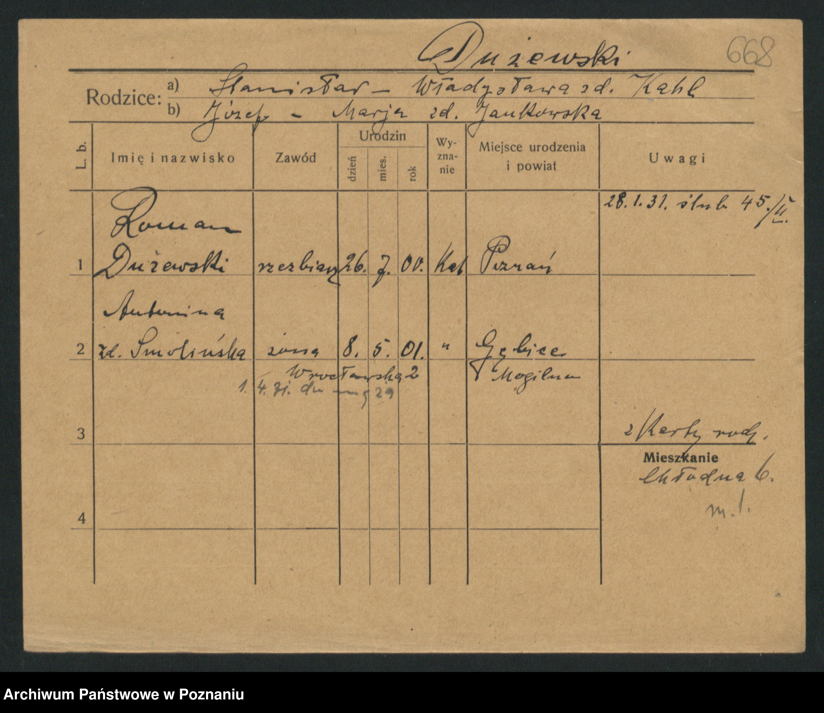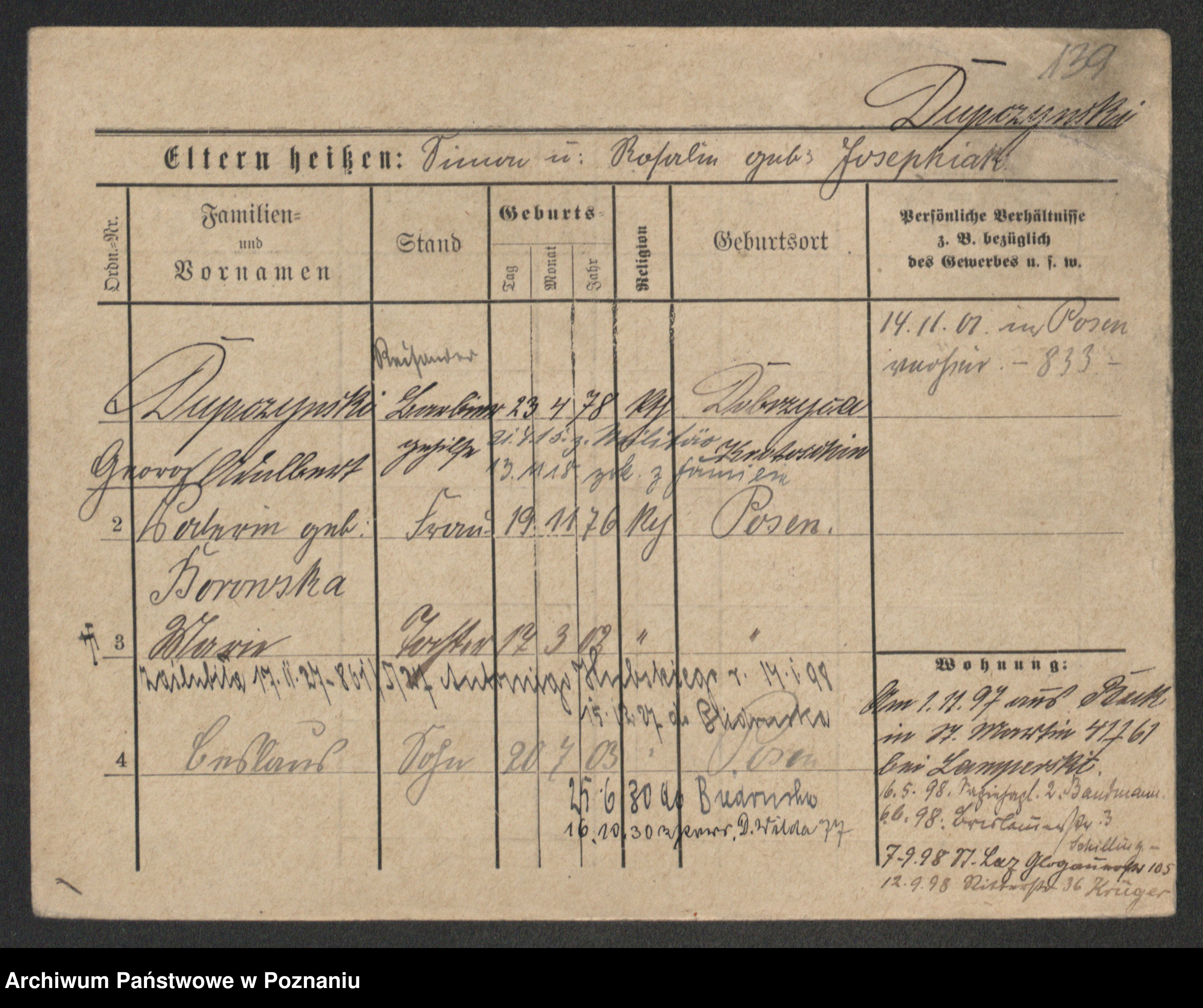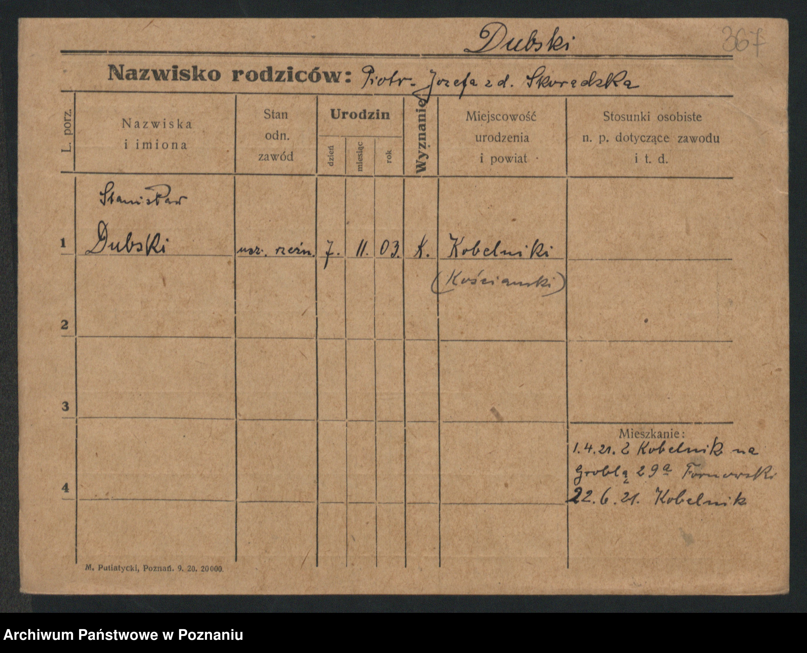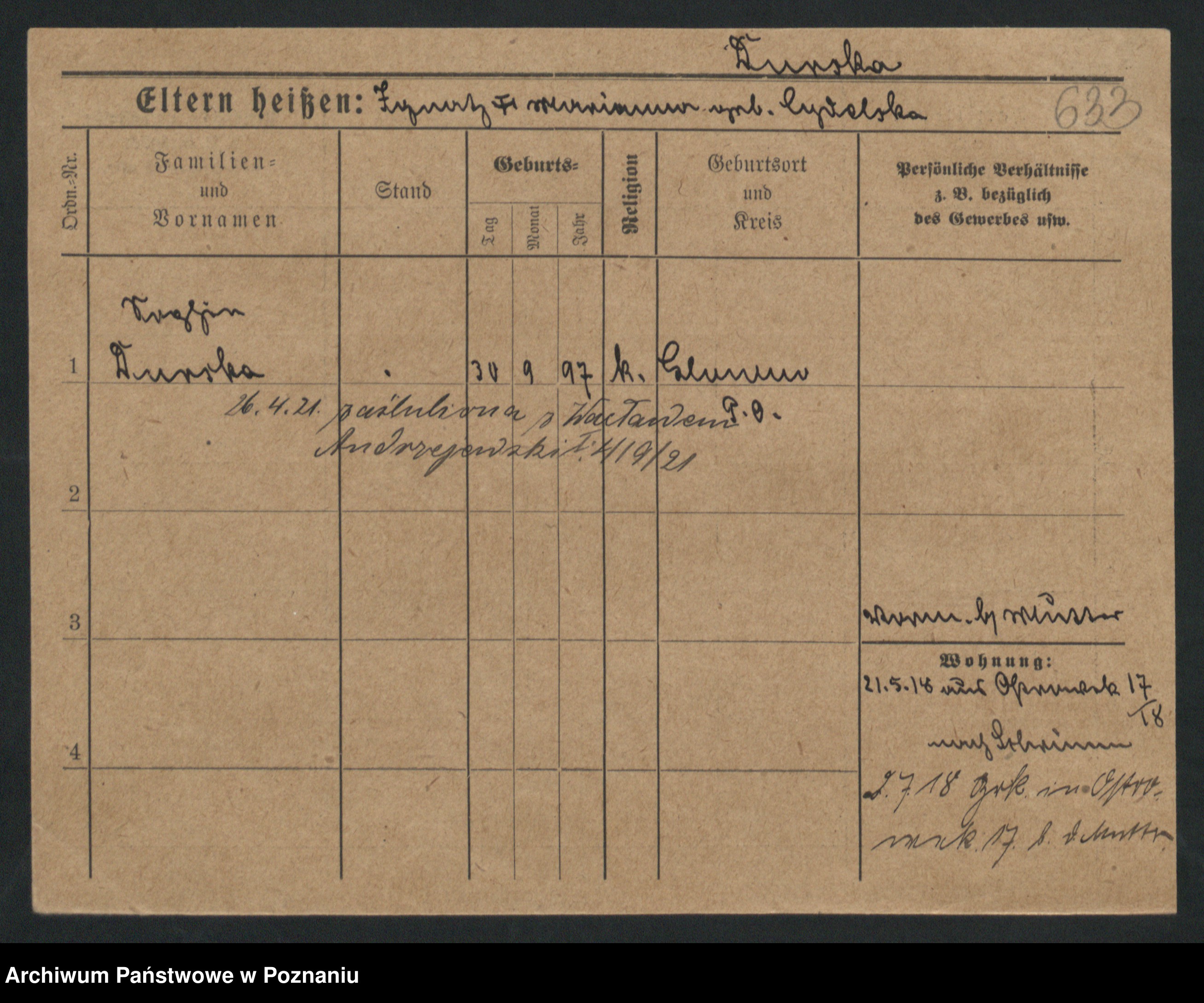 Podgląd karty osobowej dostępny jest po kliknięciu na nazwisko lub ikonkę karty. Można dokonywać powiększenia (ikony na górze) lub przechodzić między kolejnymi skanami (strzałki po bokach).
