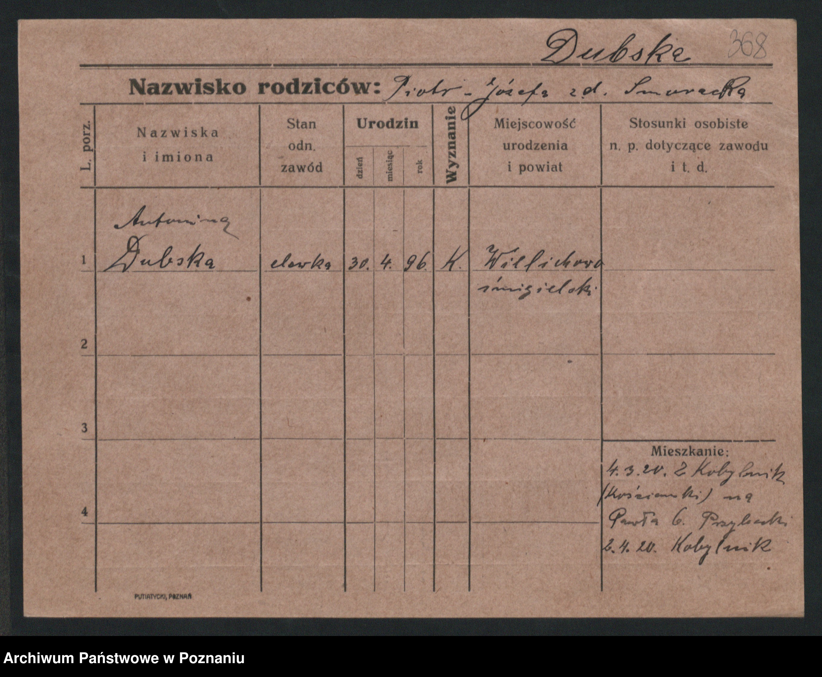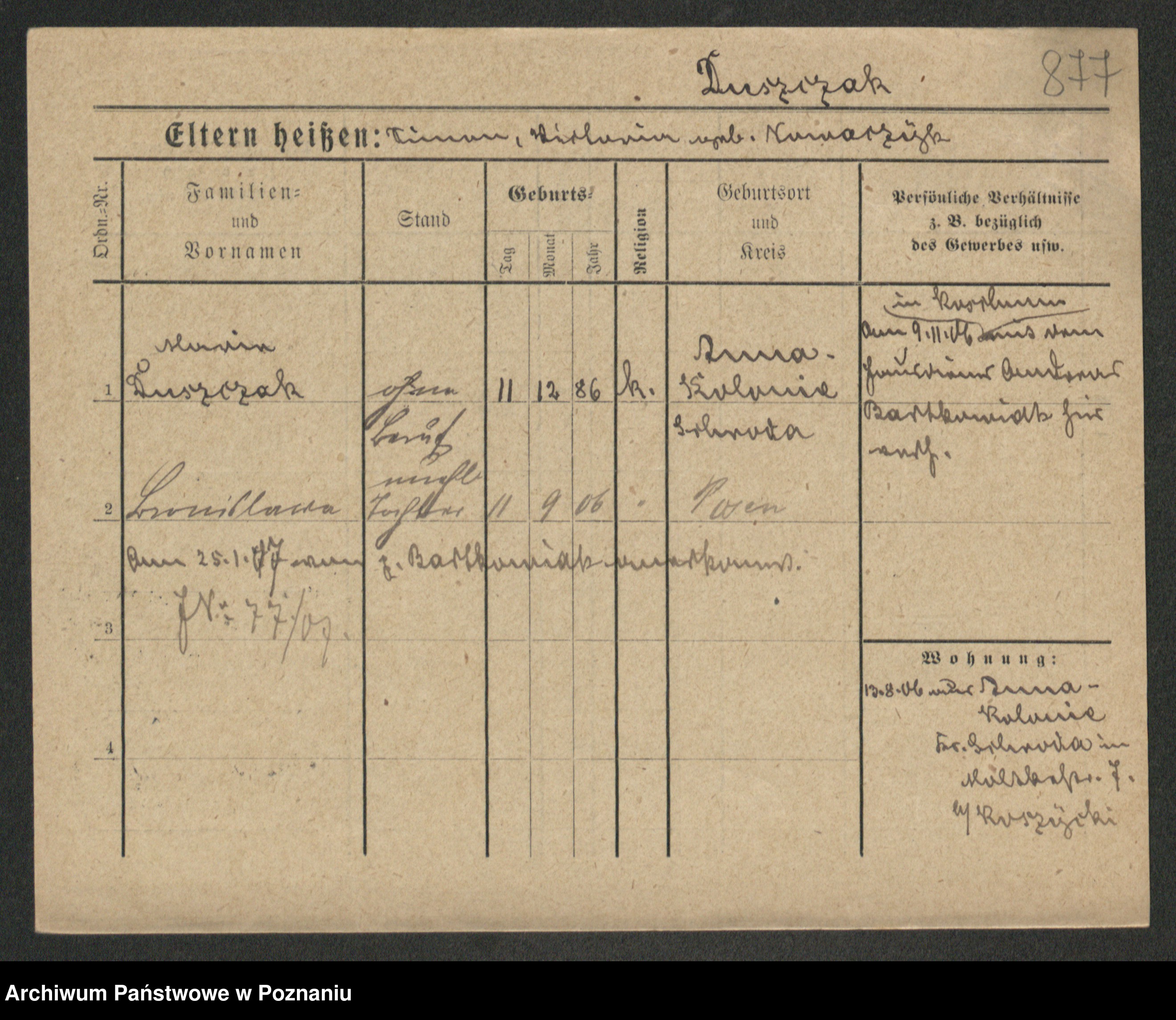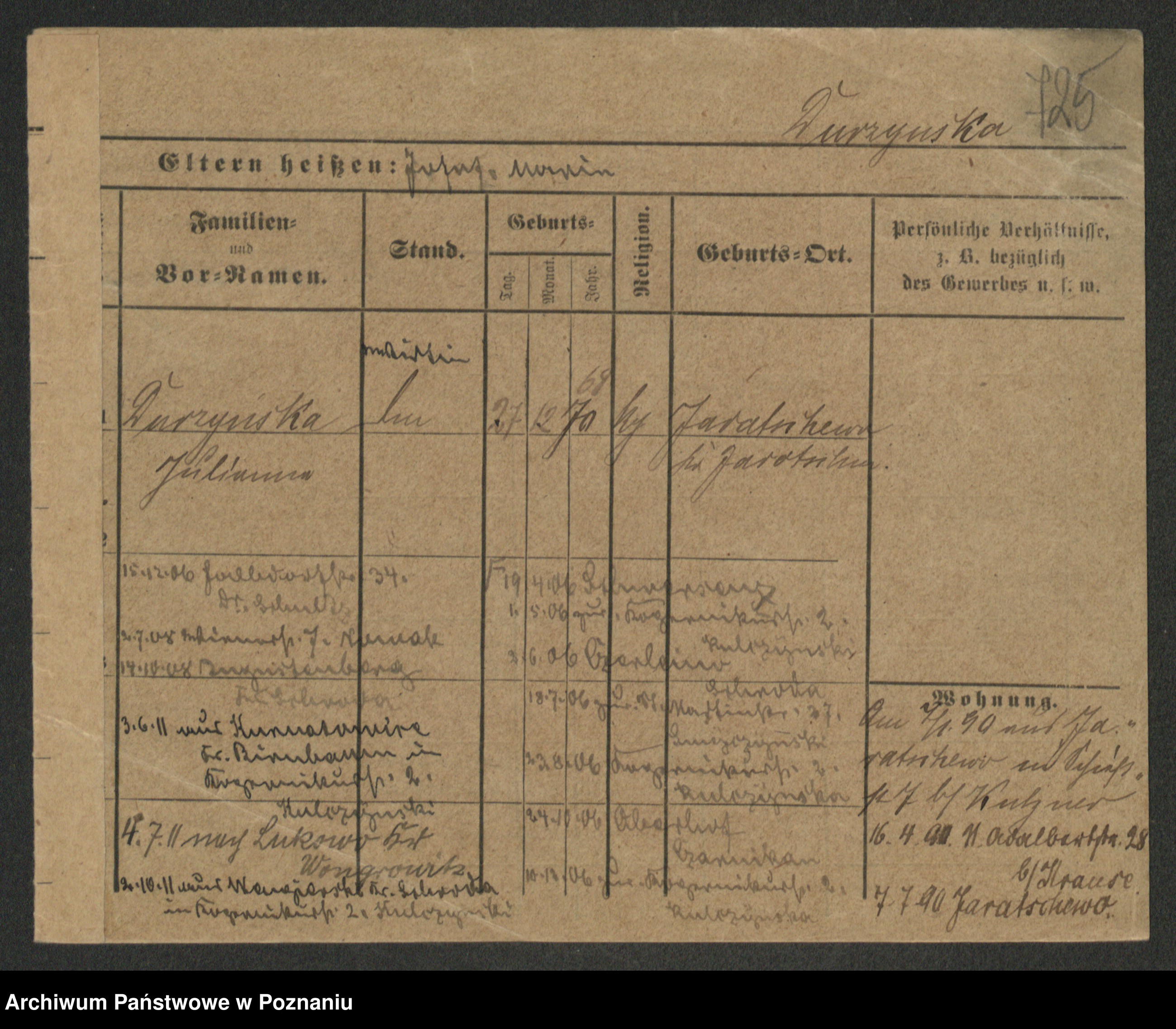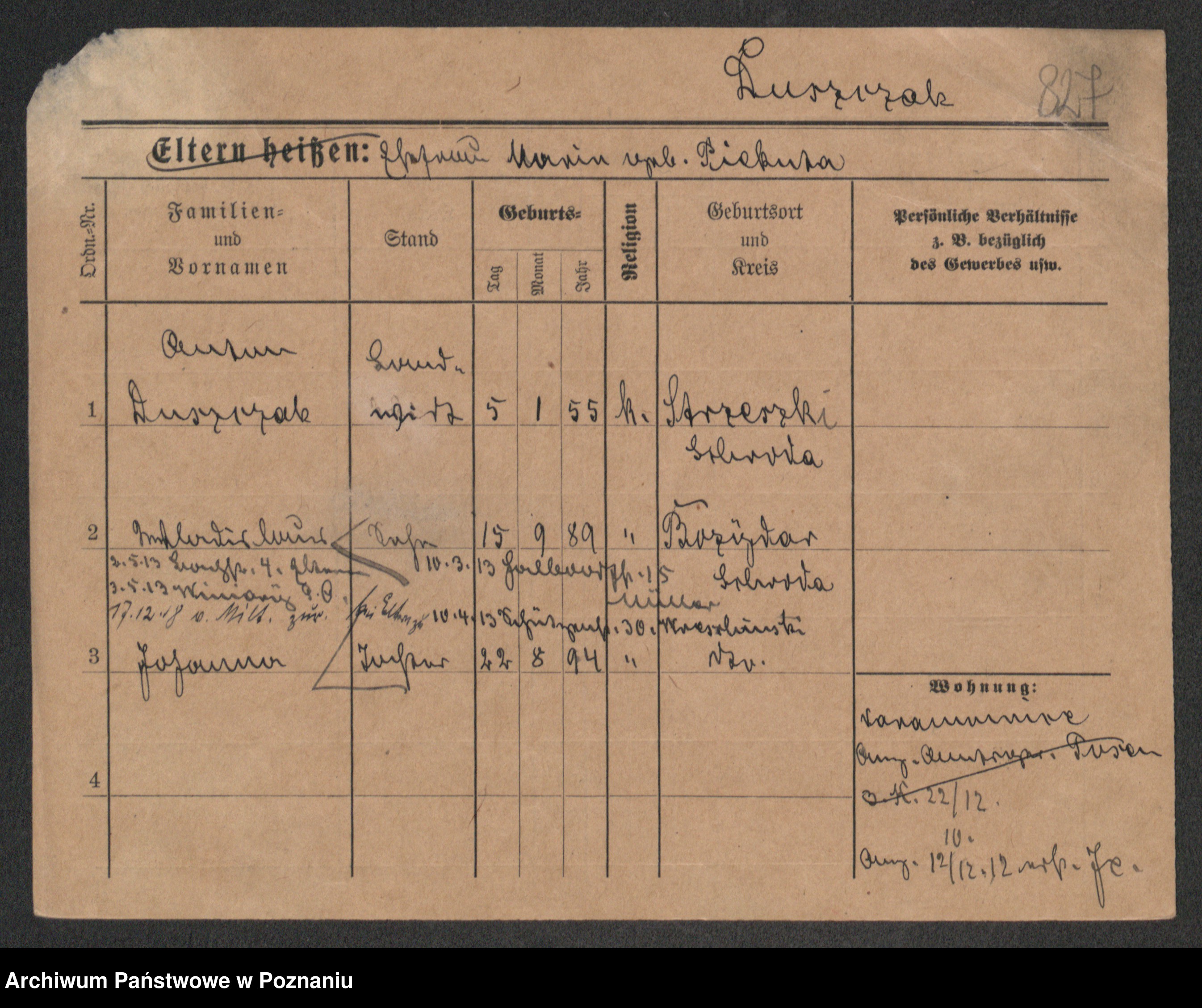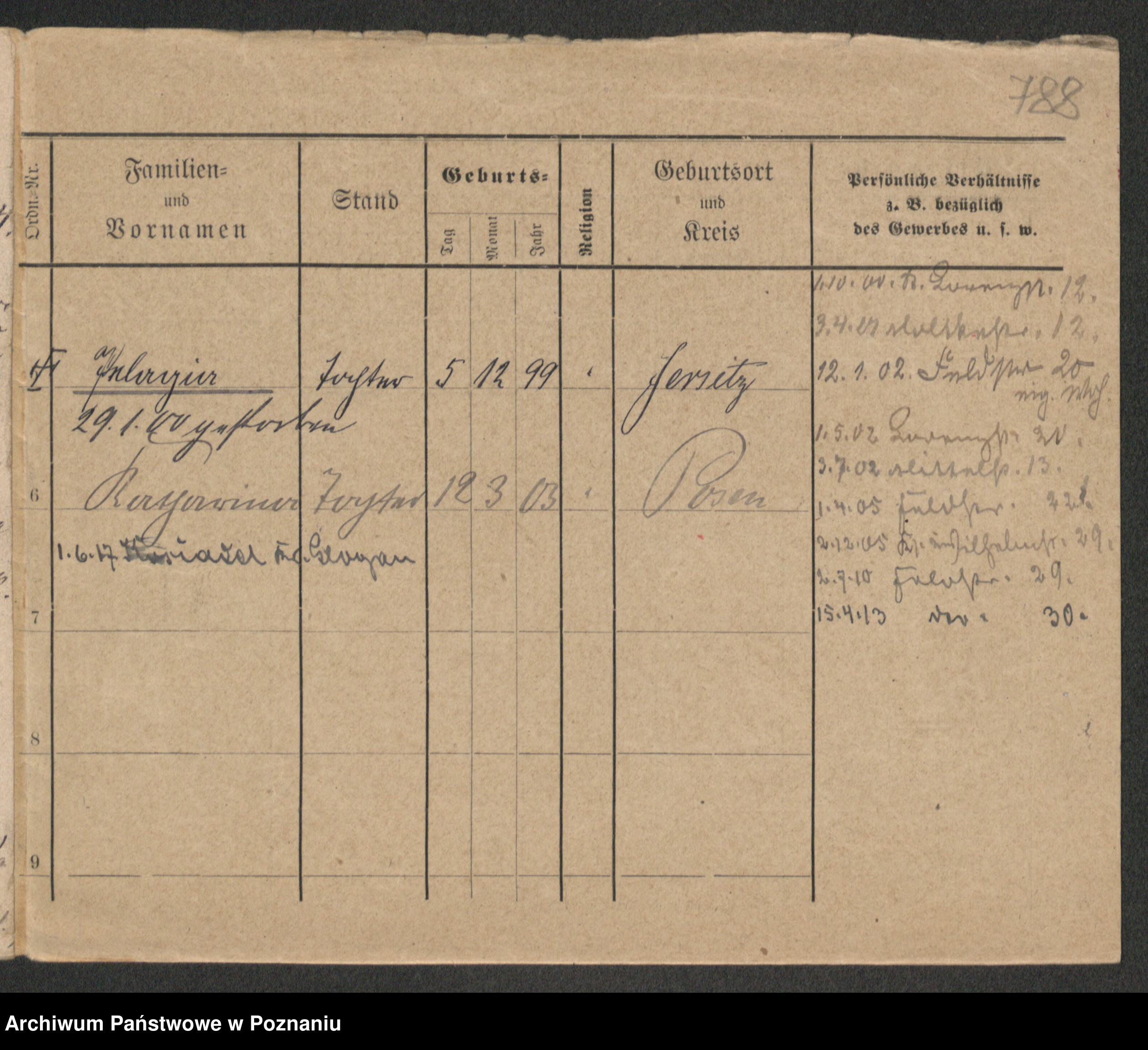 Podgląd karty osobowej dostępny jest po kliknięciu na nazwisko lub ikonkę karty. Można dokonywać powiększenia (ikony na górze) lub przechodzić między kolejnymi skanami (strzałki po bokach).