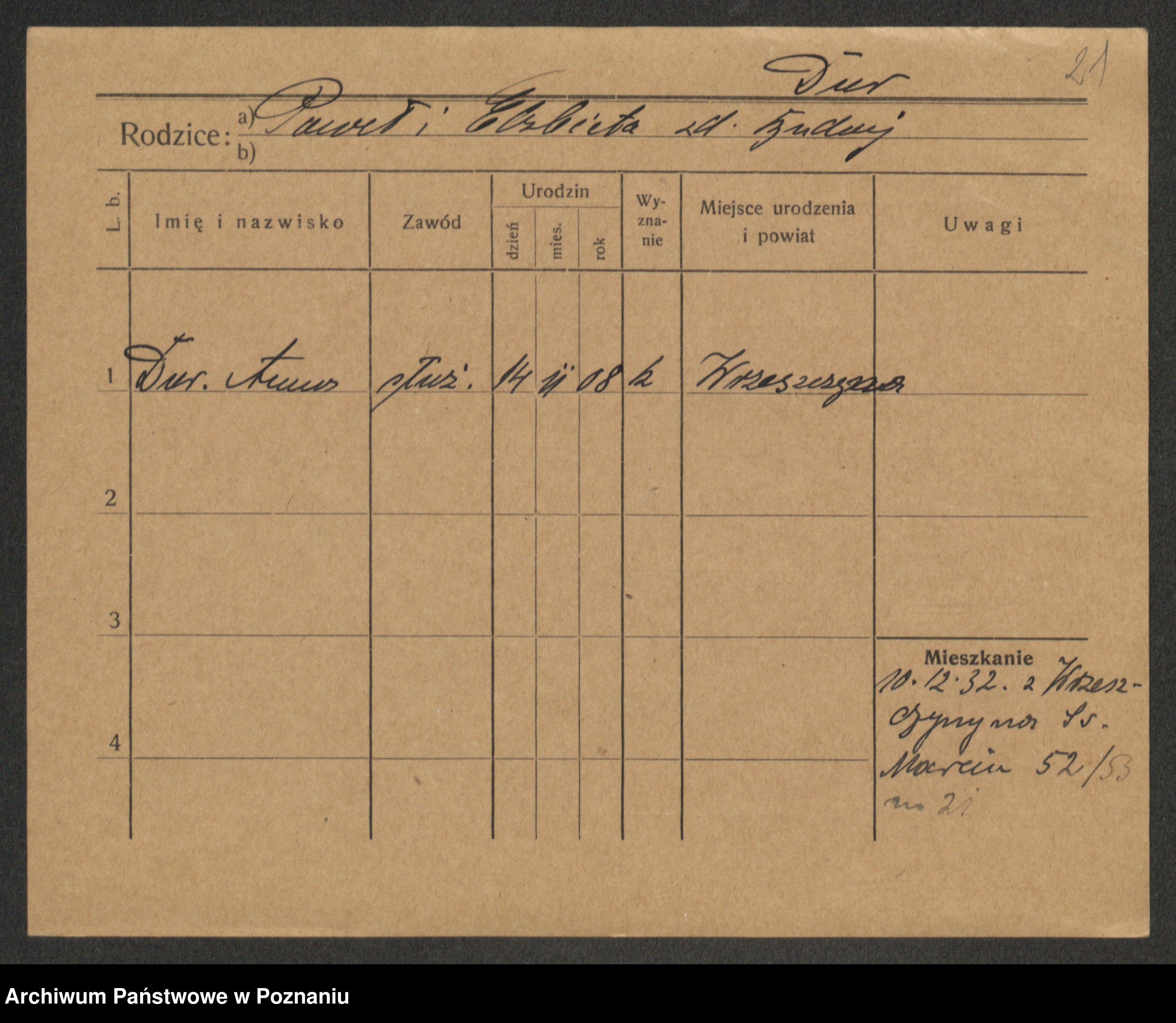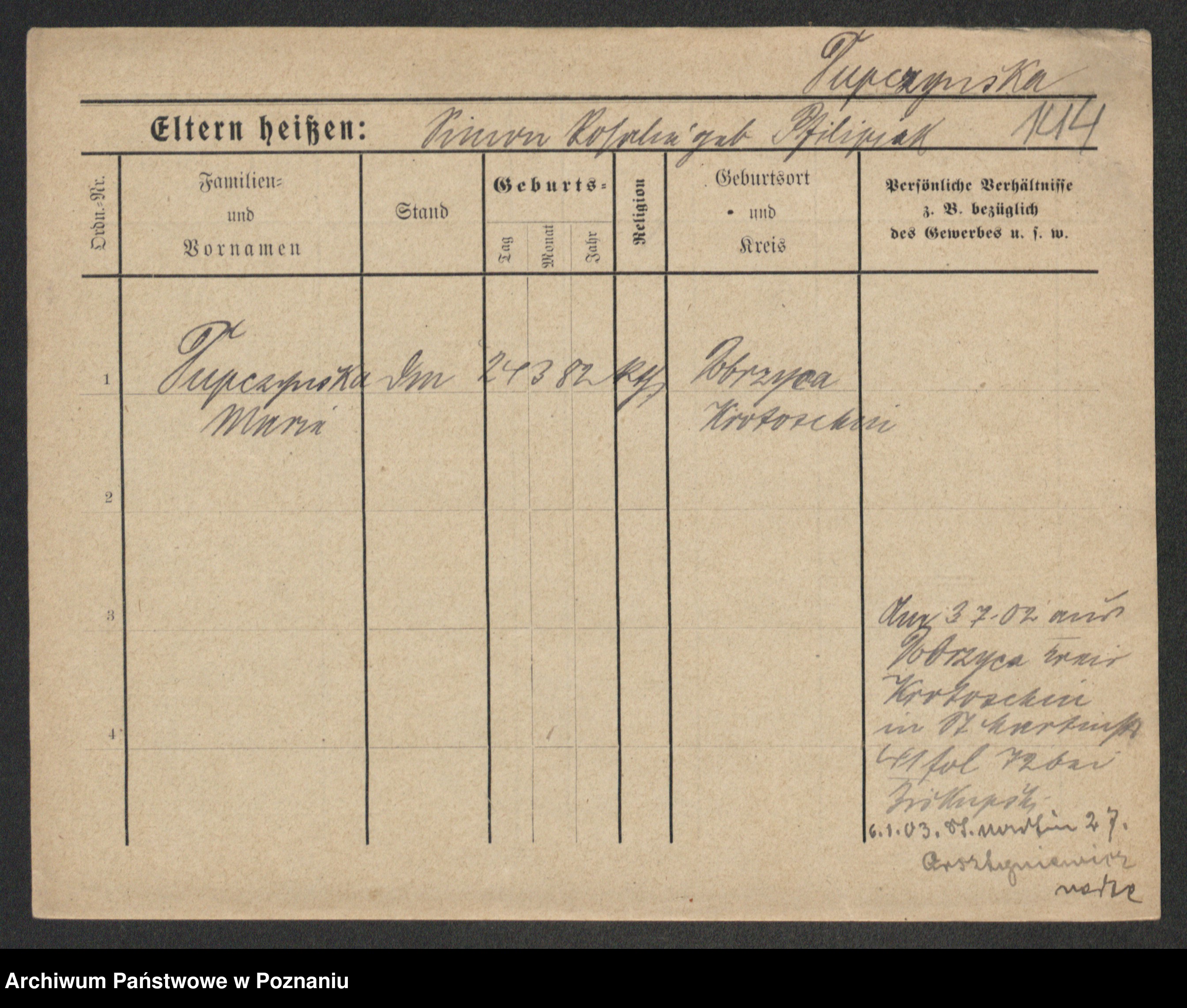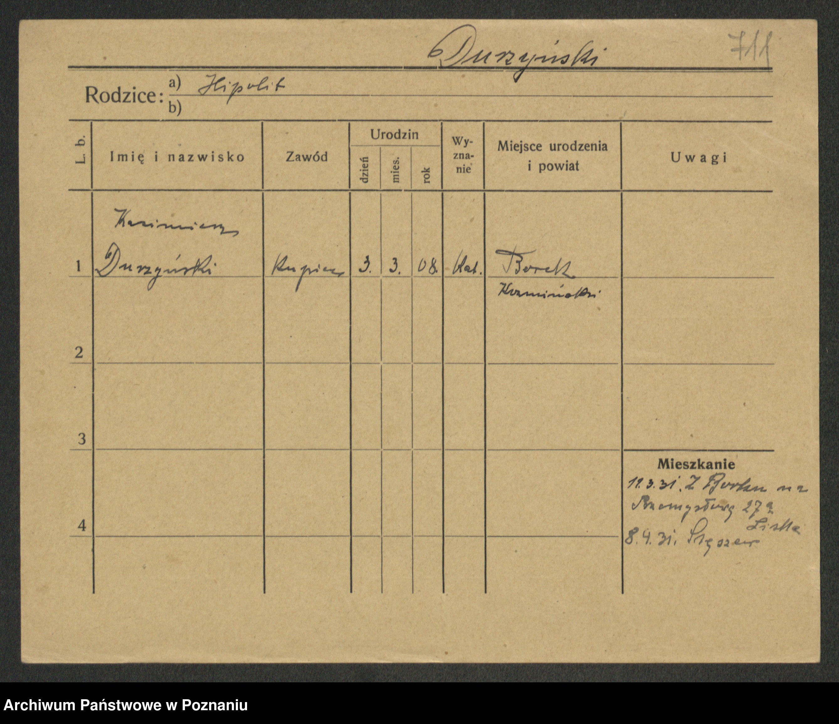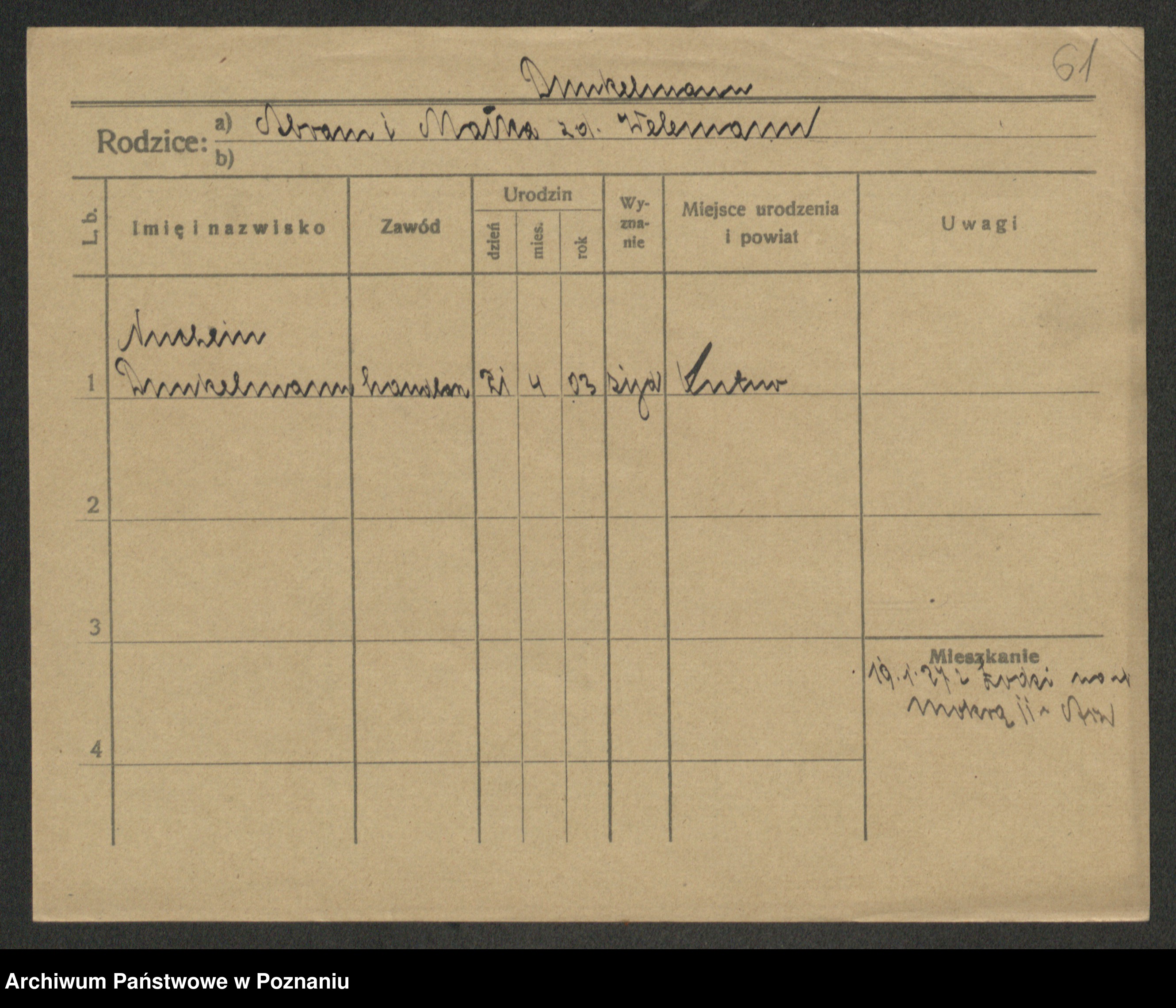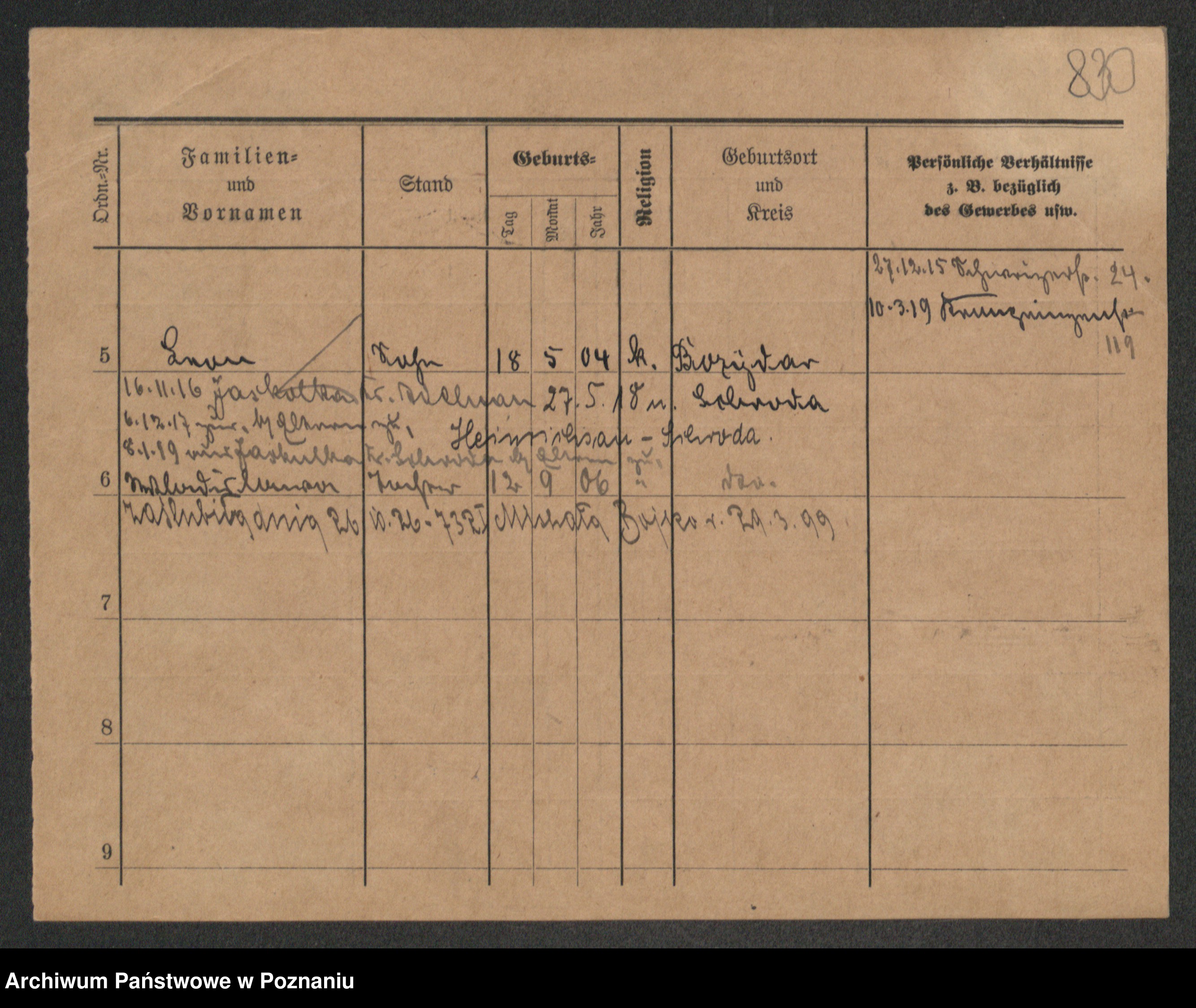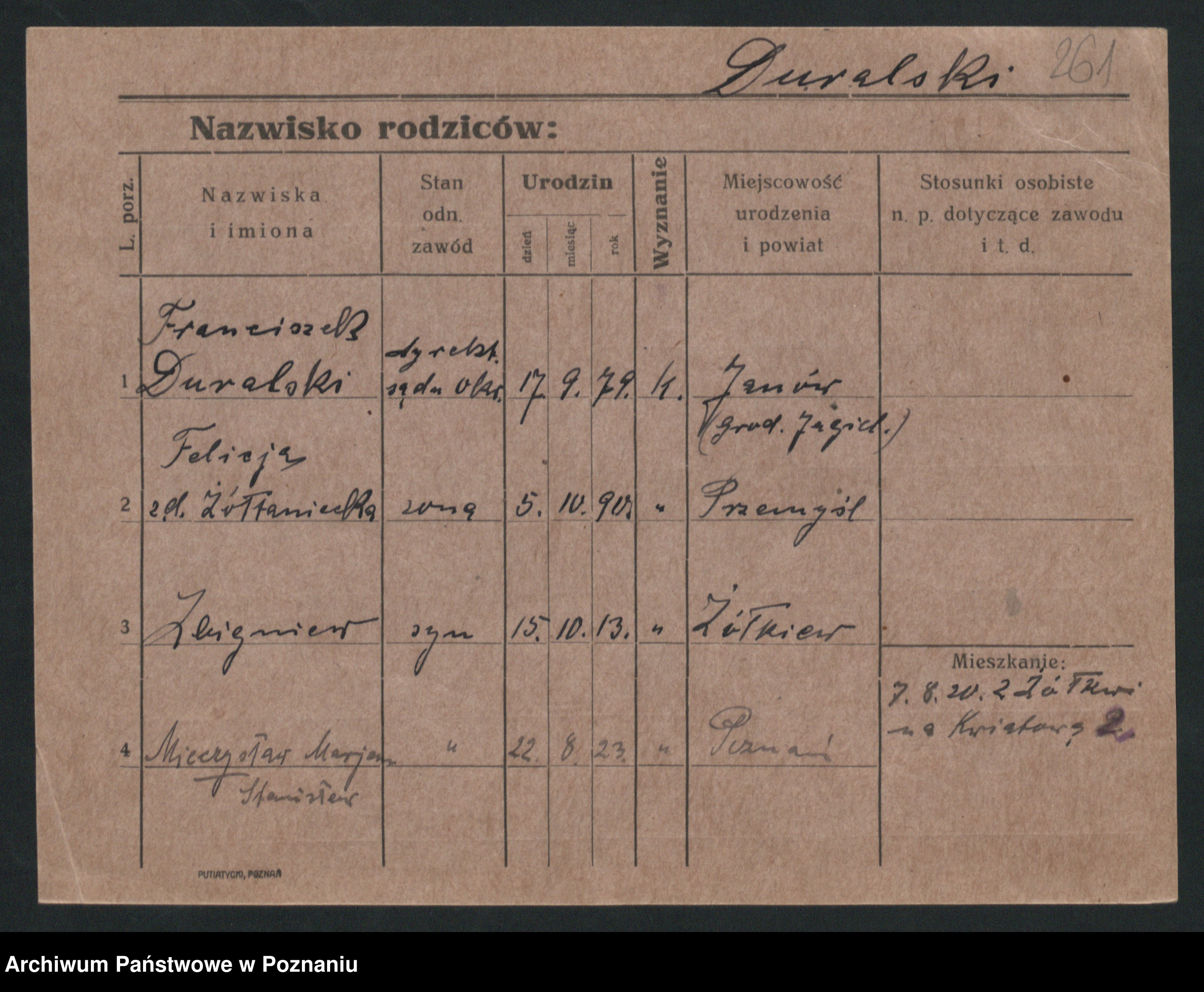 Podgląd karty osobowej dostępny jest po kliknięciu na nazwisko lub ikonkę karty. Można dokonywać powiększenia (ikony na górze) lub przechodzić między kolejnymi skanami (strzałki po bokach).