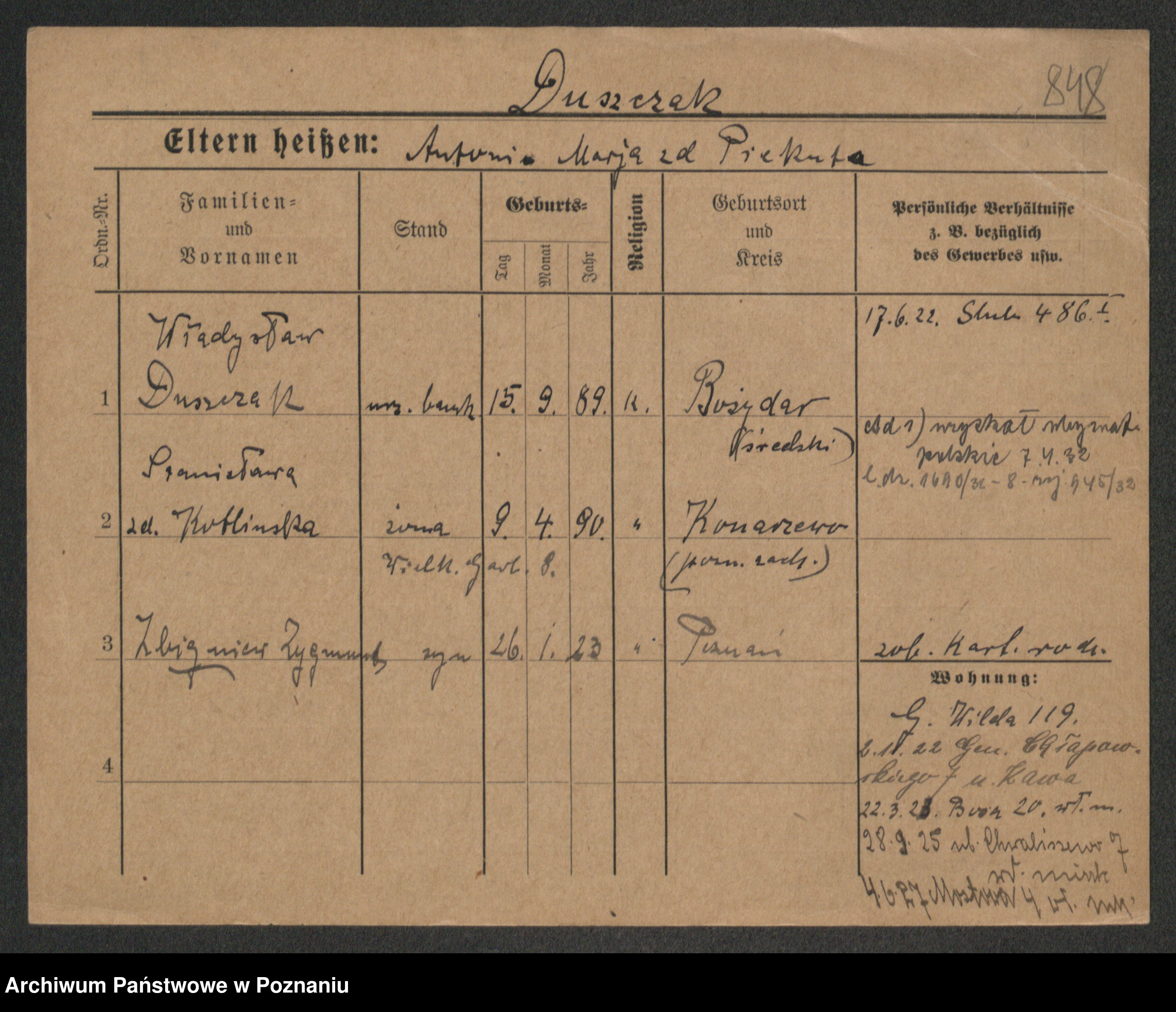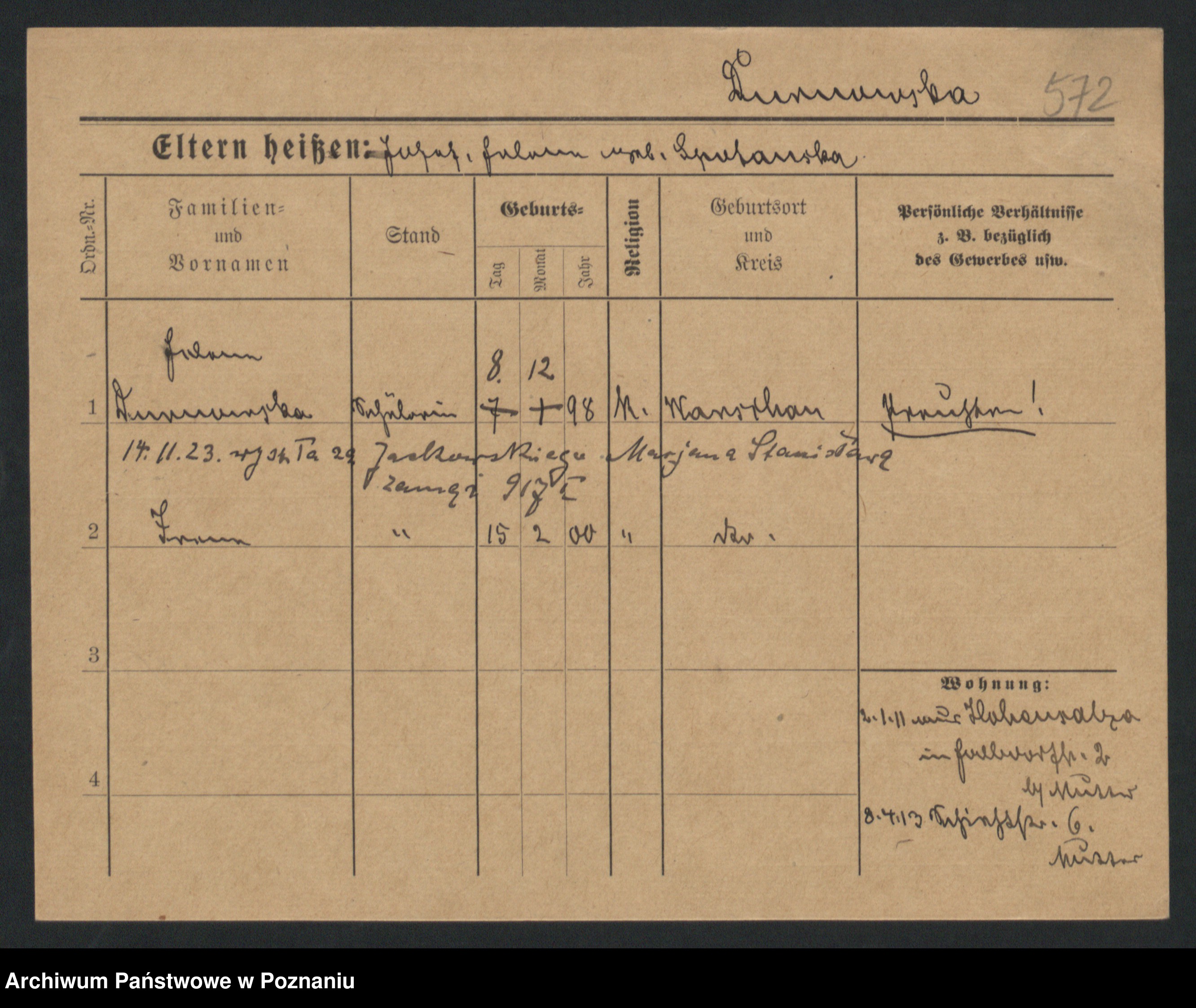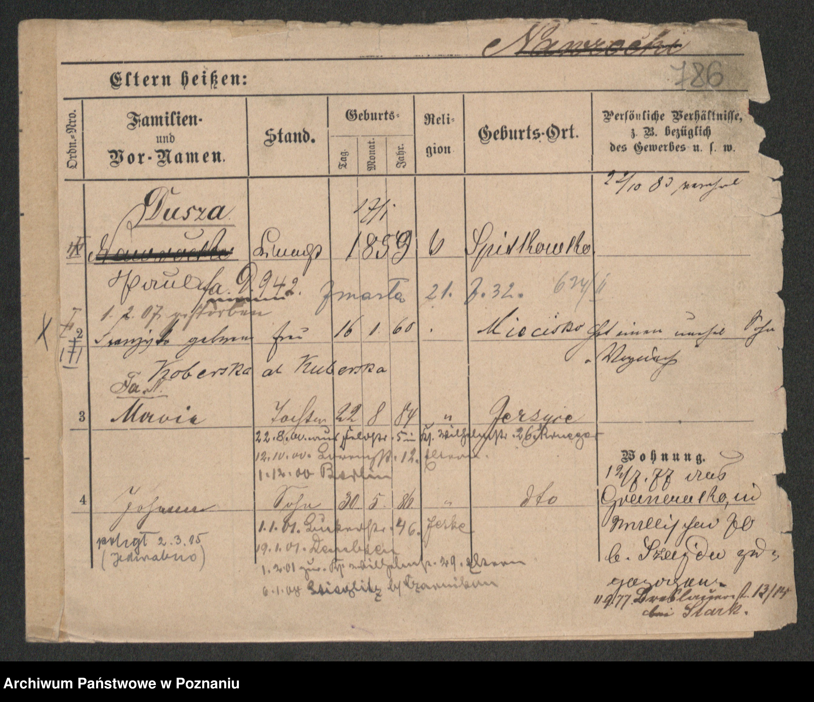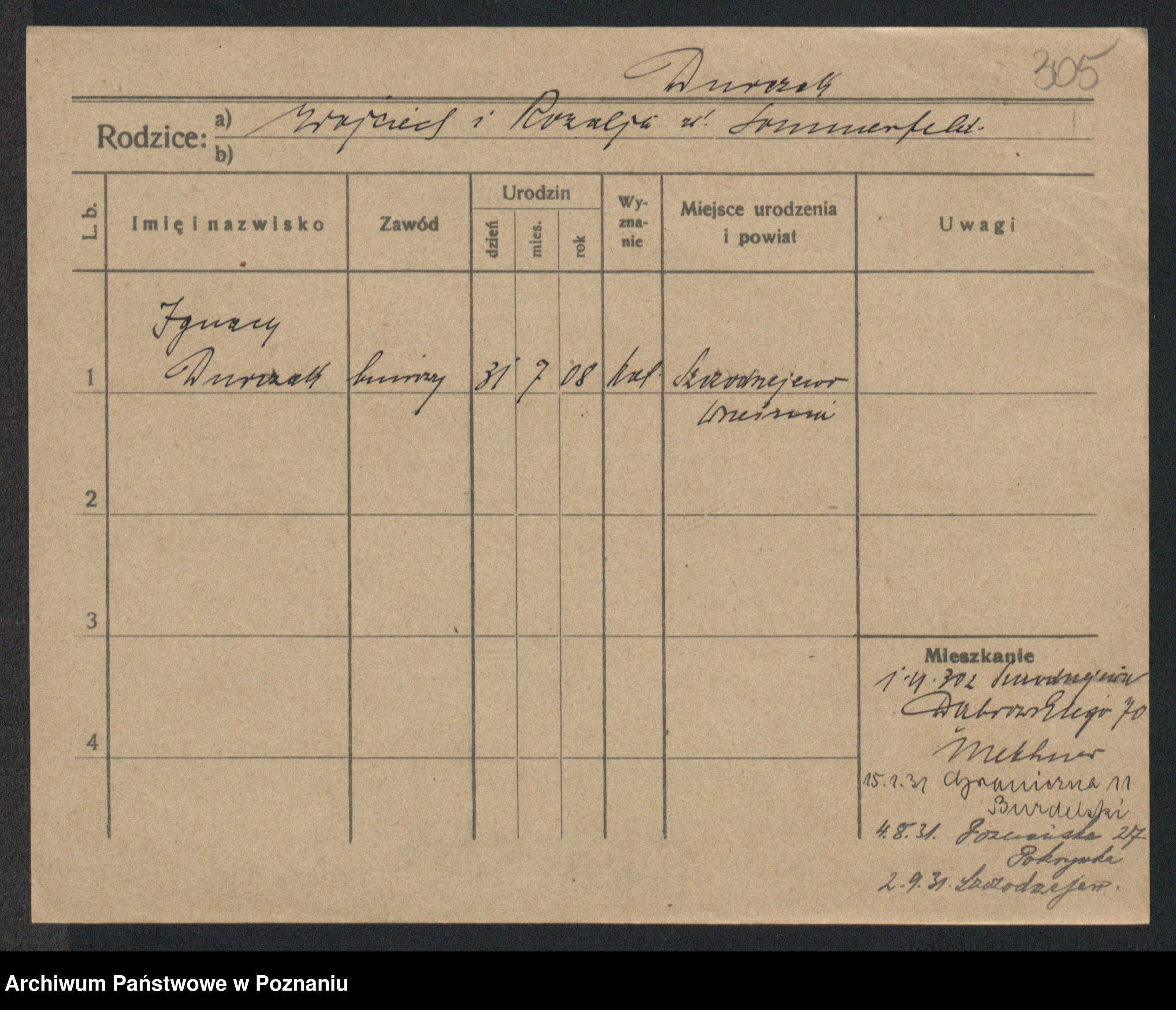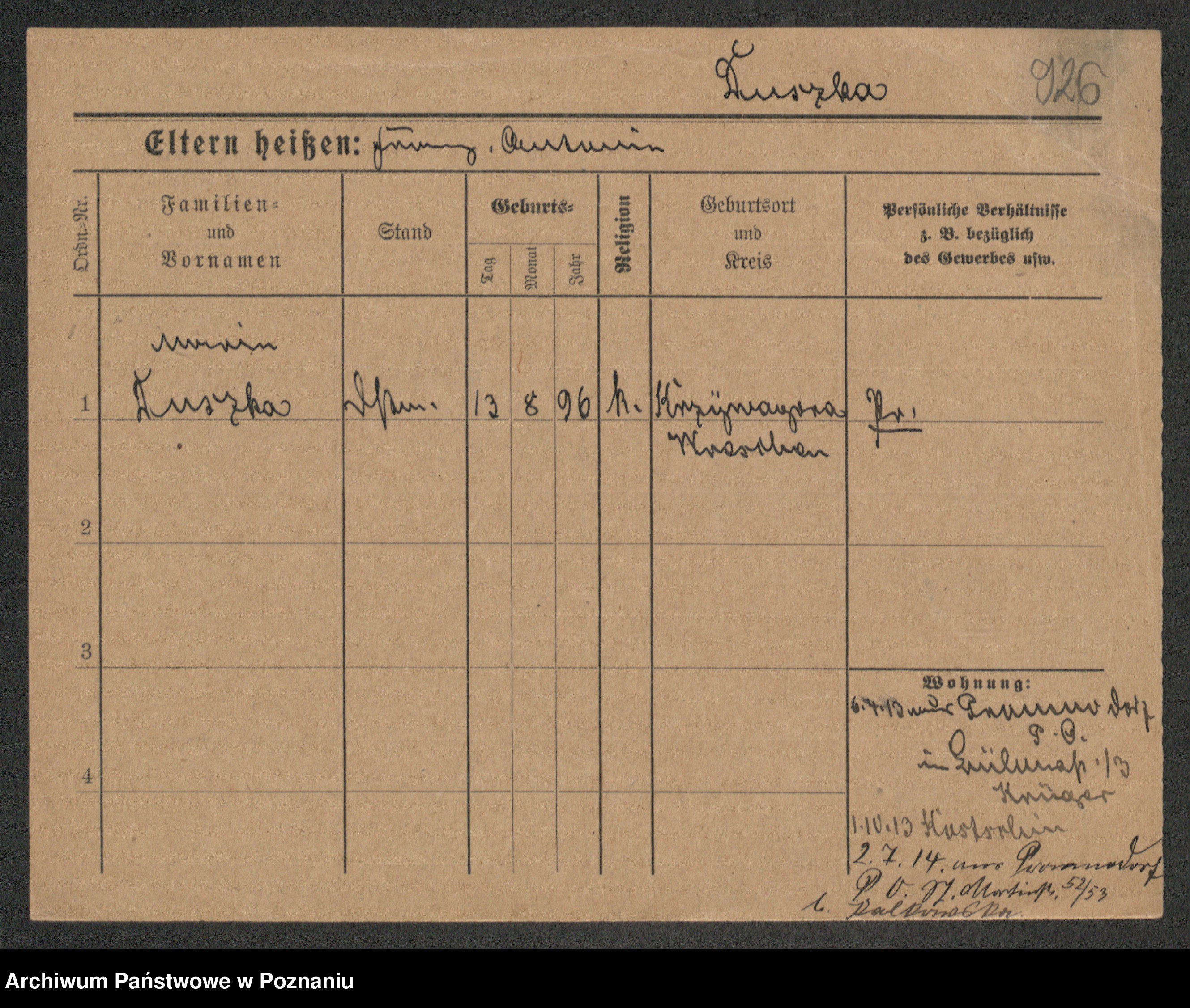 Podgląd karty osobowej dostępny jest po kliknięciu na nazwisko lub ikonkę karty. Można dokonywać powiększenia (ikony na górze) lub przechodzić między kolejnymi skanami (strzałki po bokach).