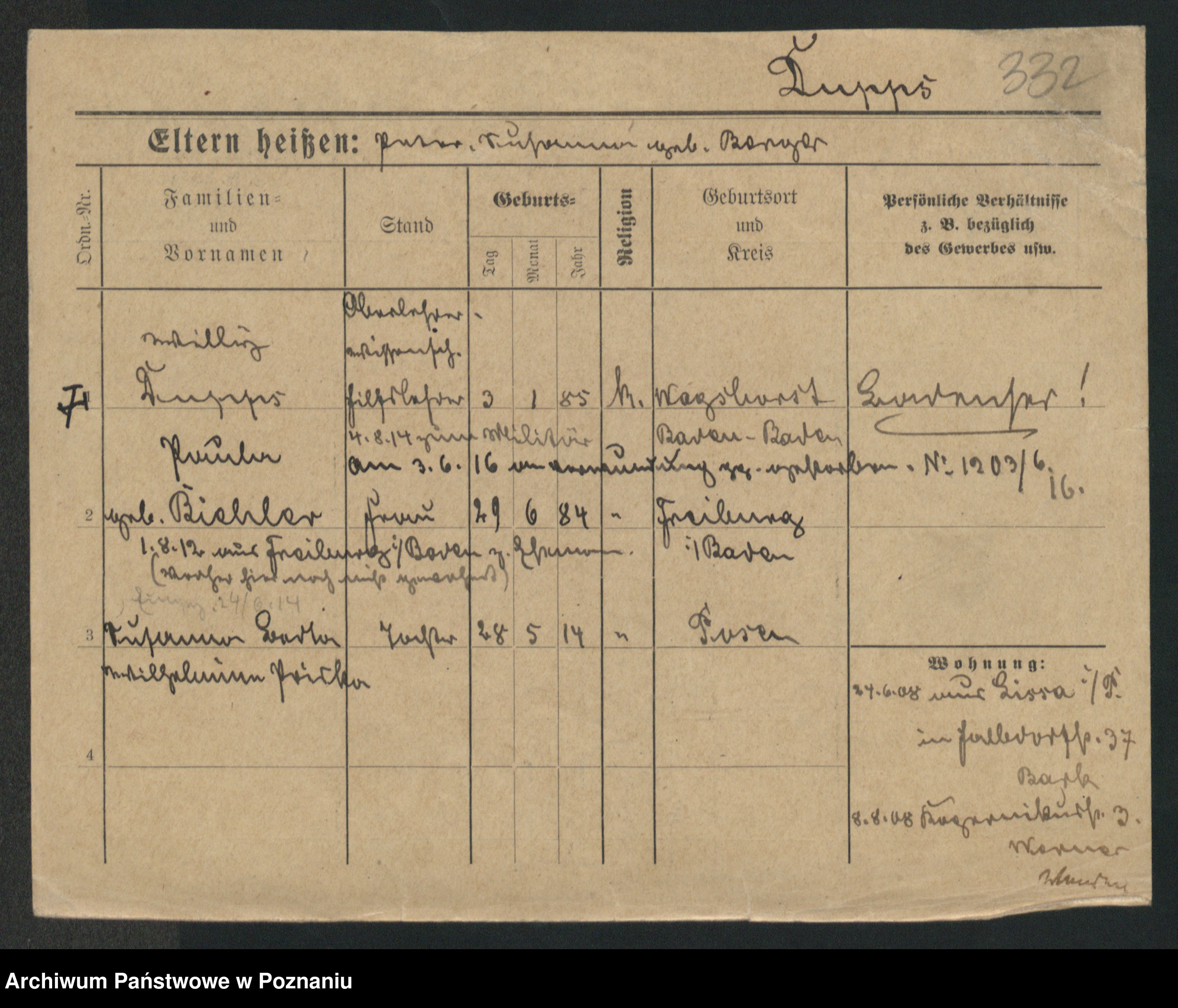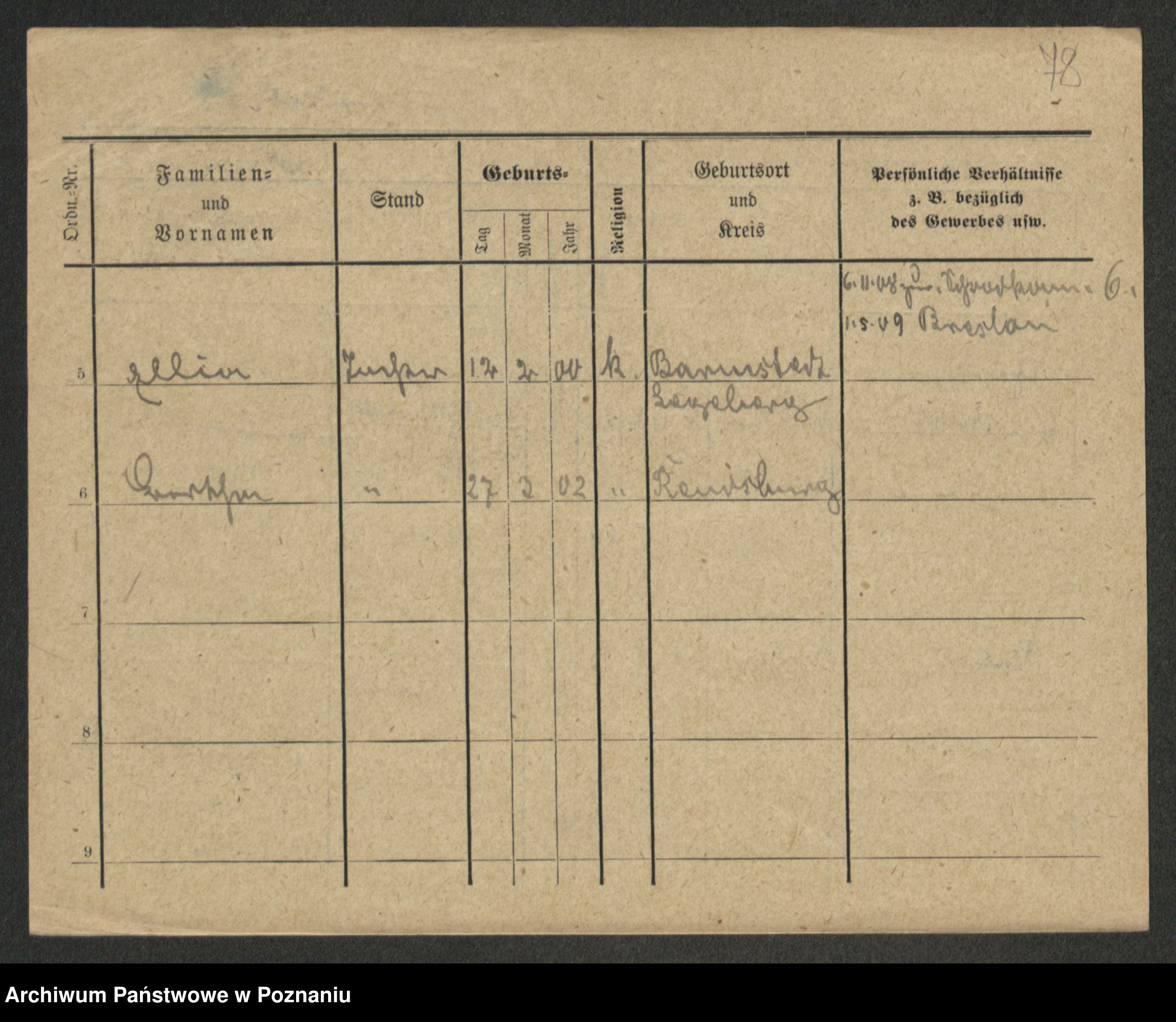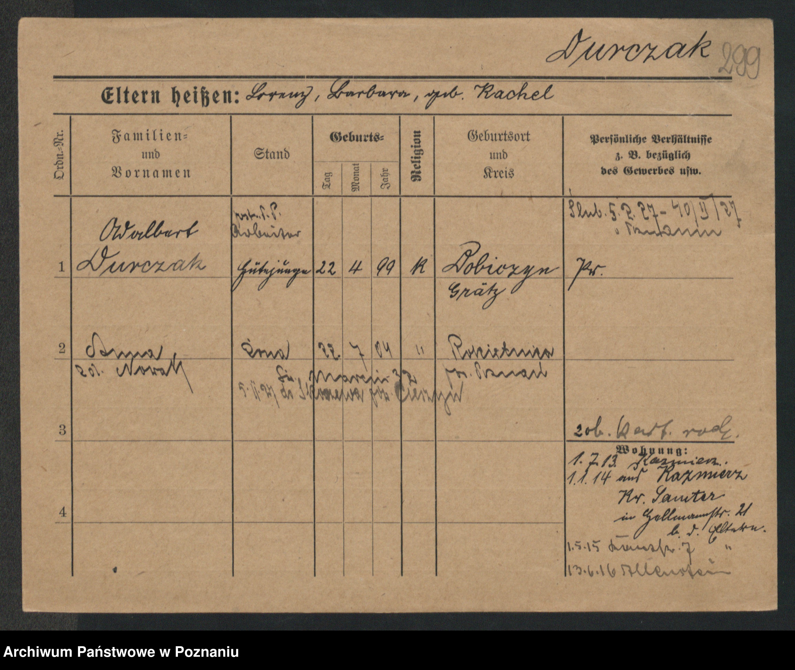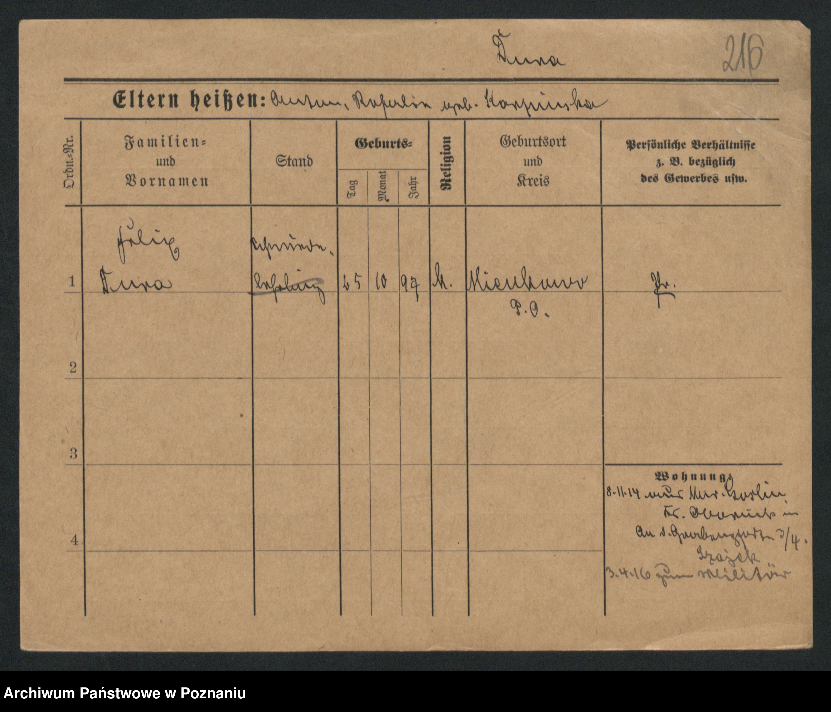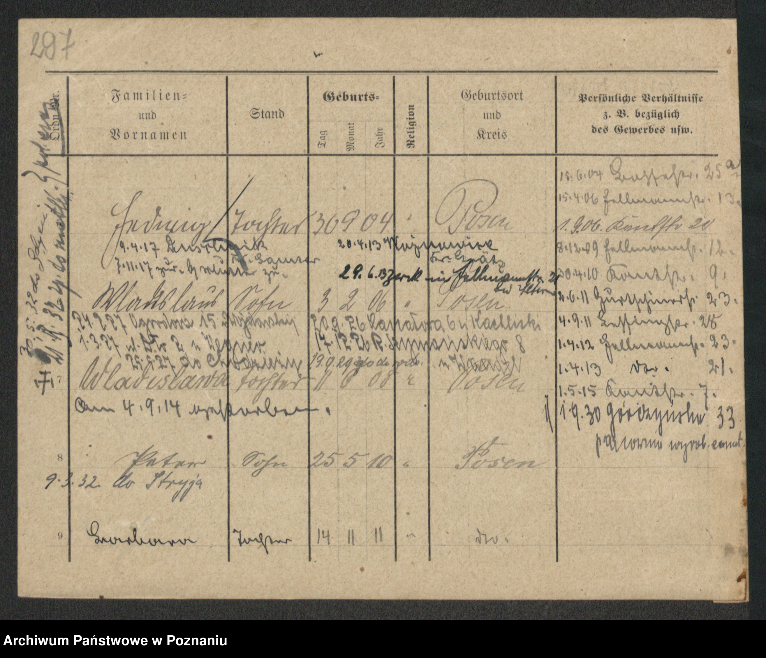 Podgląd karty osobowej dostępny jest po kliknięciu na nazwisko lub ikonkę karty. Można dokonywać powiększenia (ikony na górze) lub przechodzić między kolejnymi skanami (strzałki po bokach).