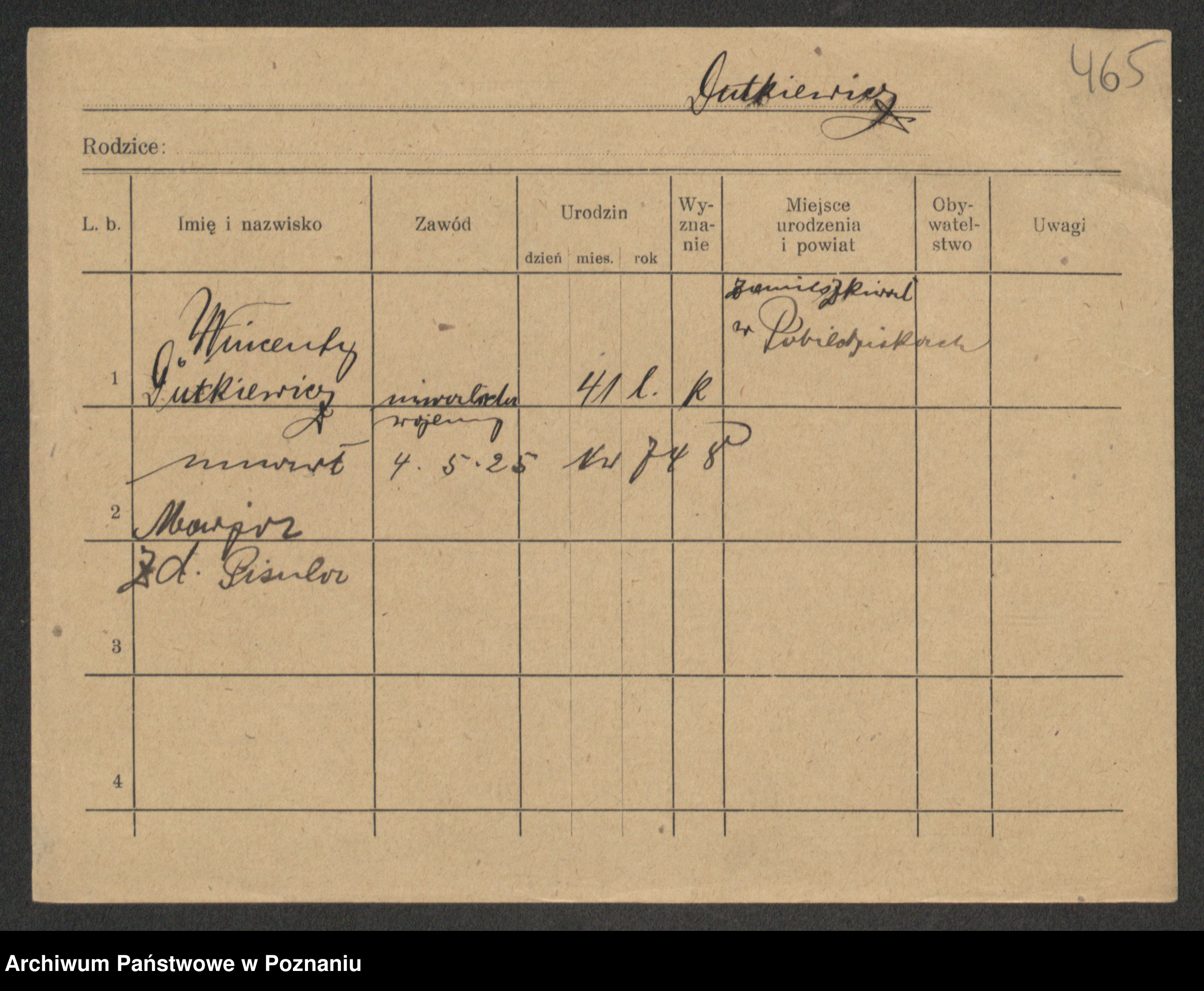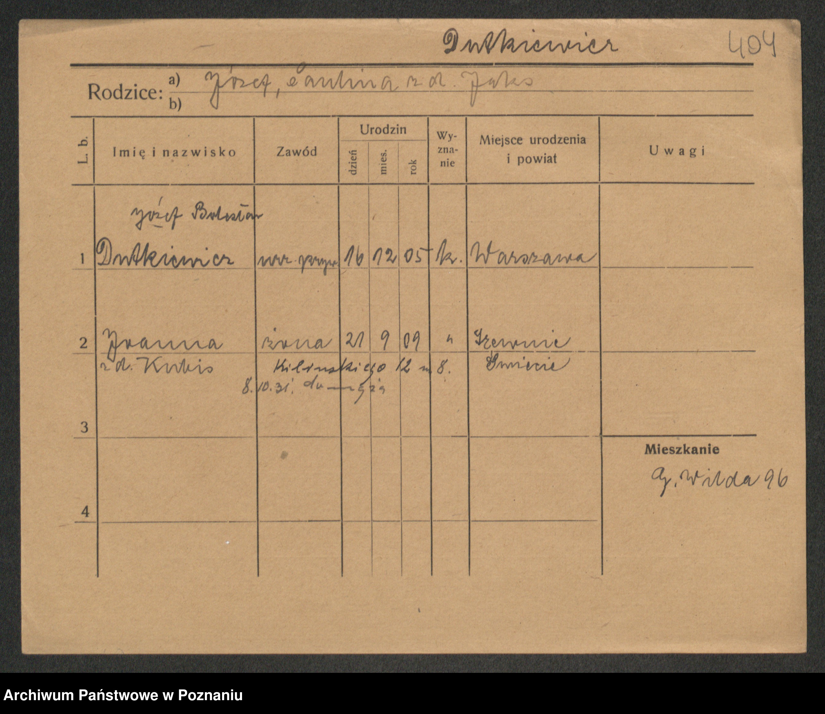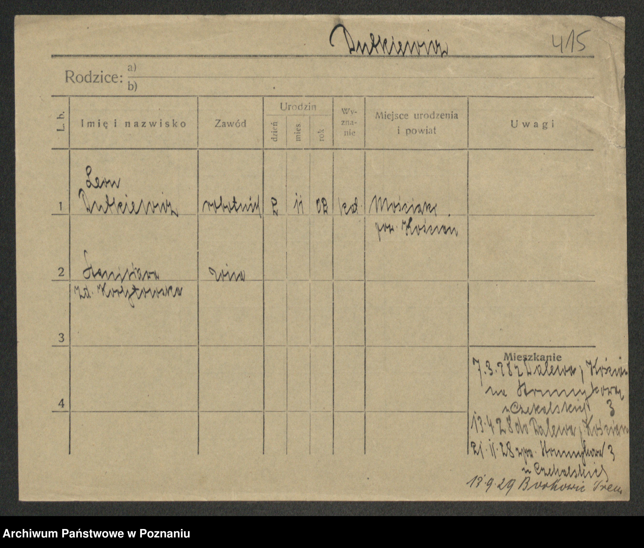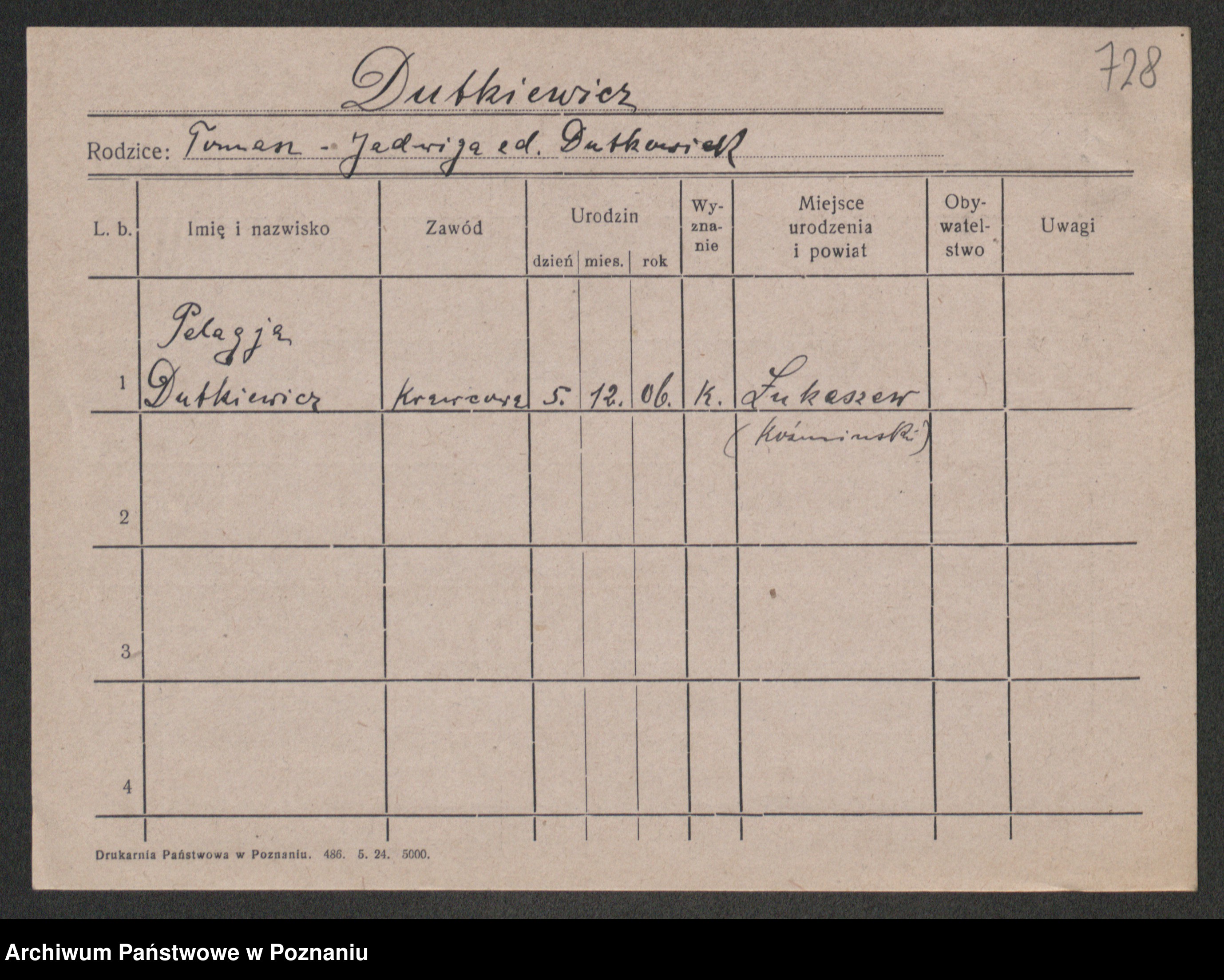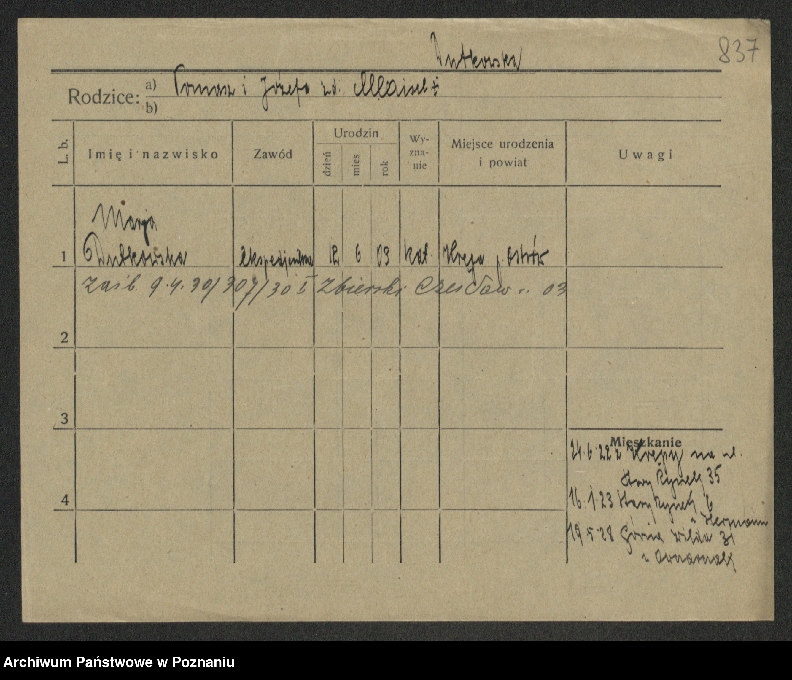 Podgląd karty osobowej dostępny jest po kliknięciu na nazwisko lub ikonkę karty. Można dokonywać powiększenia (ikony na górze) lub przechodzić między kolejnymi skanami (strzałki po bokach).