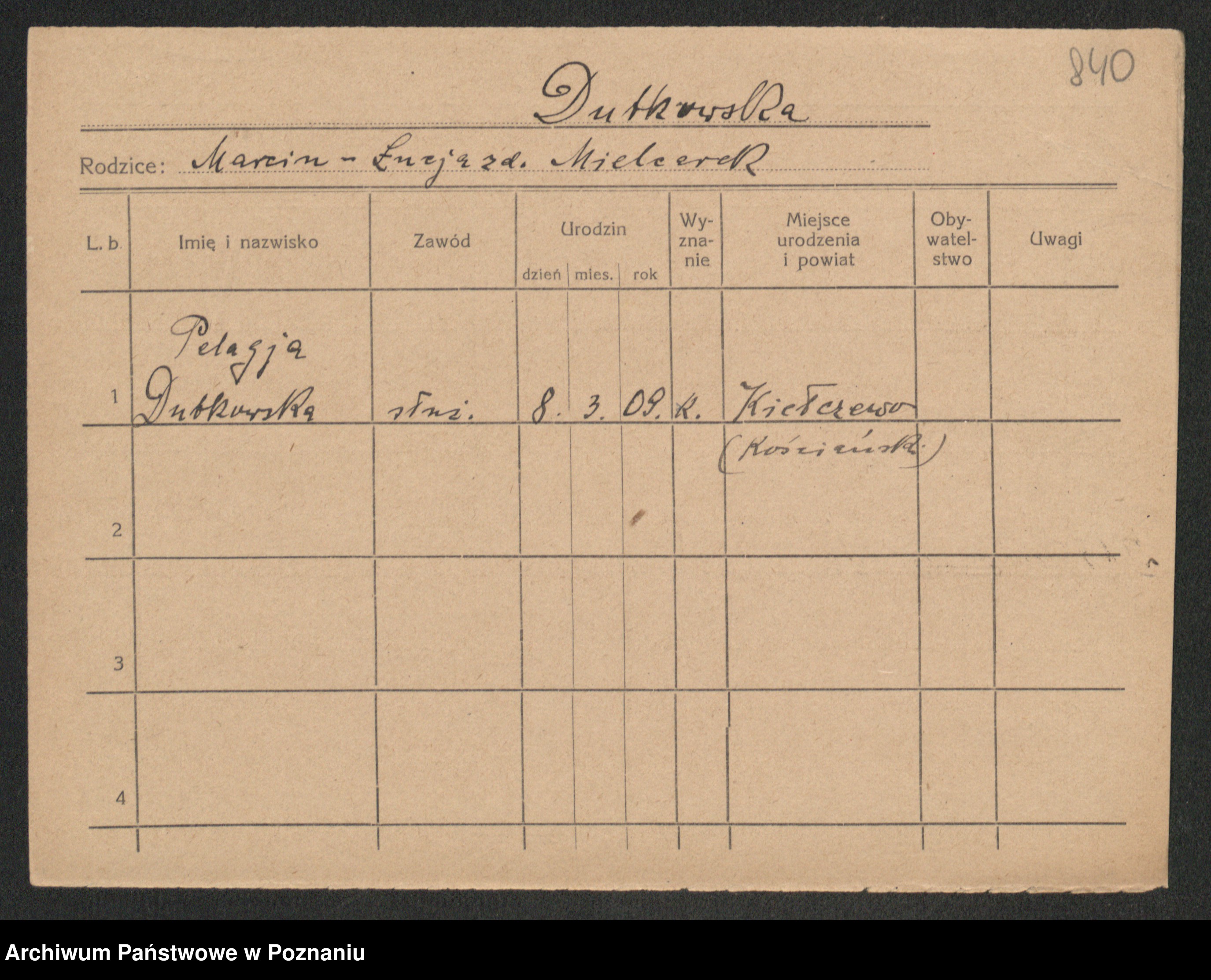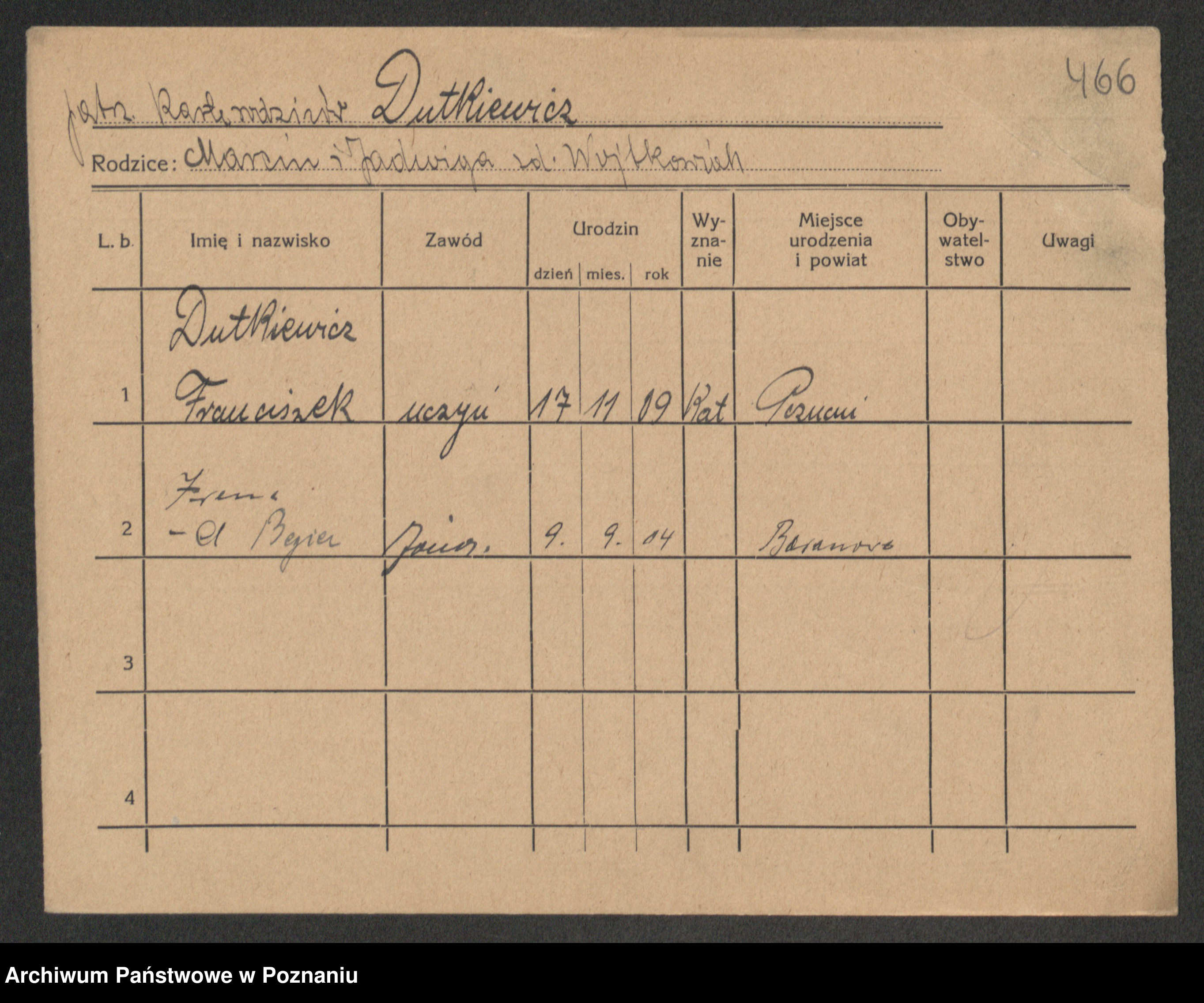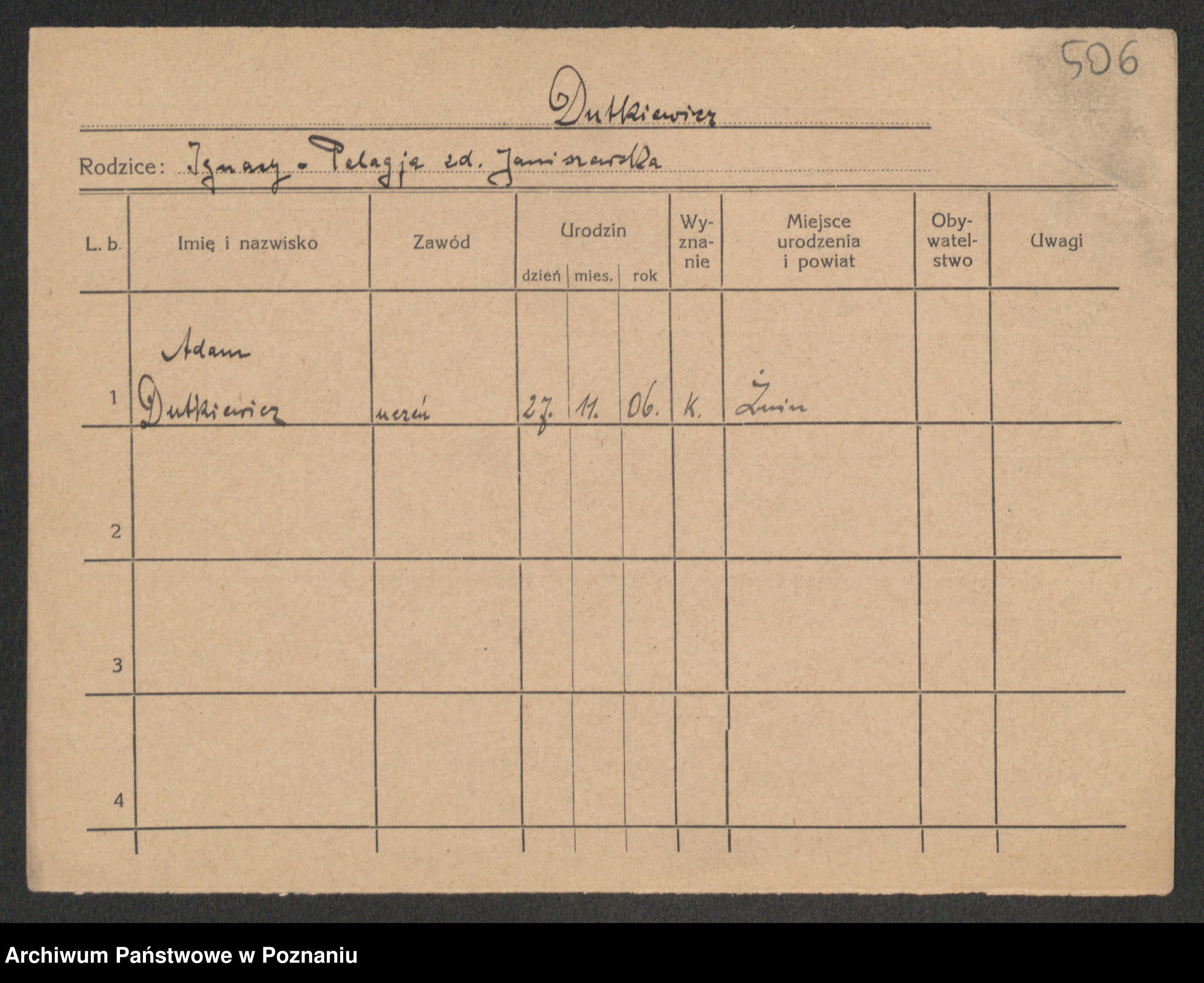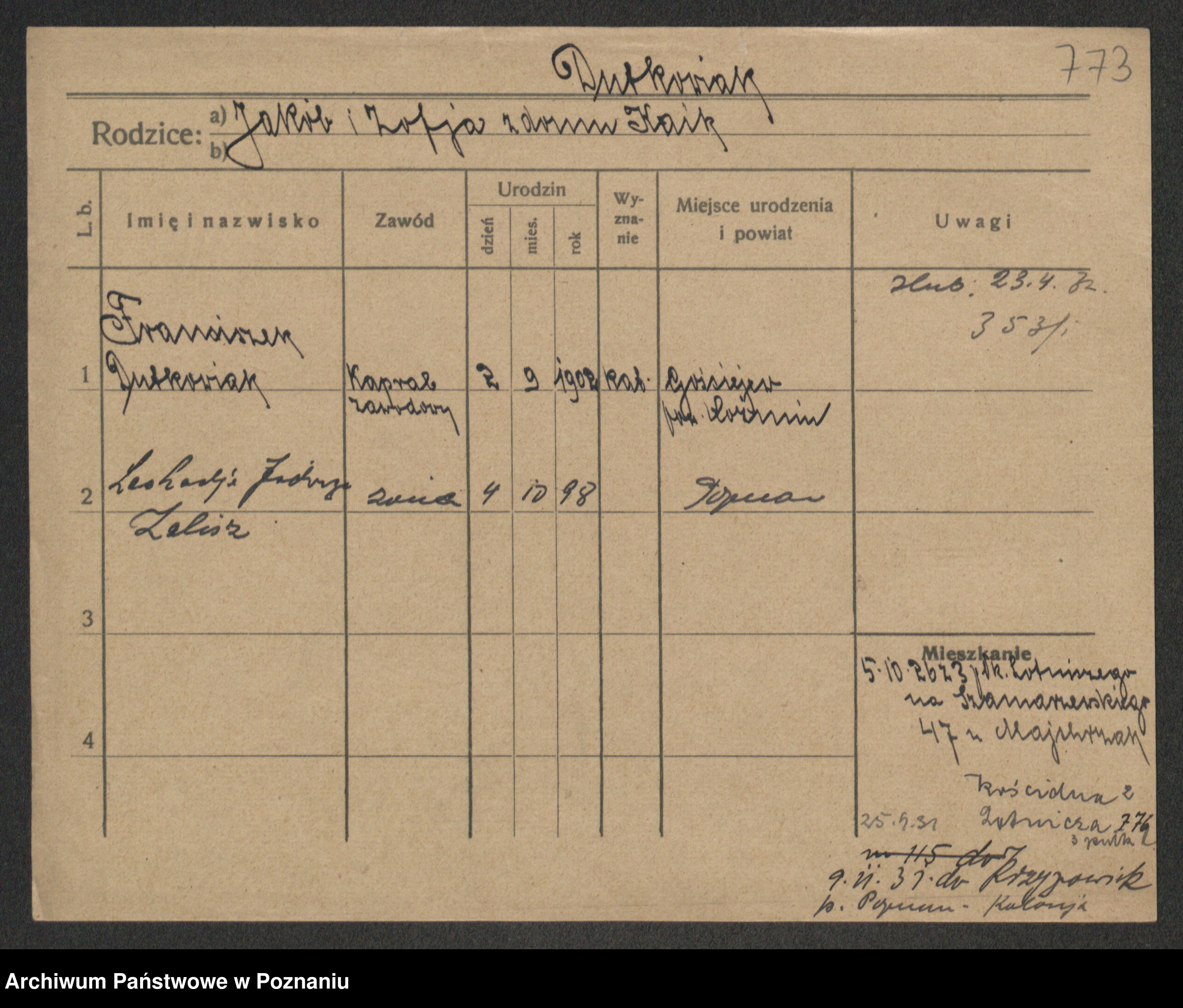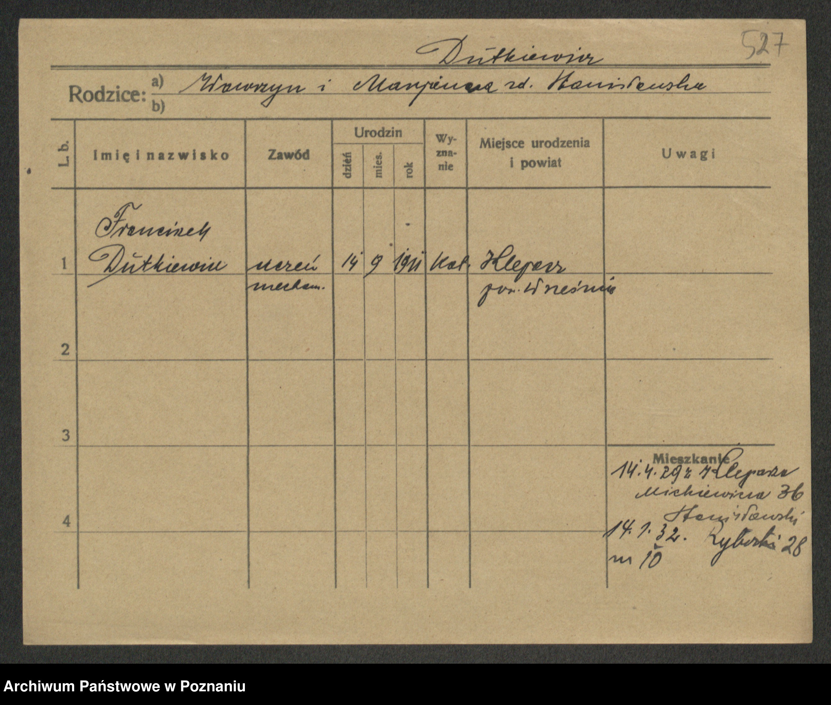 Podgląd karty osobowej dostępny jest po kliknięciu na nazwisko lub ikonkę karty. Można dokonywać powiększenia (ikony na górze) lub przechodzić między kolejnymi skanami (strzałki po bokach).