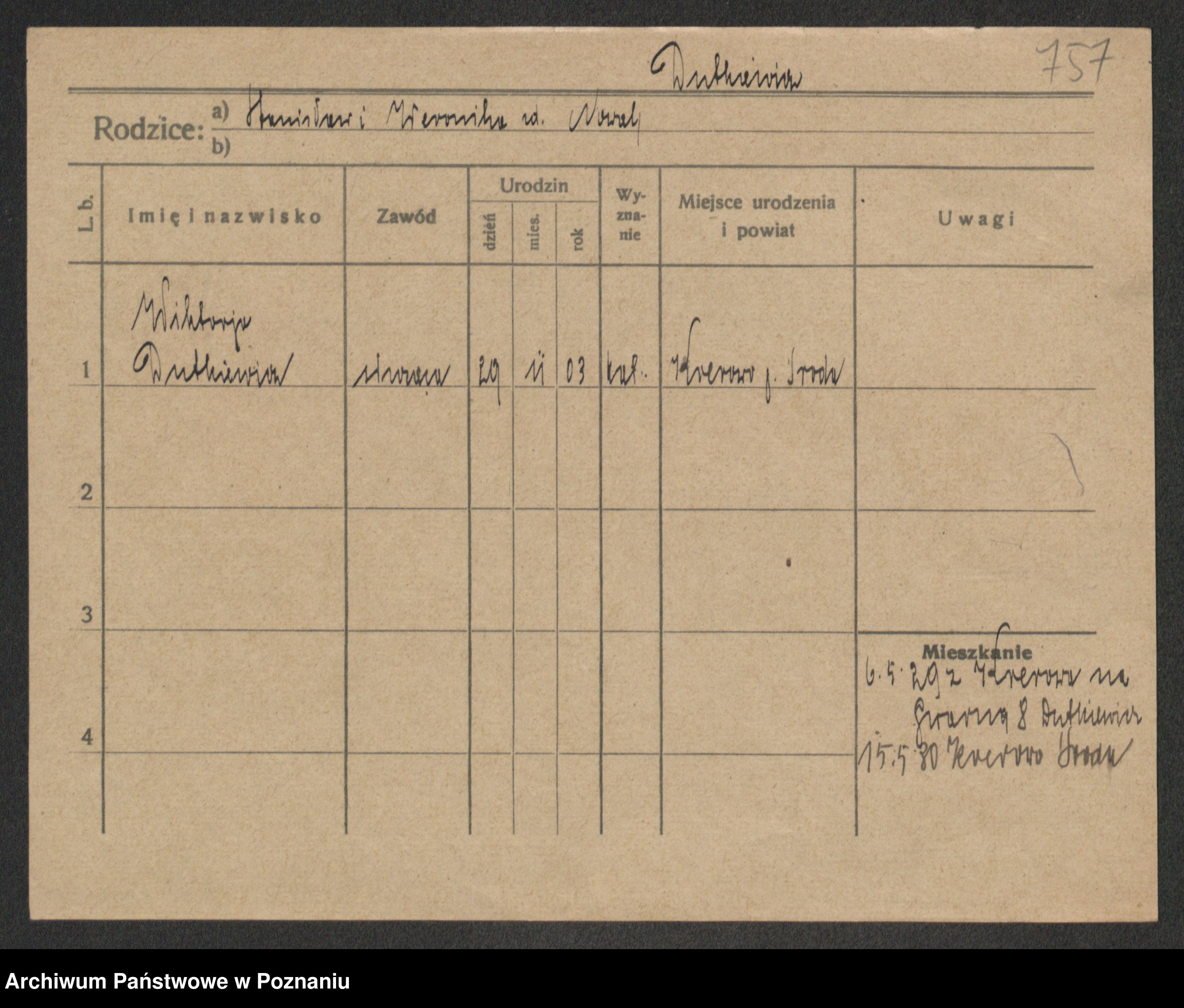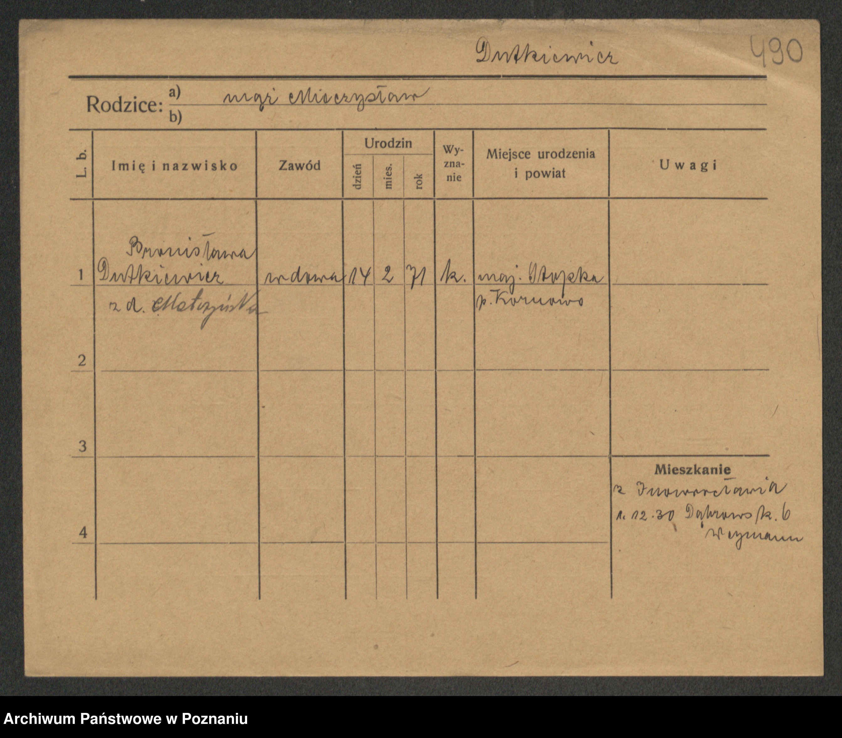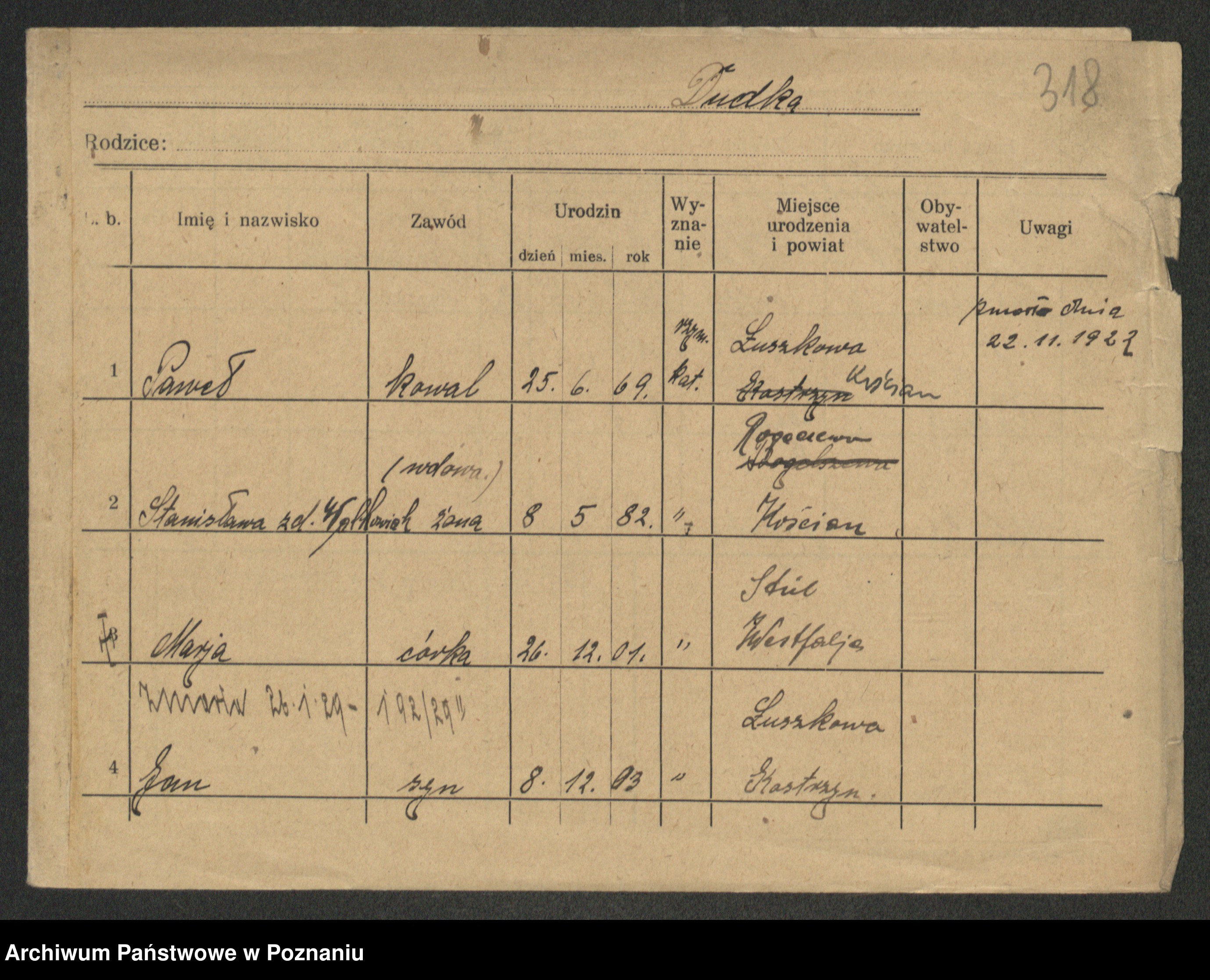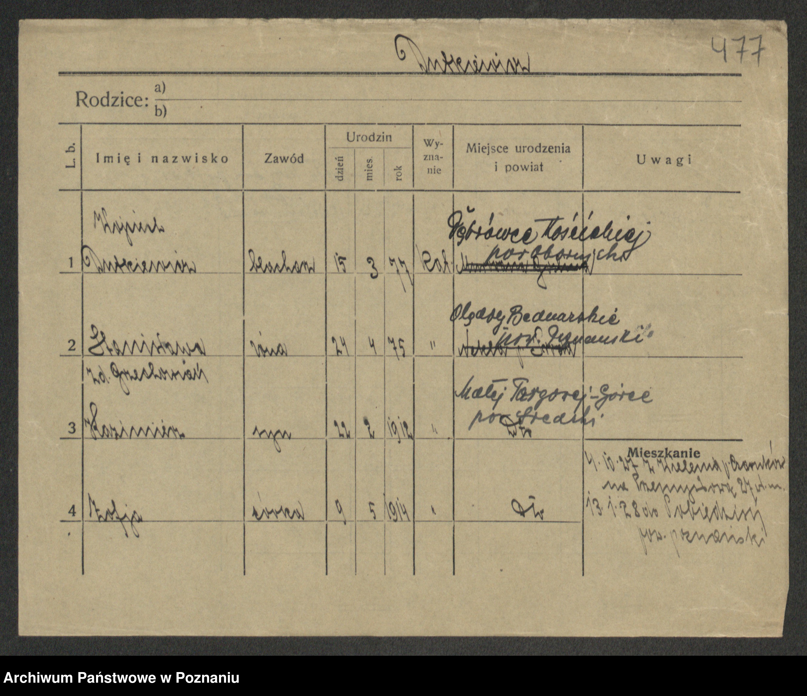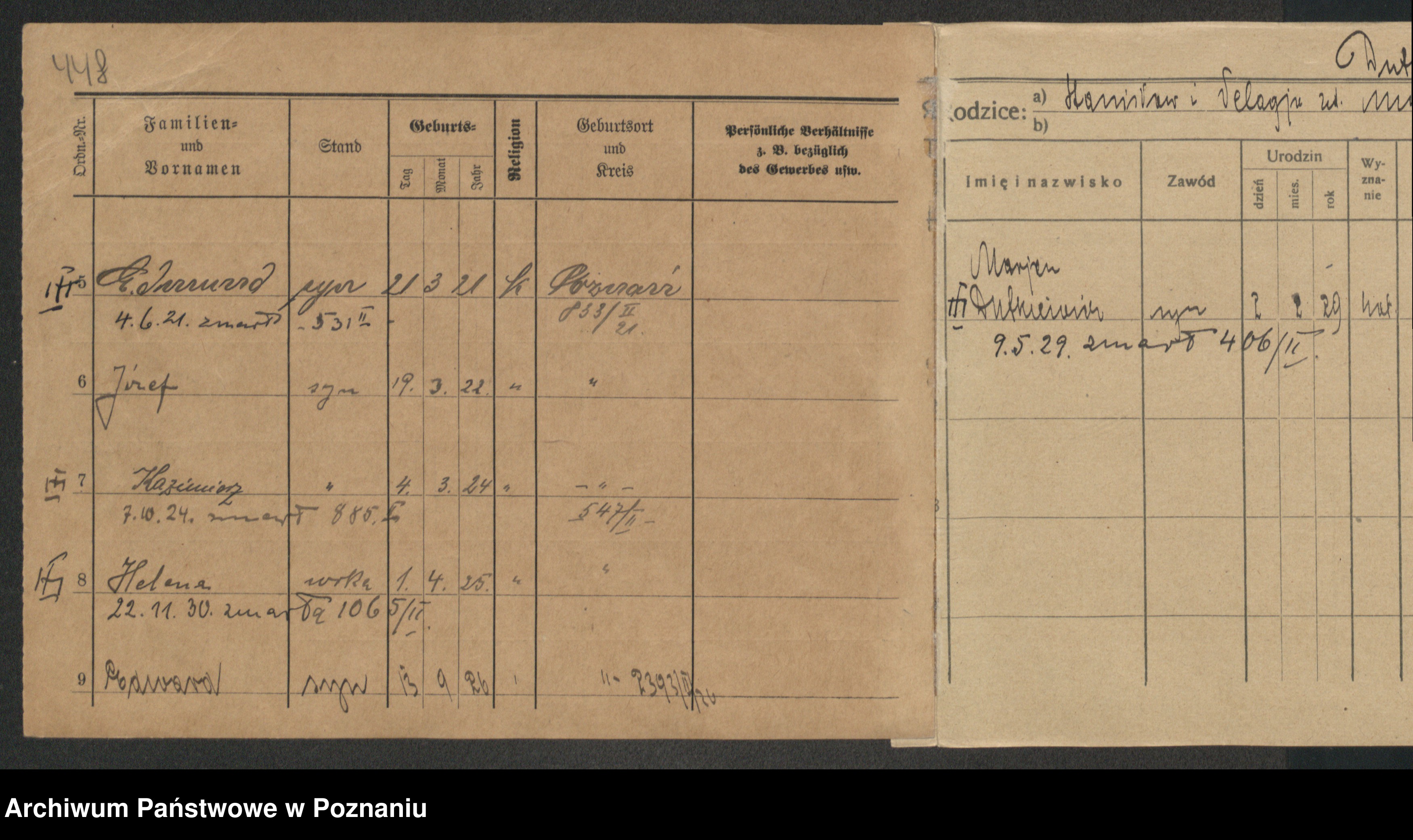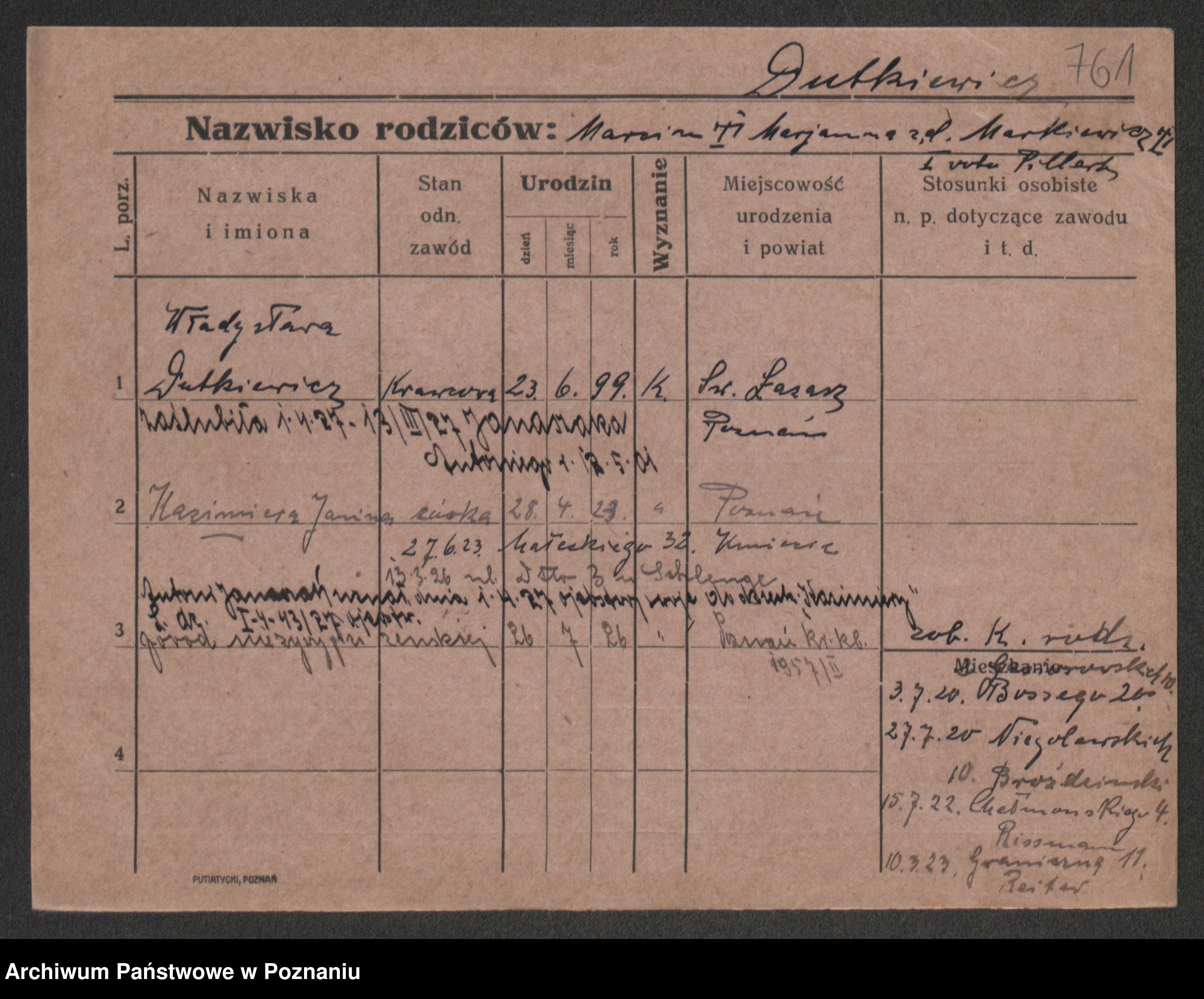 Podgląd karty osobowej dostępny jest po kliknięciu na nazwisko lub ikonkę karty. Można dokonywać powiększenia (ikony na górze) lub przechodzić między kolejnymi skanami (strzałki po bokach).