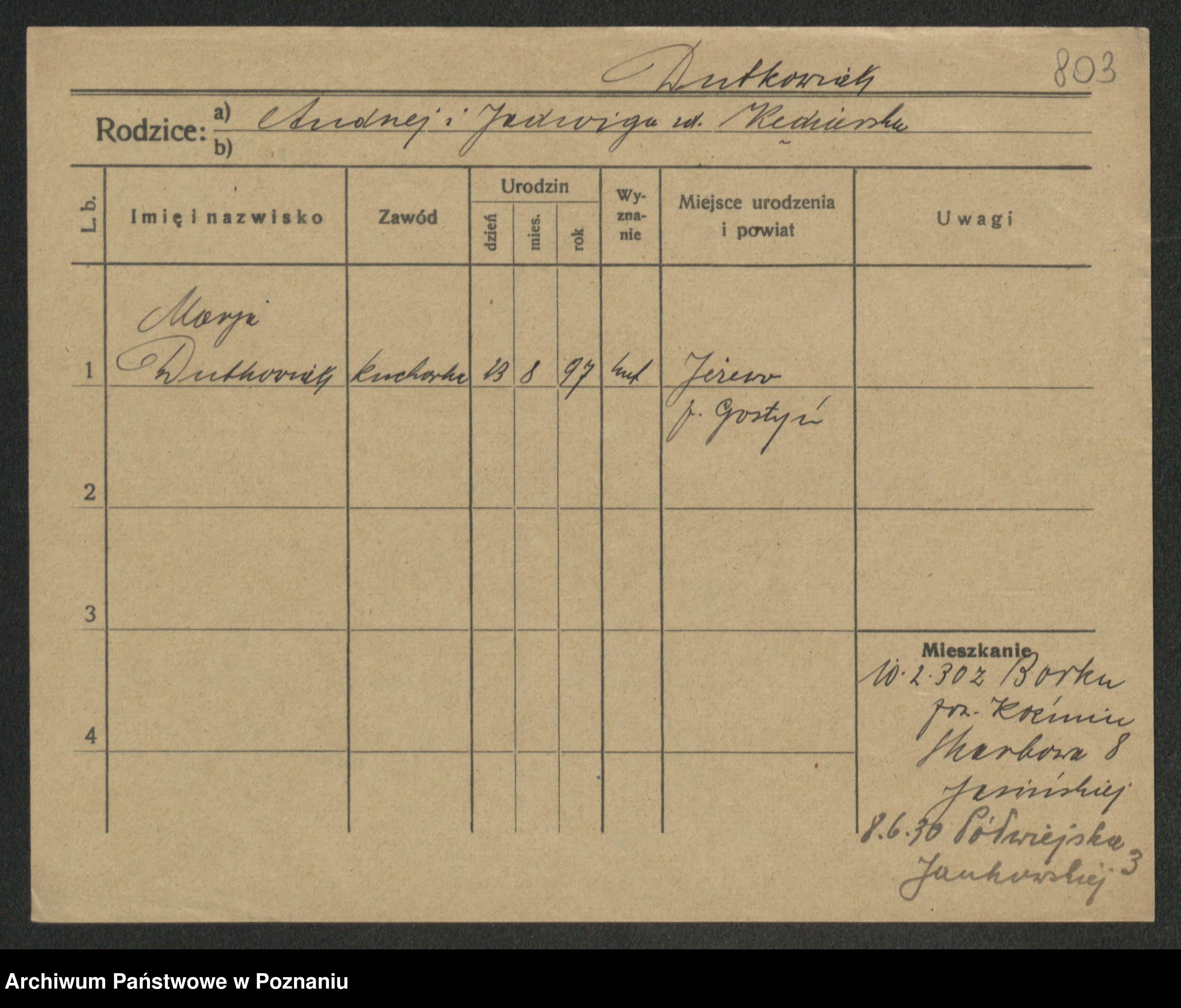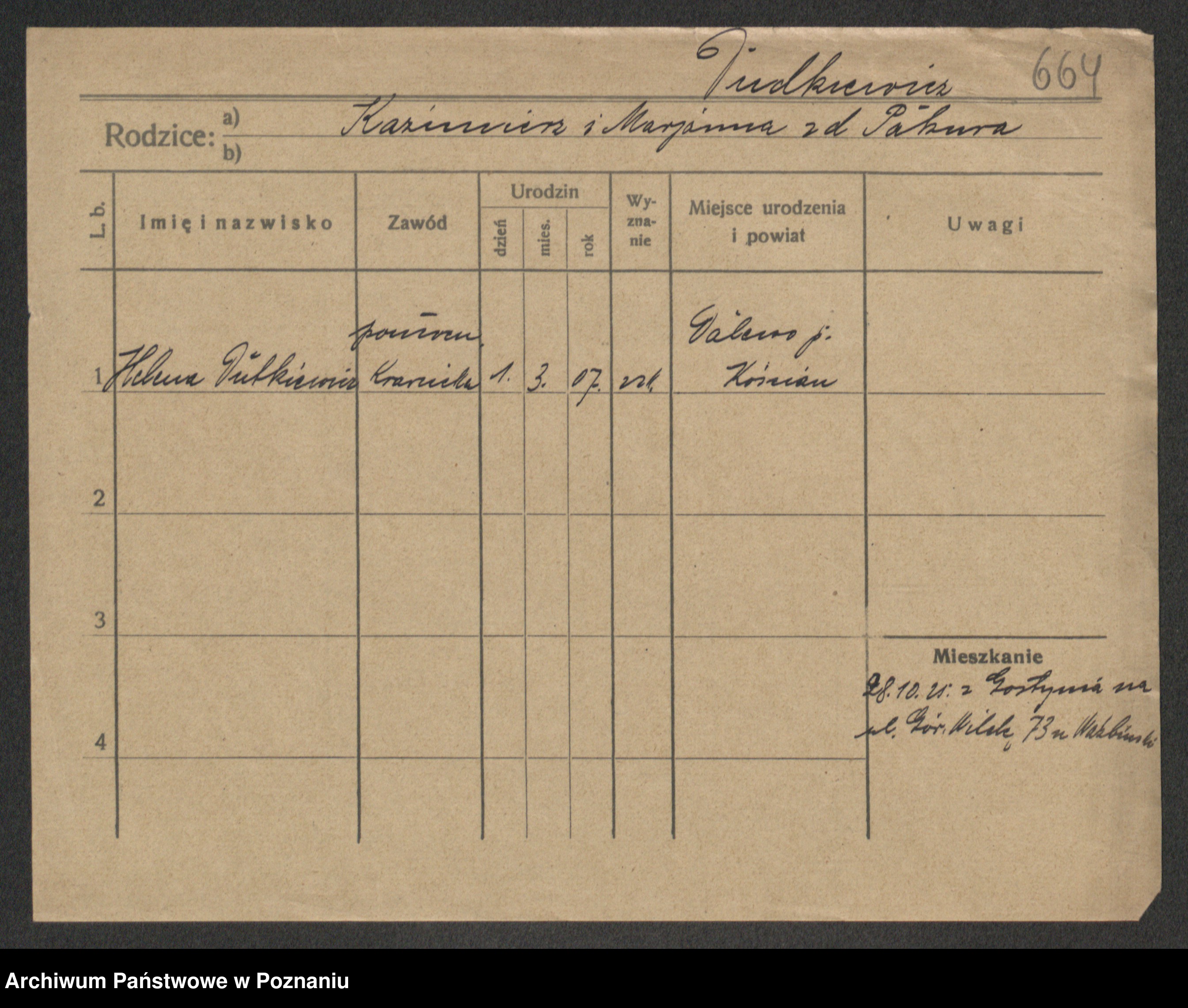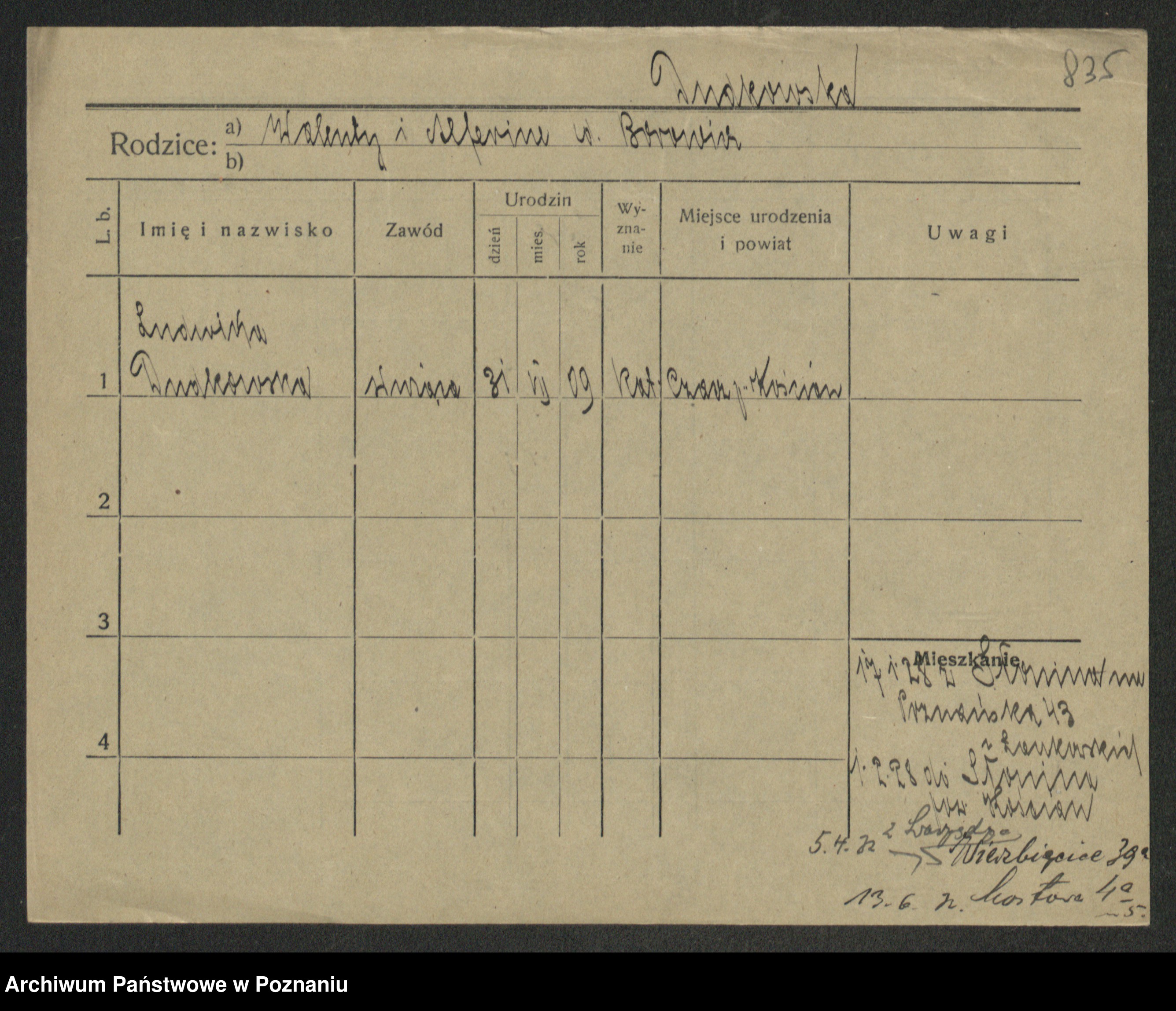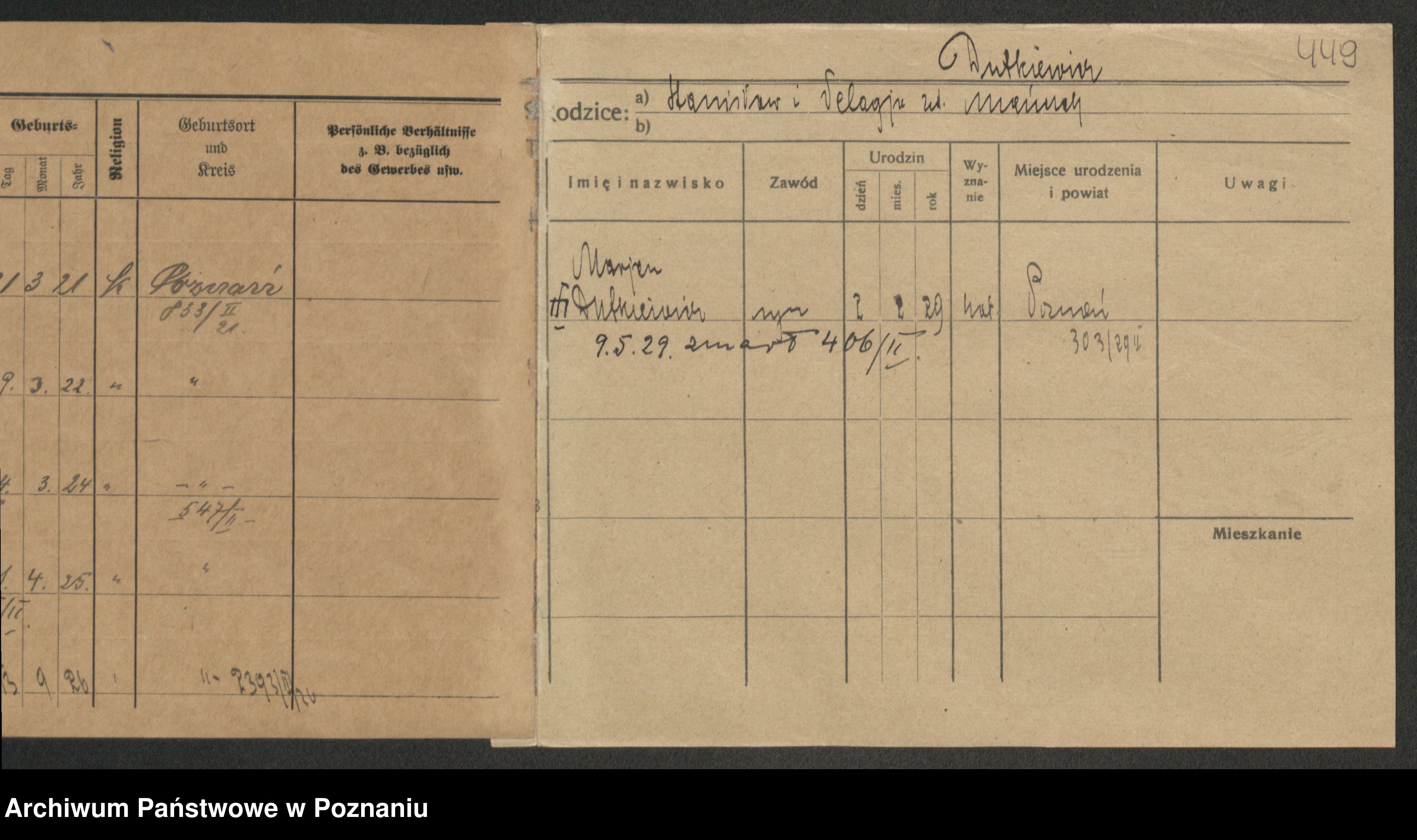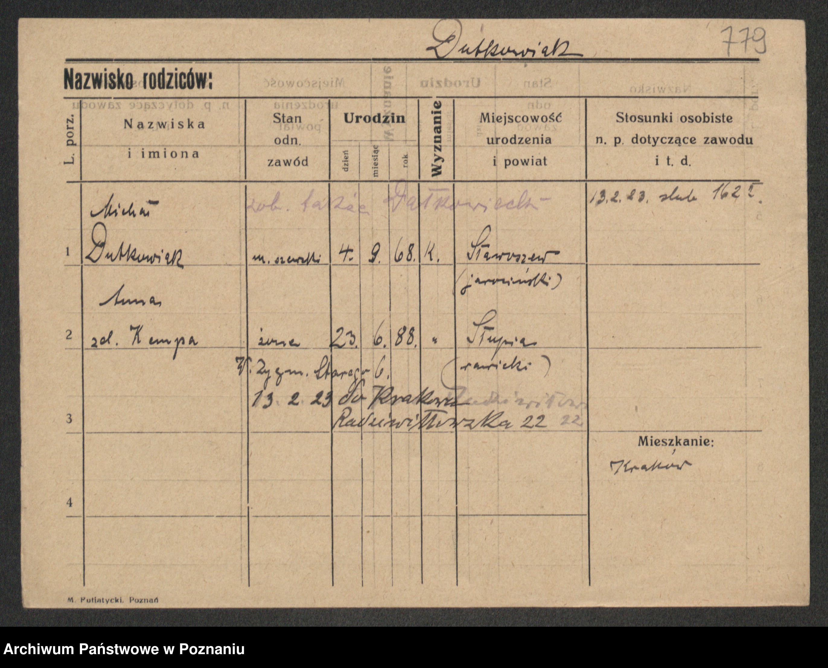 Podgląd karty osobowej dostępny jest po kliknięciu na nazwisko lub ikonkę karty. Można dokonywać powiększenia (ikony na górze) lub przechodzić między kolejnymi skanami (strzałki po bokach).
