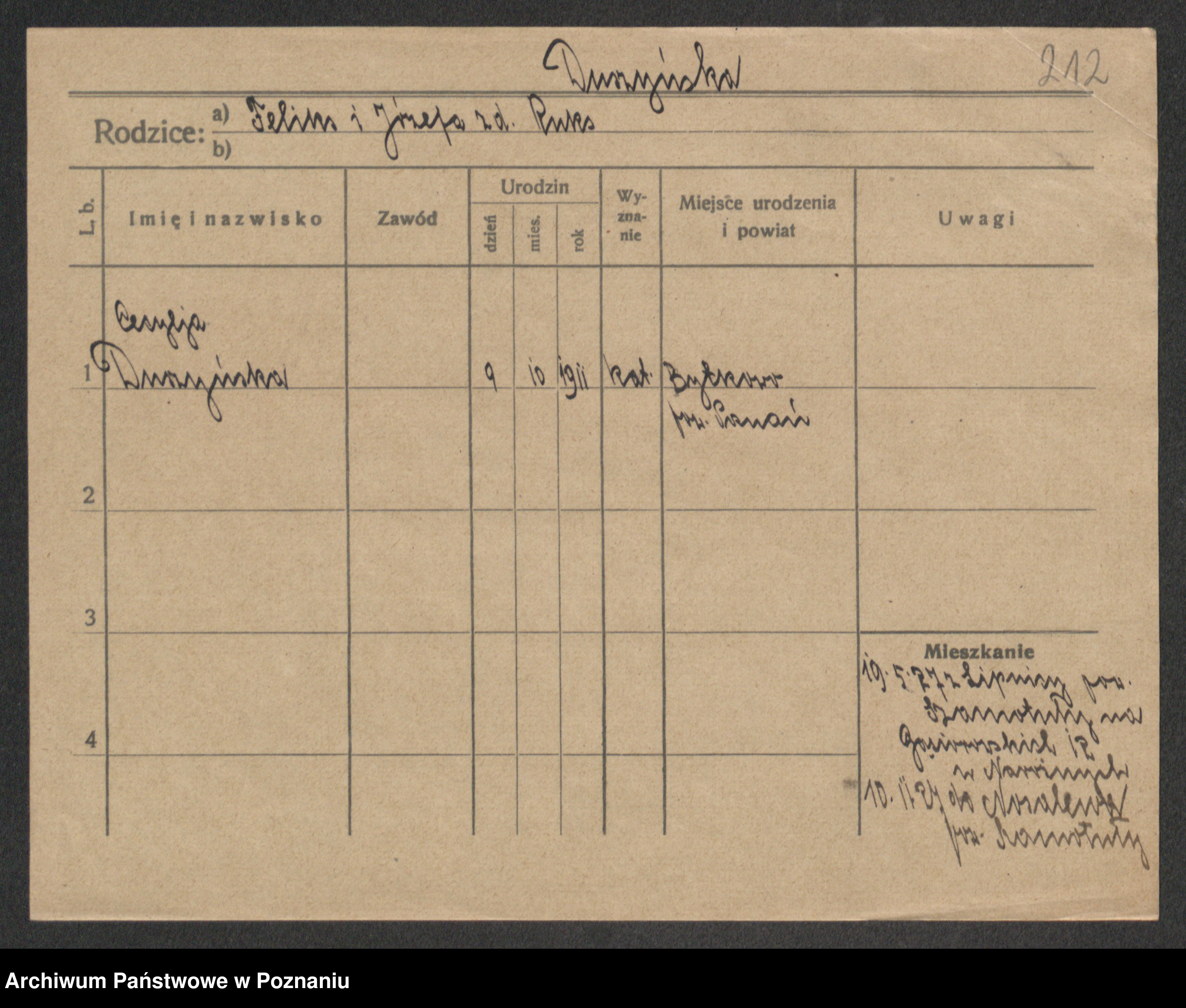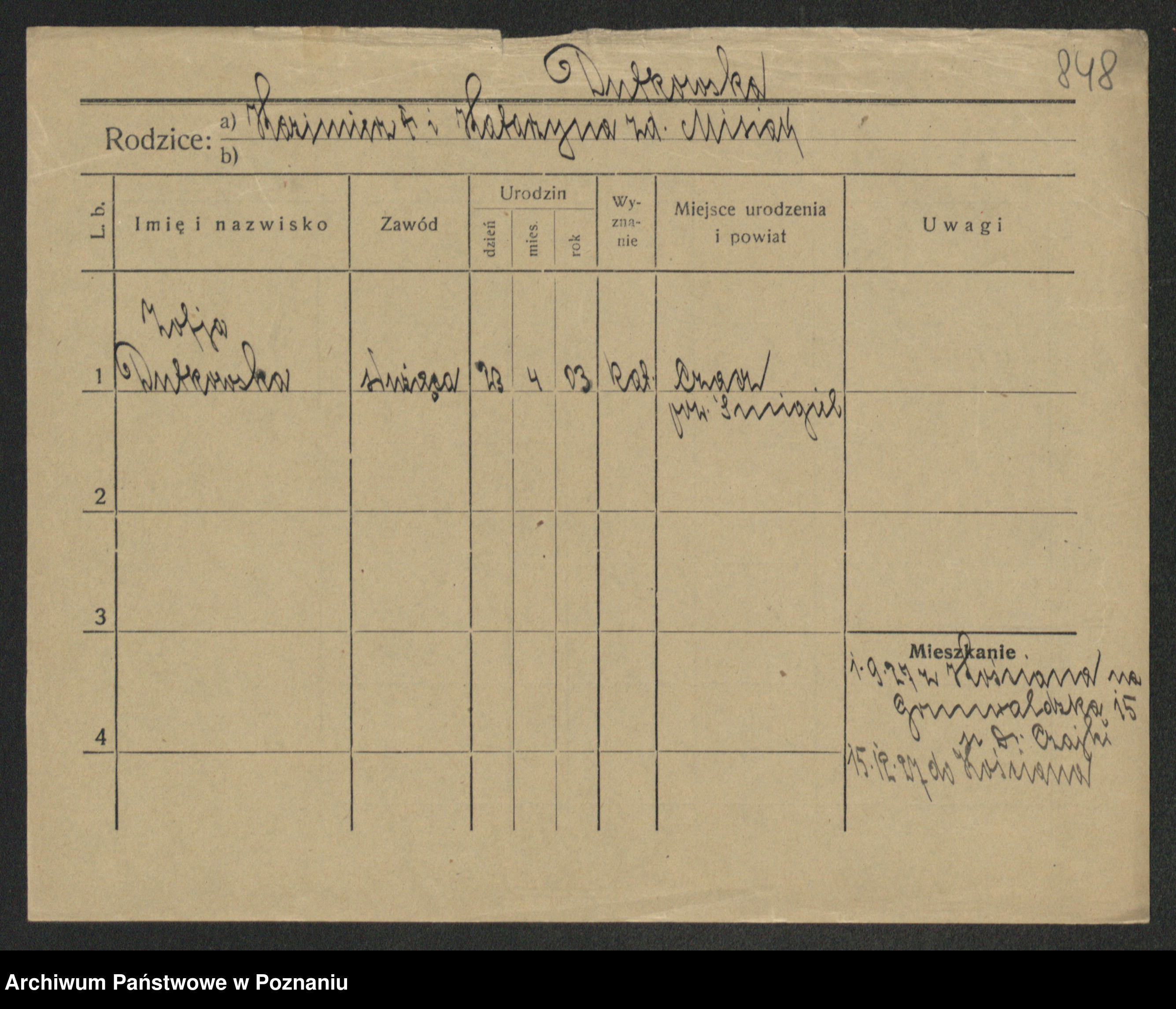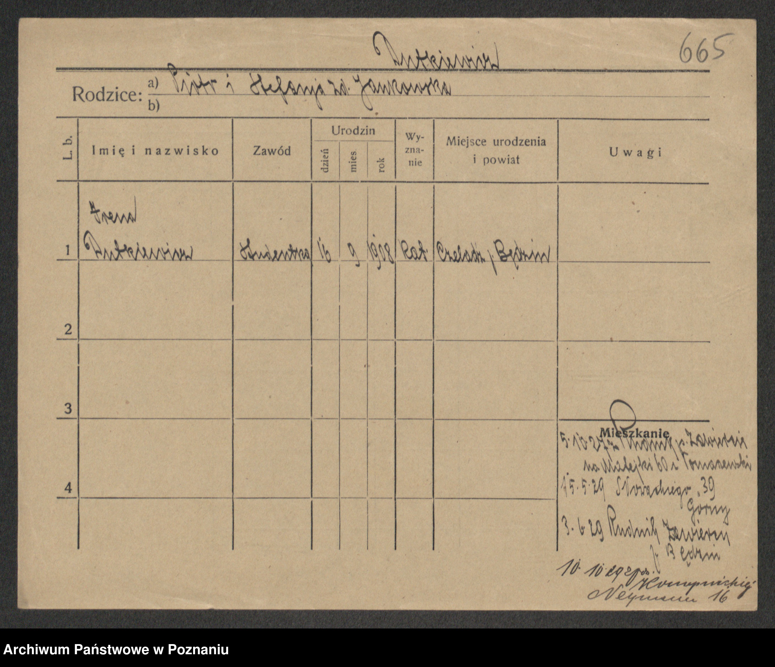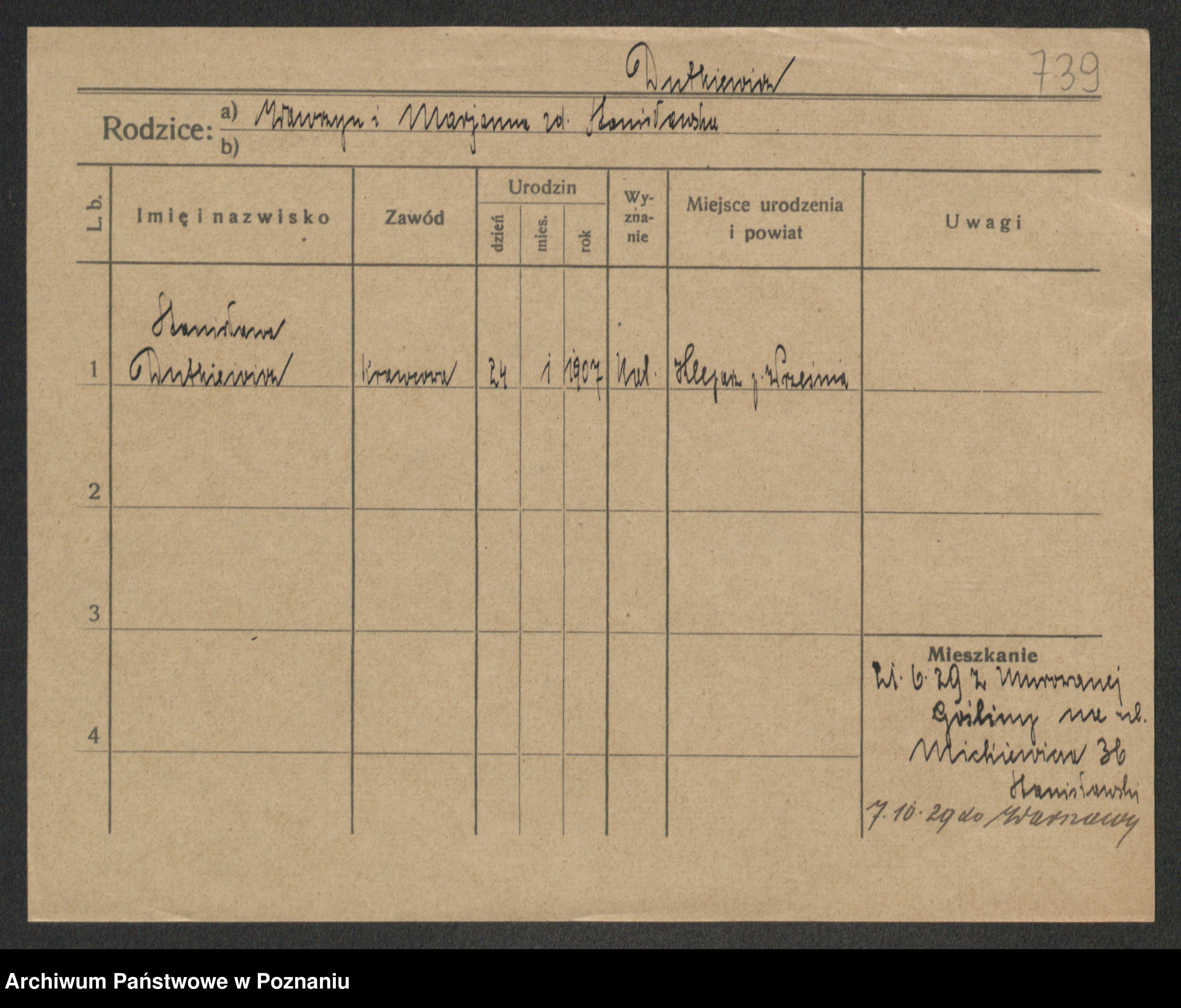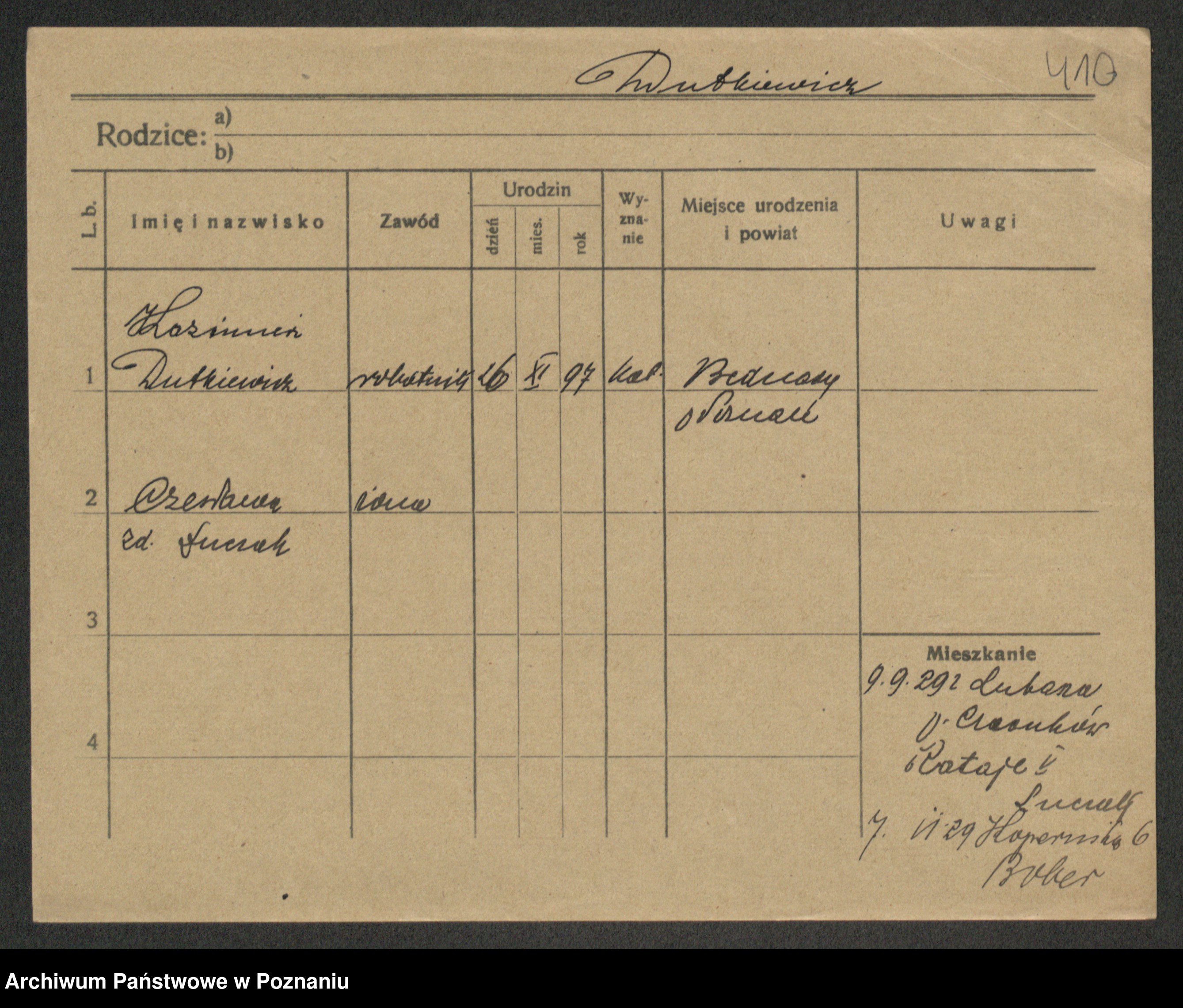 Podgląd karty osobowej dostępny jest po kliknięciu na nazwisko lub ikonkę karty. Można dokonywać powiększenia (ikony na górze) lub przechodzić między kolejnymi skanami (strzałki po bokach).