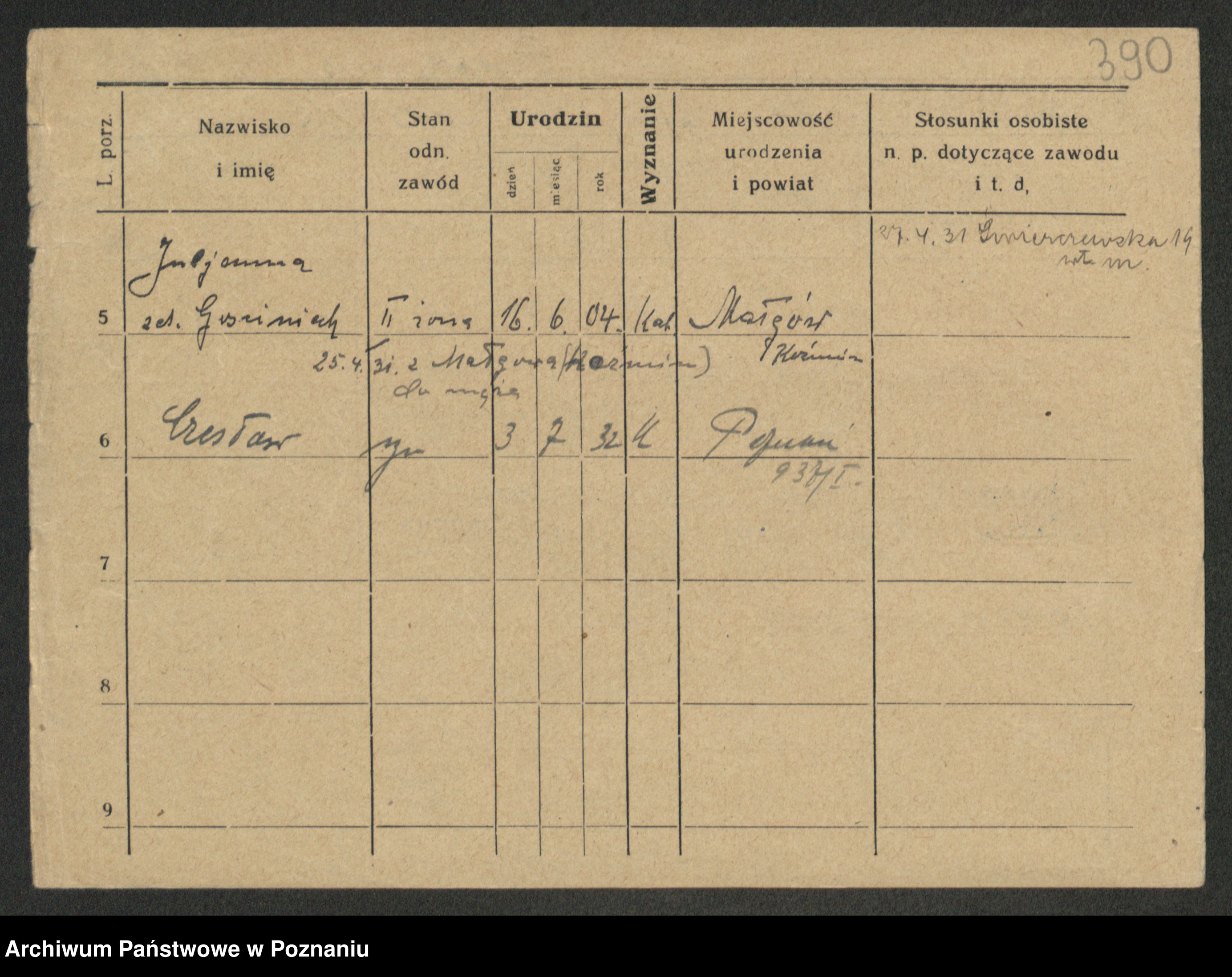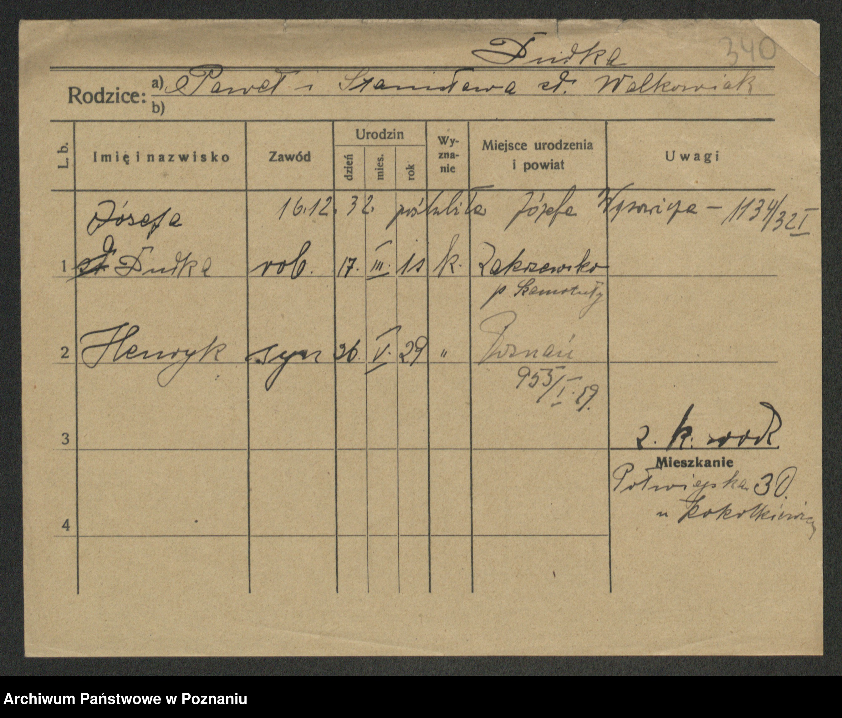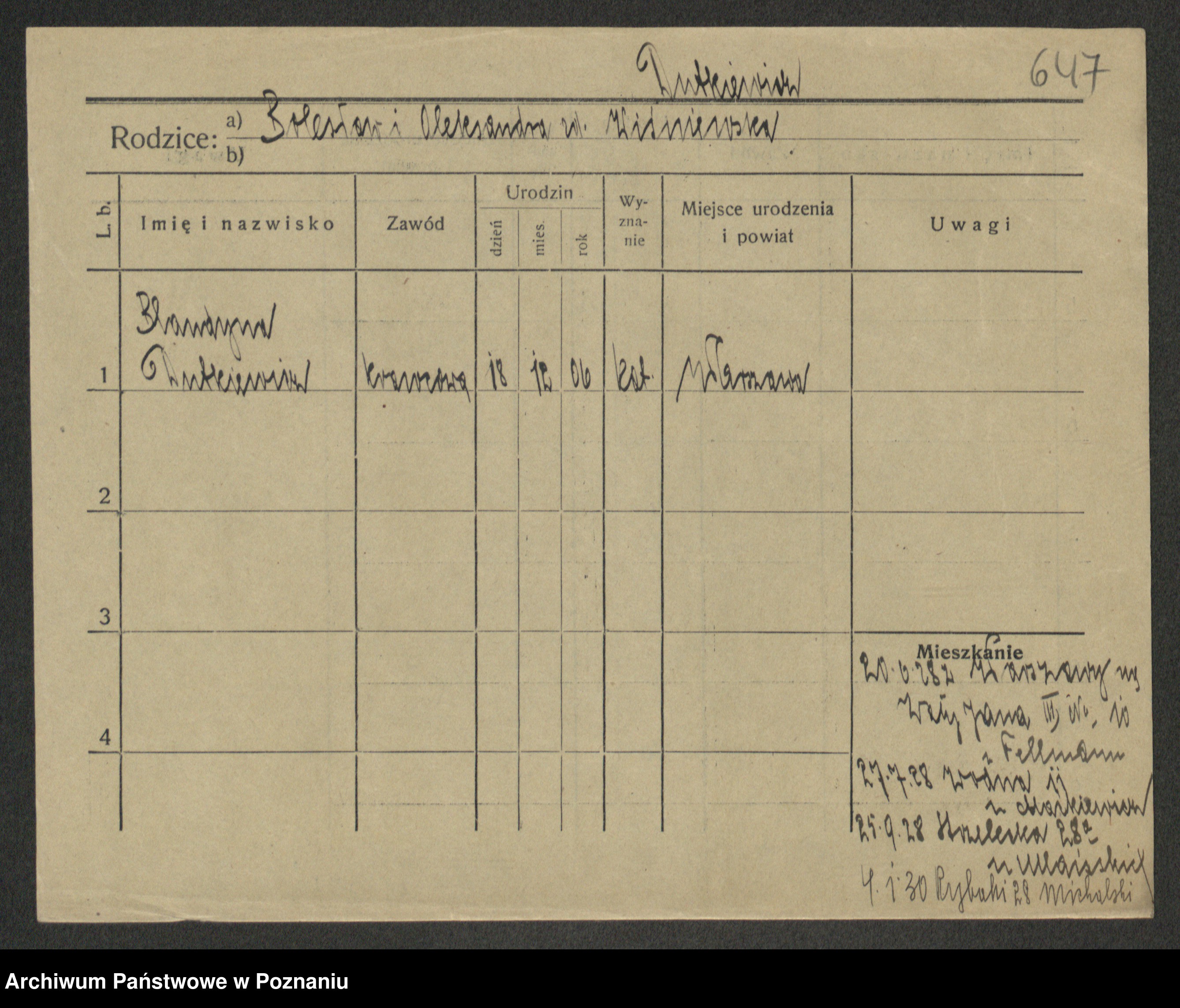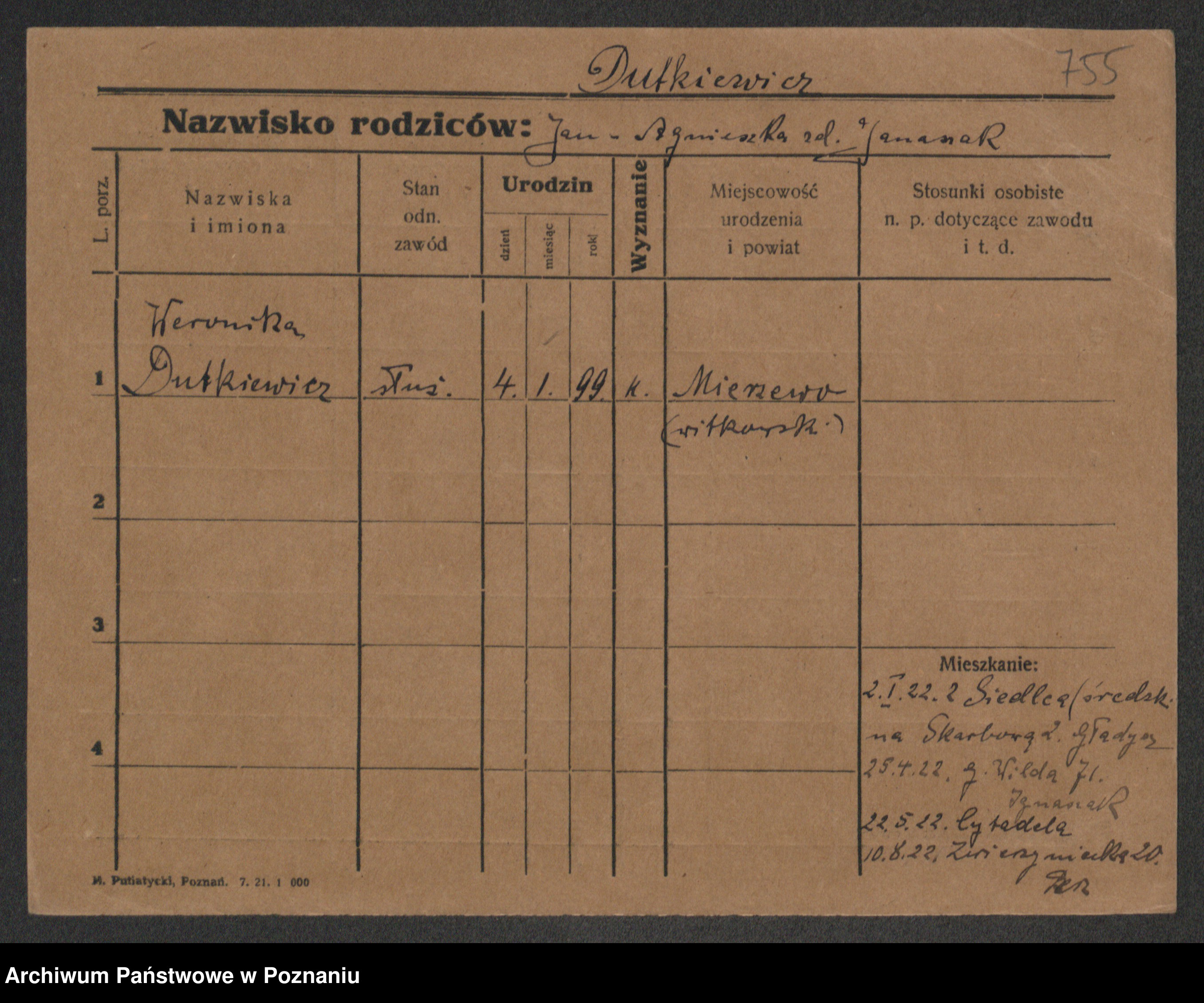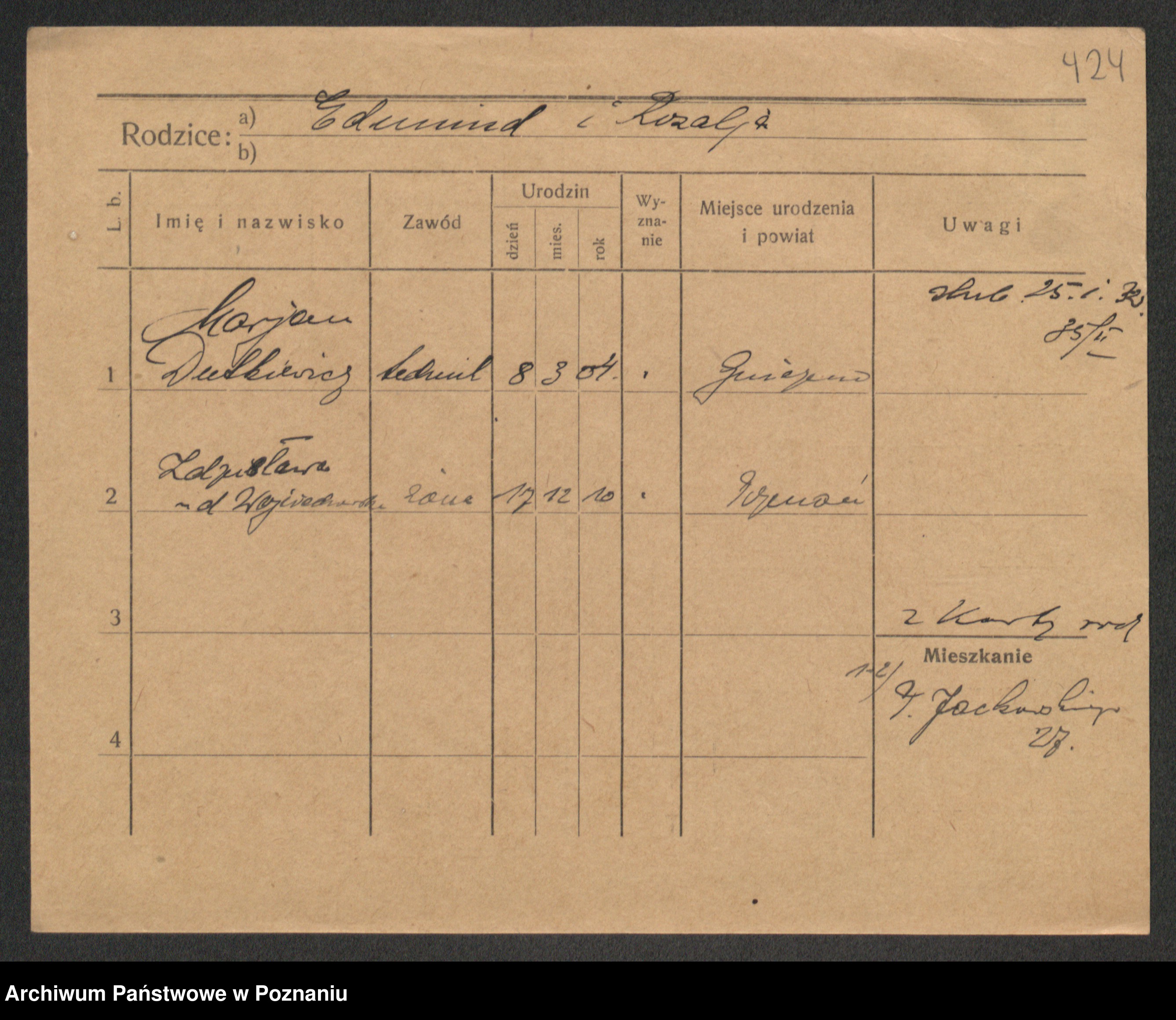Podgląd karty osobowej dostępny jest po kliknięciu na nazwisko lub ikonkę karty. Można dokonywać powiększenia (ikony na górze) lub przechodzić między kolejnymi skanami (strzałki po bokach).