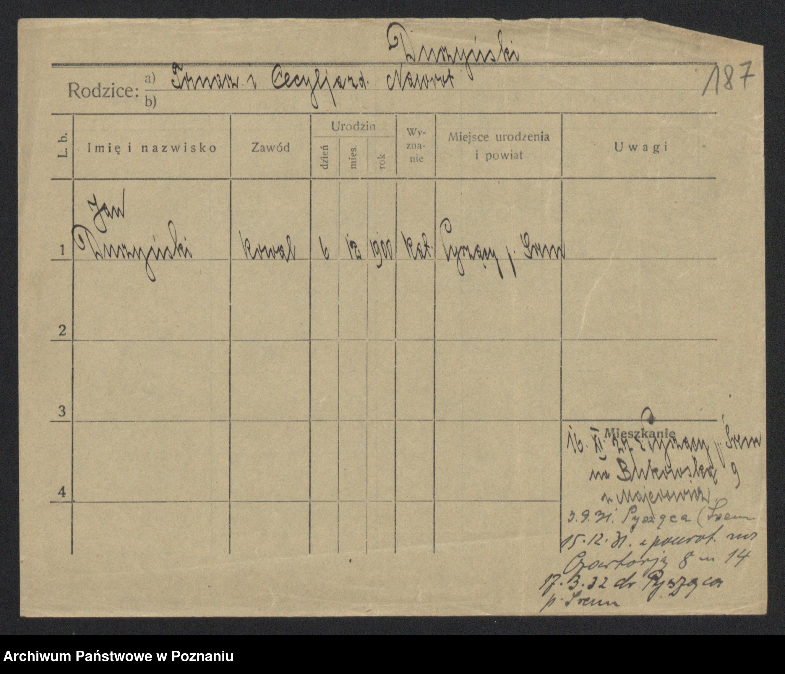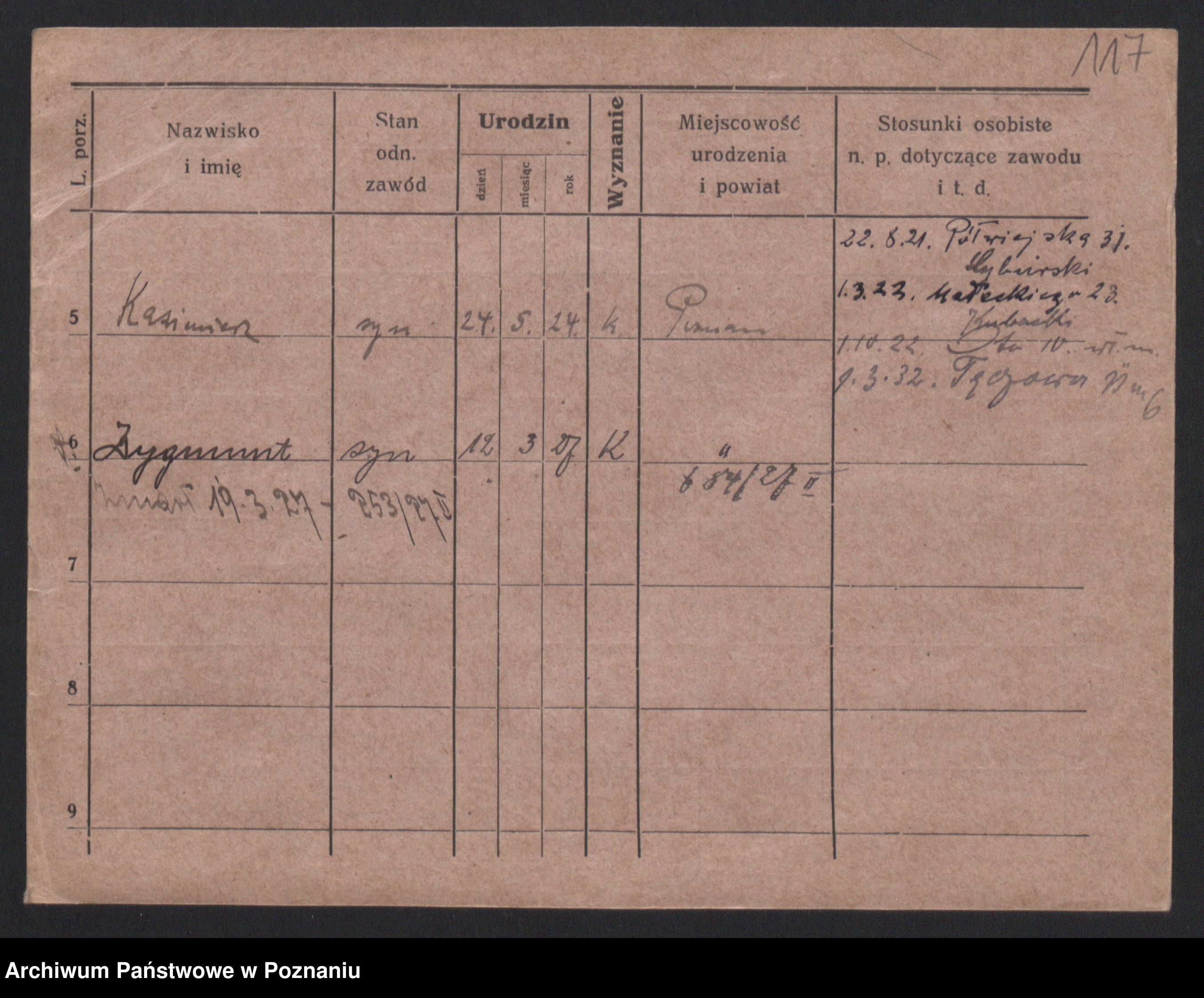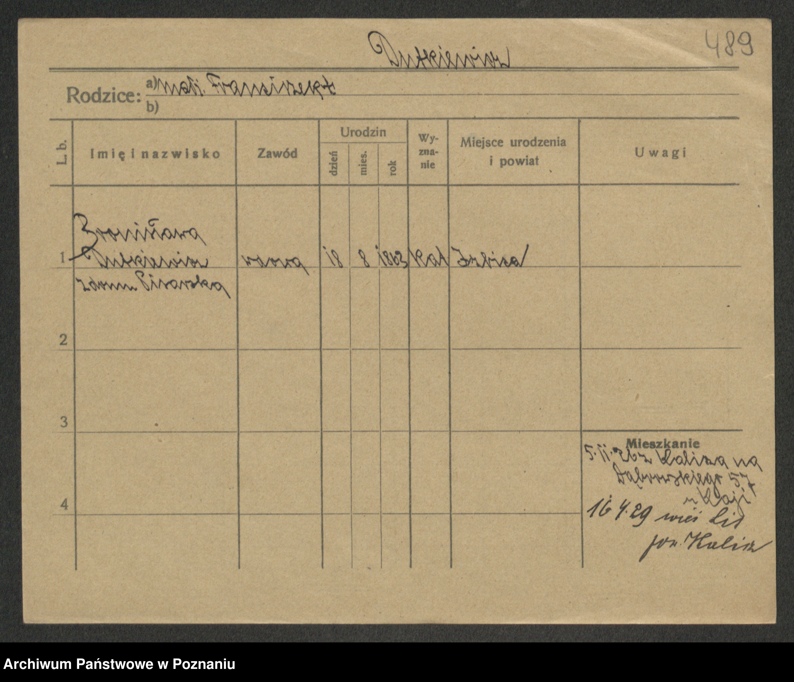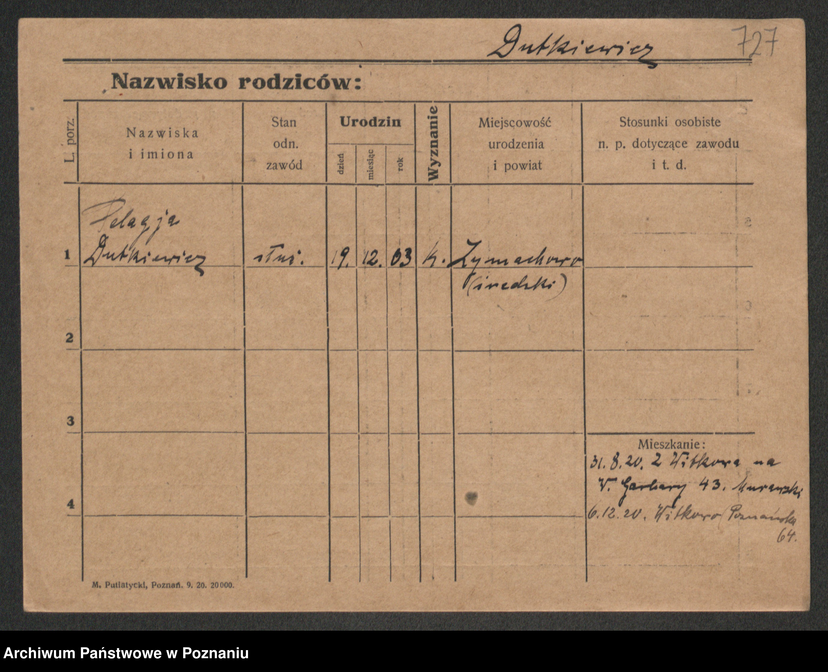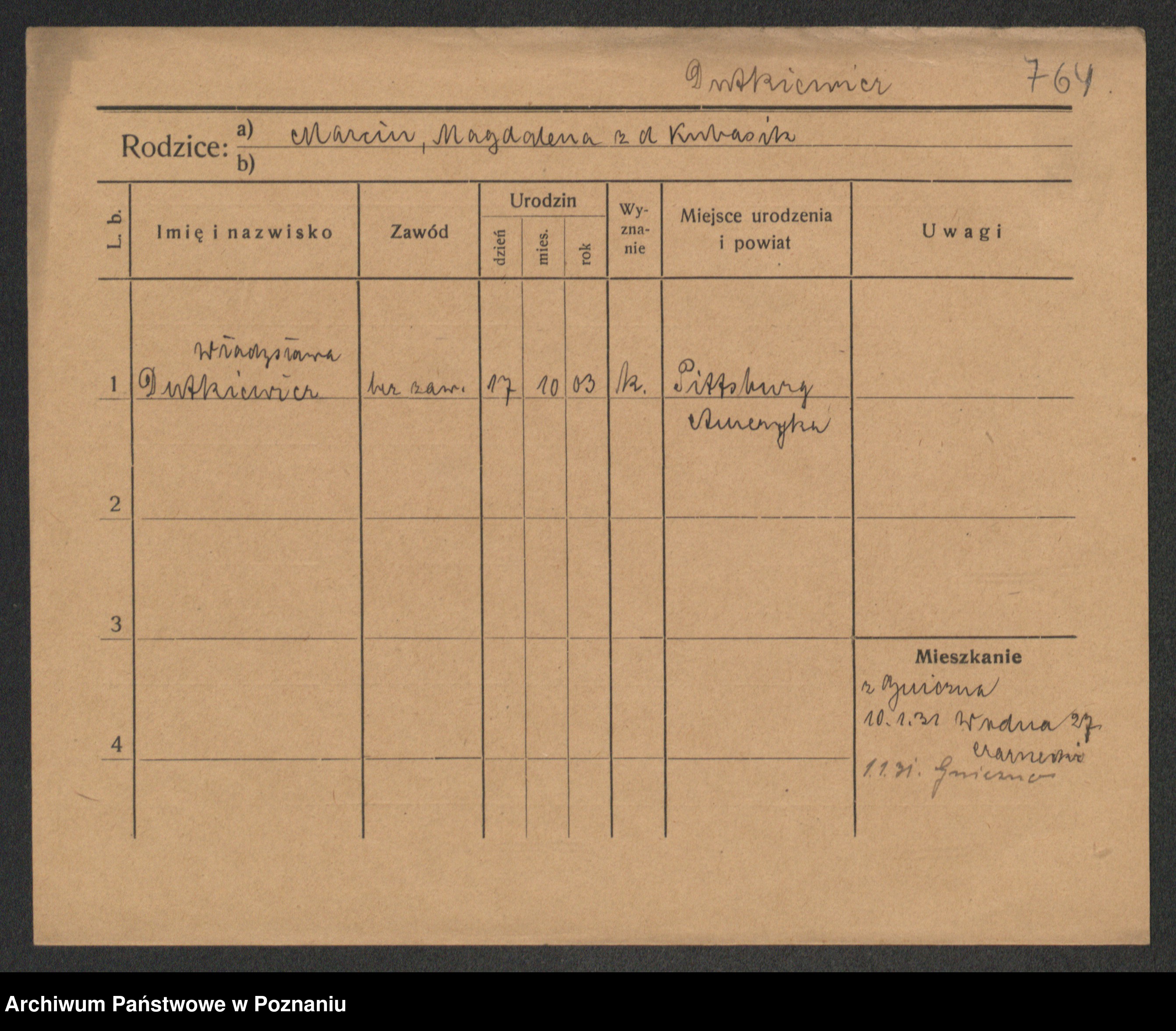 Podgląd karty osobowej dostępny jest po kliknięciu na nazwisko lub ikonkę karty. Można dokonywać powiększenia (ikony na górze) lub przechodzić między kolejnymi skanami (strzałki po bokach).
