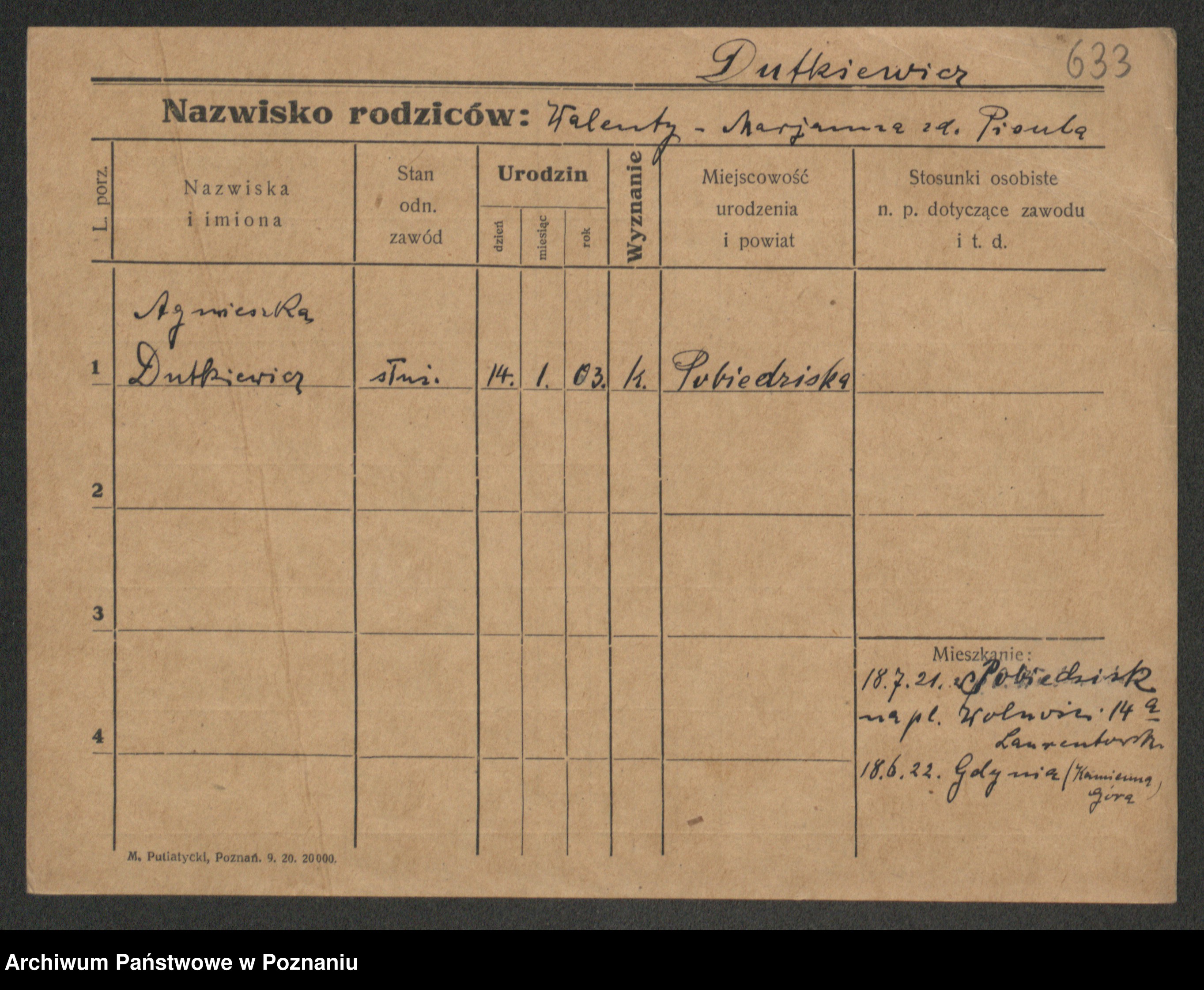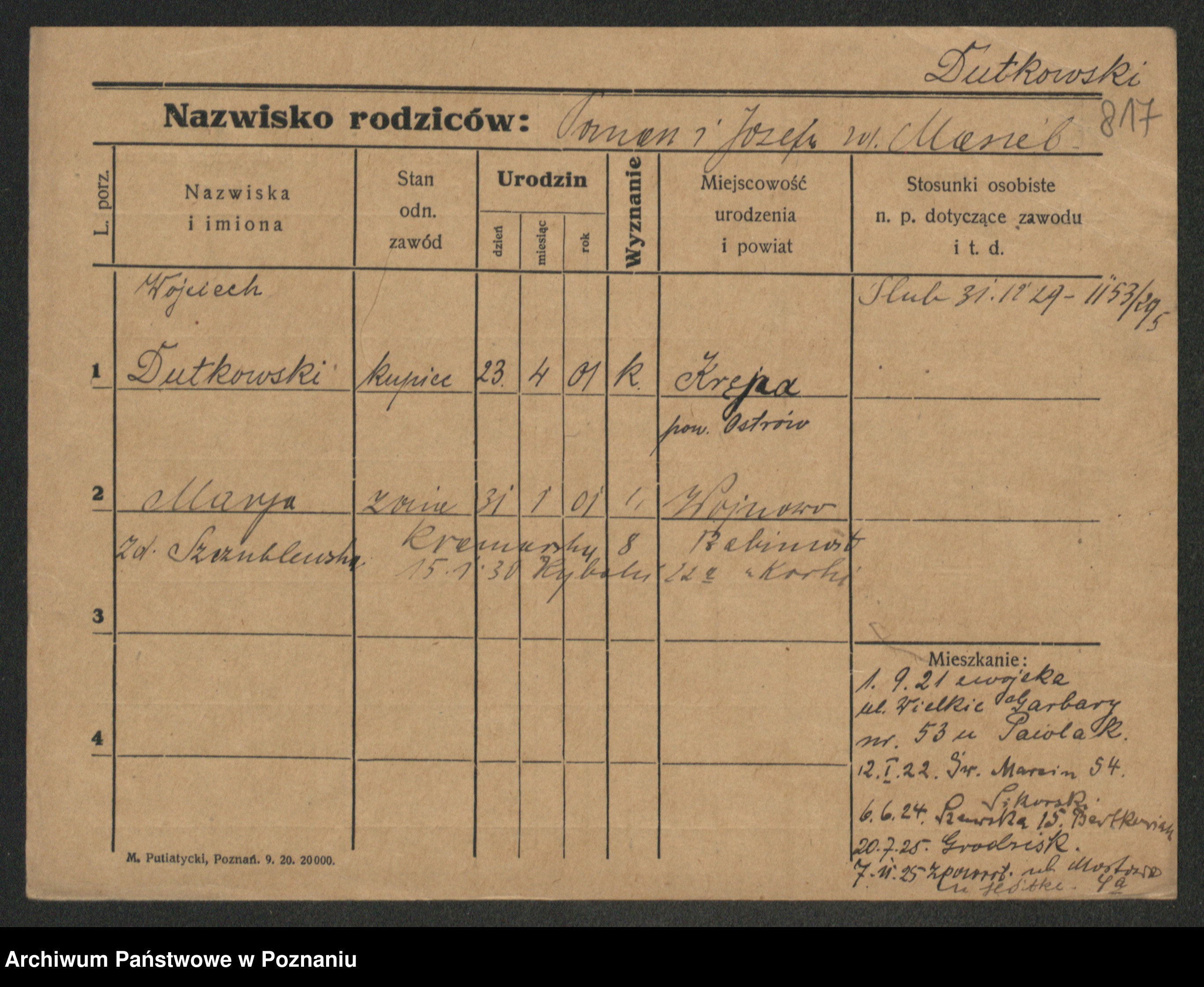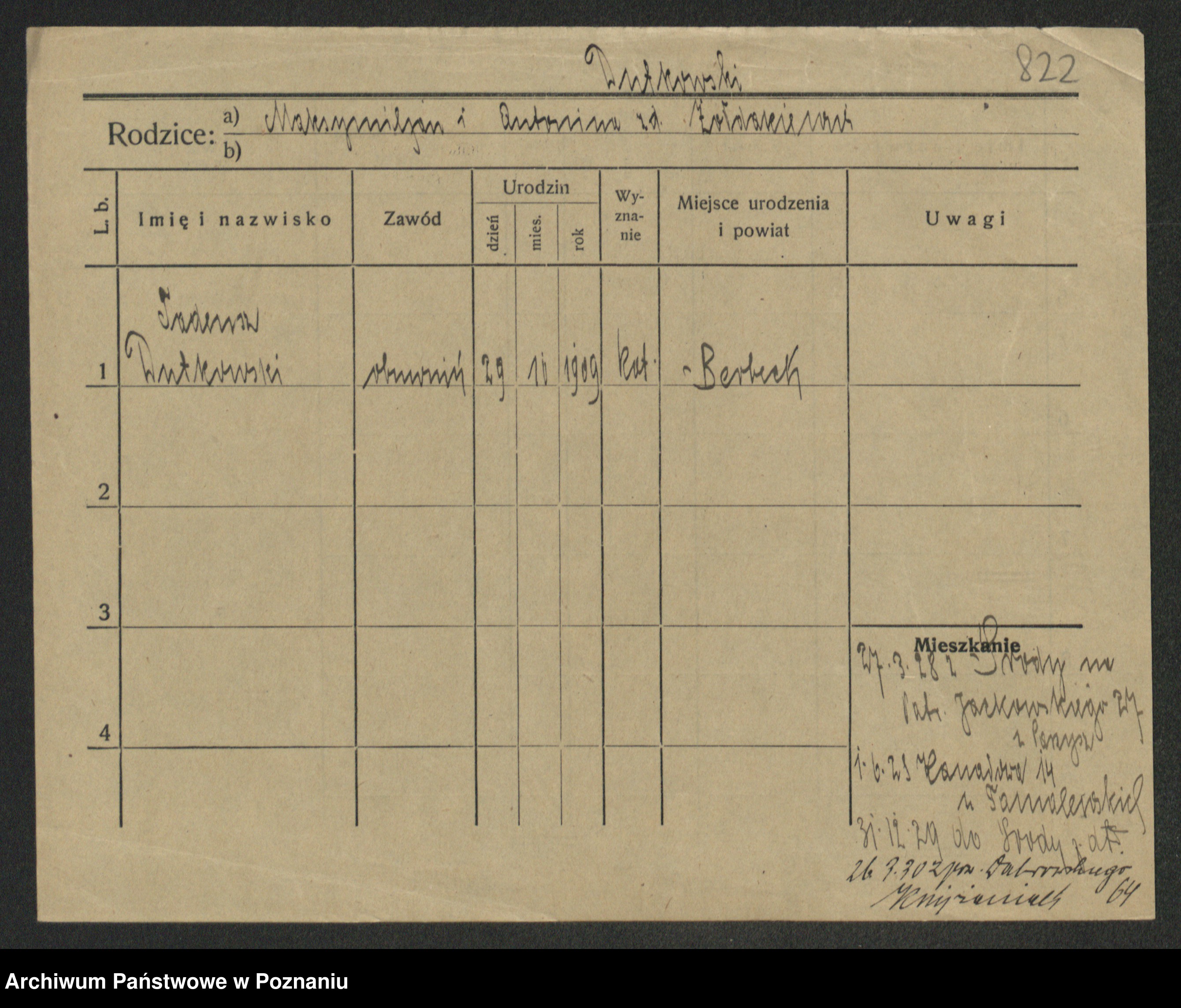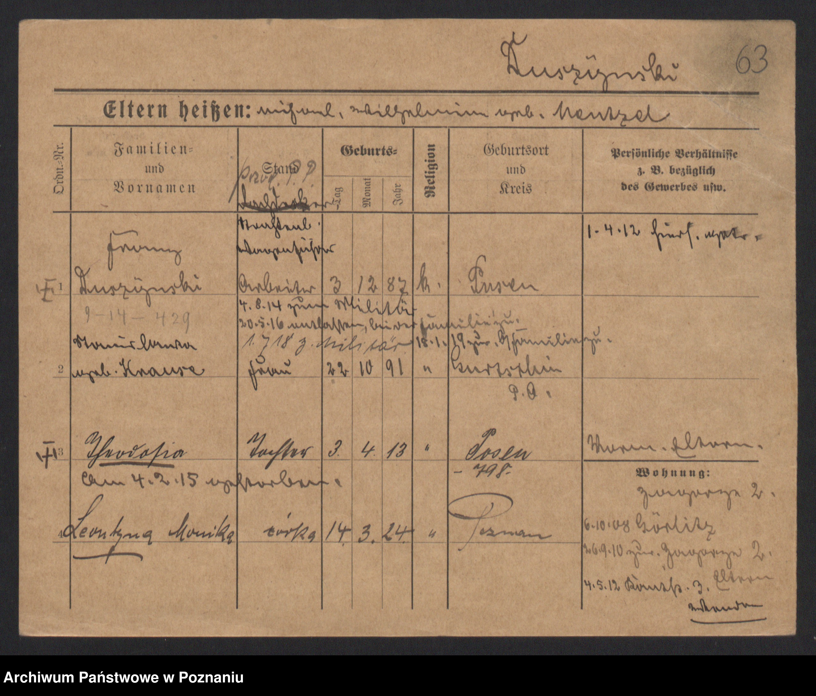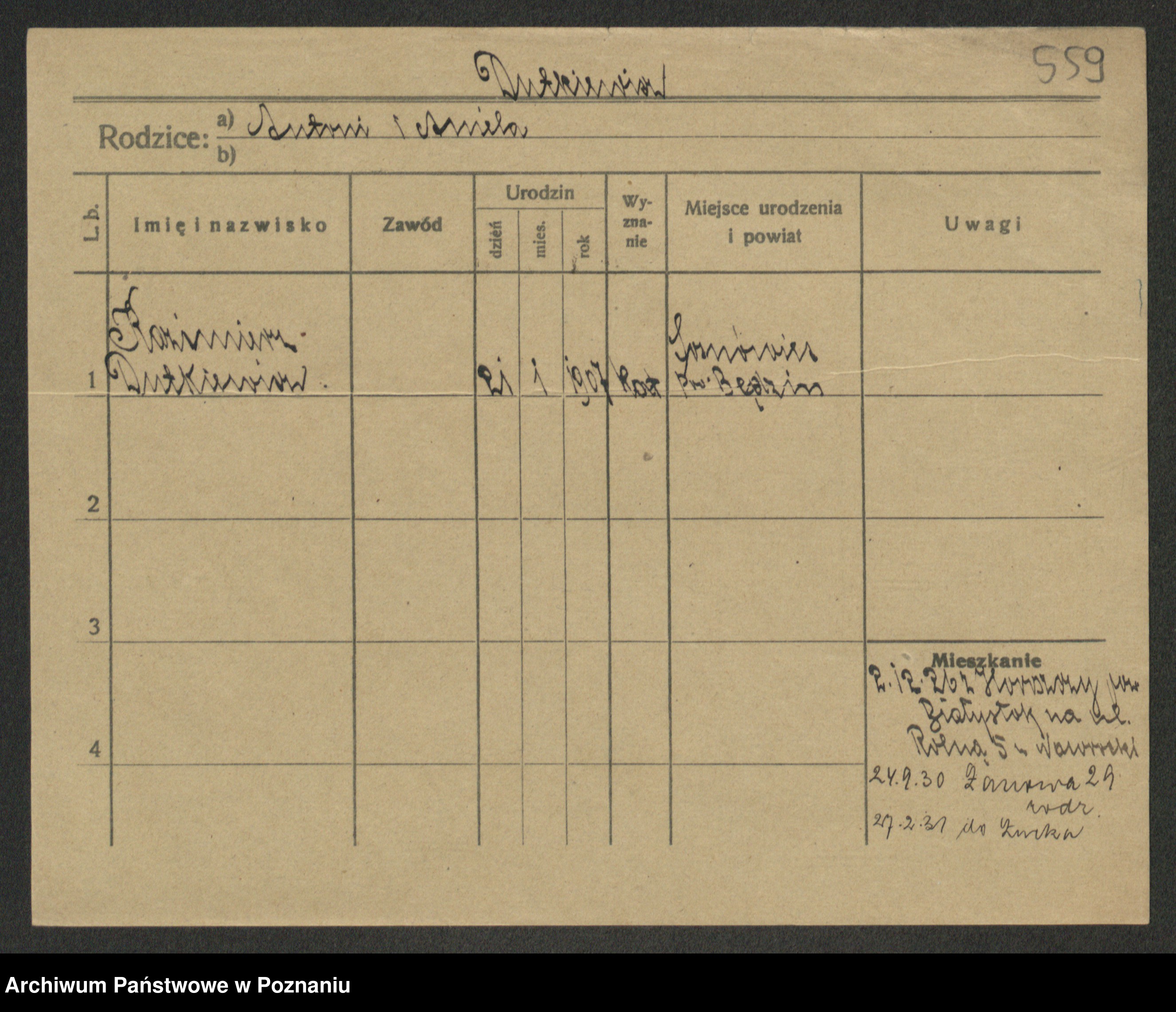 Podgląd karty osobowej dostępny jest po kliknięciu na nazwisko lub ikonkę karty. Można dokonywać powiększenia (ikony na górze) lub przechodzić między kolejnymi skanami (strzałki po bokach).