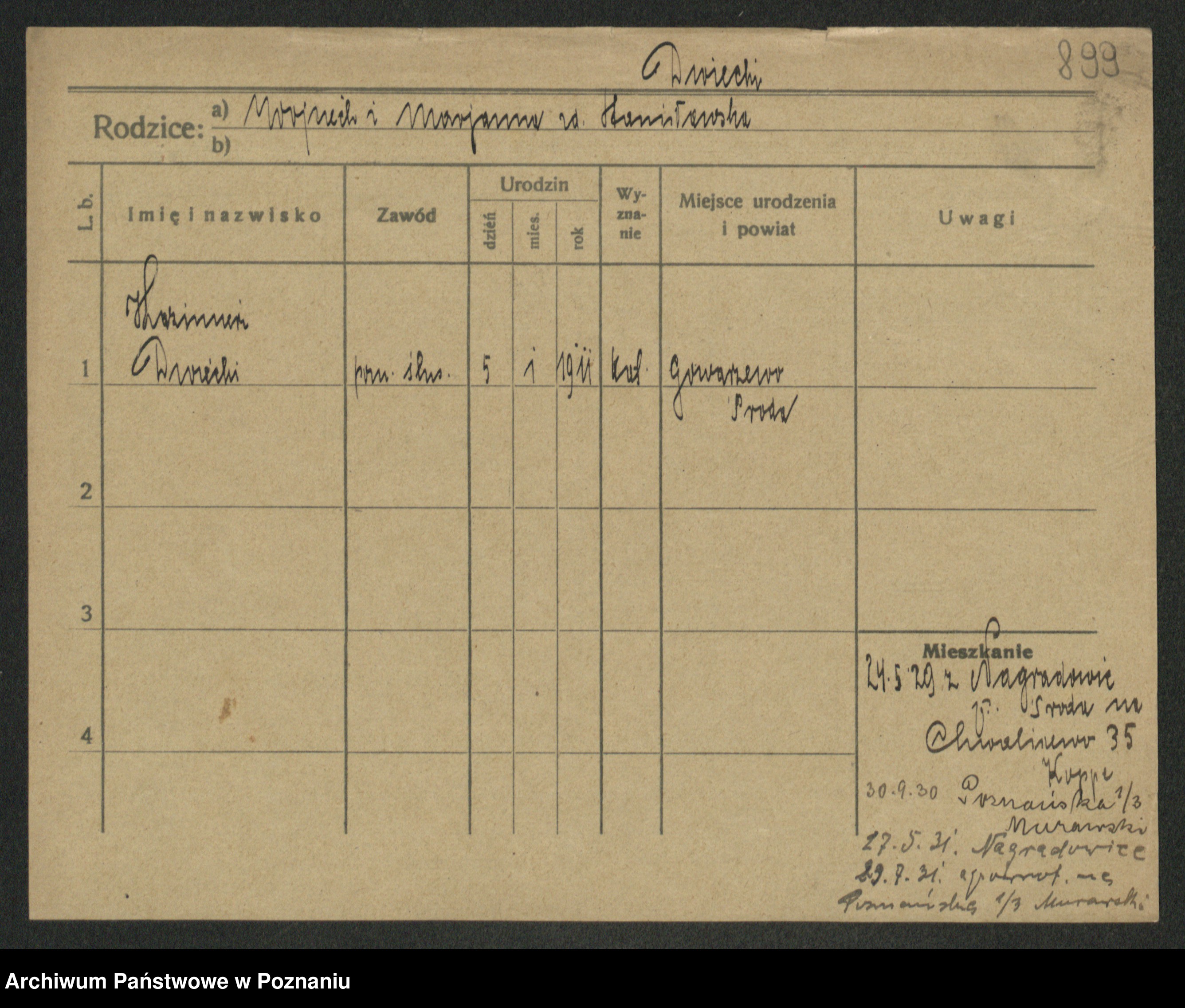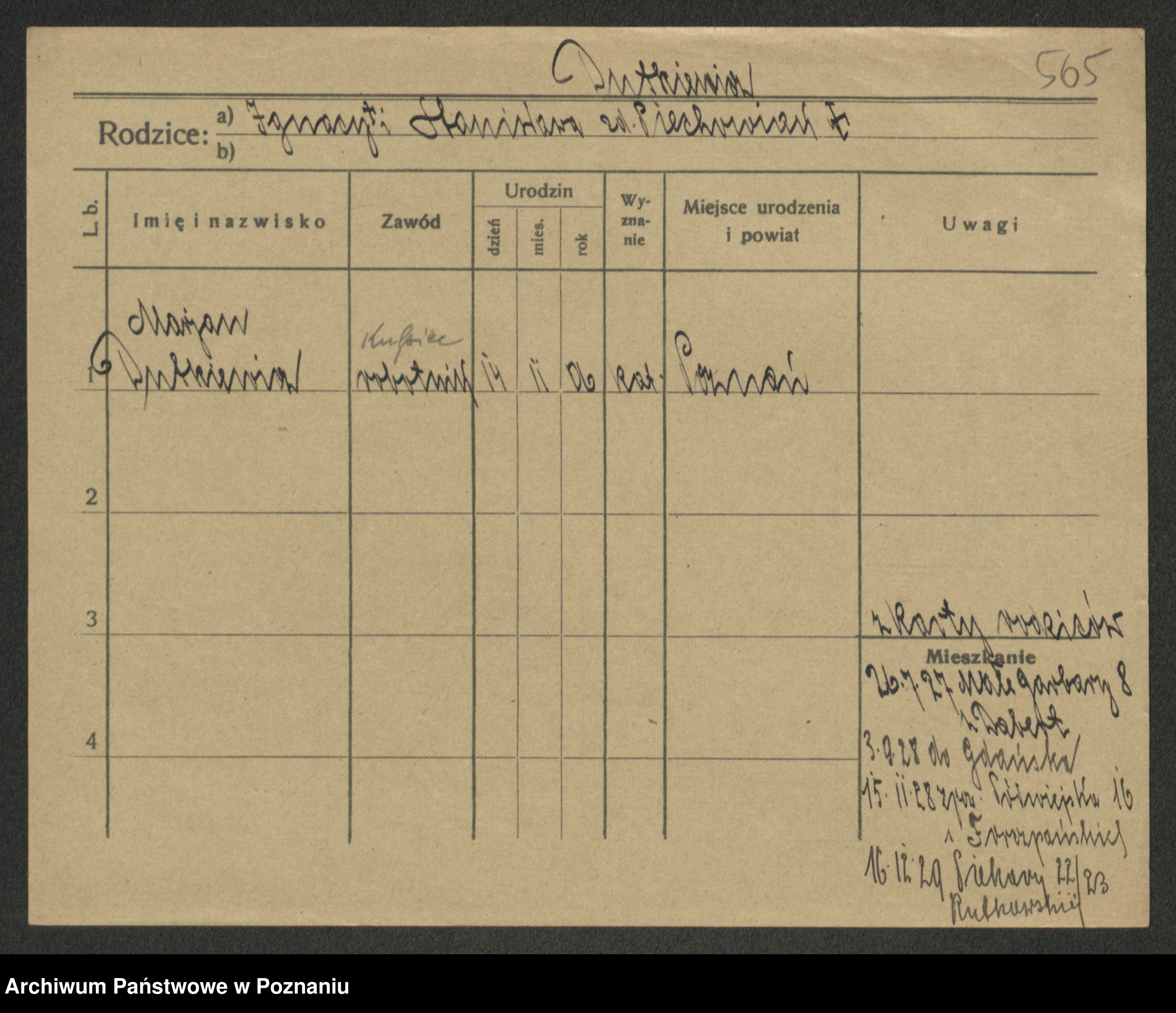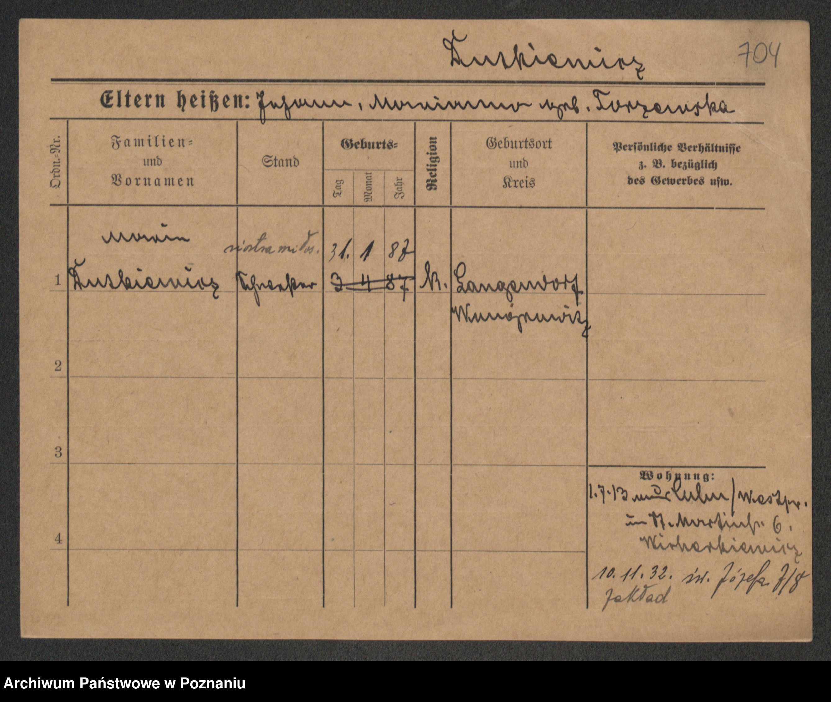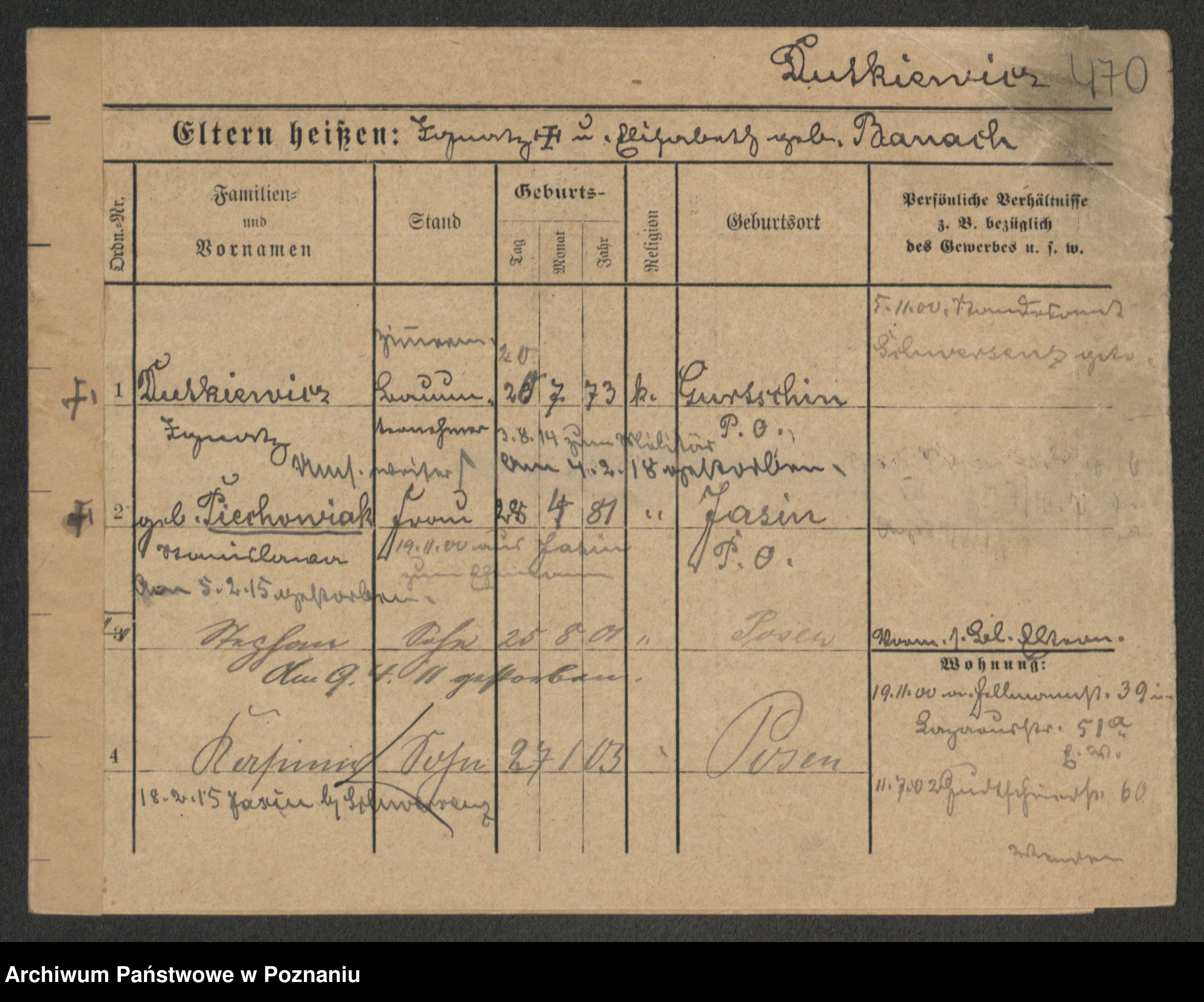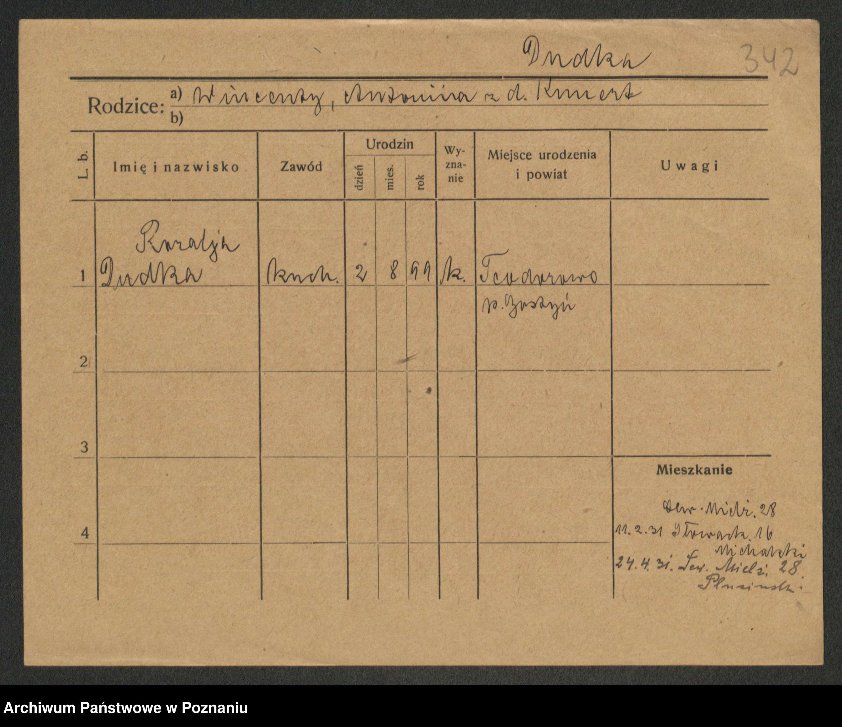 Podgląd karty osobowej dostępny jest po kliknięciu na nazwisko lub ikonkę karty. Można dokonywać powiększenia (ikony na górze) lub przechodzić między kolejnymi skanami (strzałki po bokach).