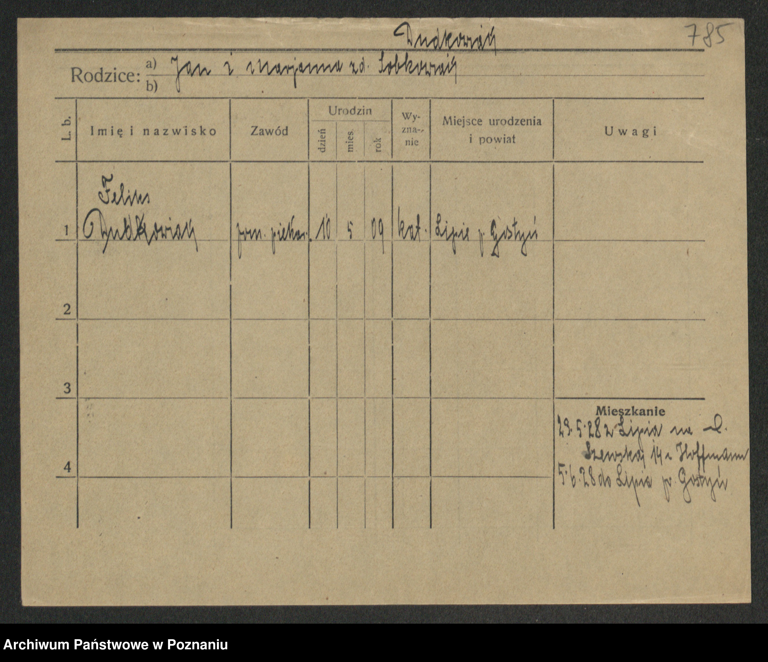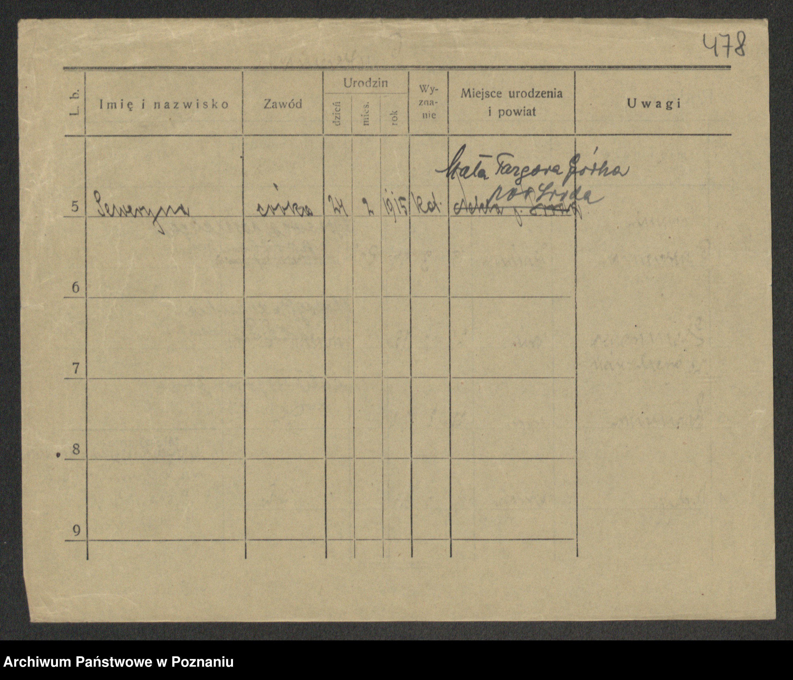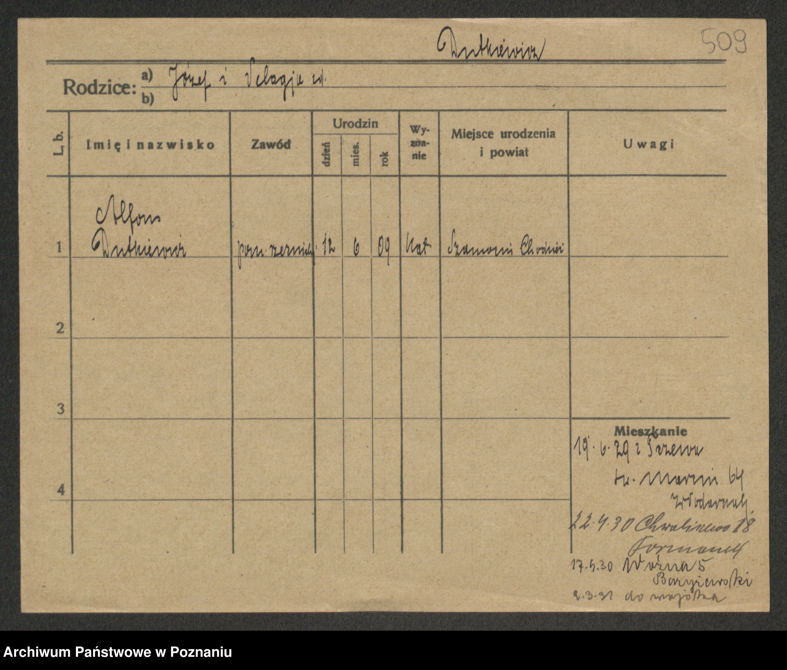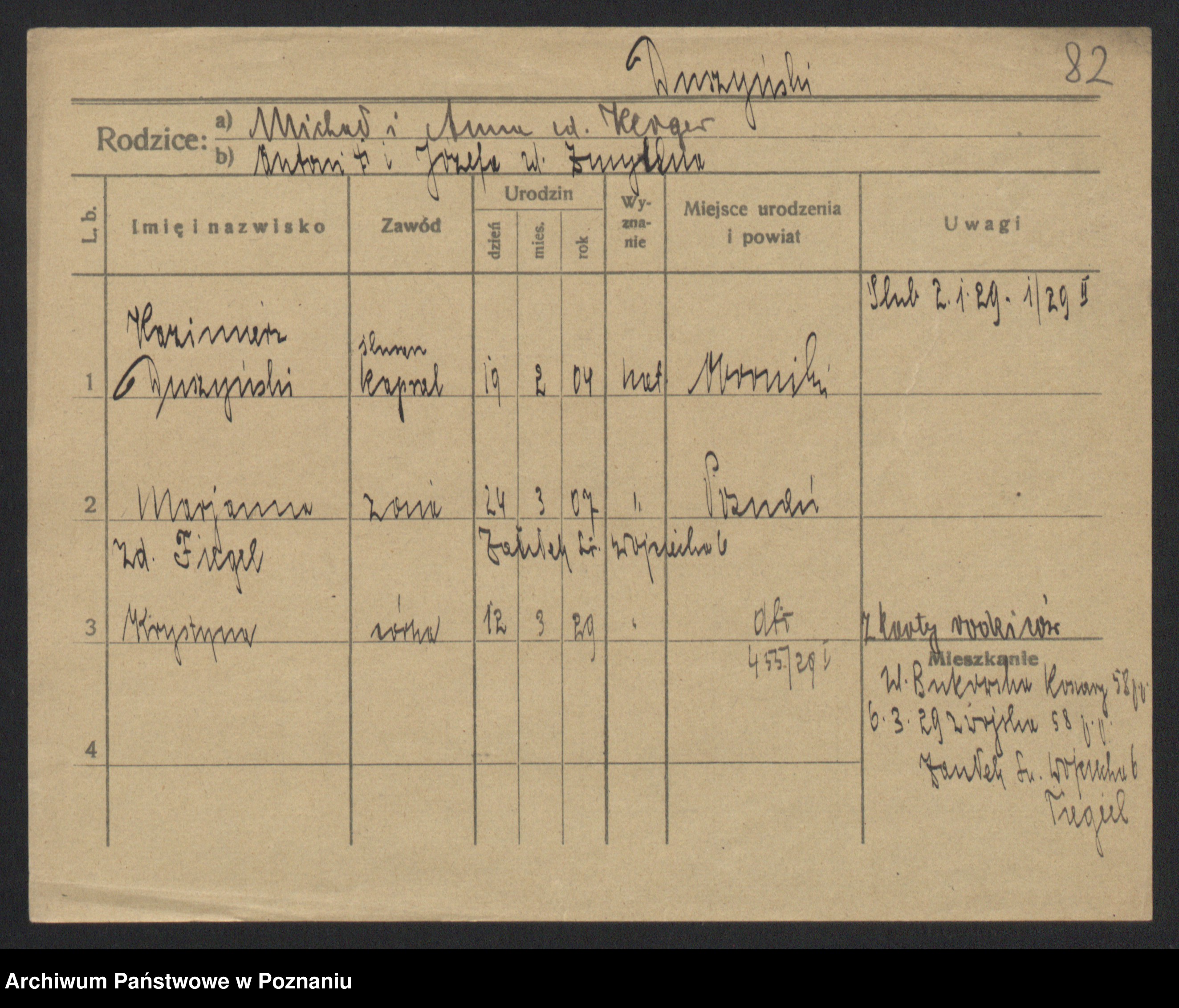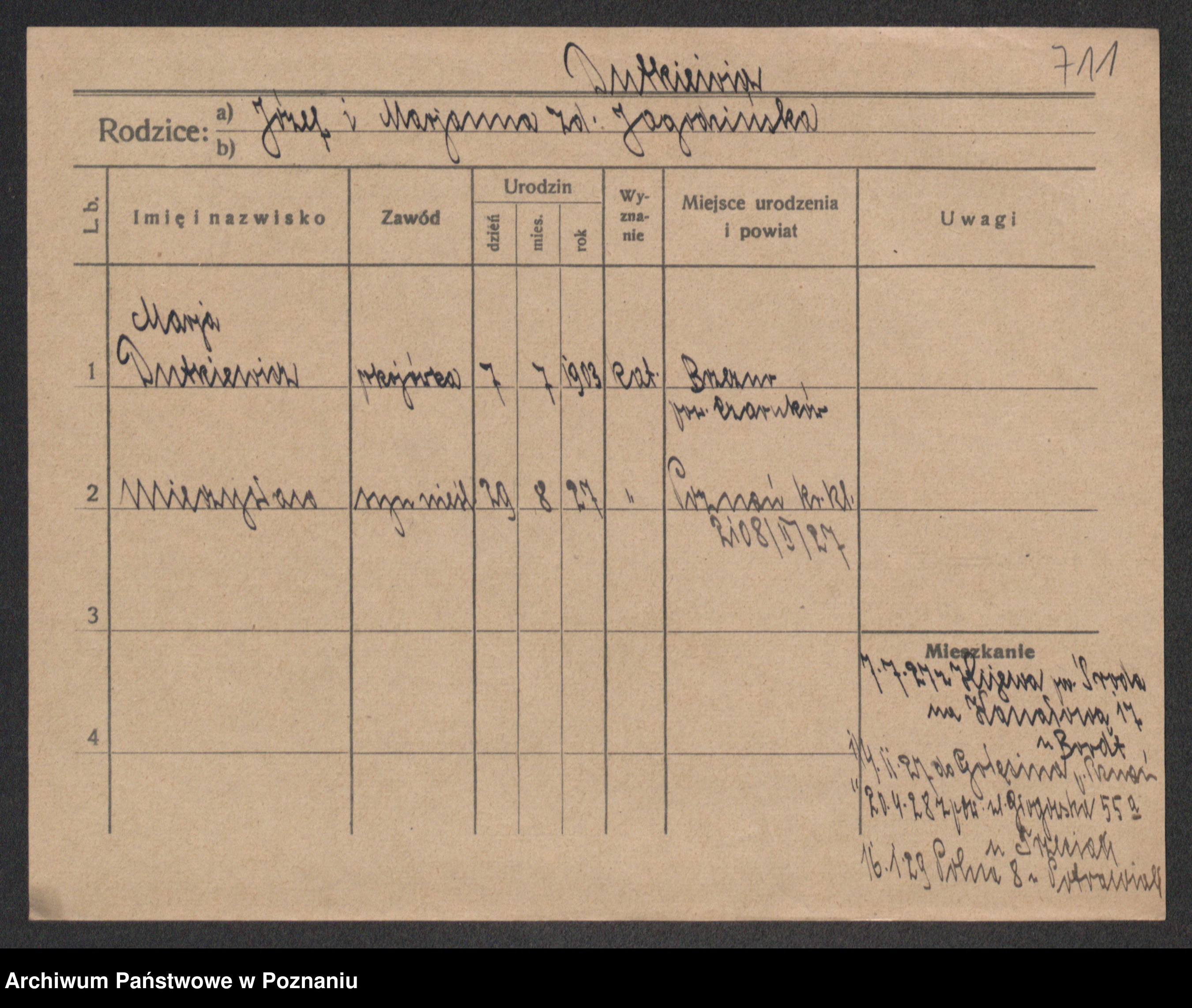 Podgląd karty osobowej dostępny jest po kliknięciu na nazwisko lub ikonkę karty. Można dokonywać powiększenia (ikony na górze) lub przechodzić między kolejnymi skanami (strzałki po bokach).