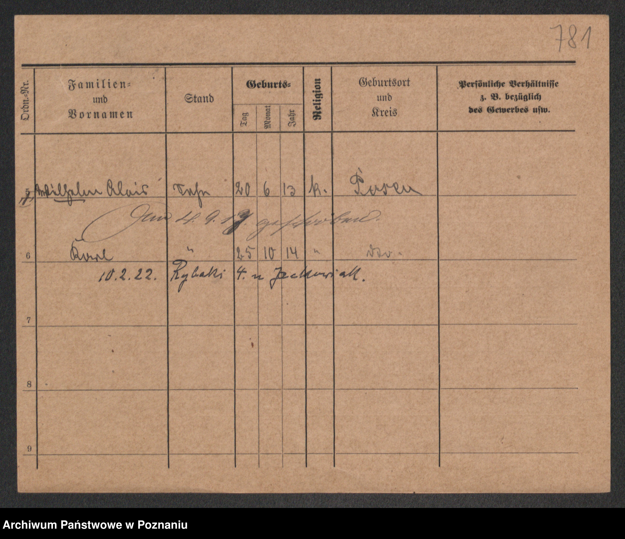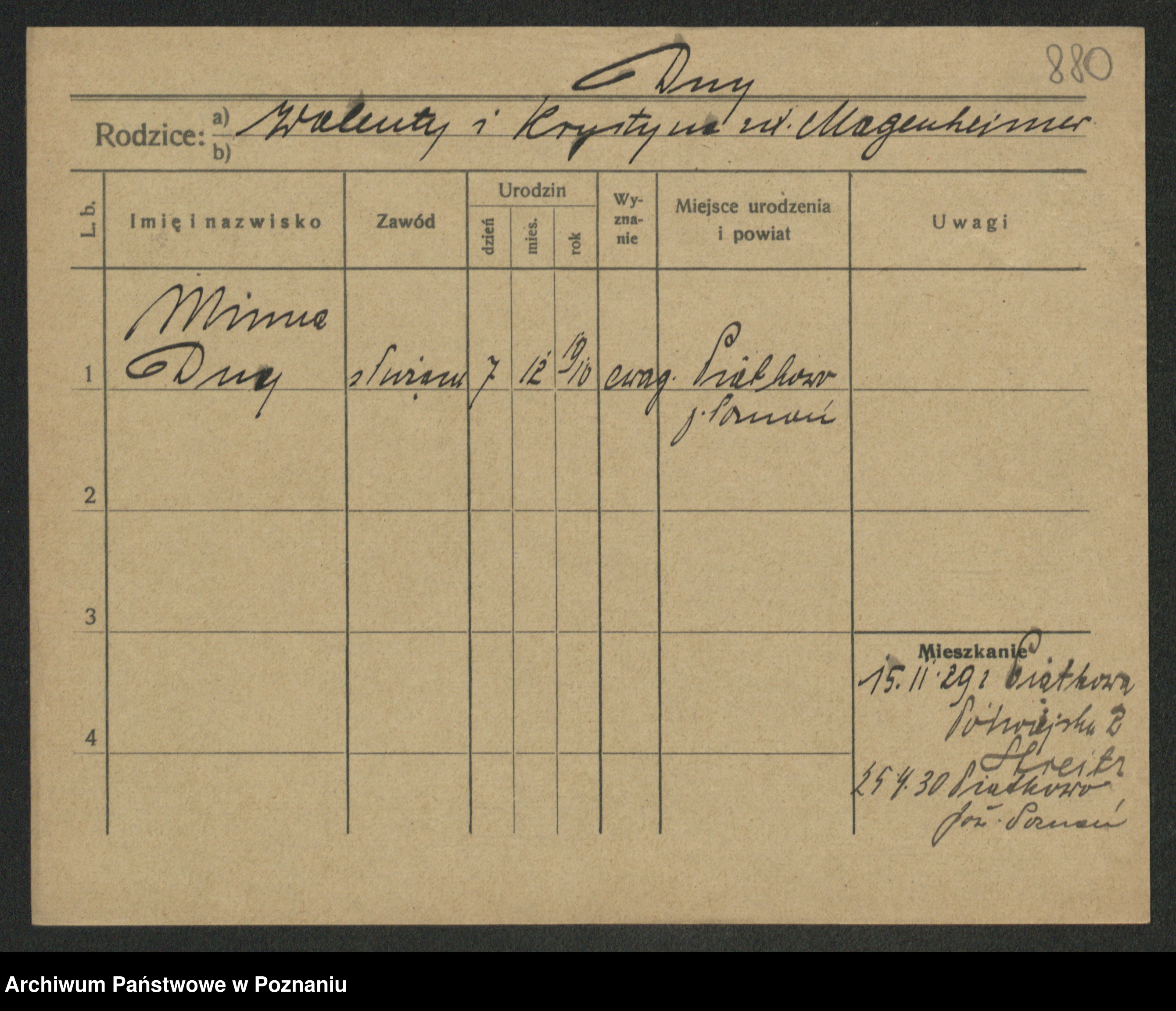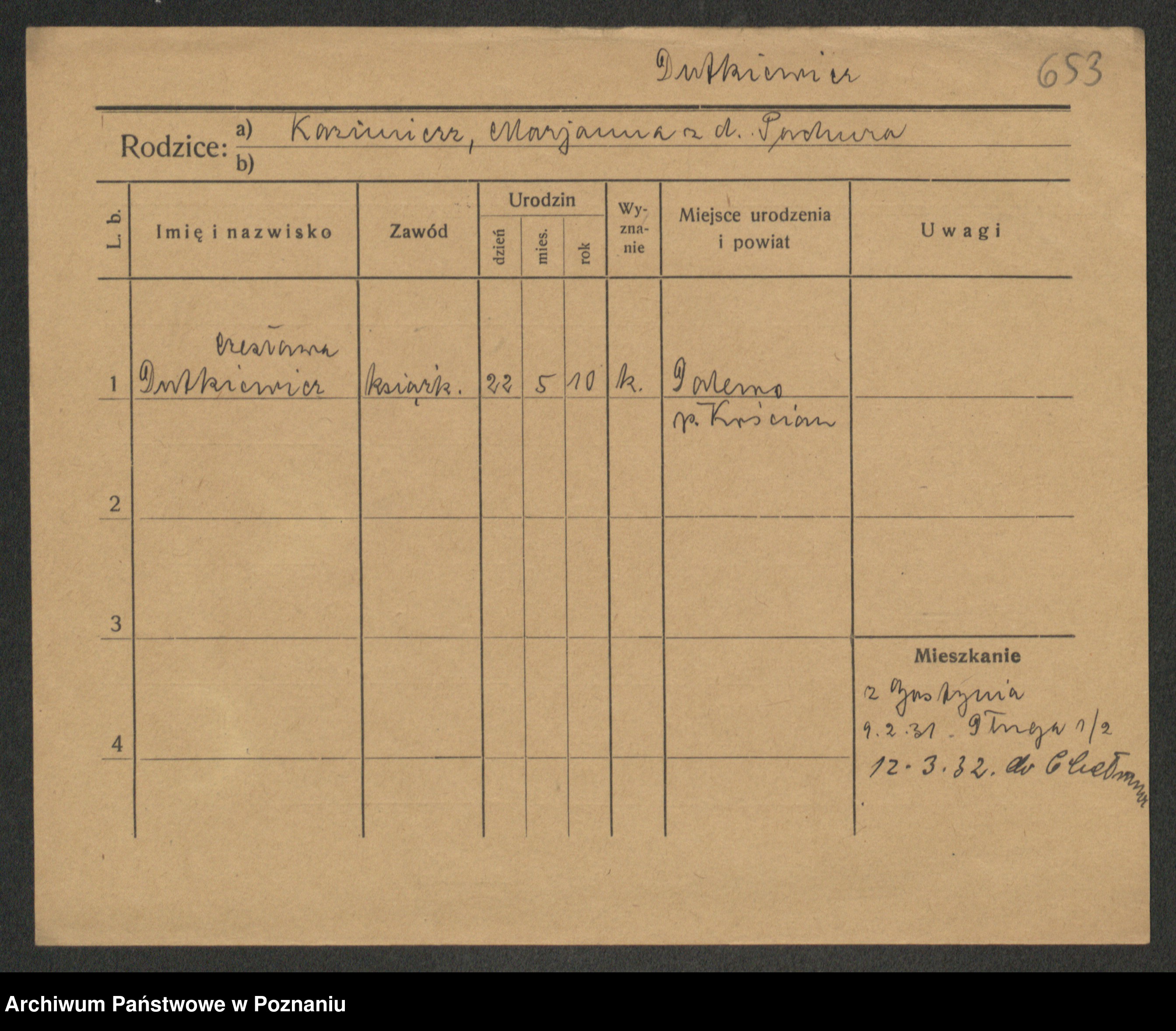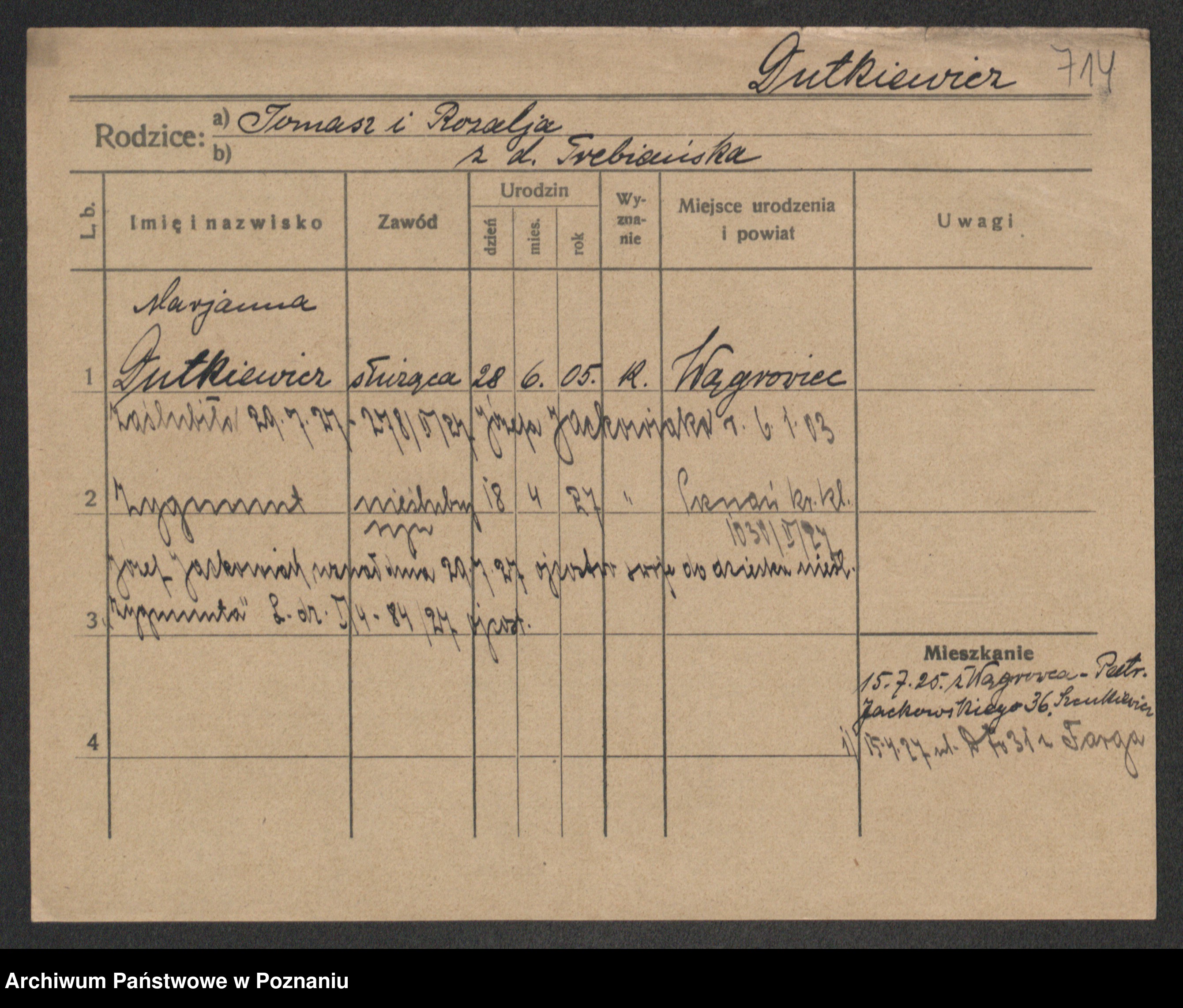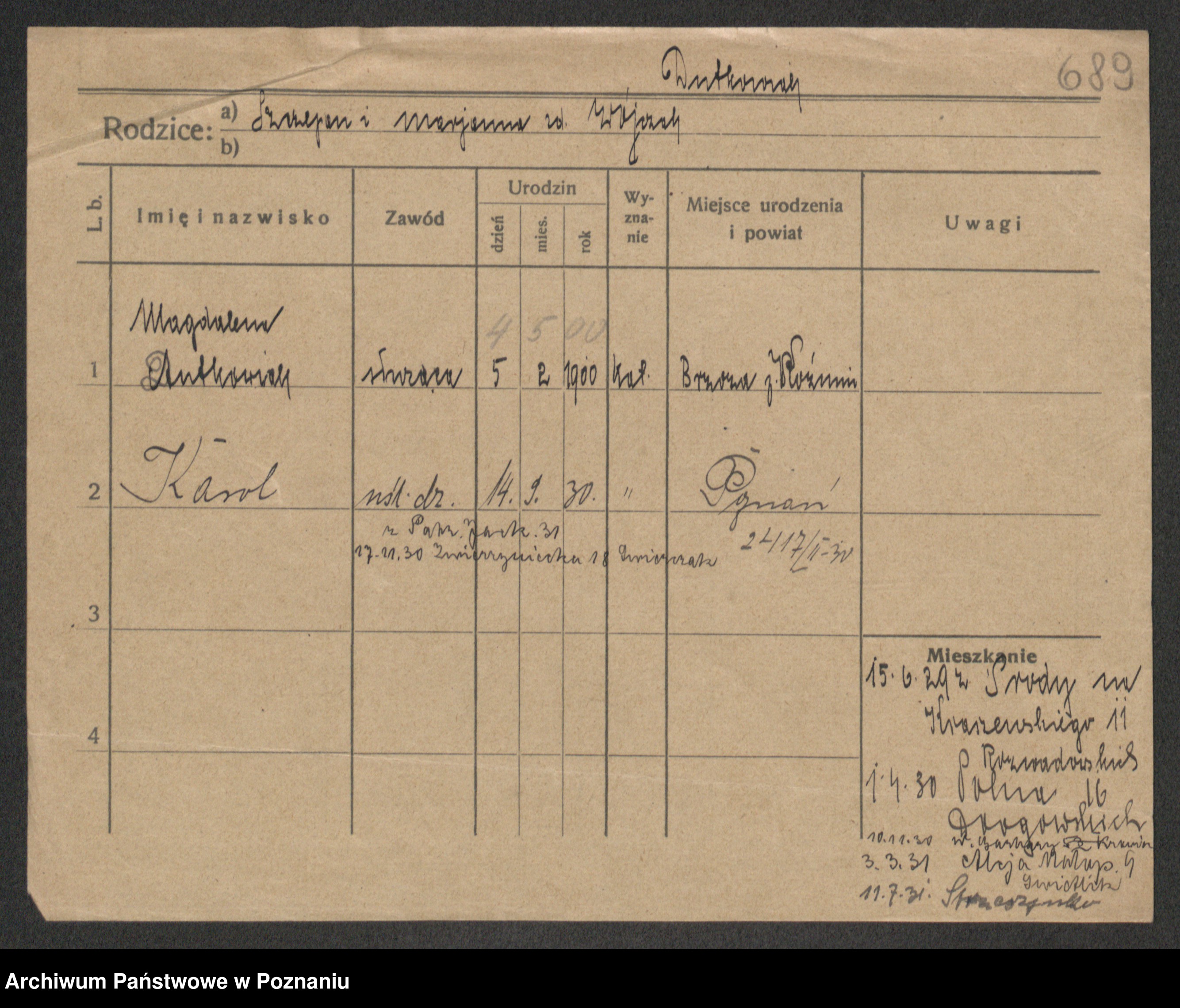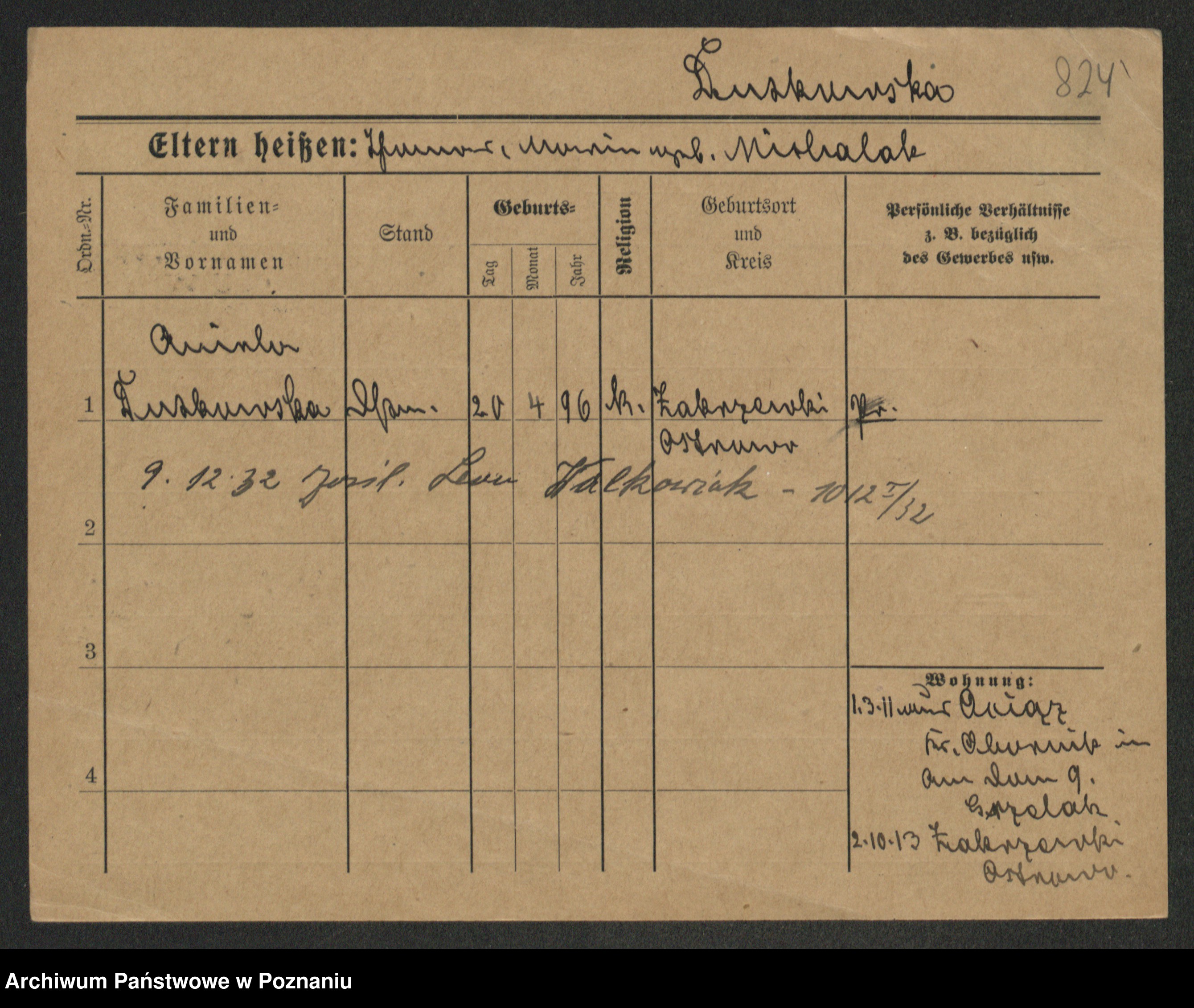 Podgląd karty osobowej dostępny jest po kliknięciu na nazwisko lub ikonkę karty. Można dokonywać powiększenia (ikony na górze) lub przechodzić między kolejnymi skanami (strzałki po bokach).