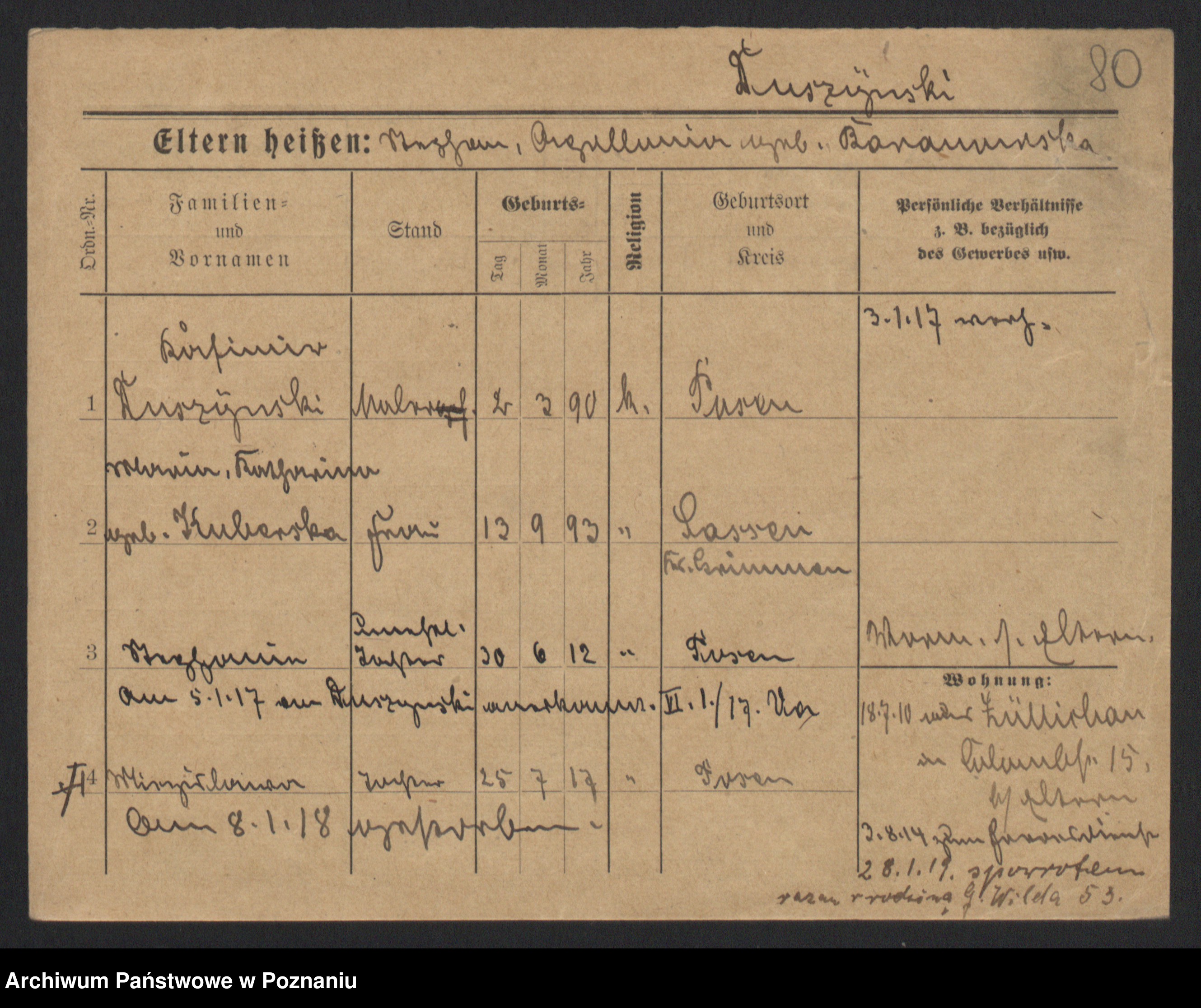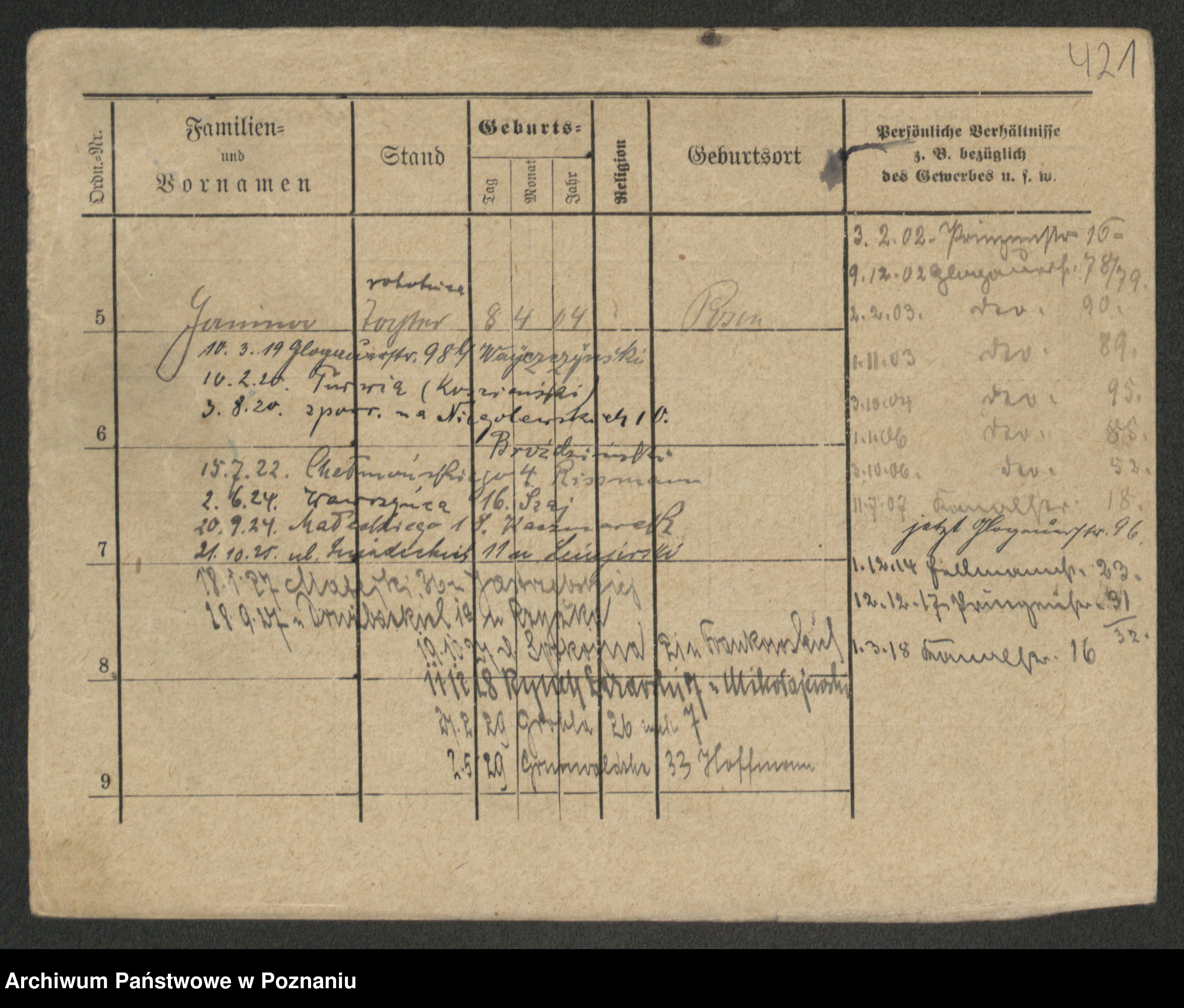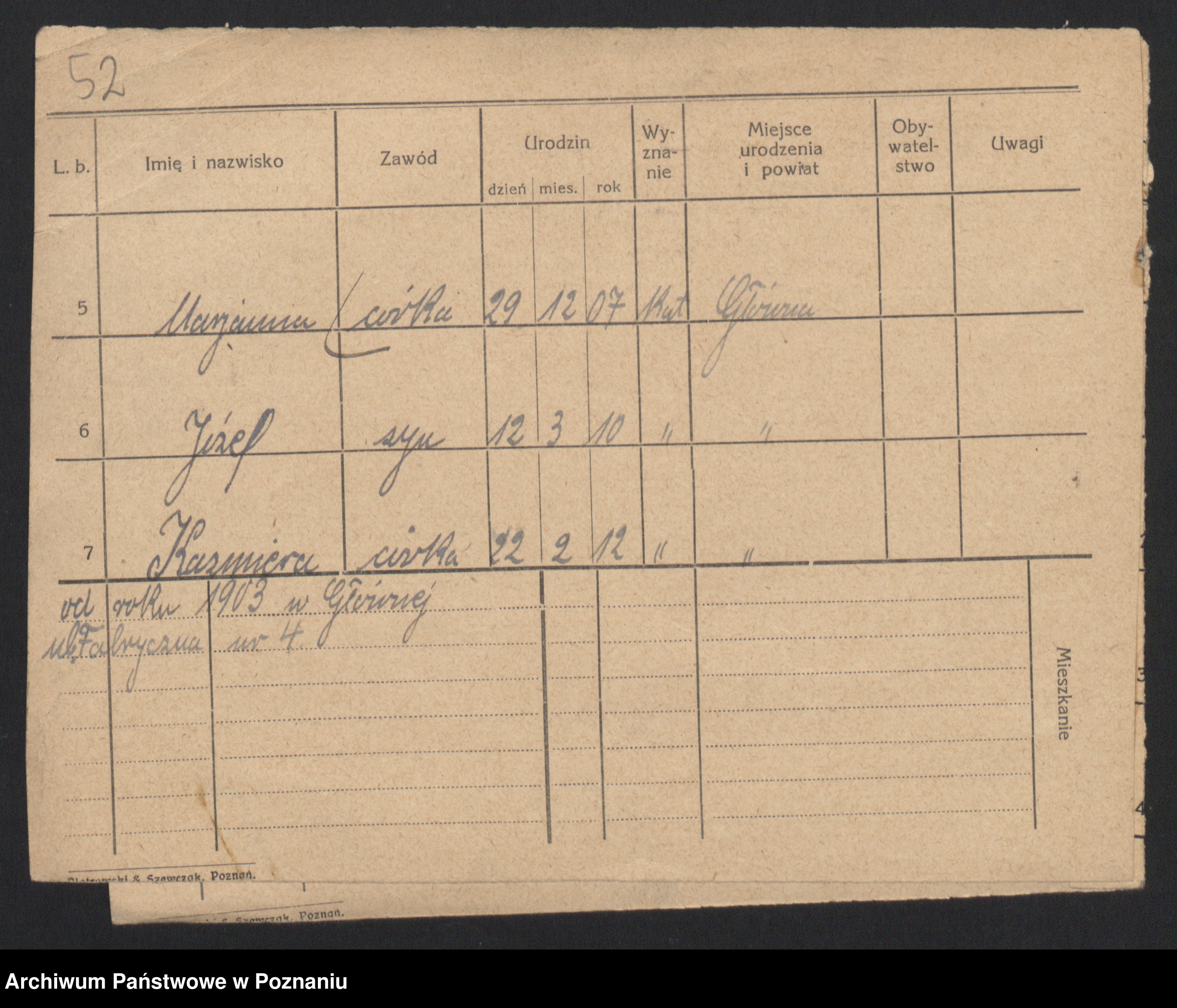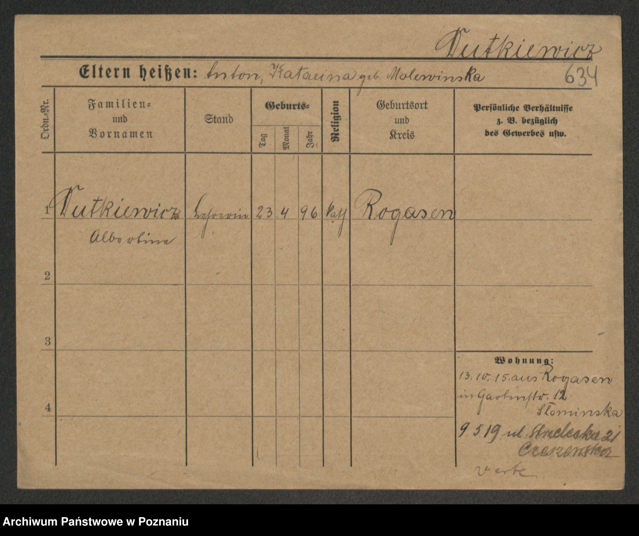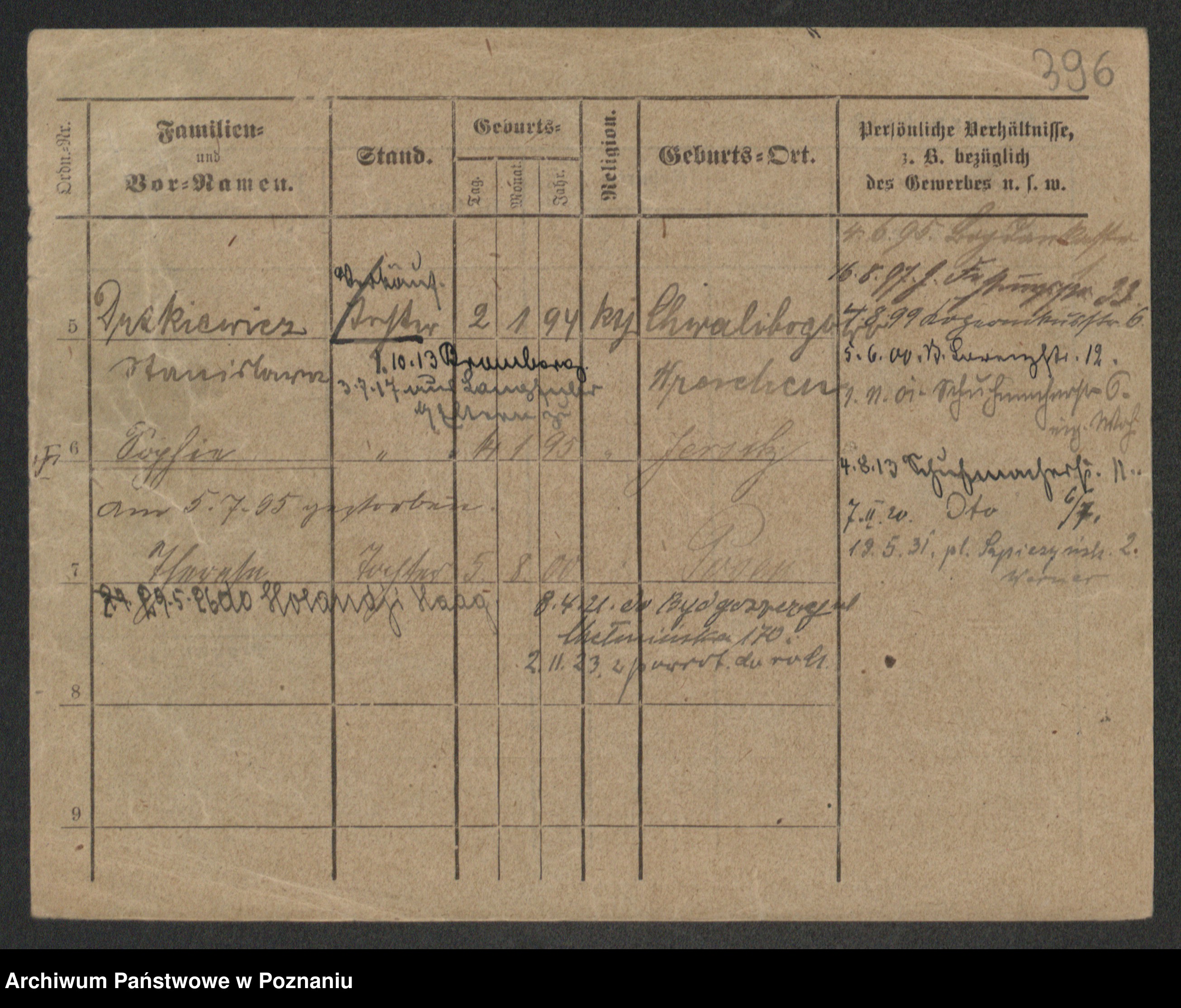 Podgląd karty osobowej dostępny jest po kliknięciu na nazwisko lub ikonkę karty. Można dokonywać powiększenia (ikony na górze) lub przechodzić między kolejnymi skanami (strzałki po bokach).