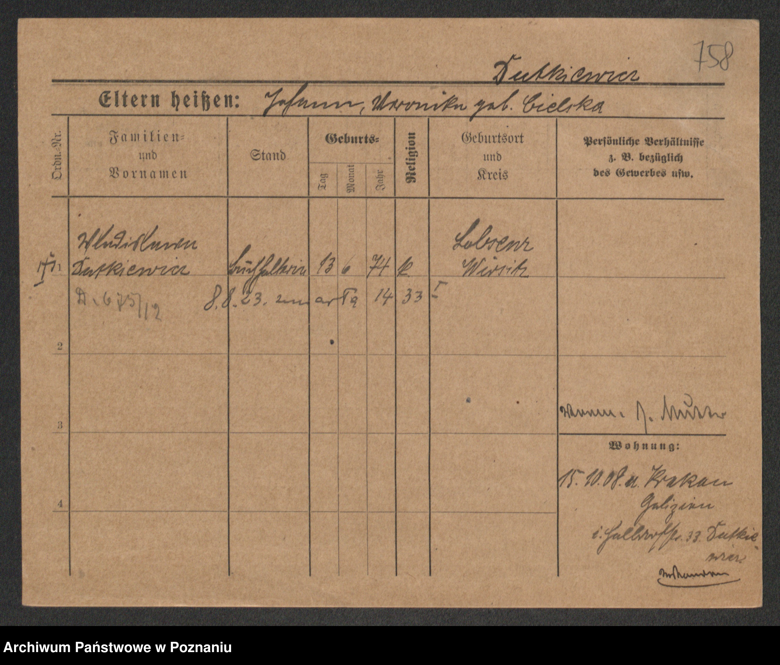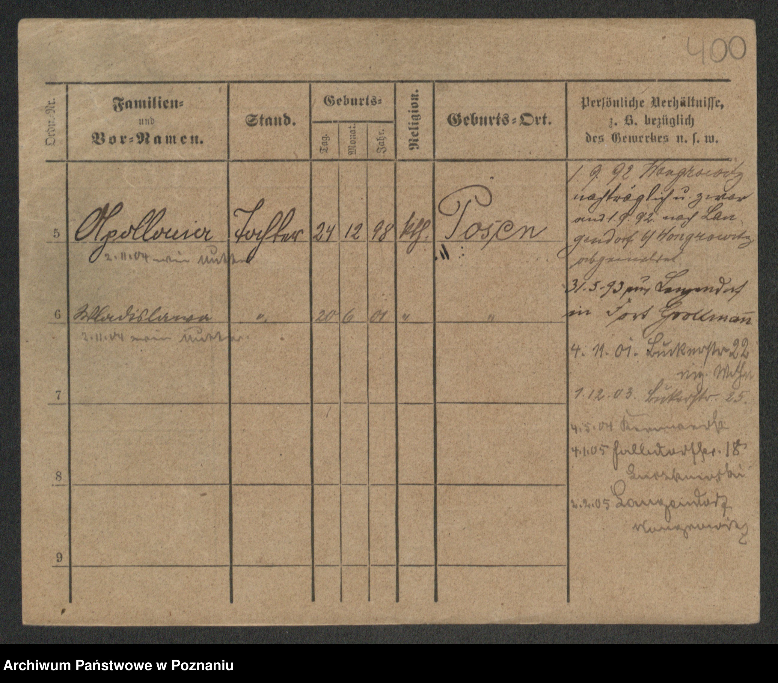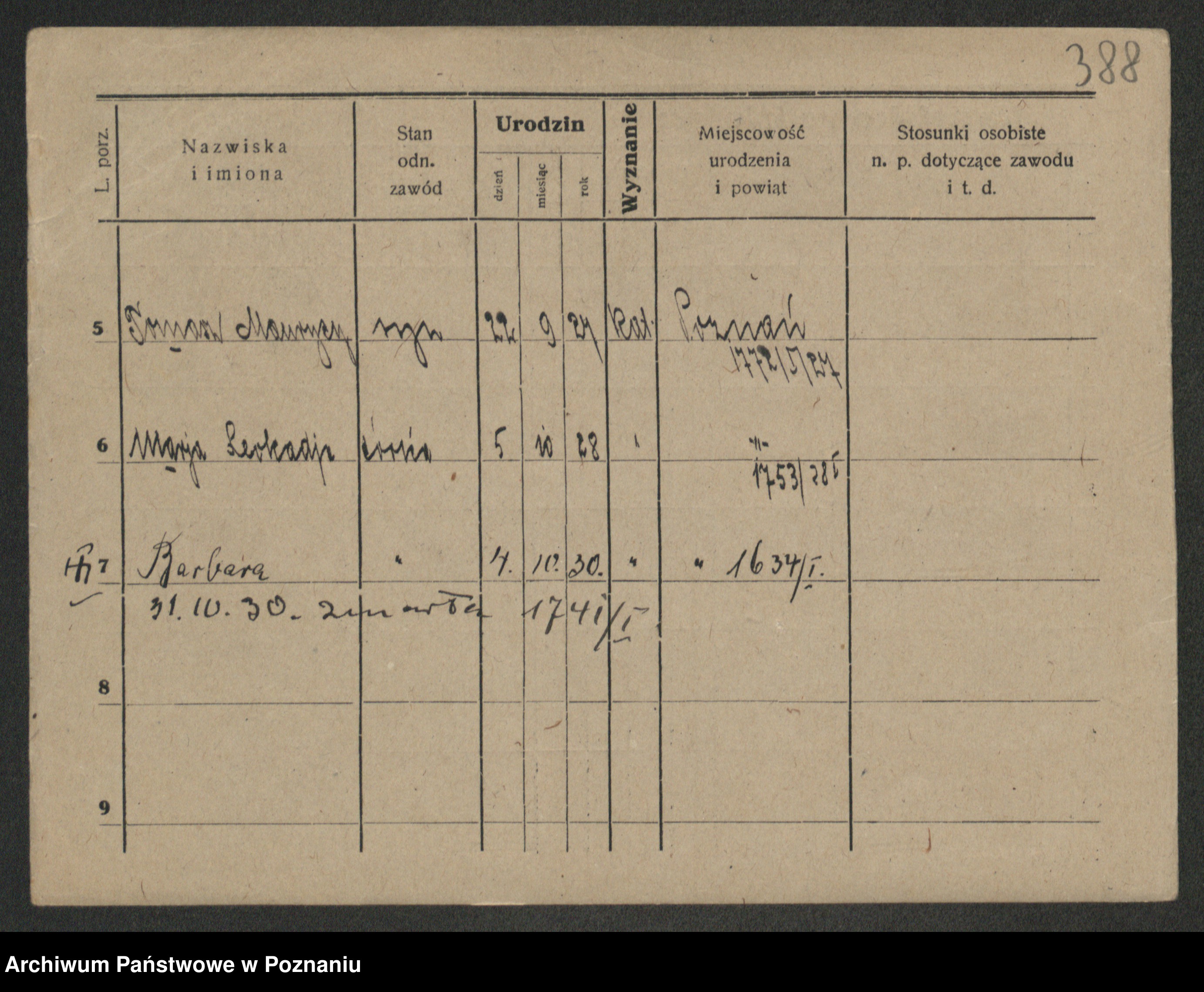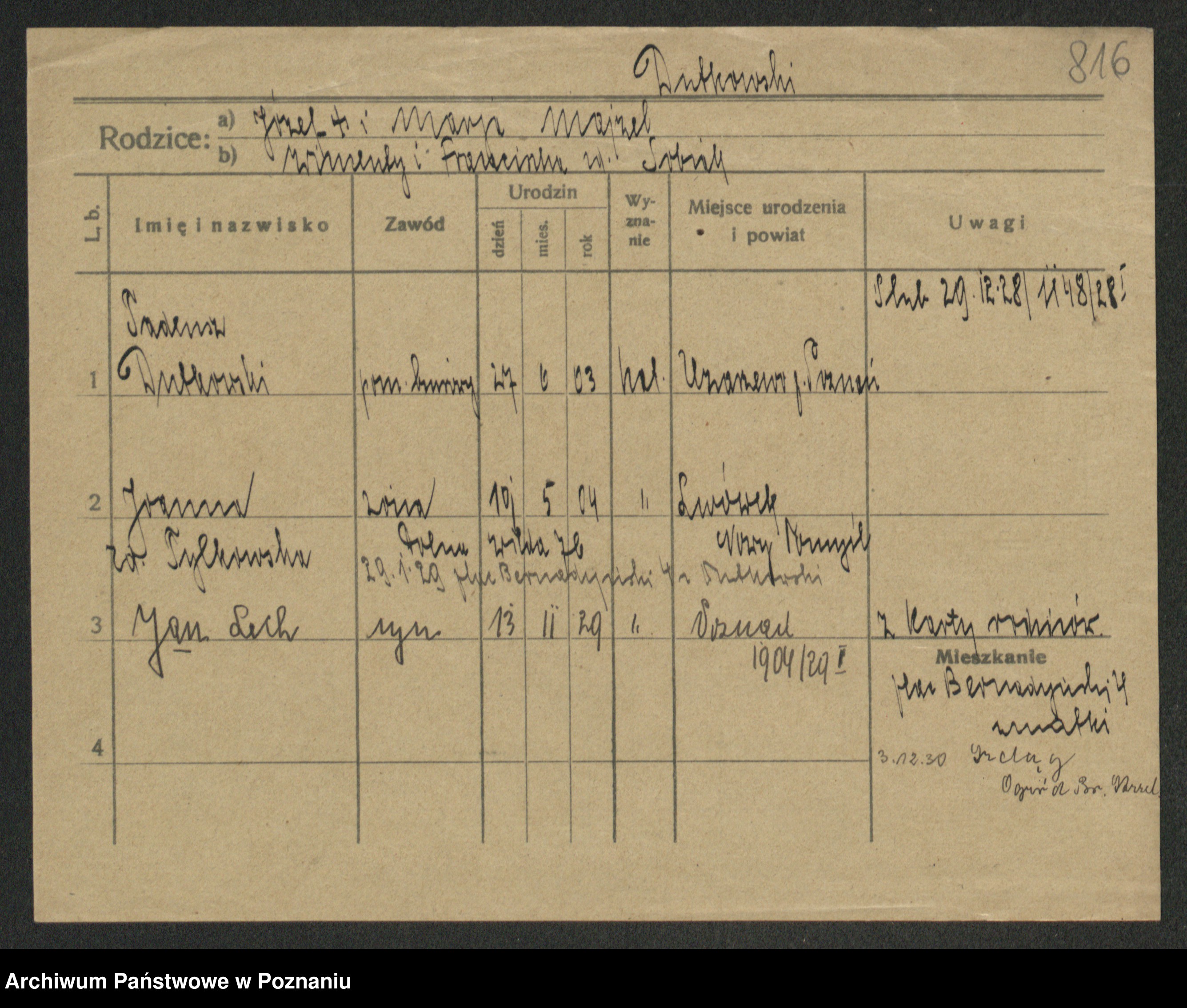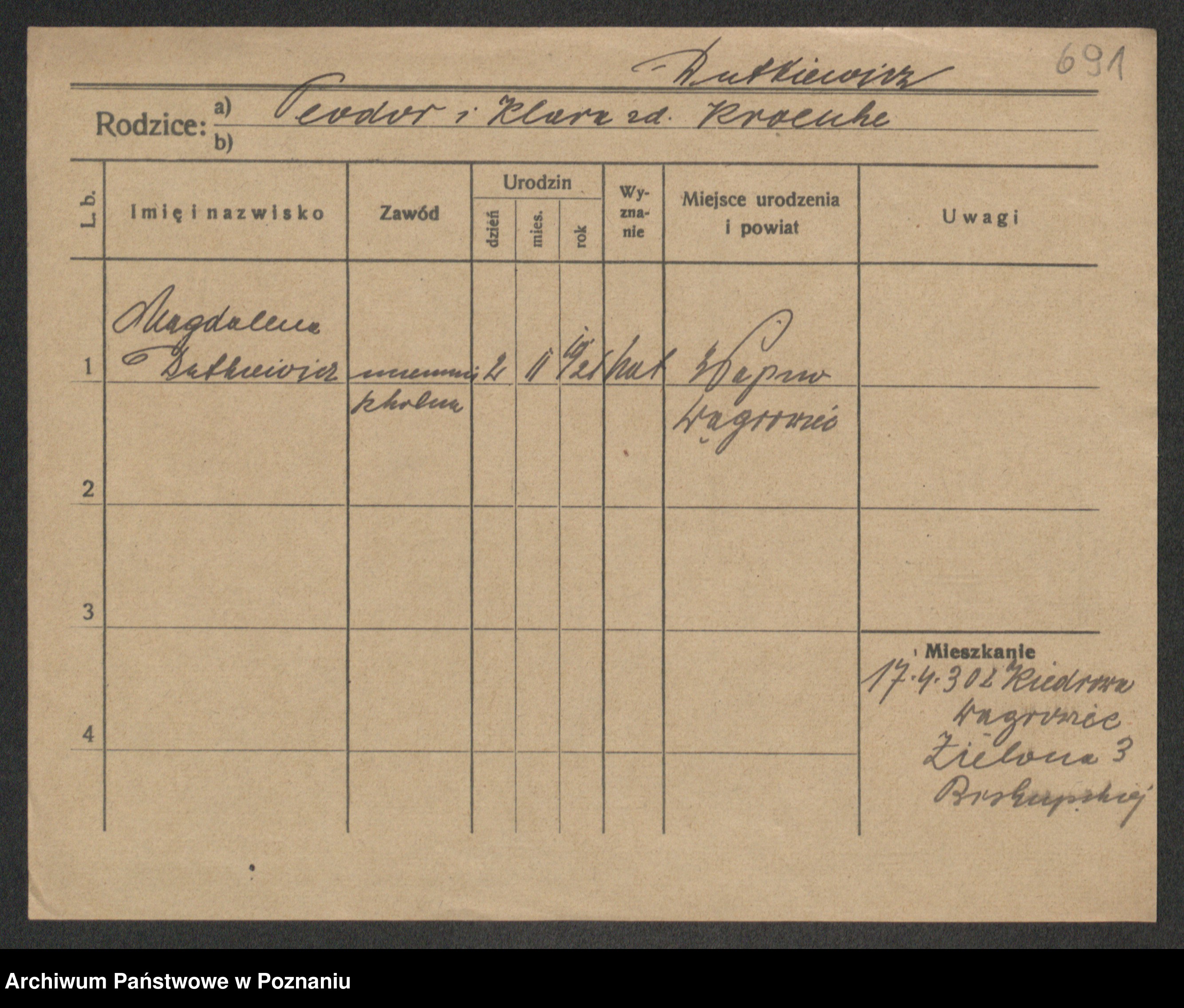 Podgląd karty osobowej dostępny jest po kliknięciu na nazwisko lub ikonkę karty. Można dokonywać powiększenia (ikony na górze) lub przechodzić między kolejnymi skanami (strzałki po bokach).