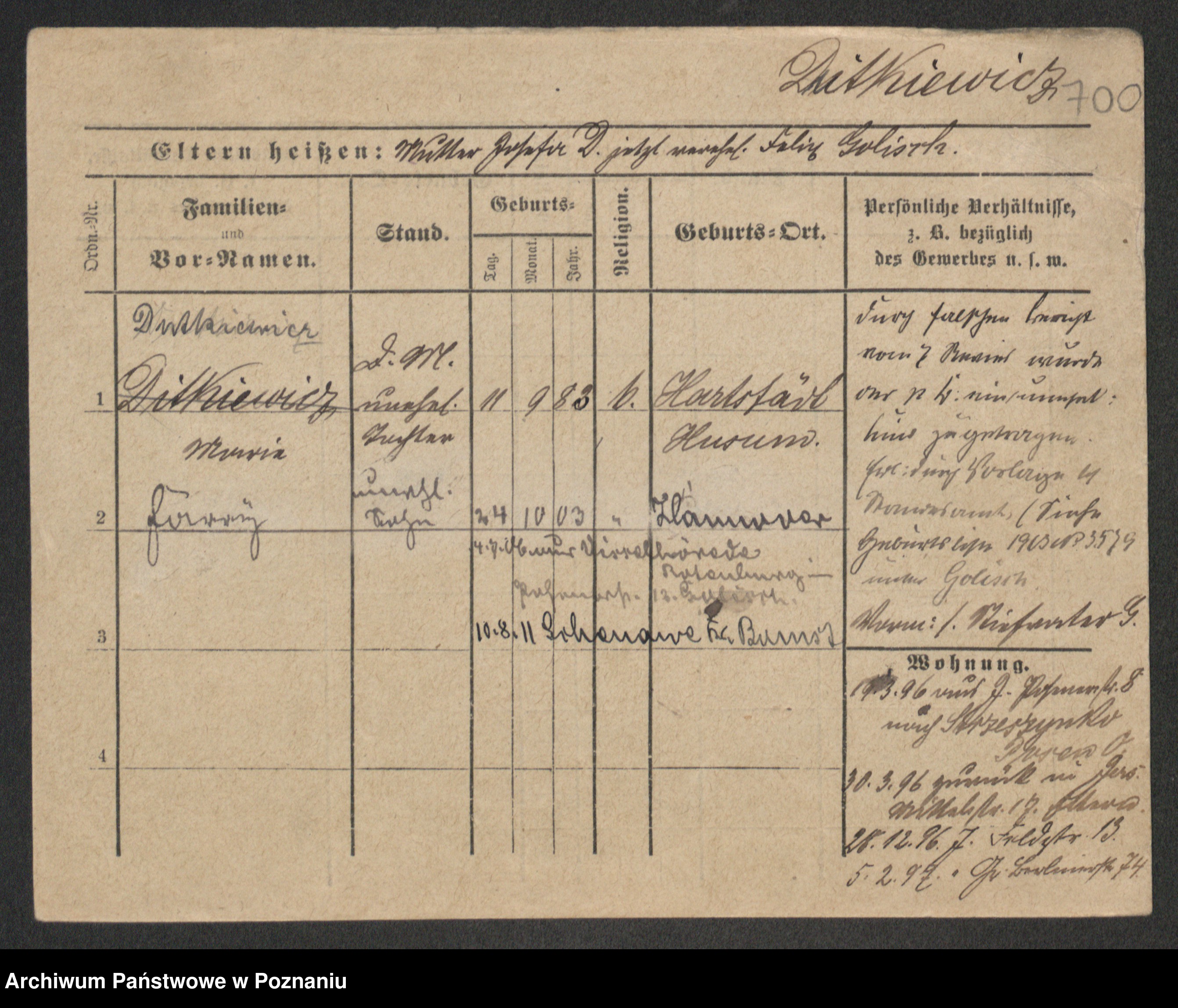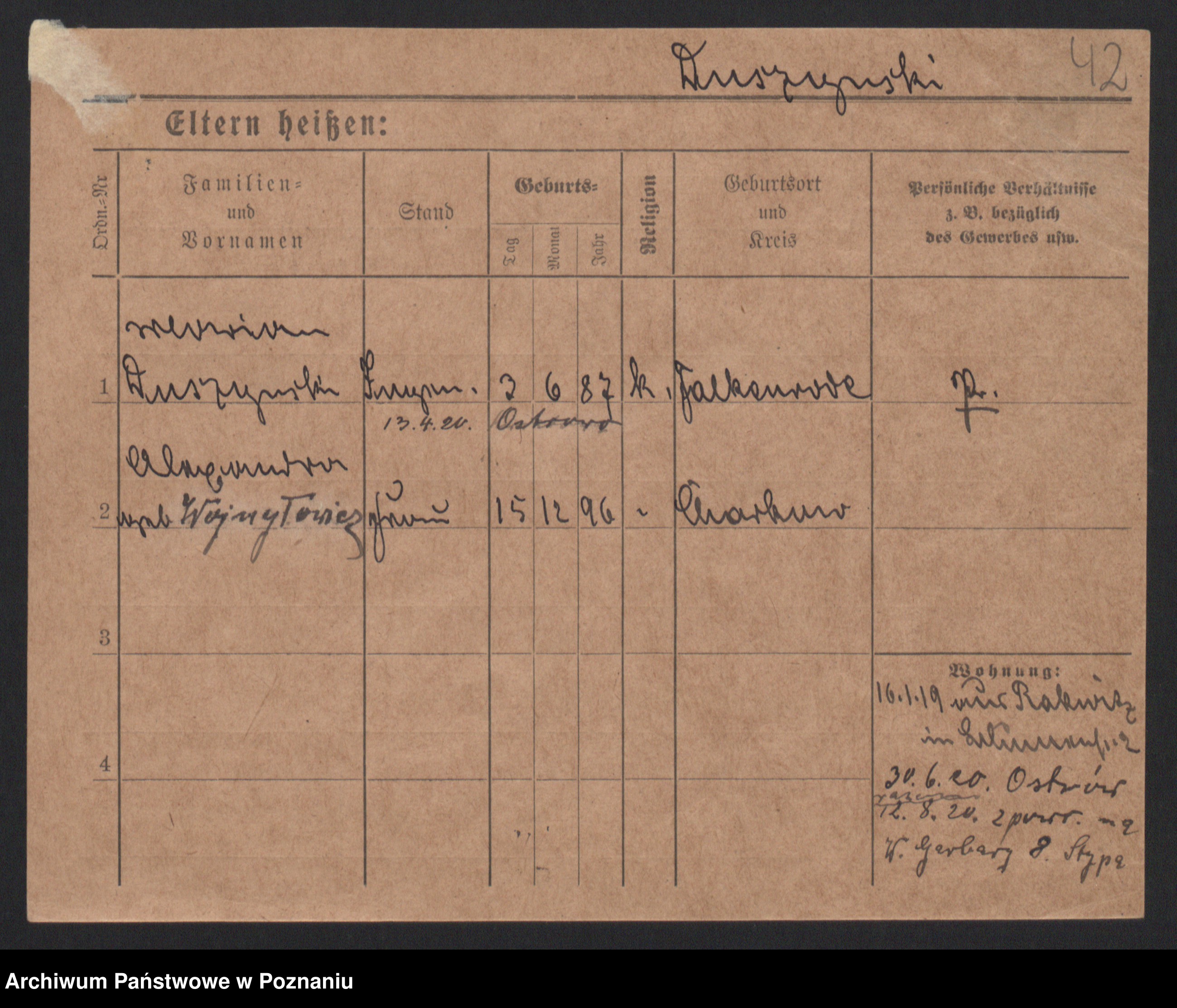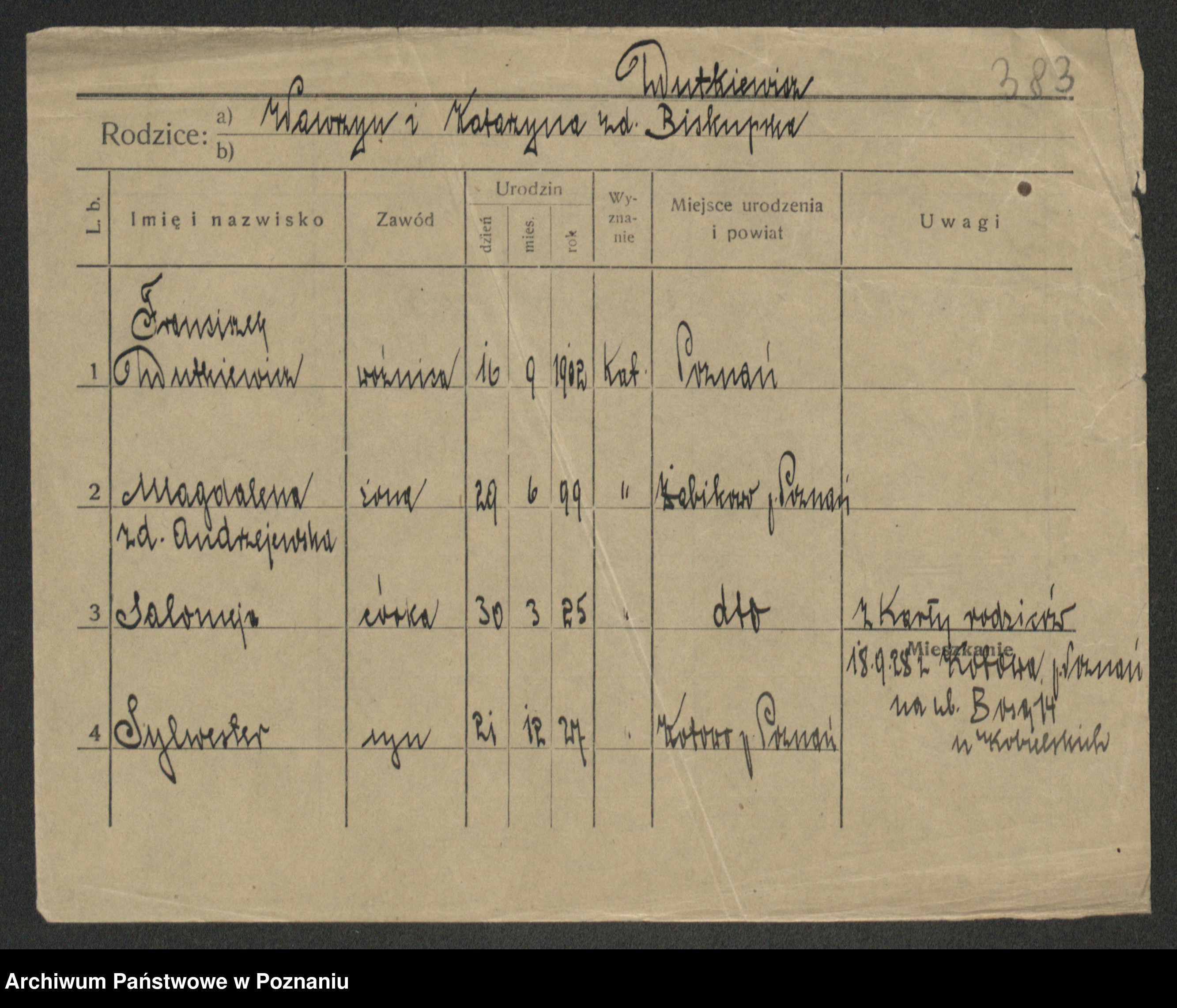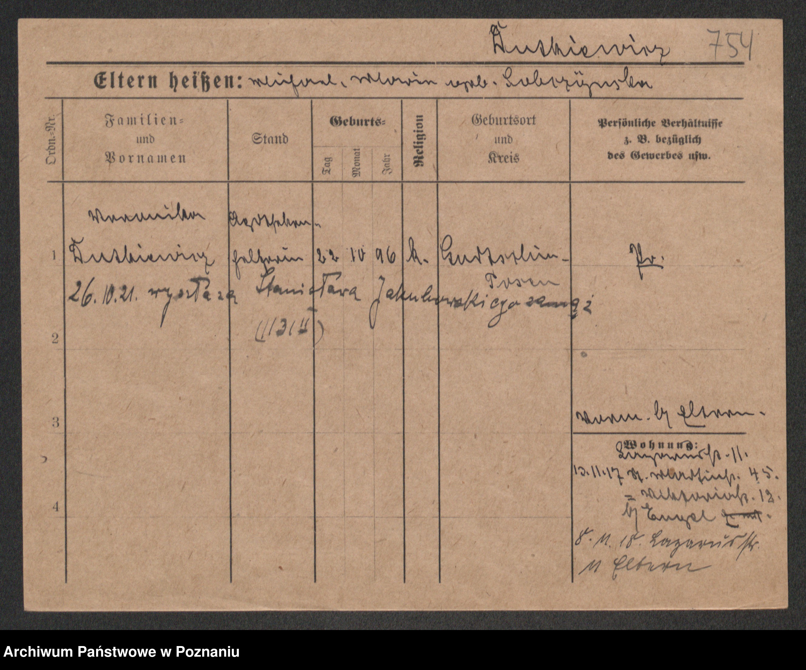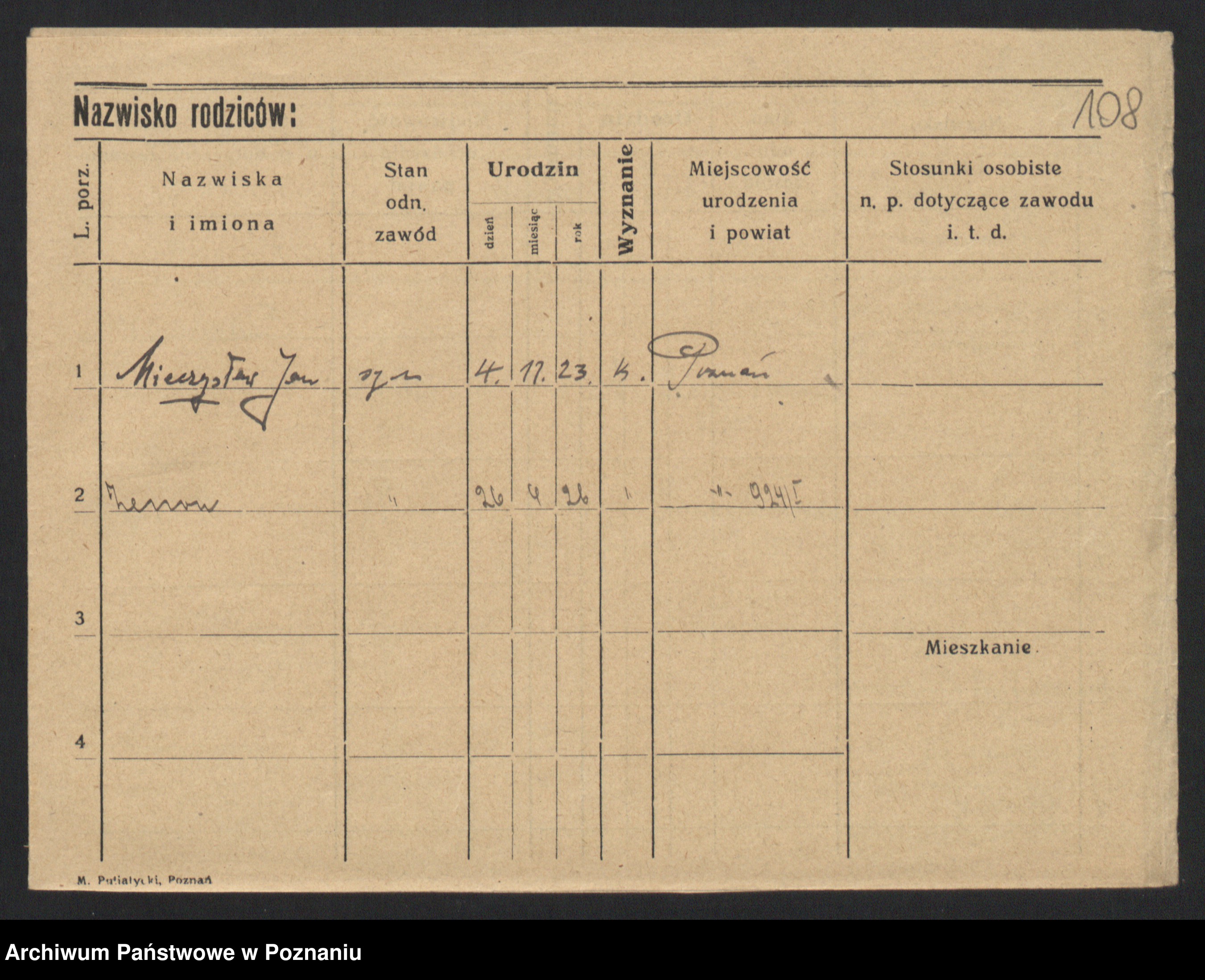 Podgląd karty osobowej dostępny jest po kliknięciu na nazwisko lub ikonkę karty. Można dokonywać powiększenia (ikony na górze) lub przechodzić między kolejnymi skanami (strzałki po bokach).