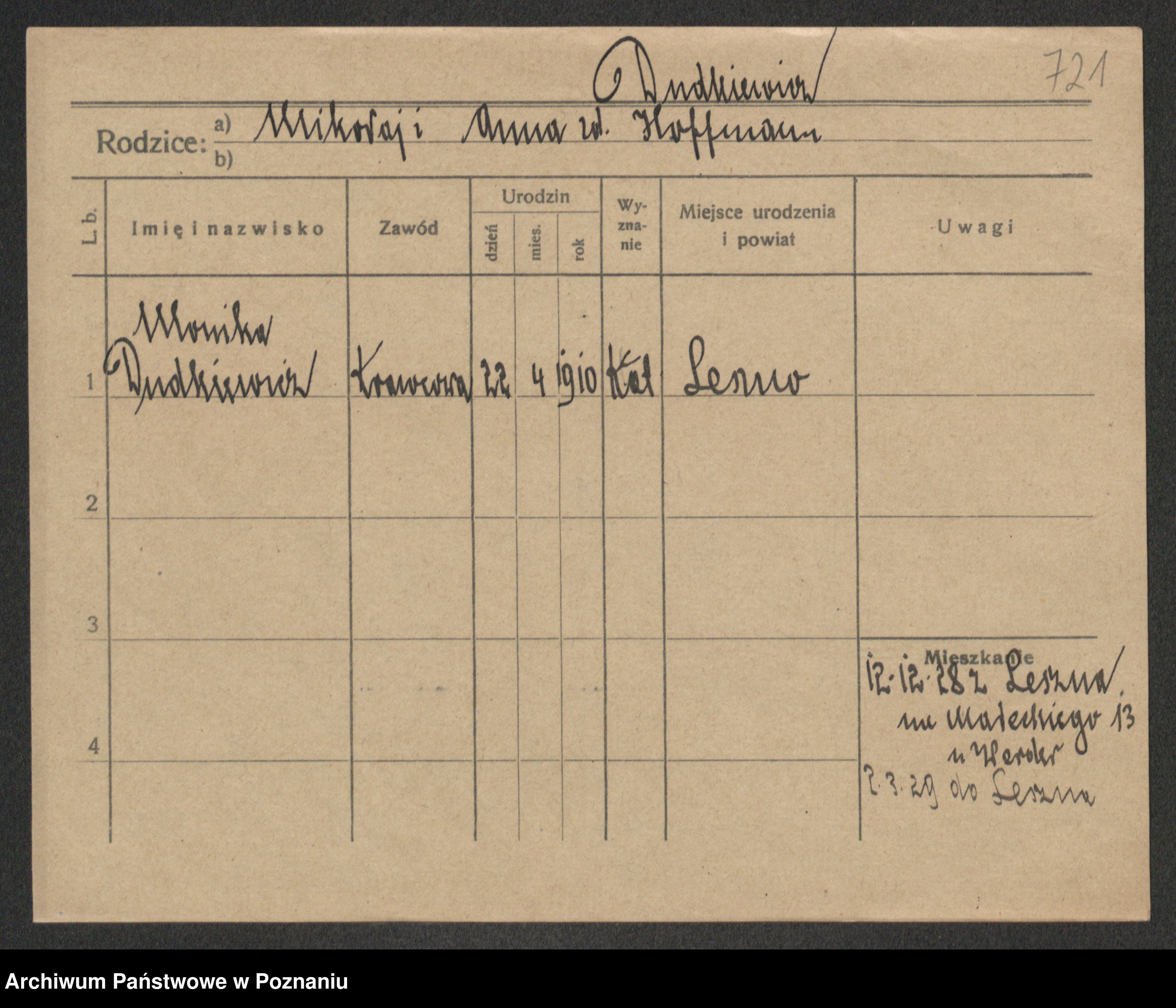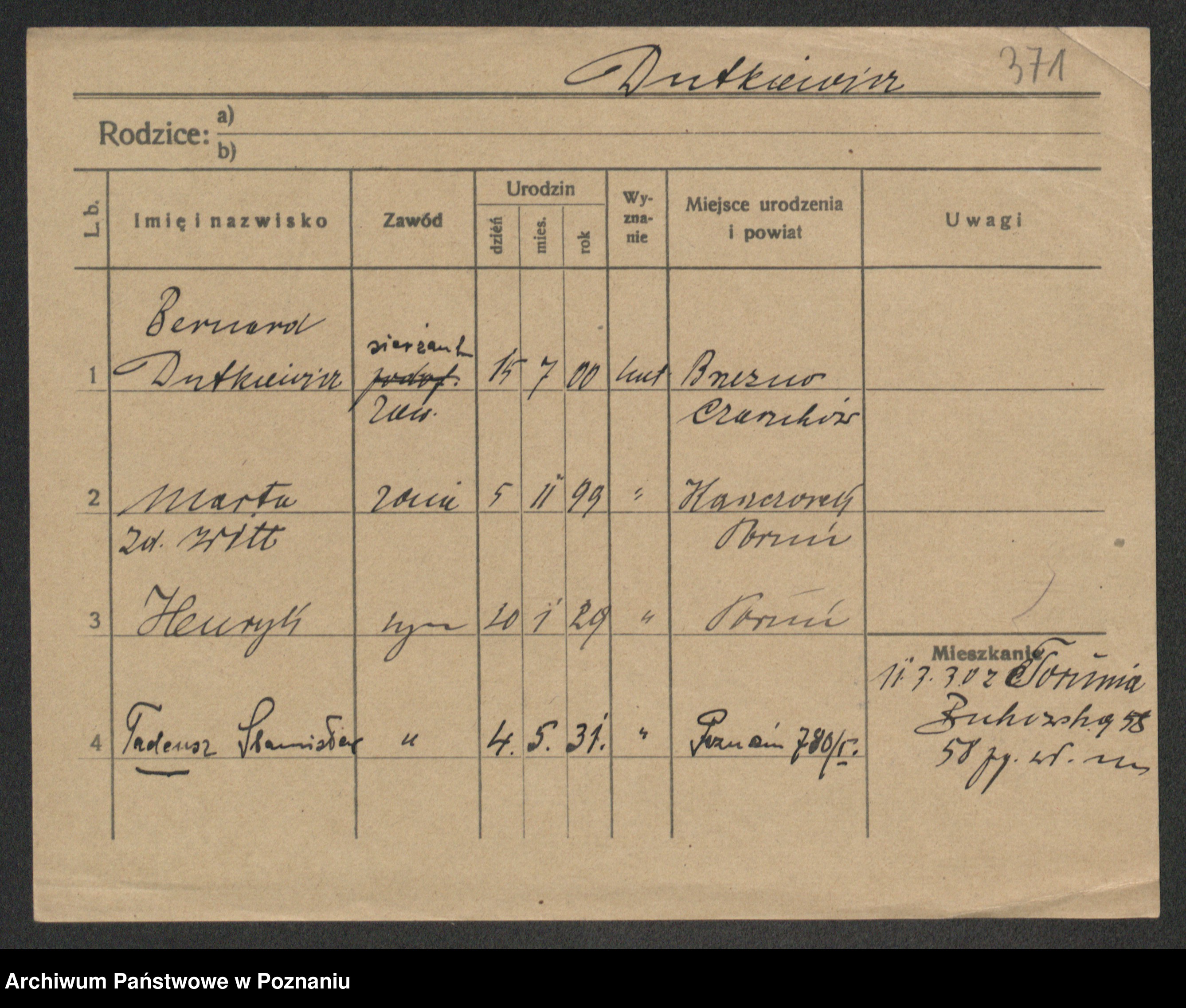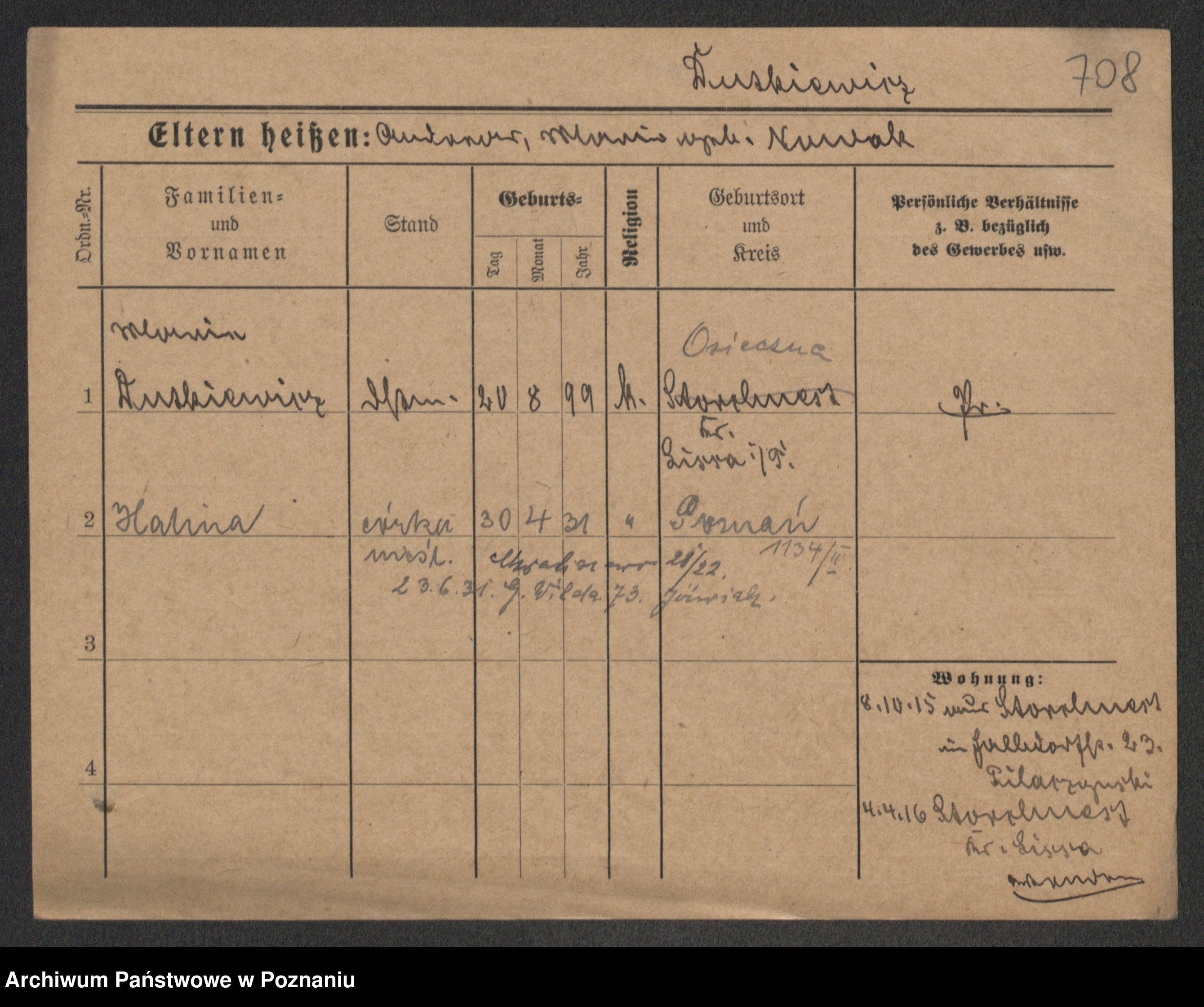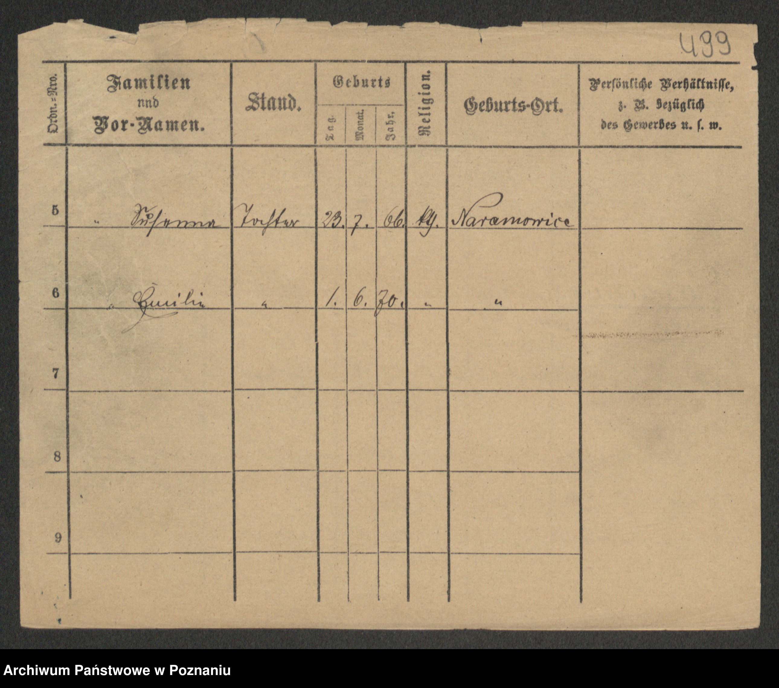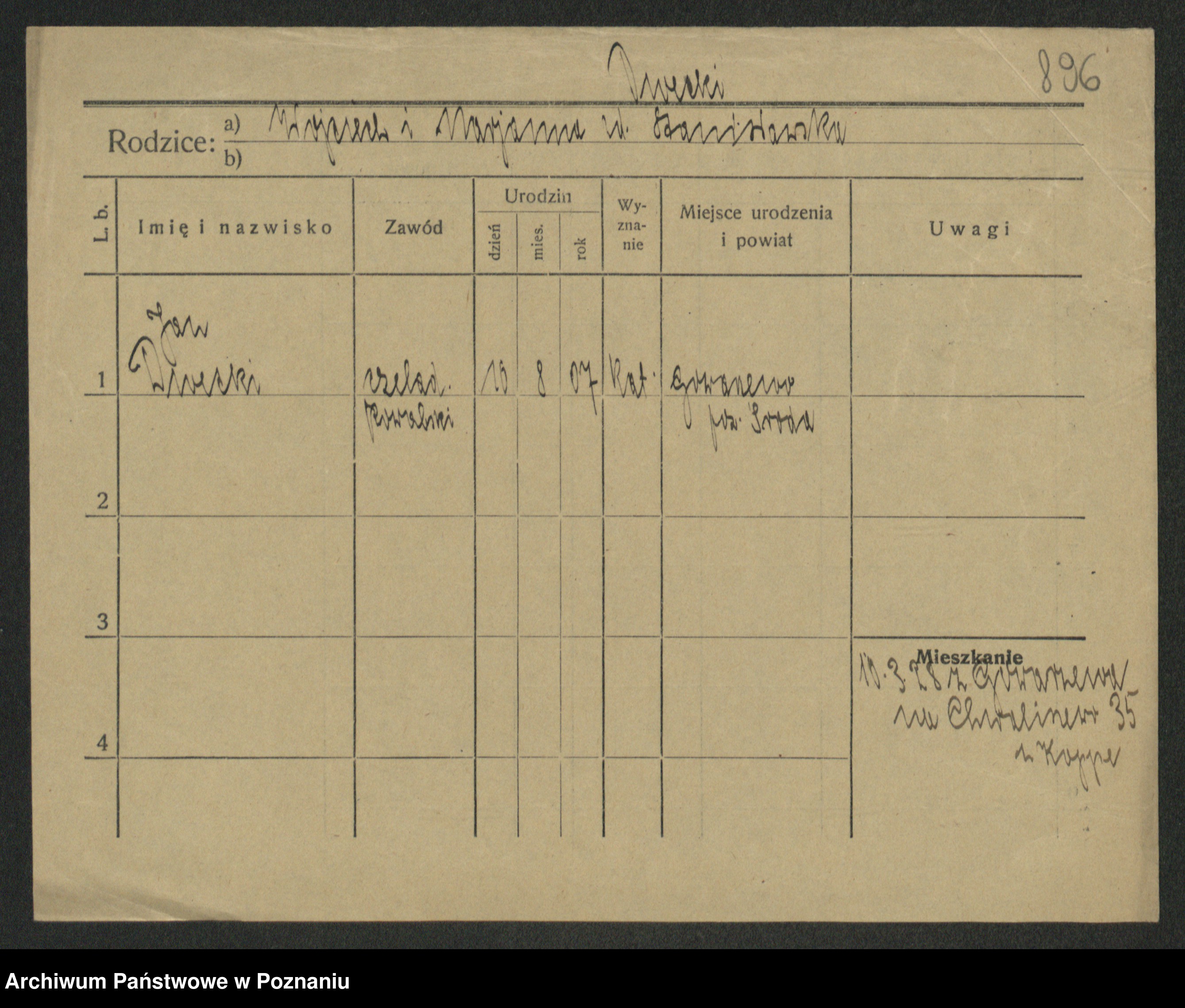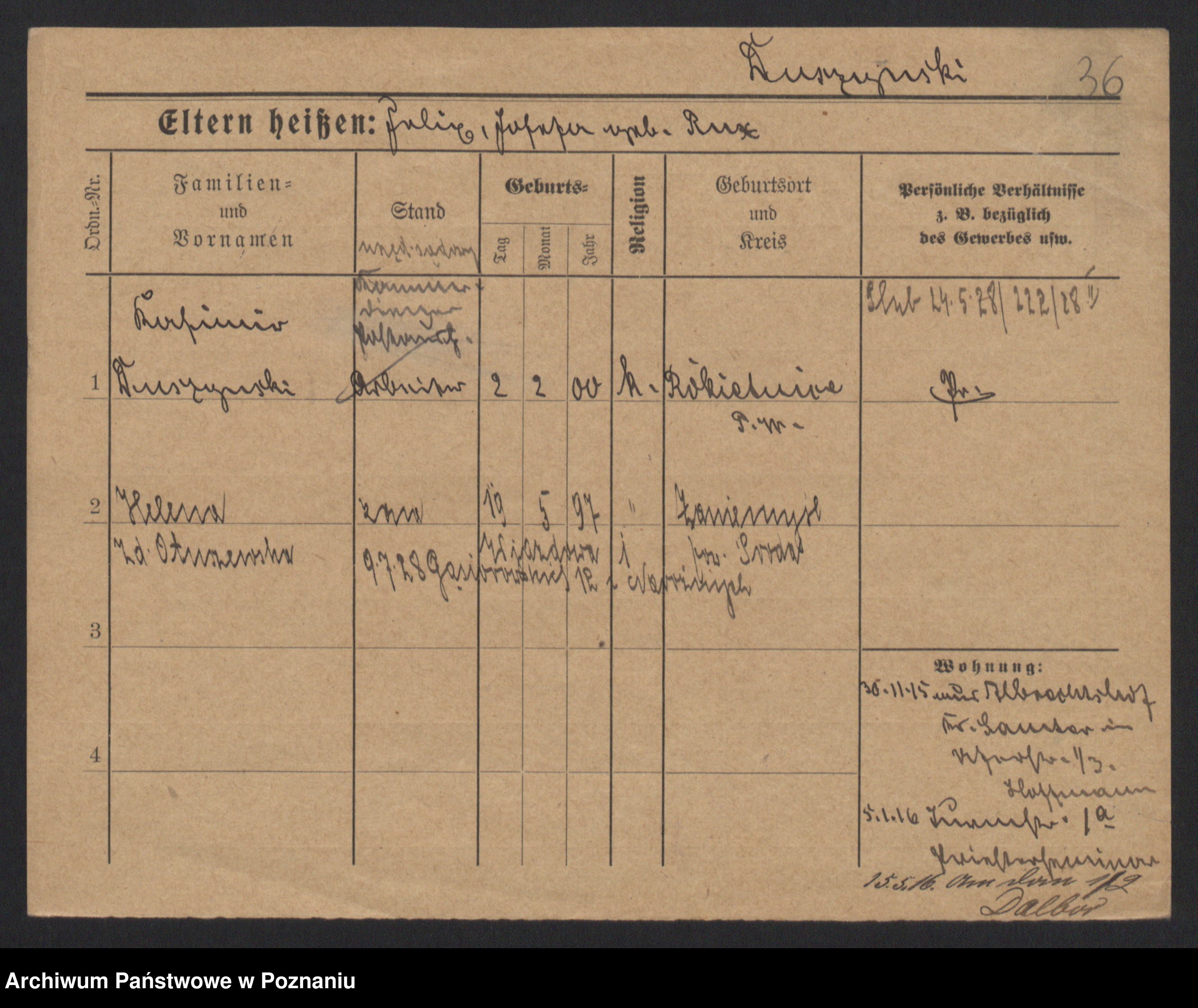 Podgląd karty osobowej dostępny jest po kliknięciu na nazwisko lub ikonkę karty. Można dokonywać powiększenia (ikony na górze) lub przechodzić między kolejnymi skanami (strzałki po bokach).