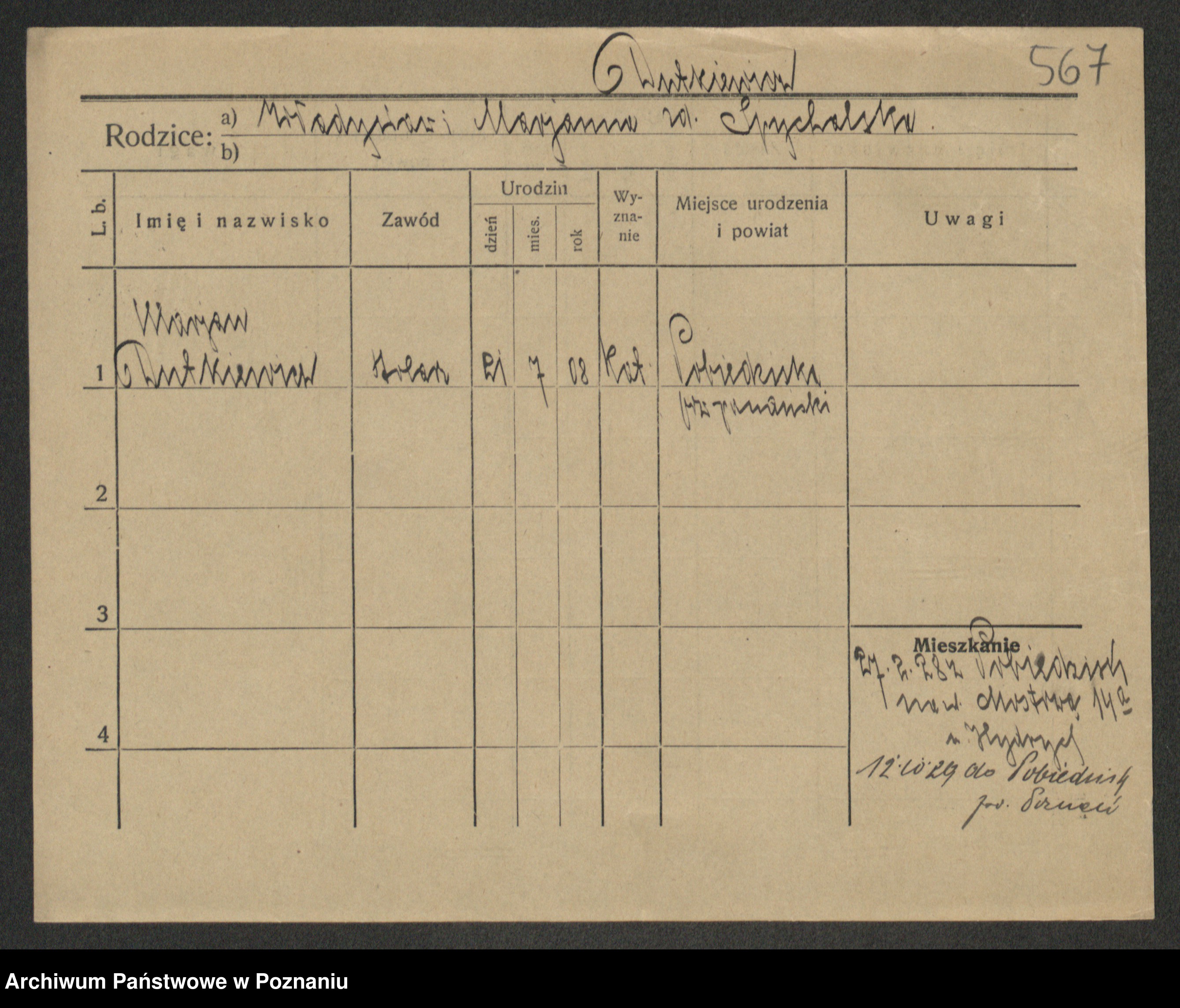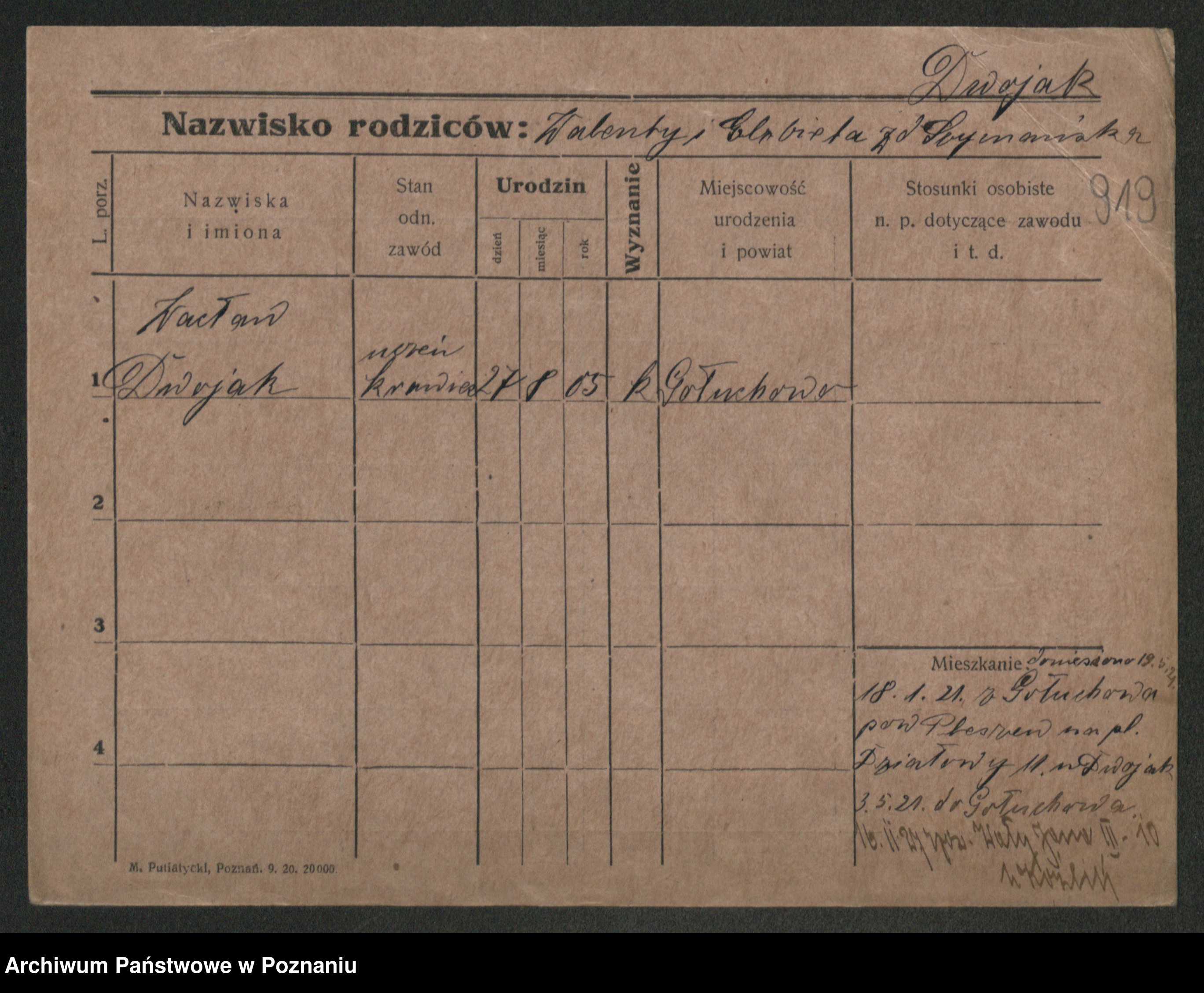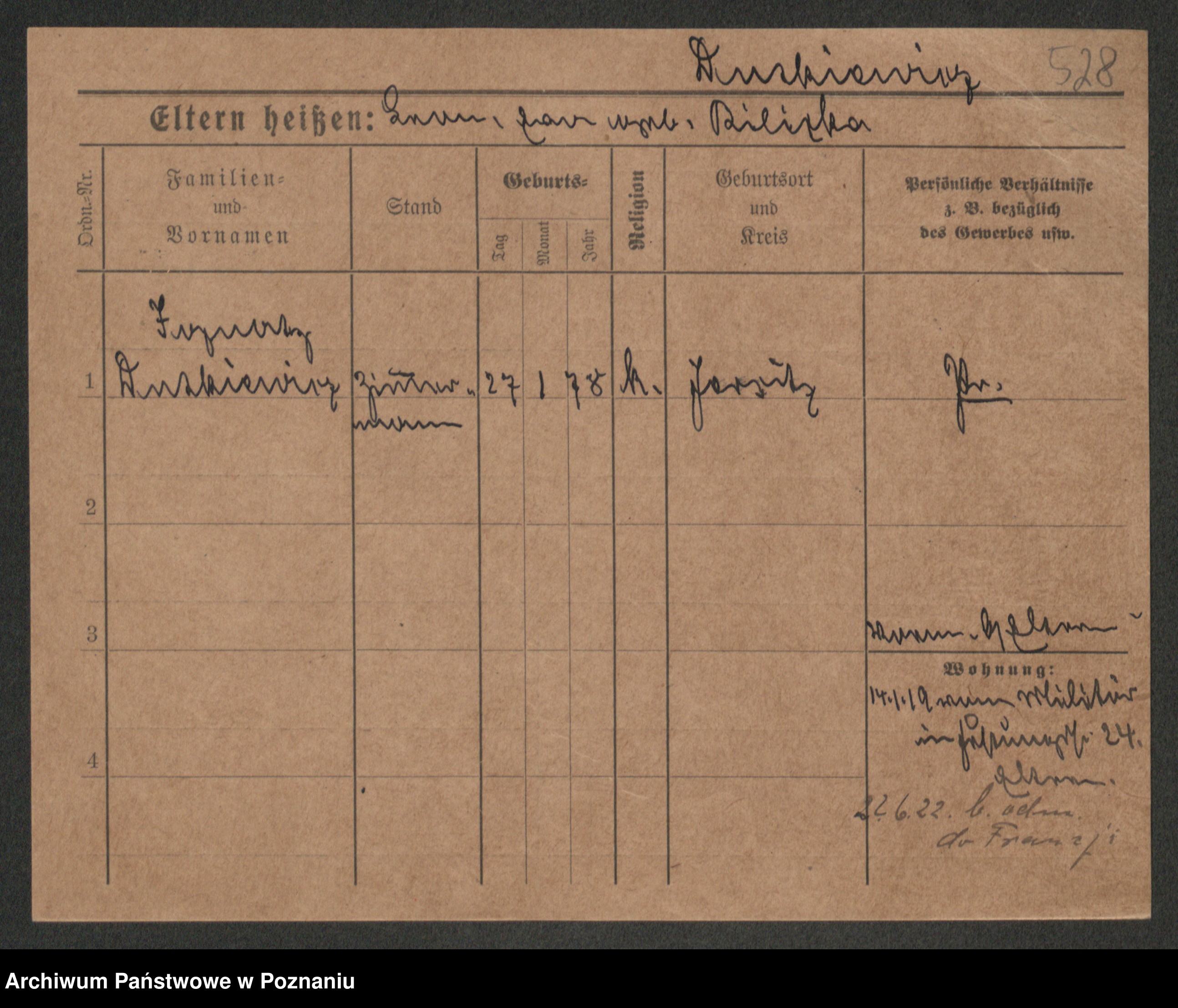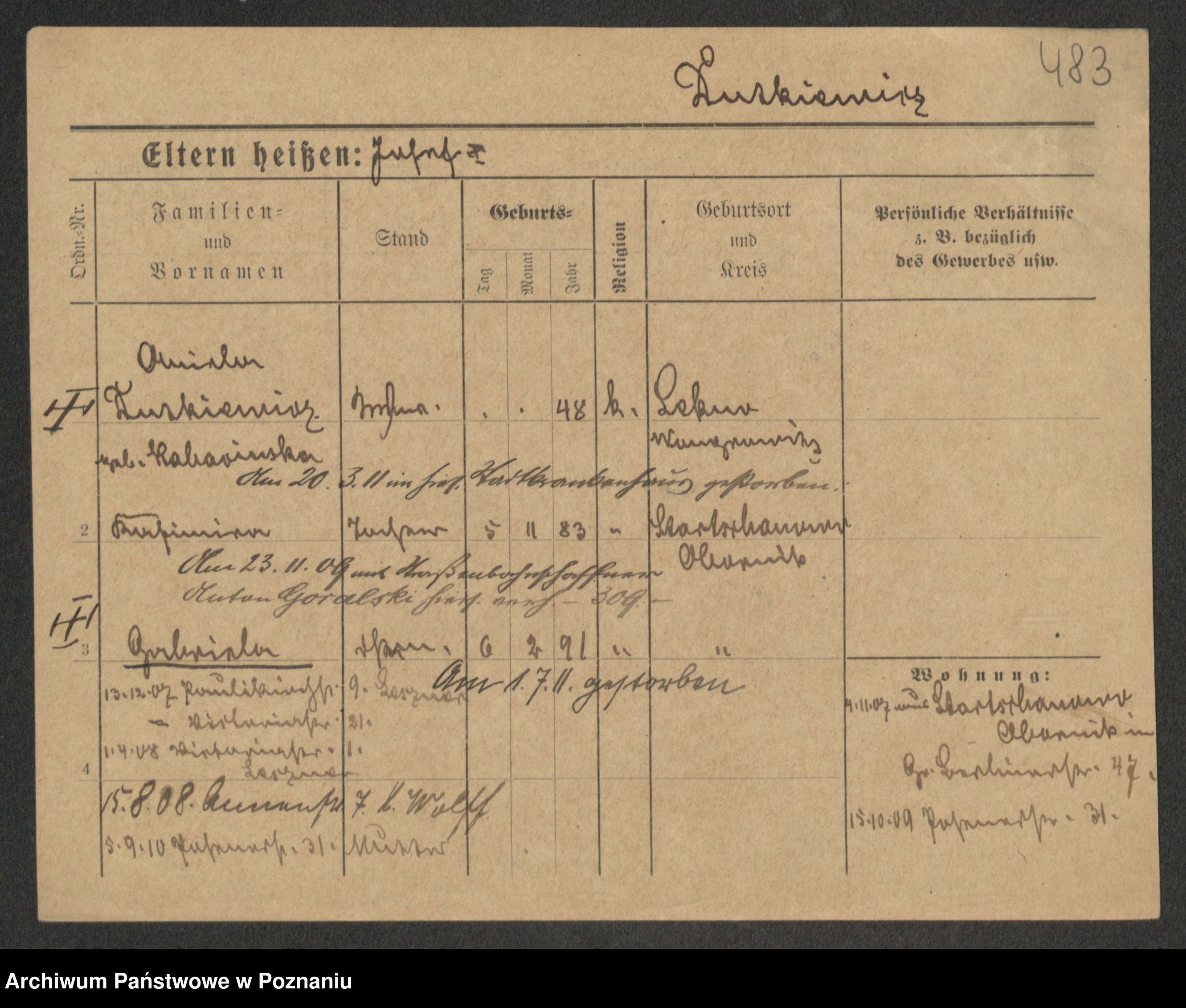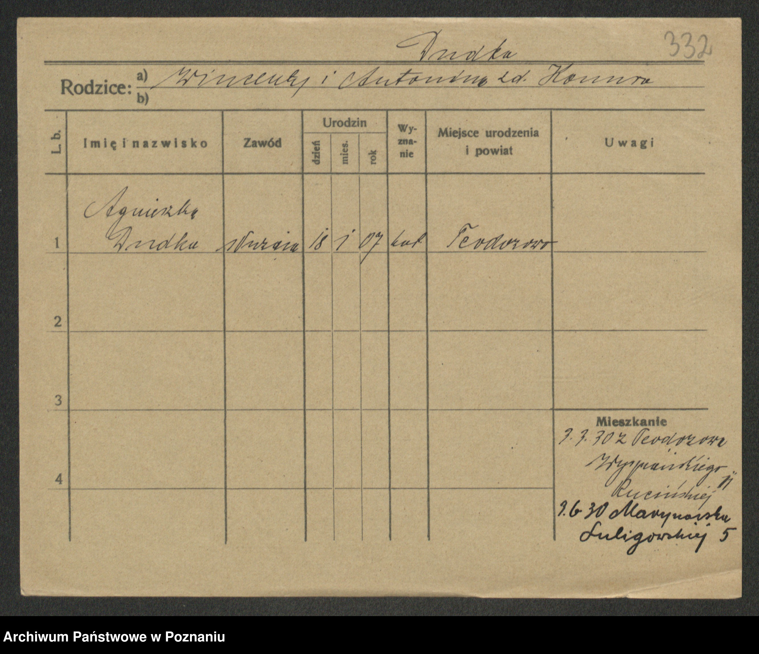 Podgląd karty osobowej dostępny jest po kliknięciu na nazwisko lub ikonkę karty. Można dokonywać powiększenia (ikony na górze) lub przechodzić między kolejnymi skanami (strzałki po bokach).