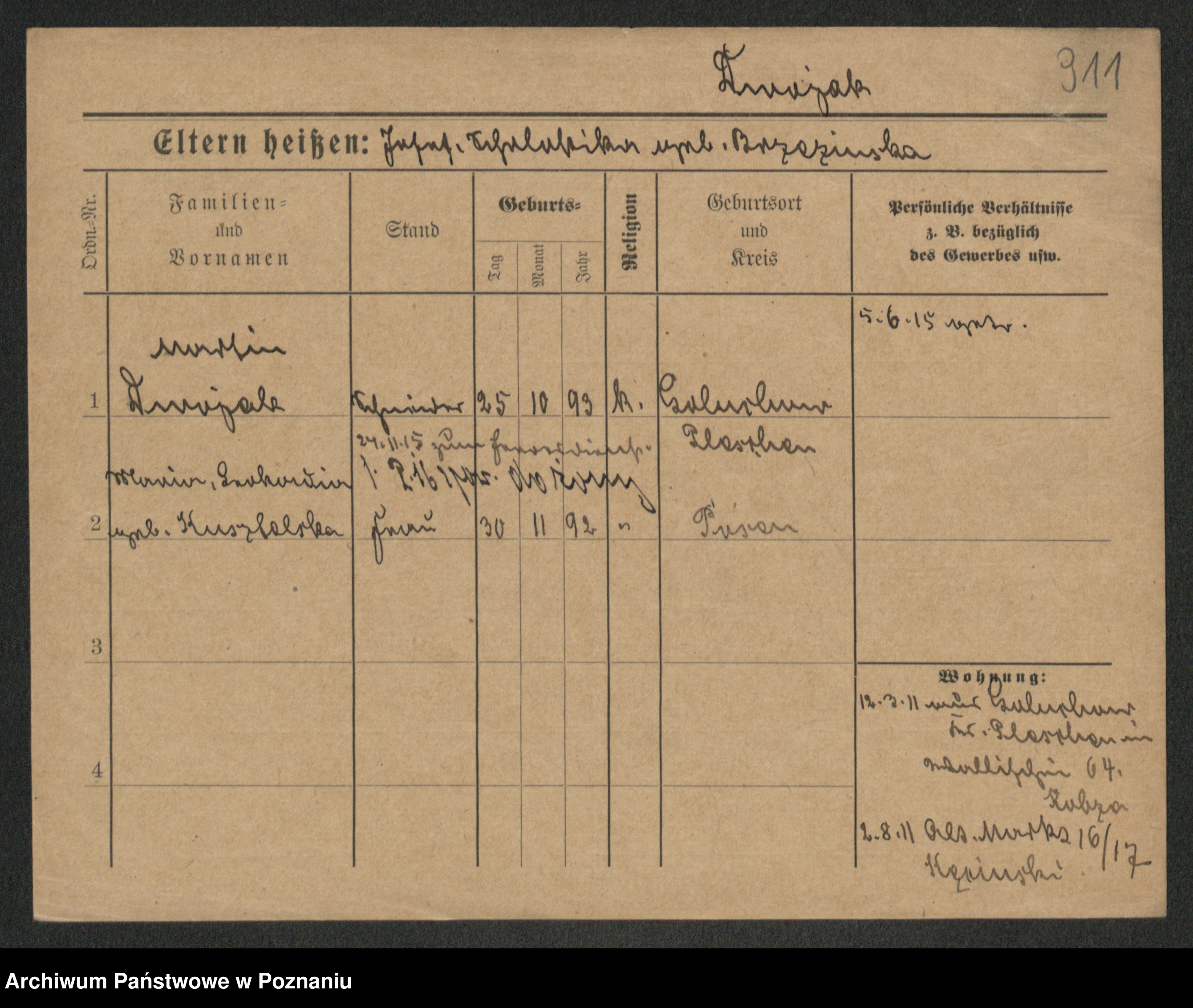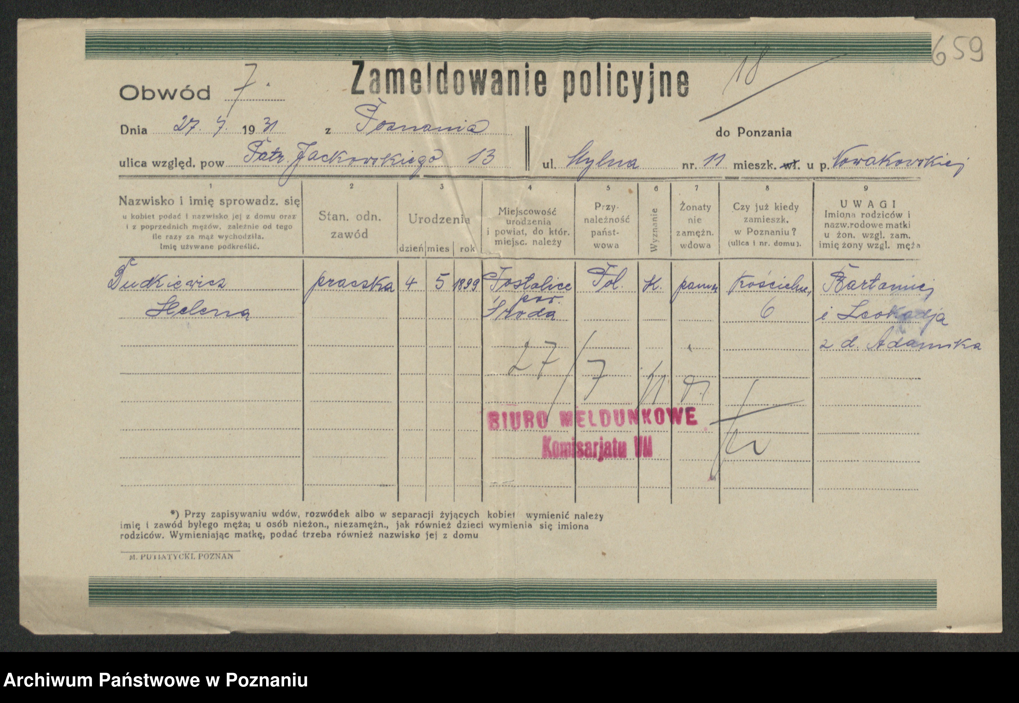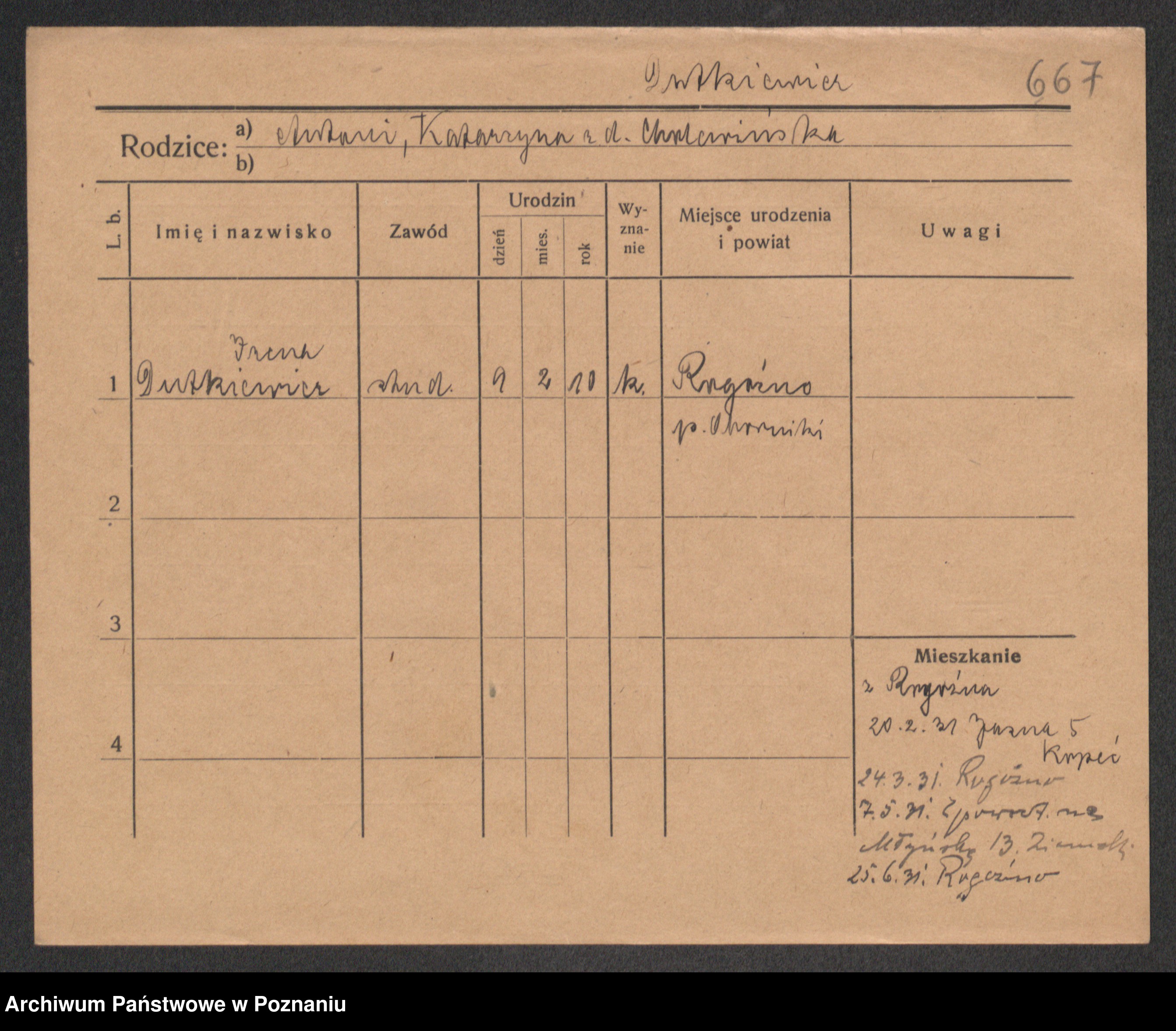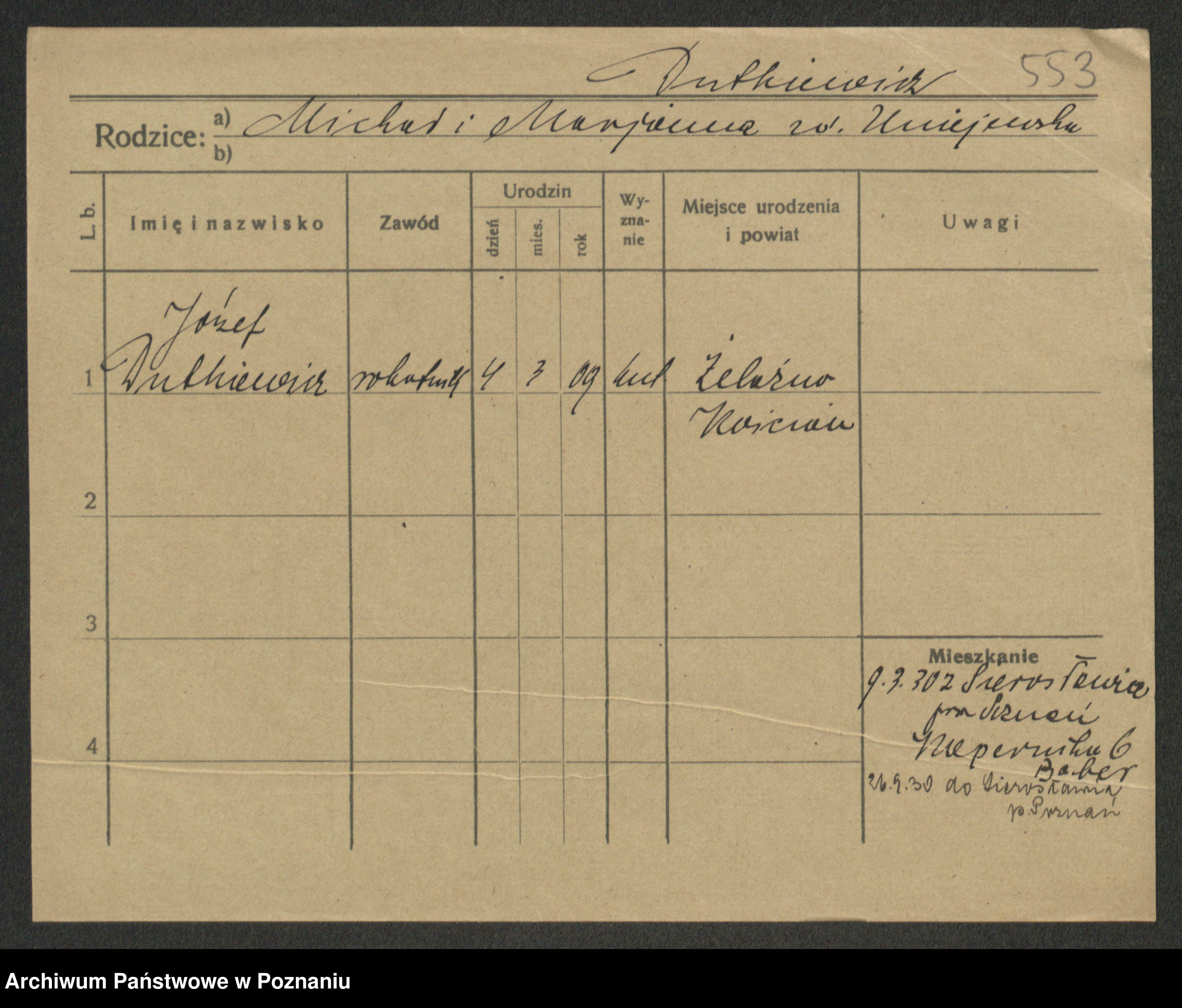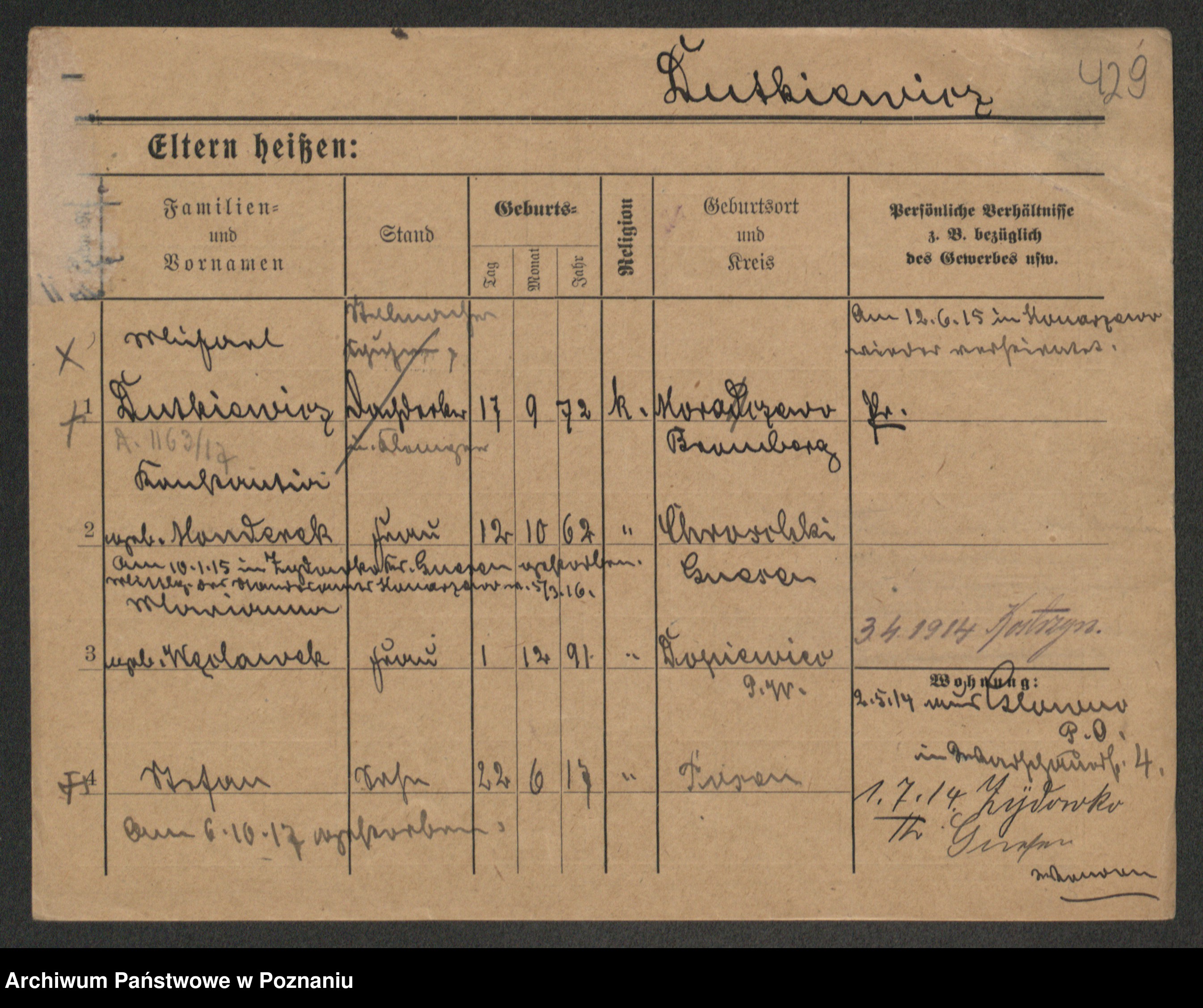 Podgląd karty osobowej dostępny jest po kliknięciu na nazwisko lub ikonkę karty. Można dokonywać powiększenia (ikony na górze) lub przechodzić między kolejnymi skanami (strzałki po bokach).