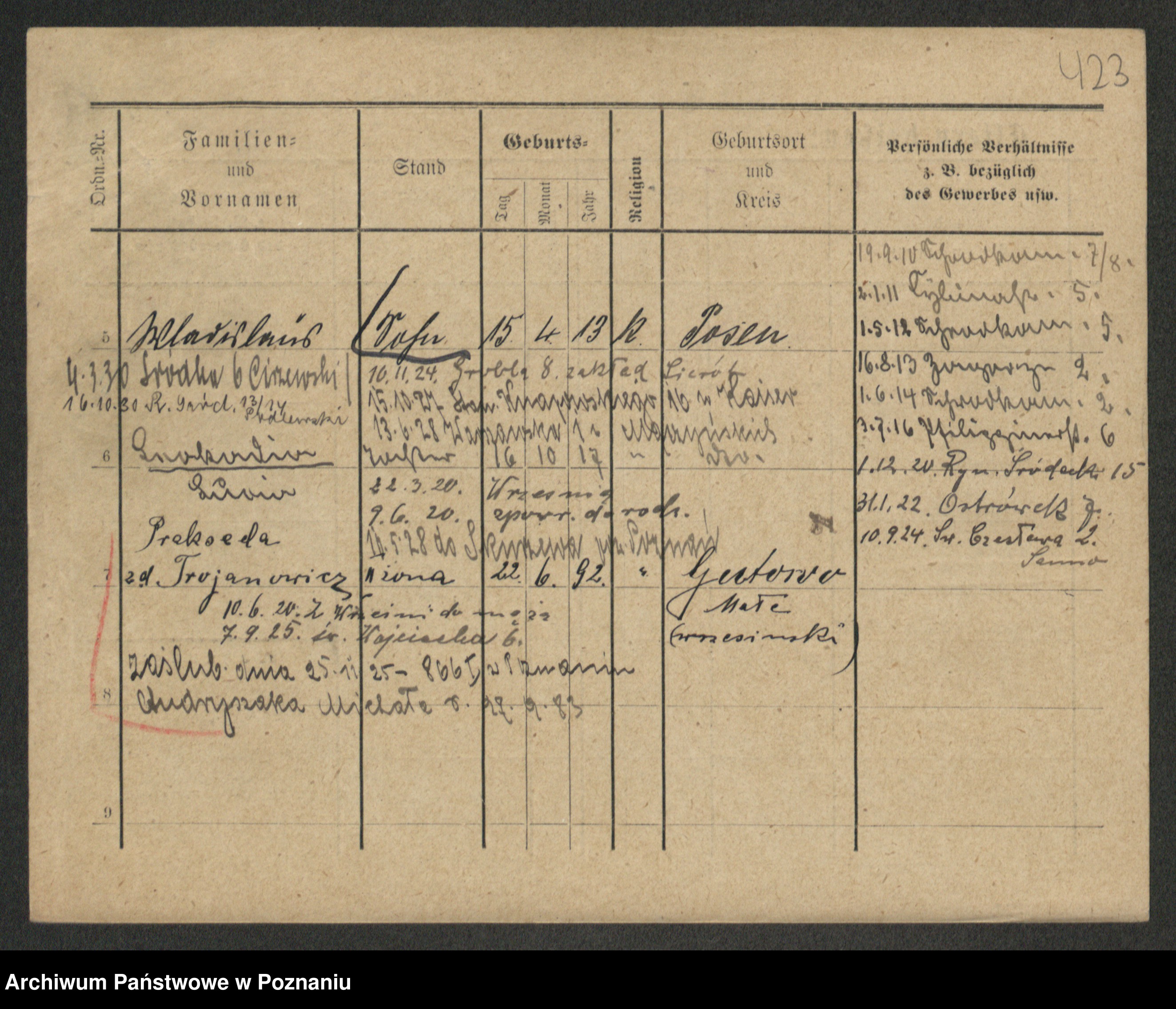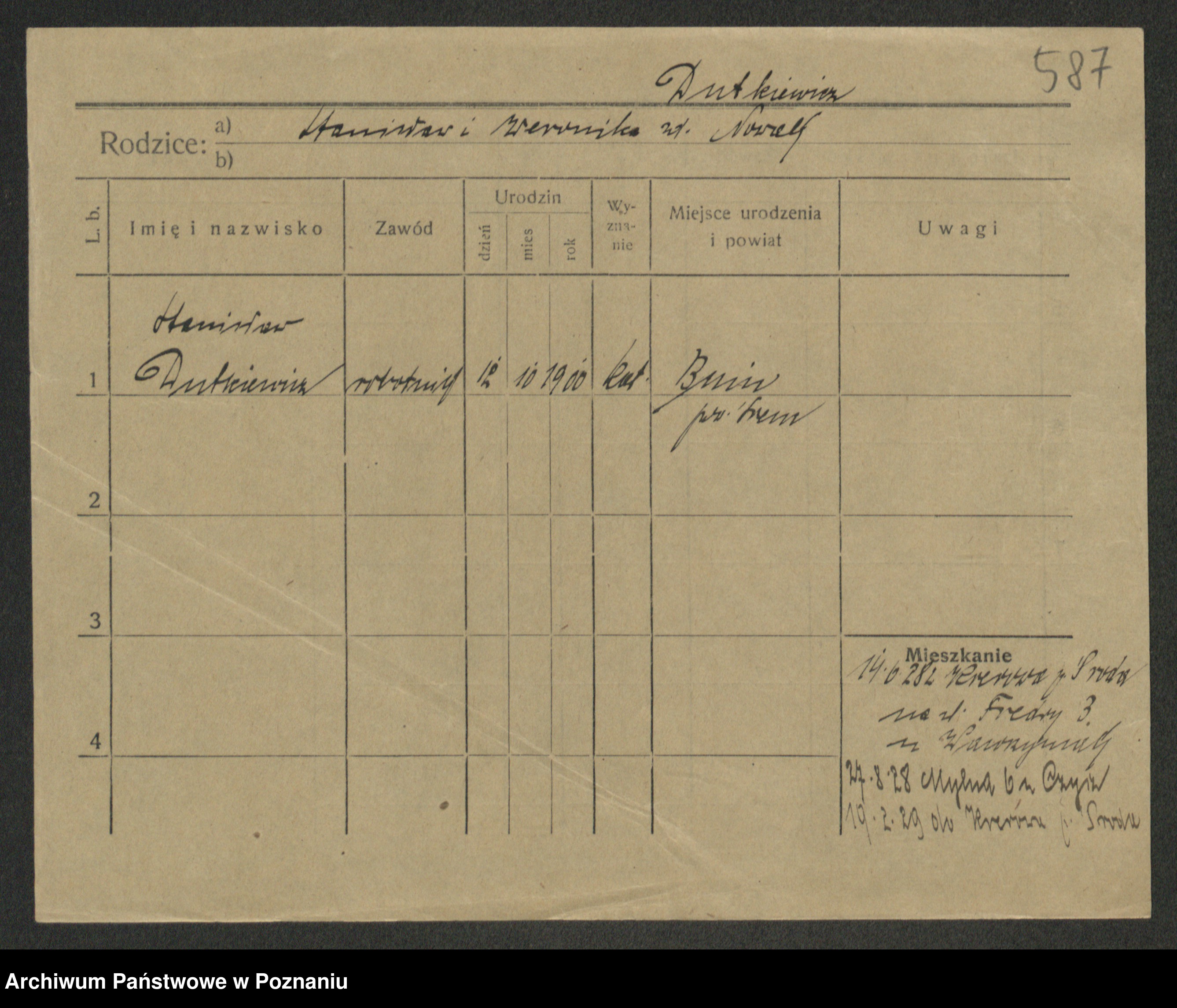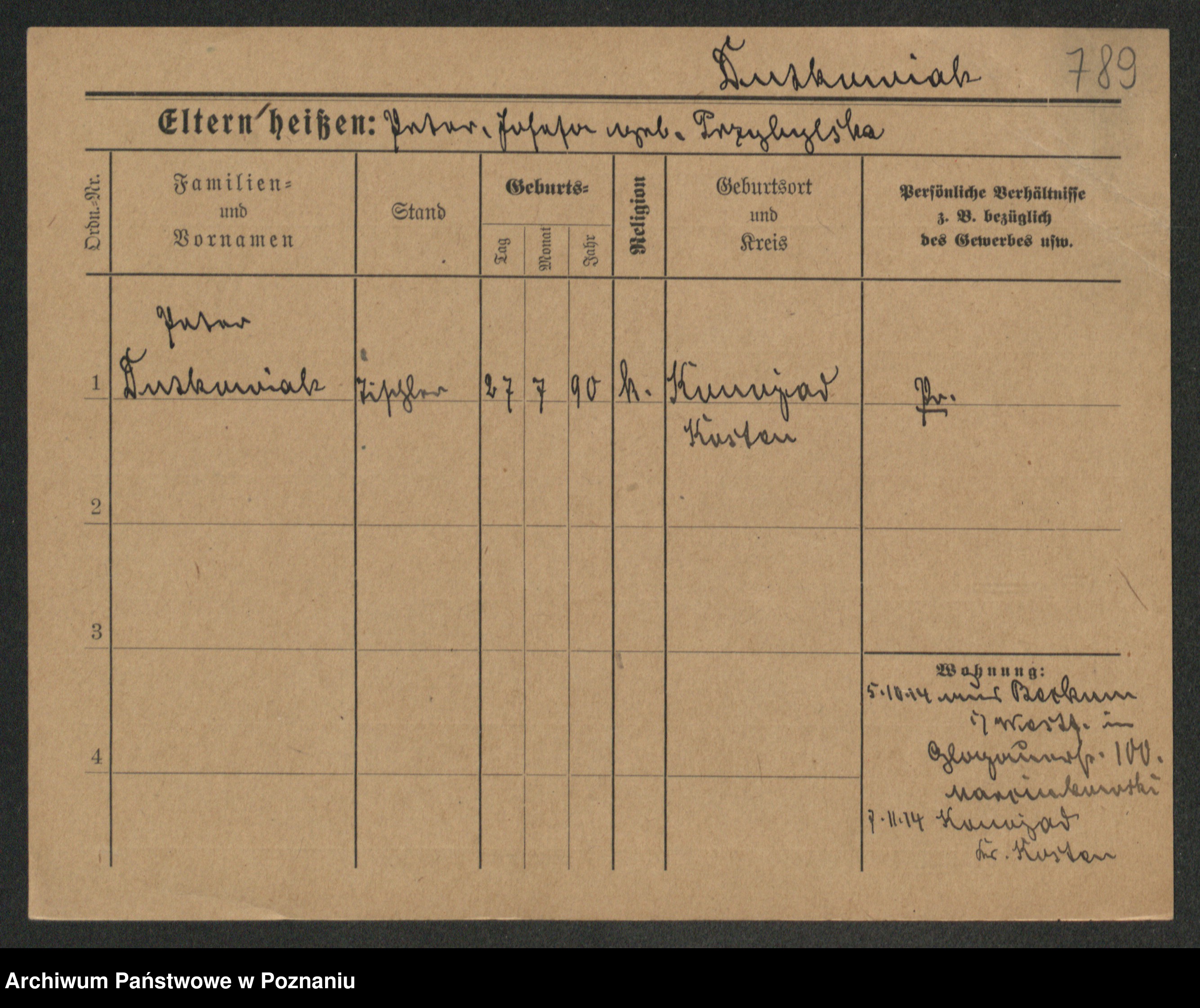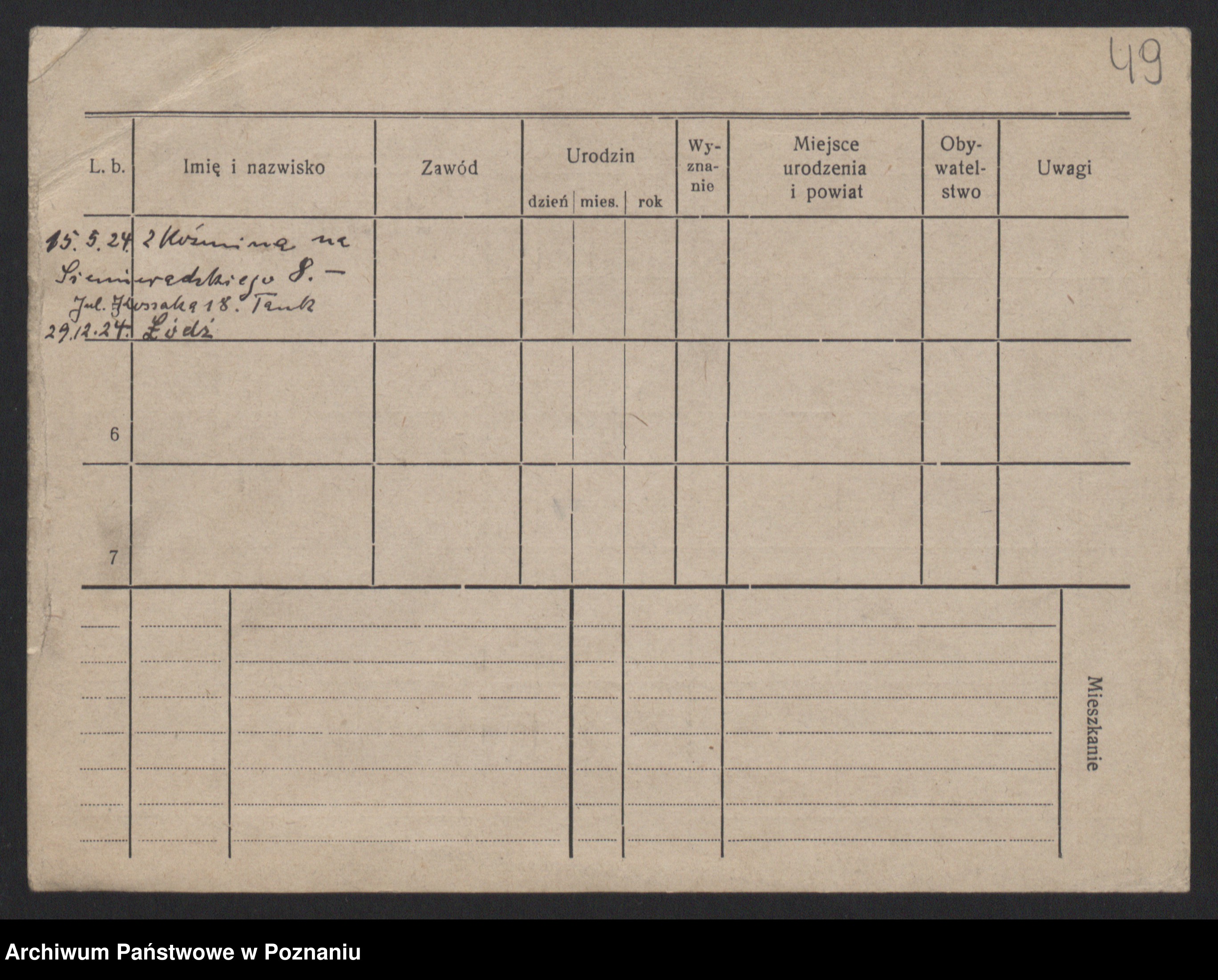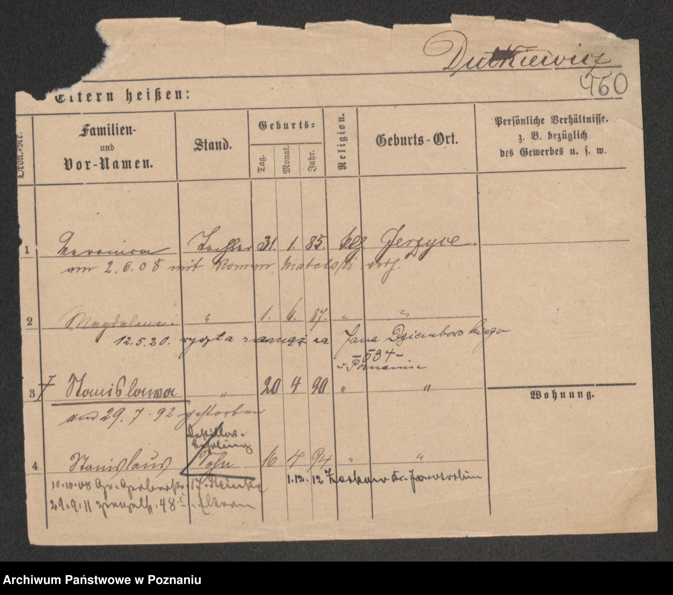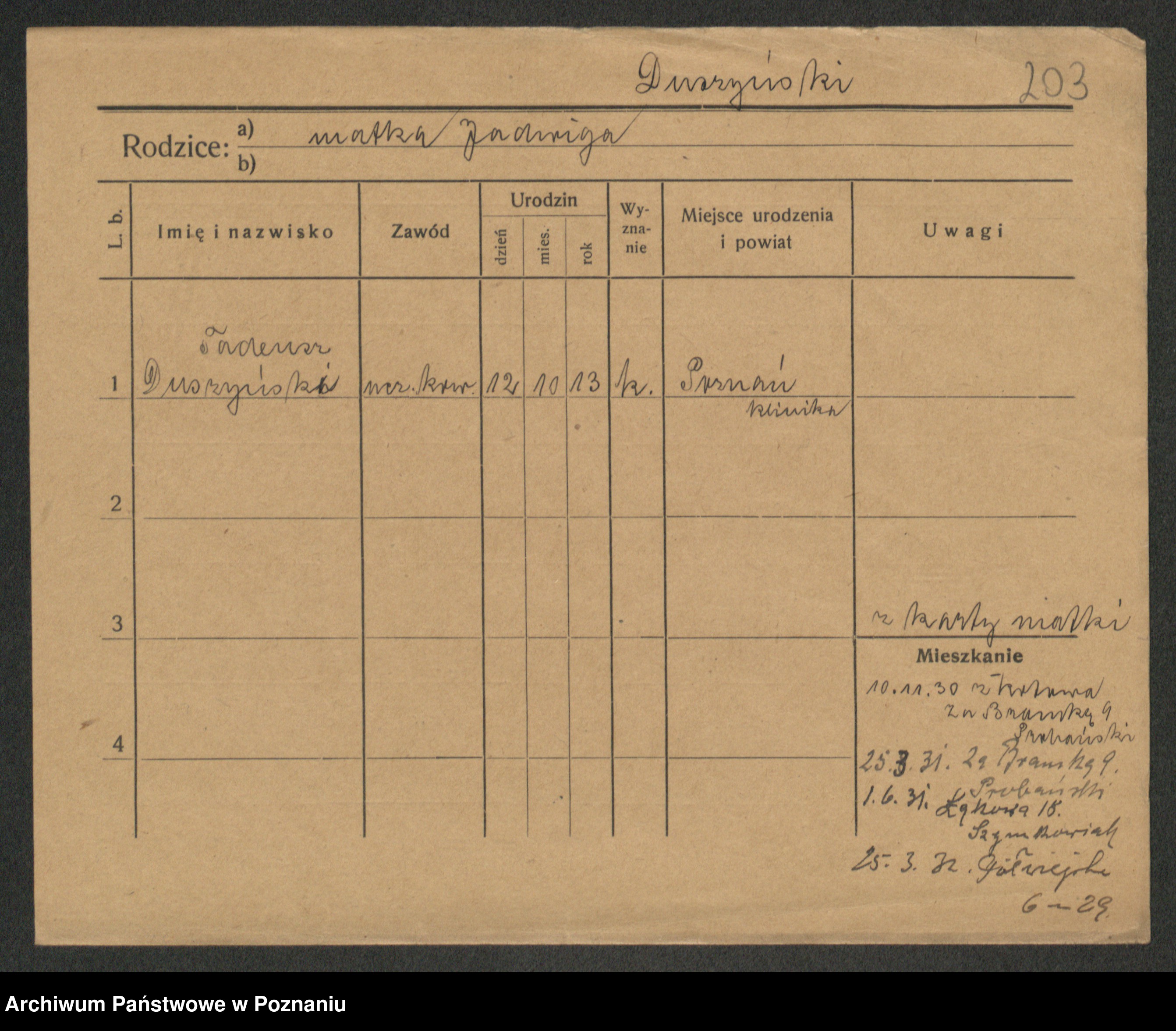 Podgląd karty osobowej dostępny jest po kliknięciu na nazwisko lub ikonkę karty. Można dokonywać powiększenia (ikony na górze) lub przechodzić między kolejnymi skanami (strzałki po bokach).