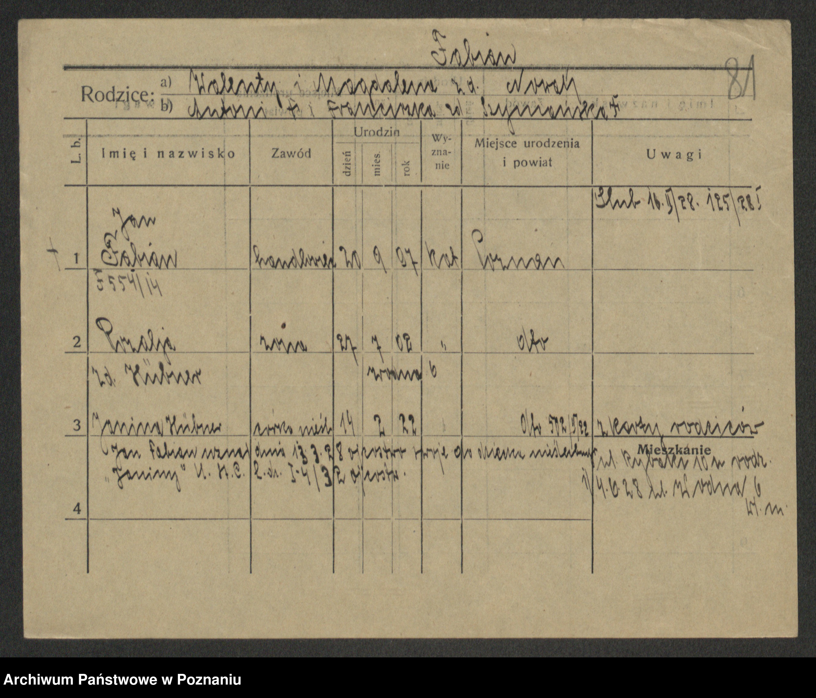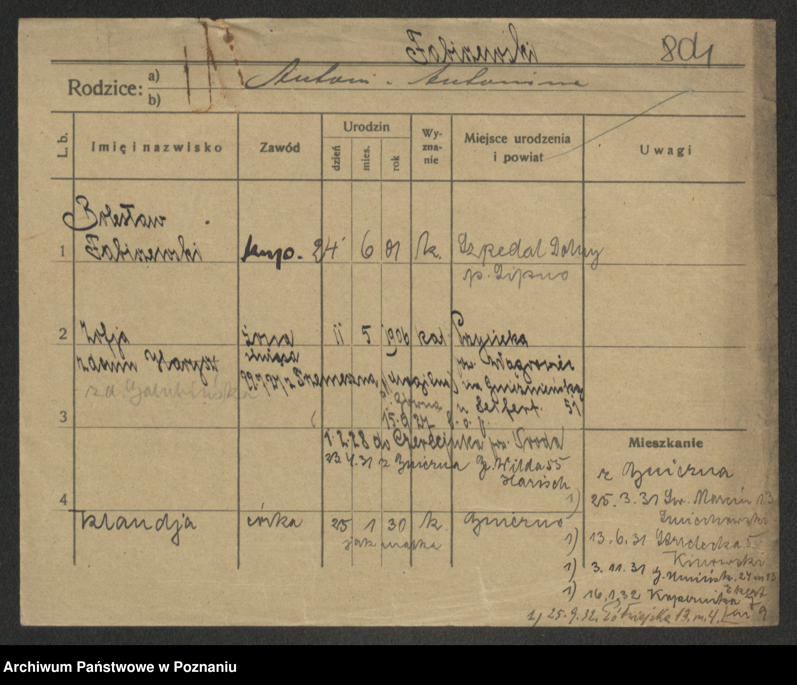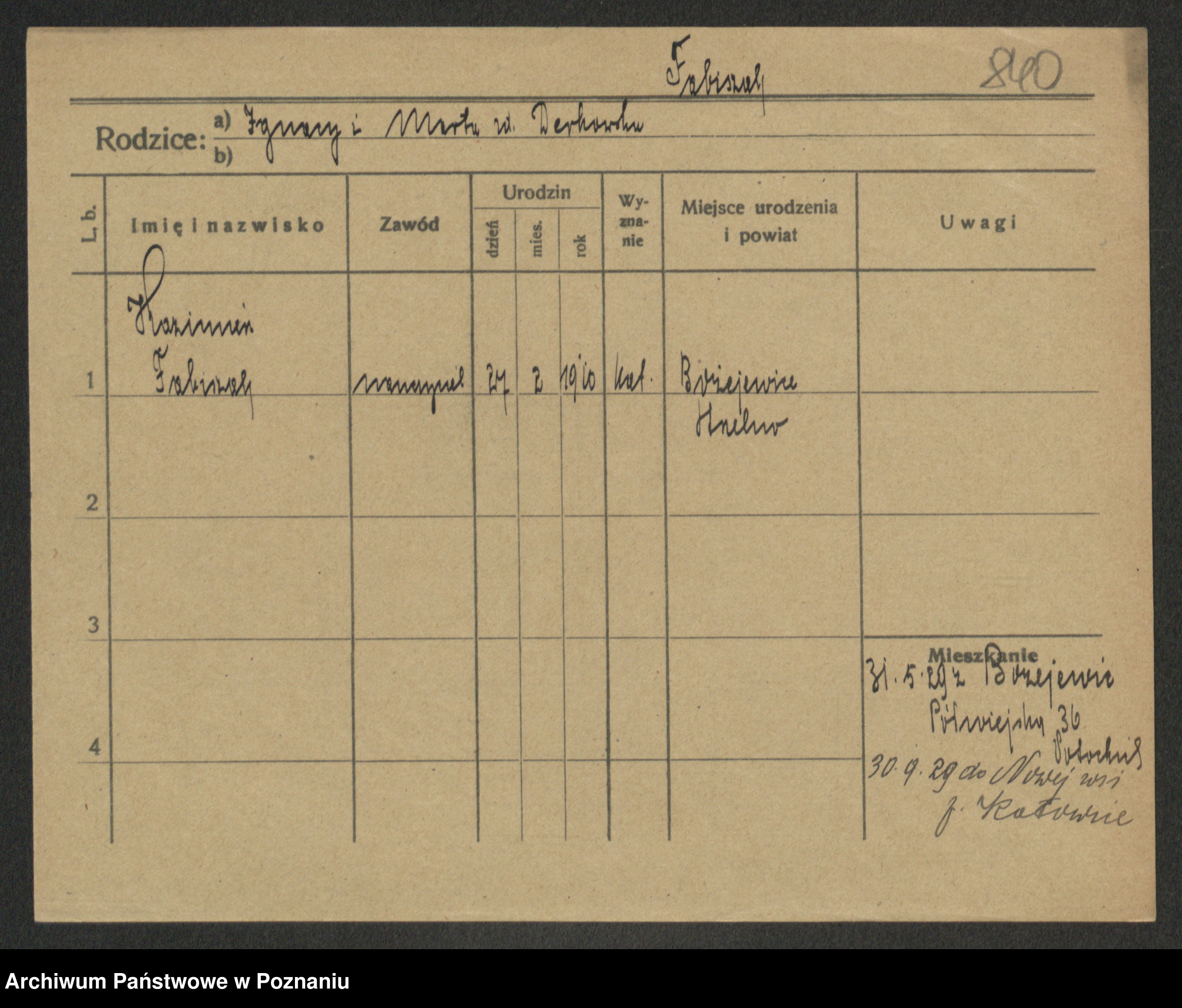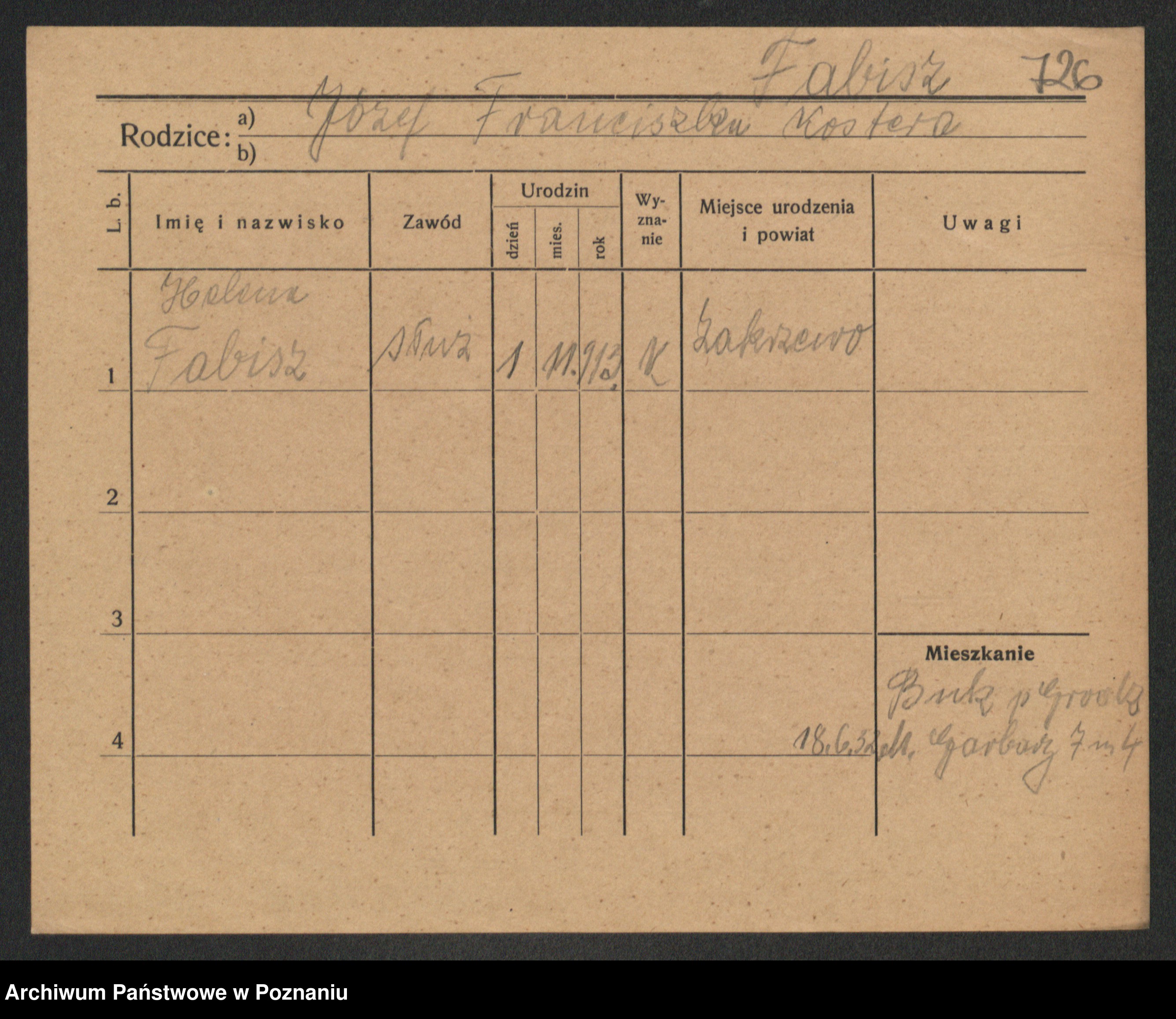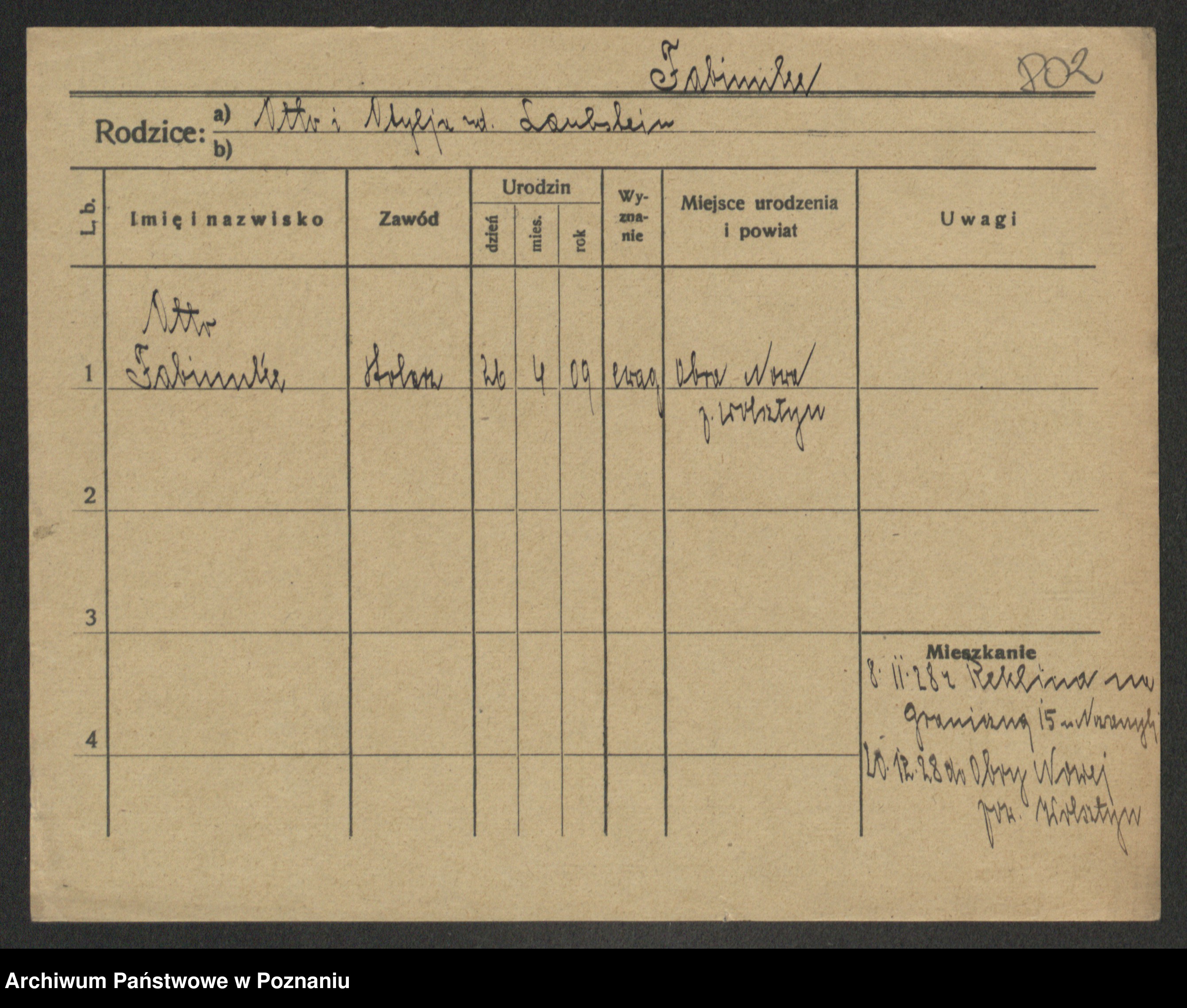 Podgląd karty osobowej dostępny jest po kliknięciu na nazwisko lub ikonkę karty. Można dokonywać powiększenia (ikony na górze) lub przechodzić między kolejnymi skanami (strzałki po bokach).