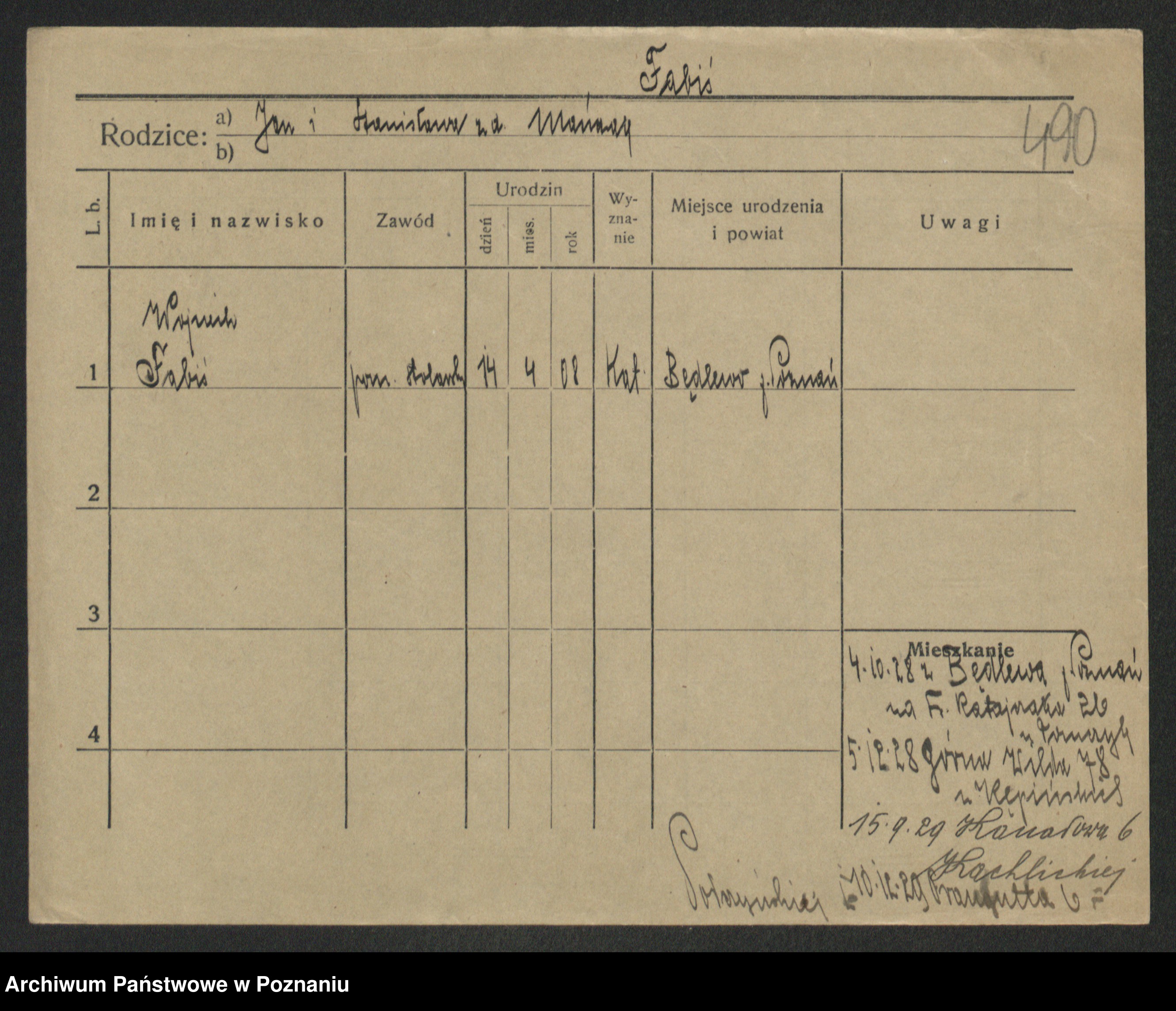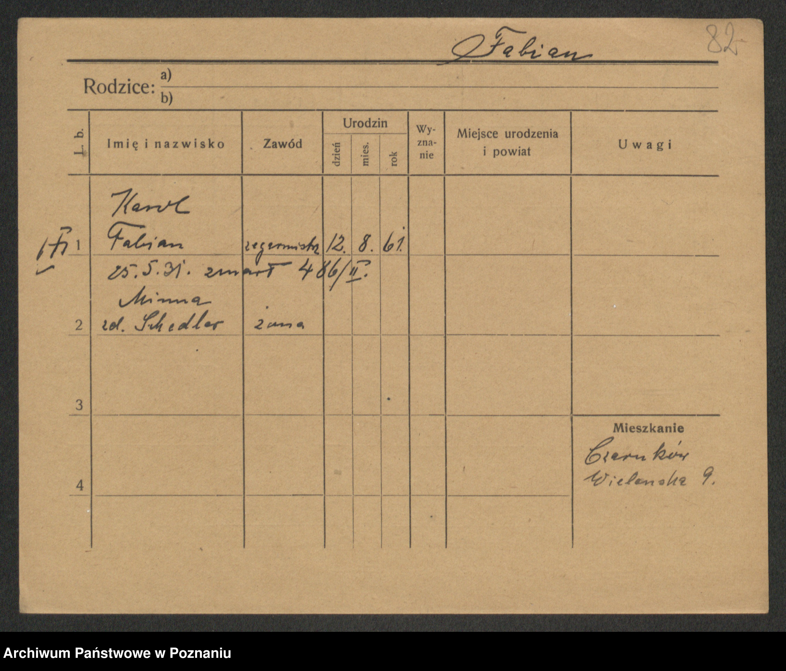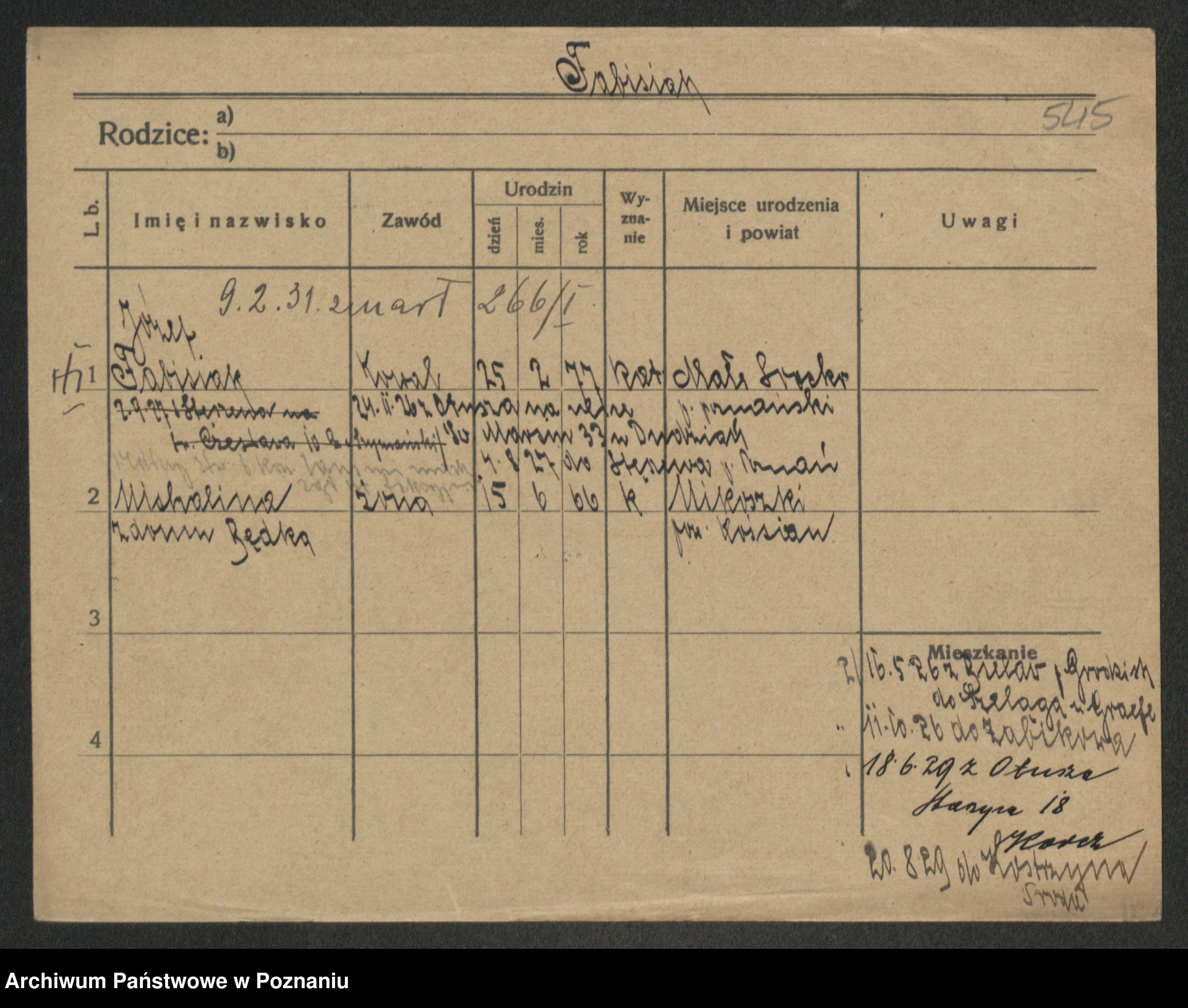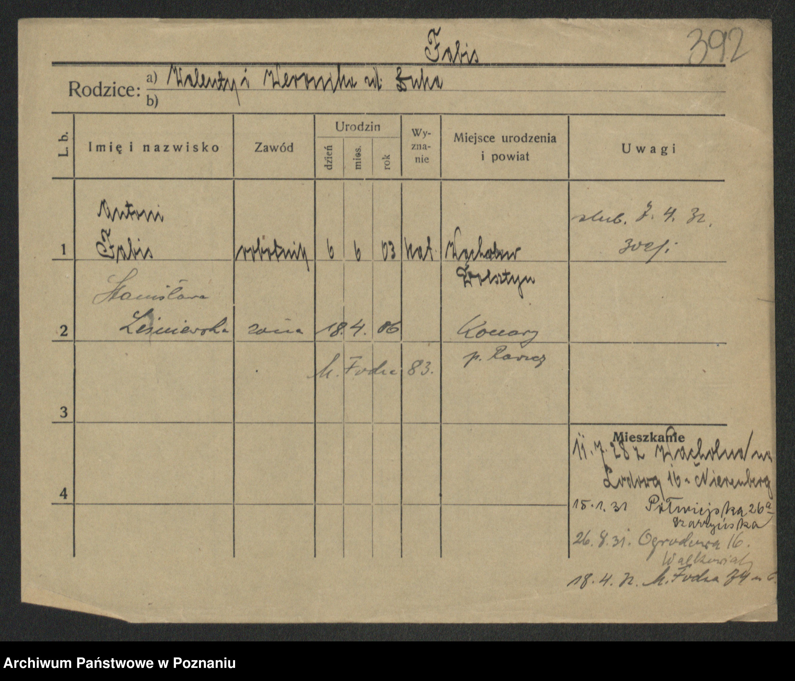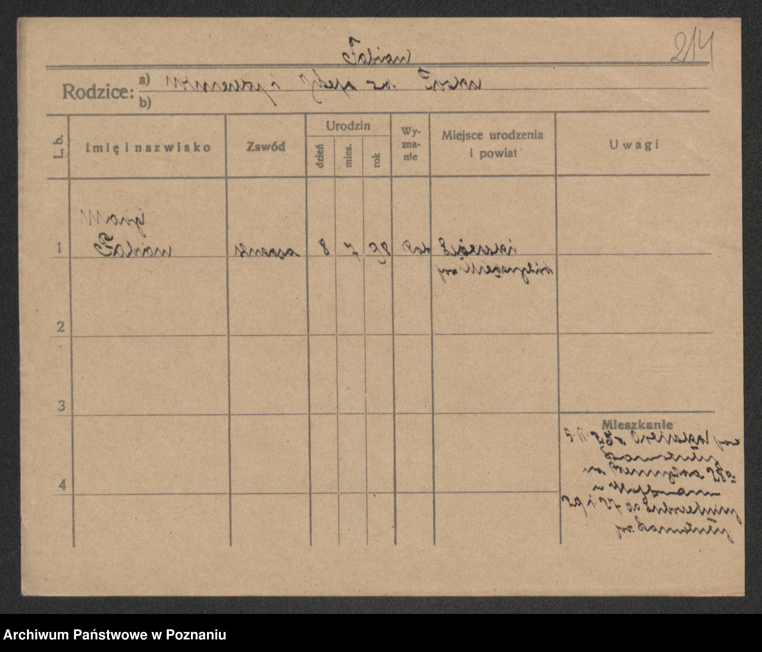Podgląd karty osobowej dostępny jest po kliknięciu na nazwisko lub ikonkę karty. Można dokonywać powiększenia (ikony na górze) lub przechodzić między kolejnymi skanami (strzałki po bokach).