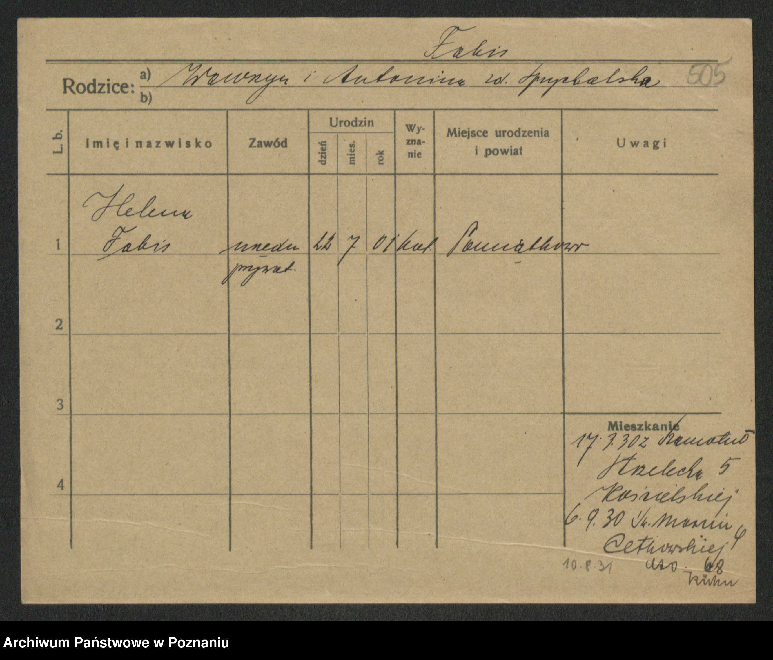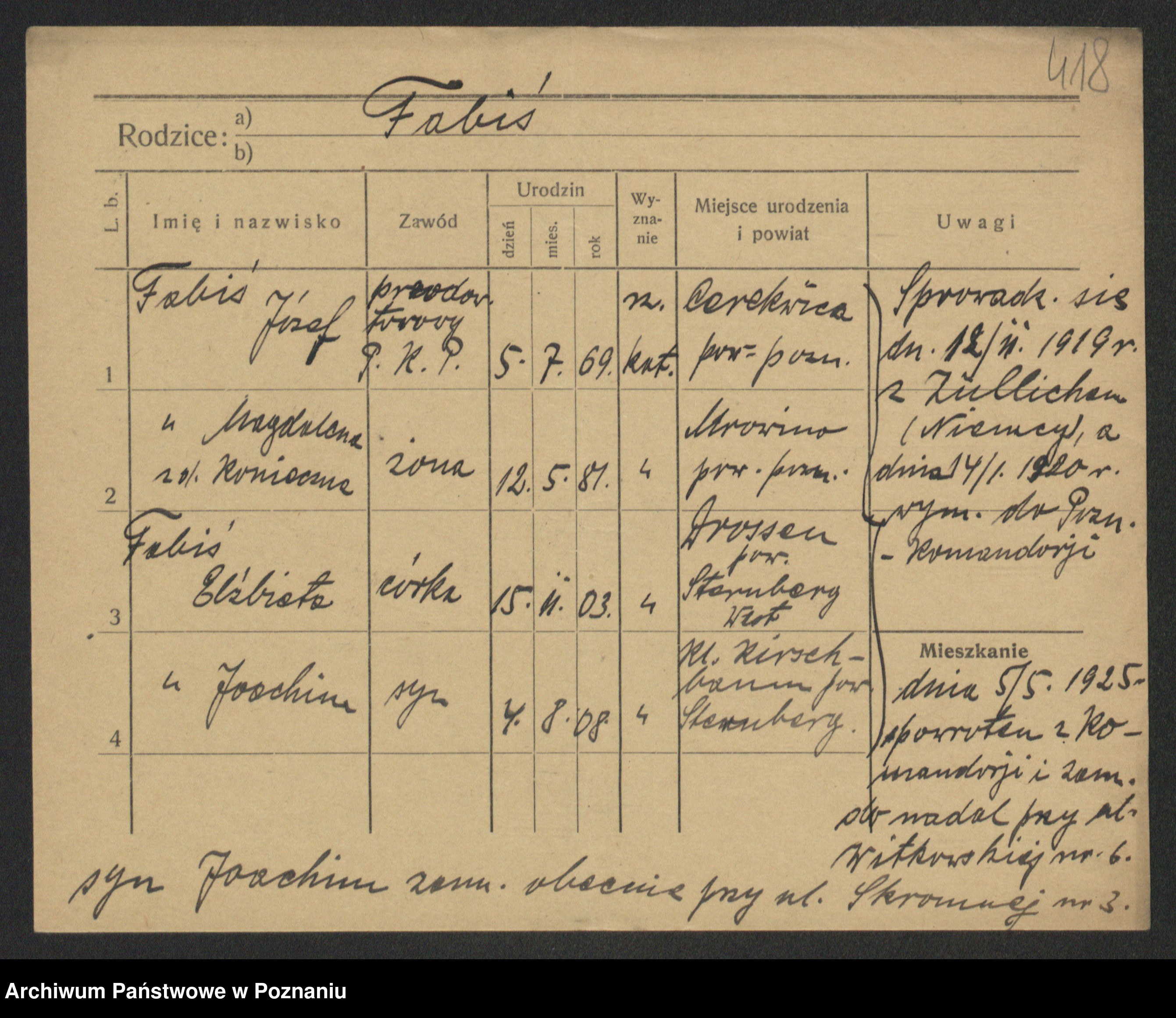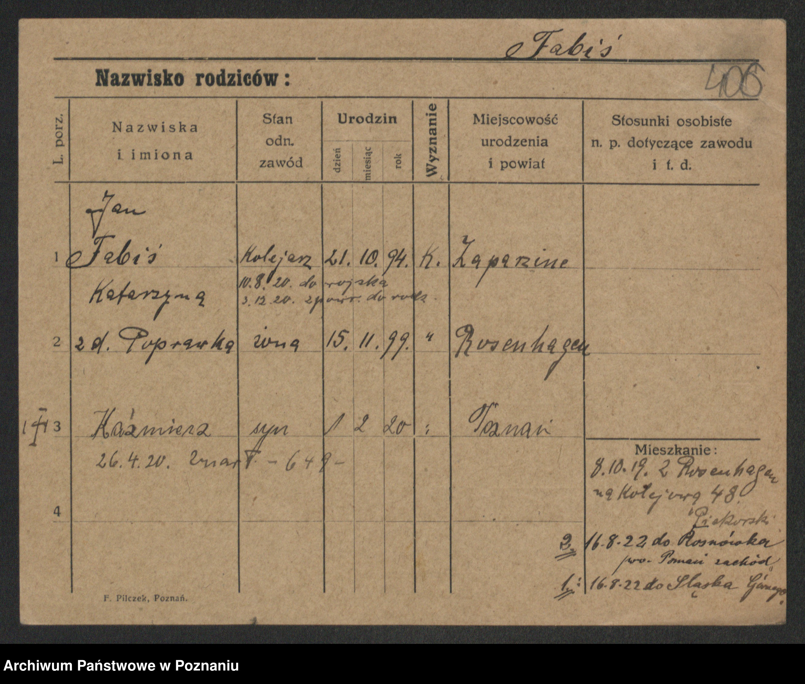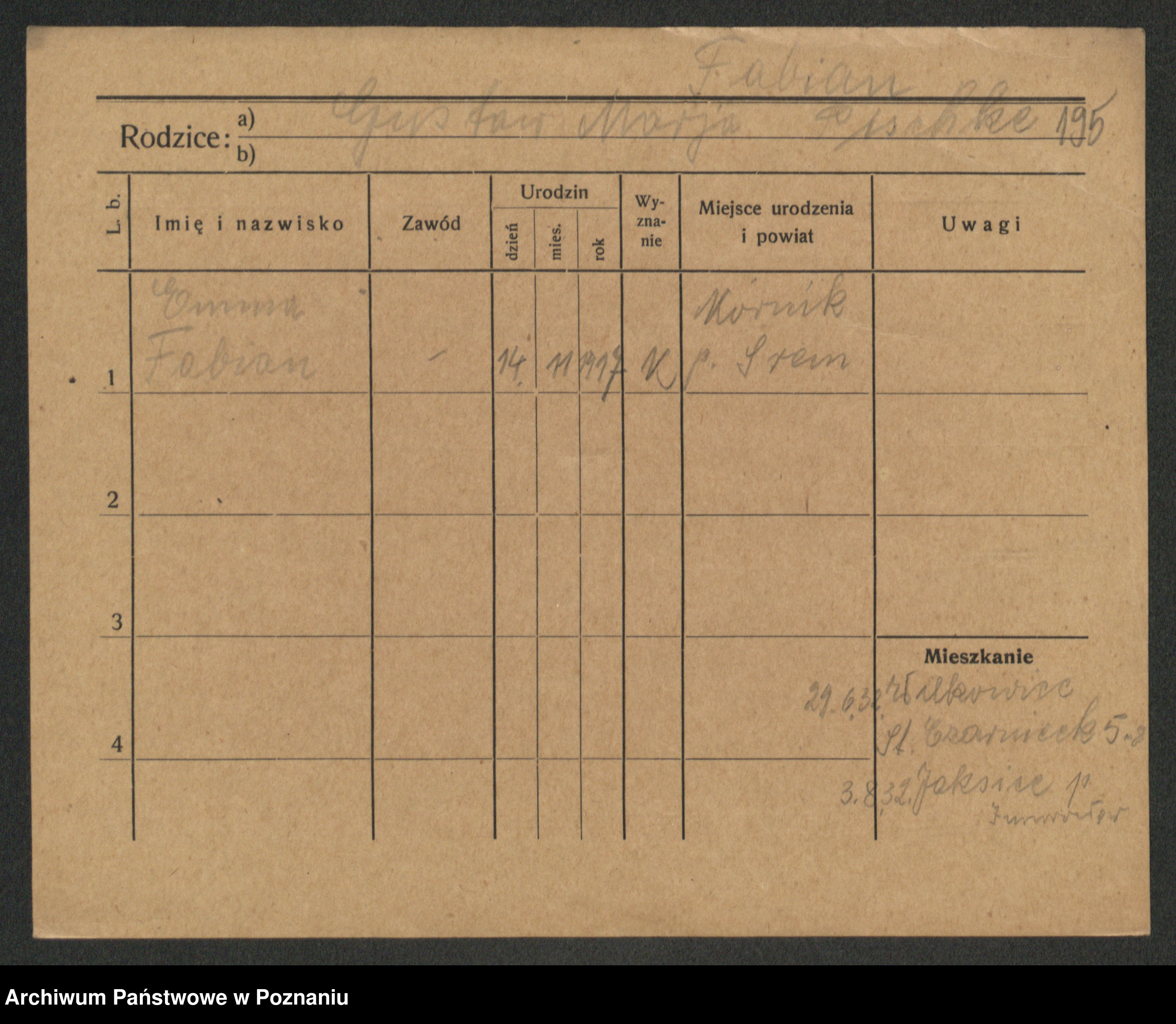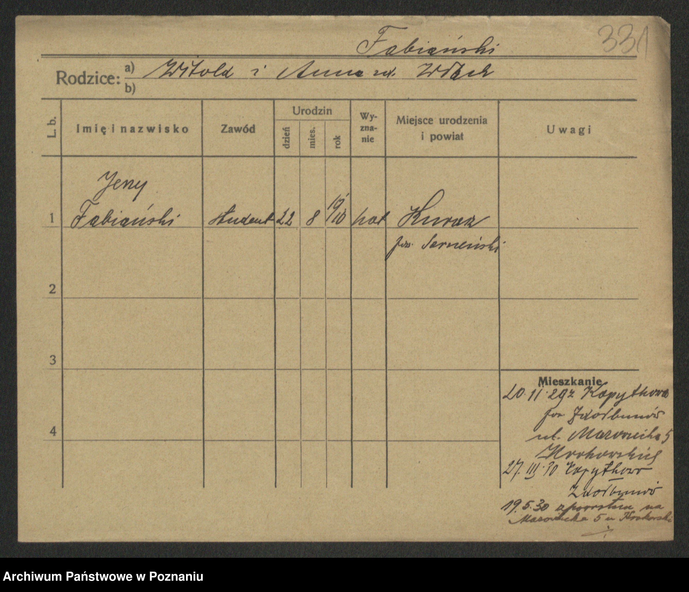 Podgląd karty osobowej dostępny jest po kliknięciu na nazwisko lub ikonkę karty. Można dokonywać powiększenia (ikony na górze) lub przechodzić między kolejnymi skanami (strzałki po bokach).