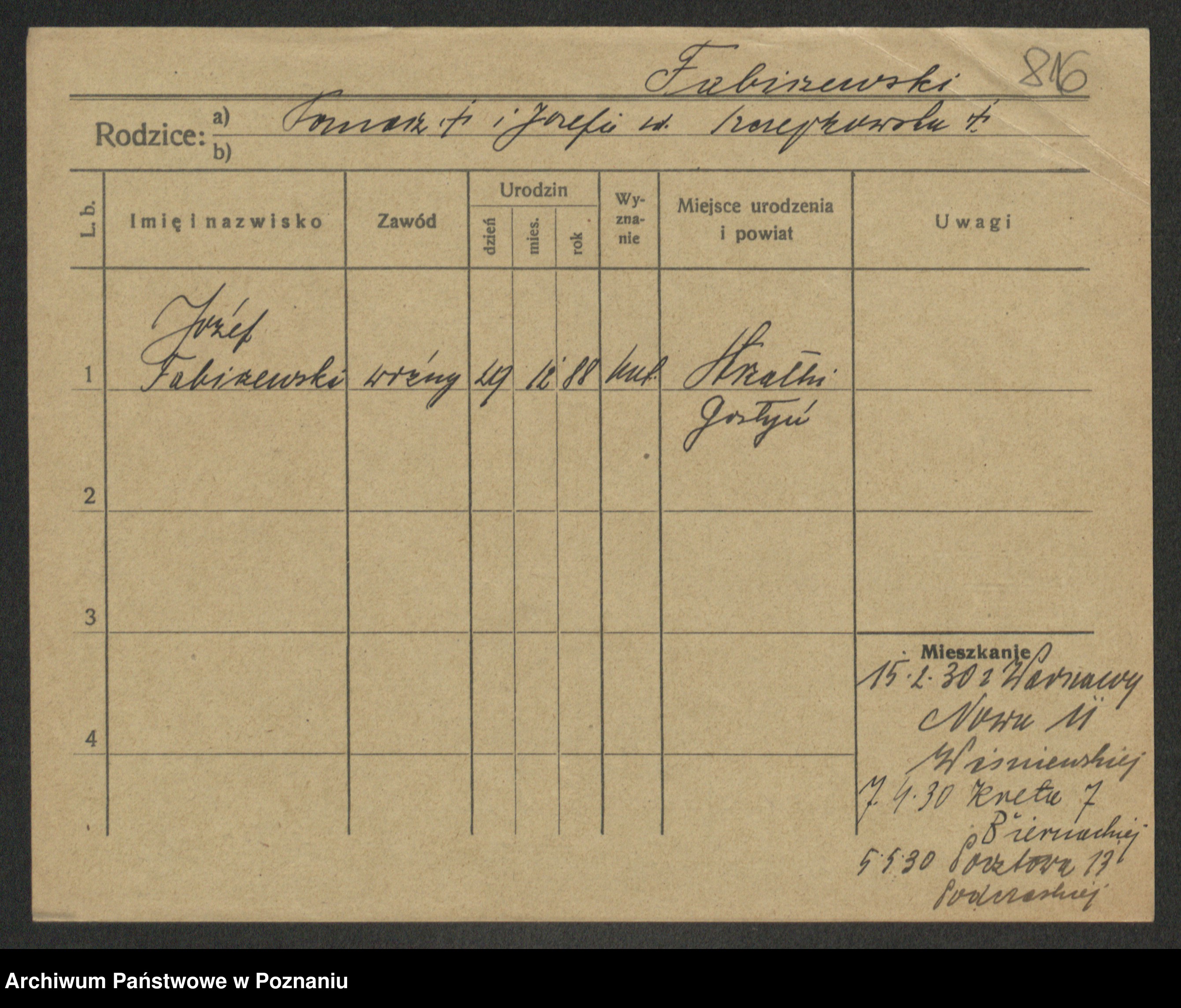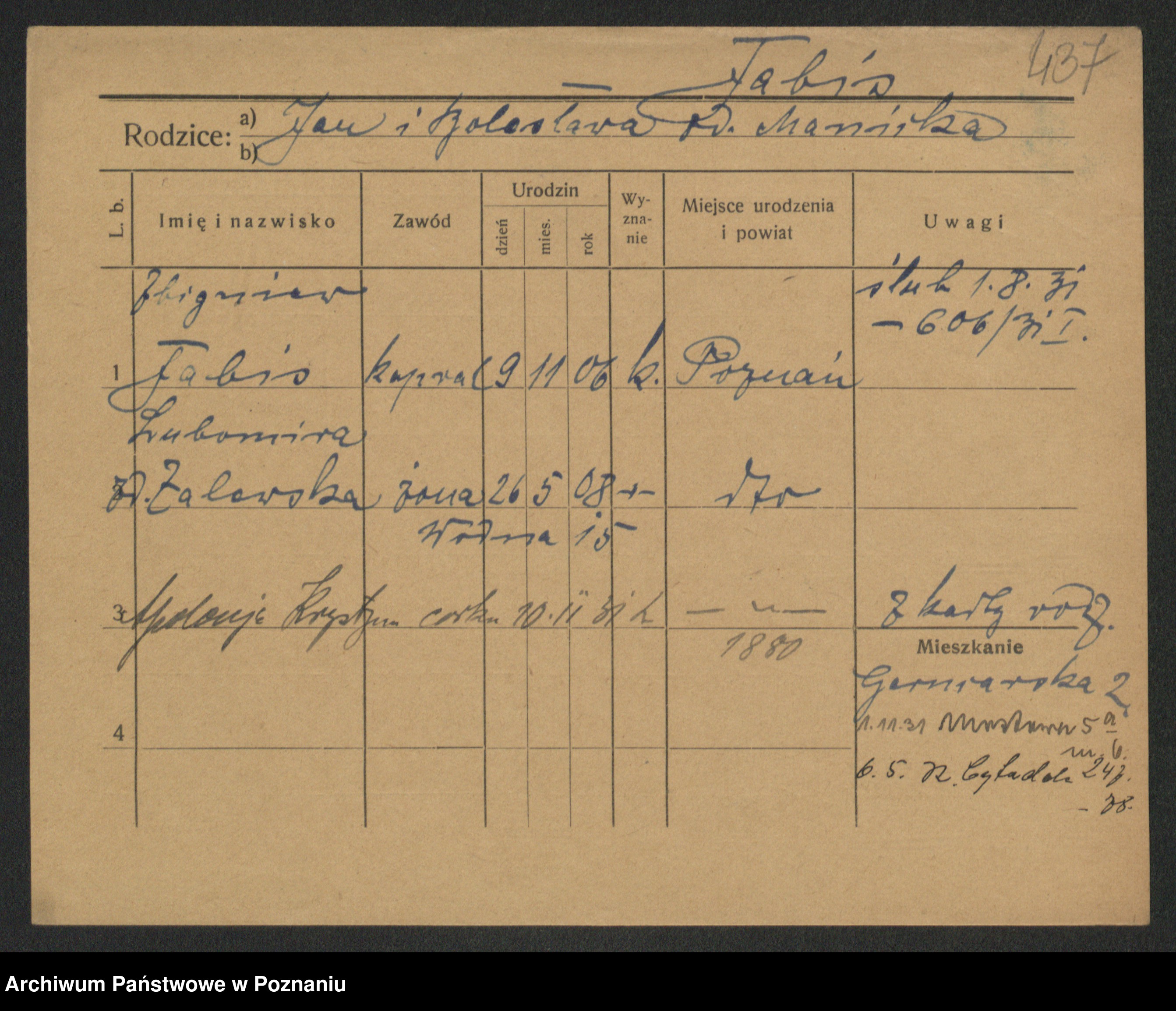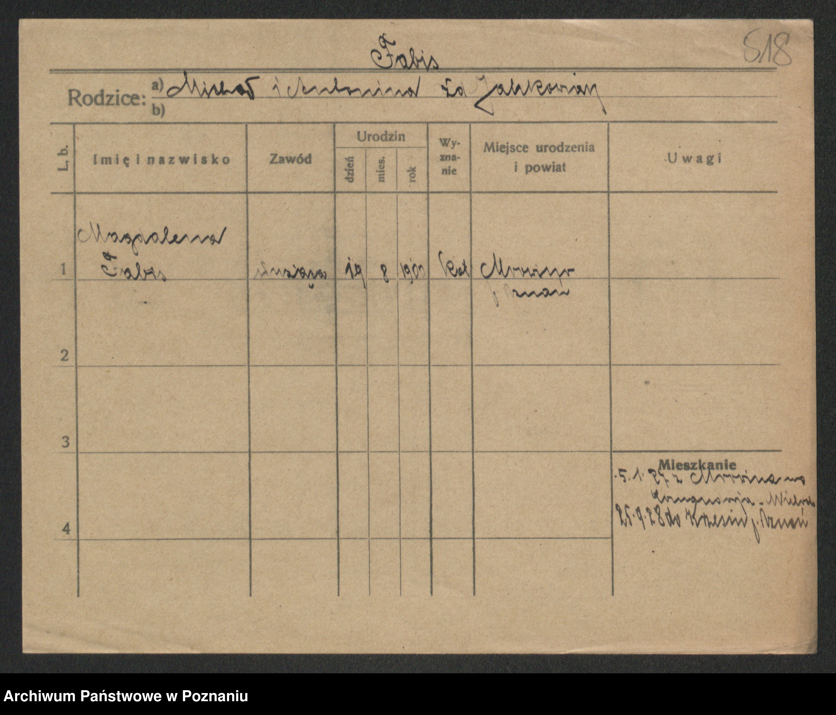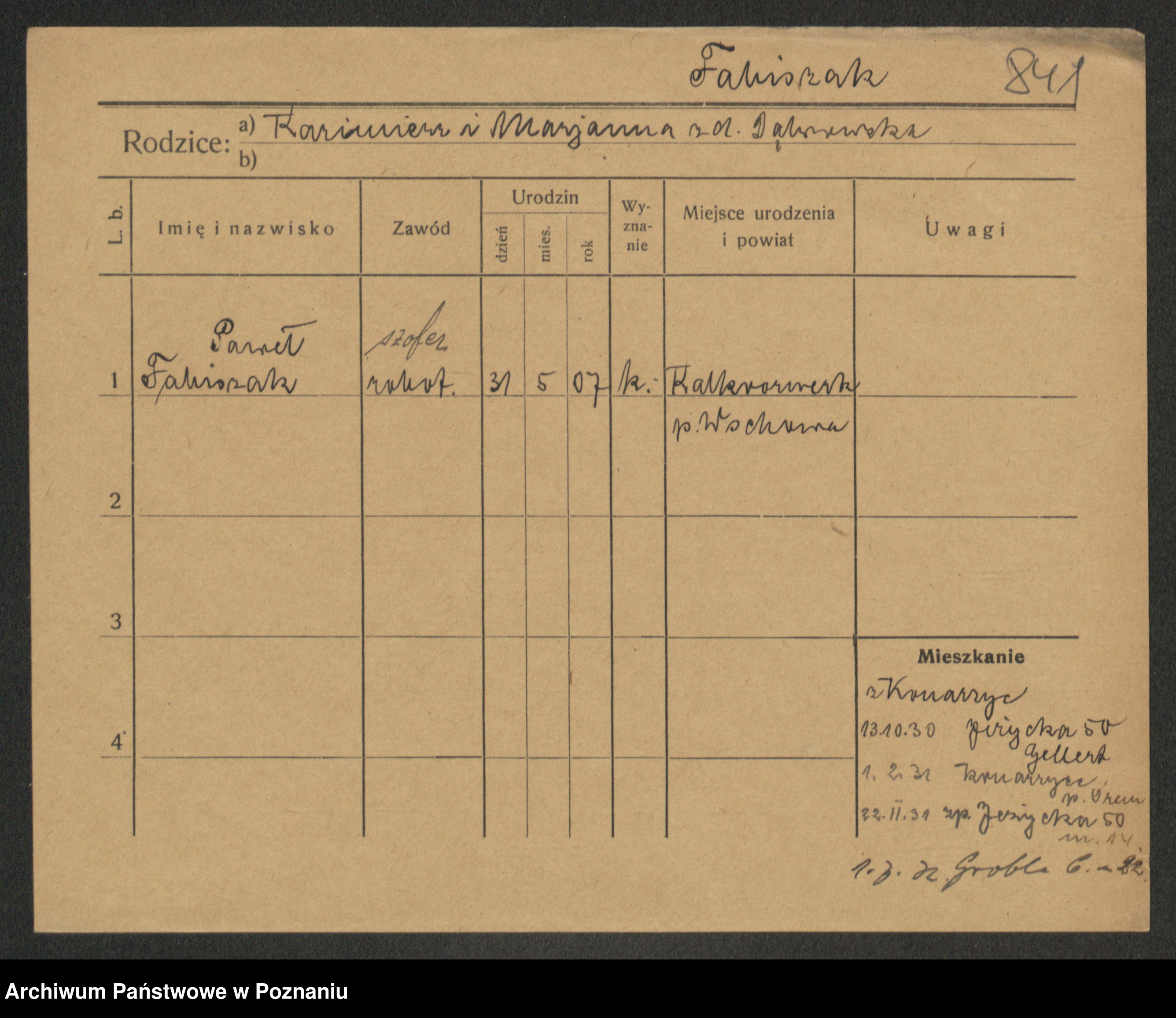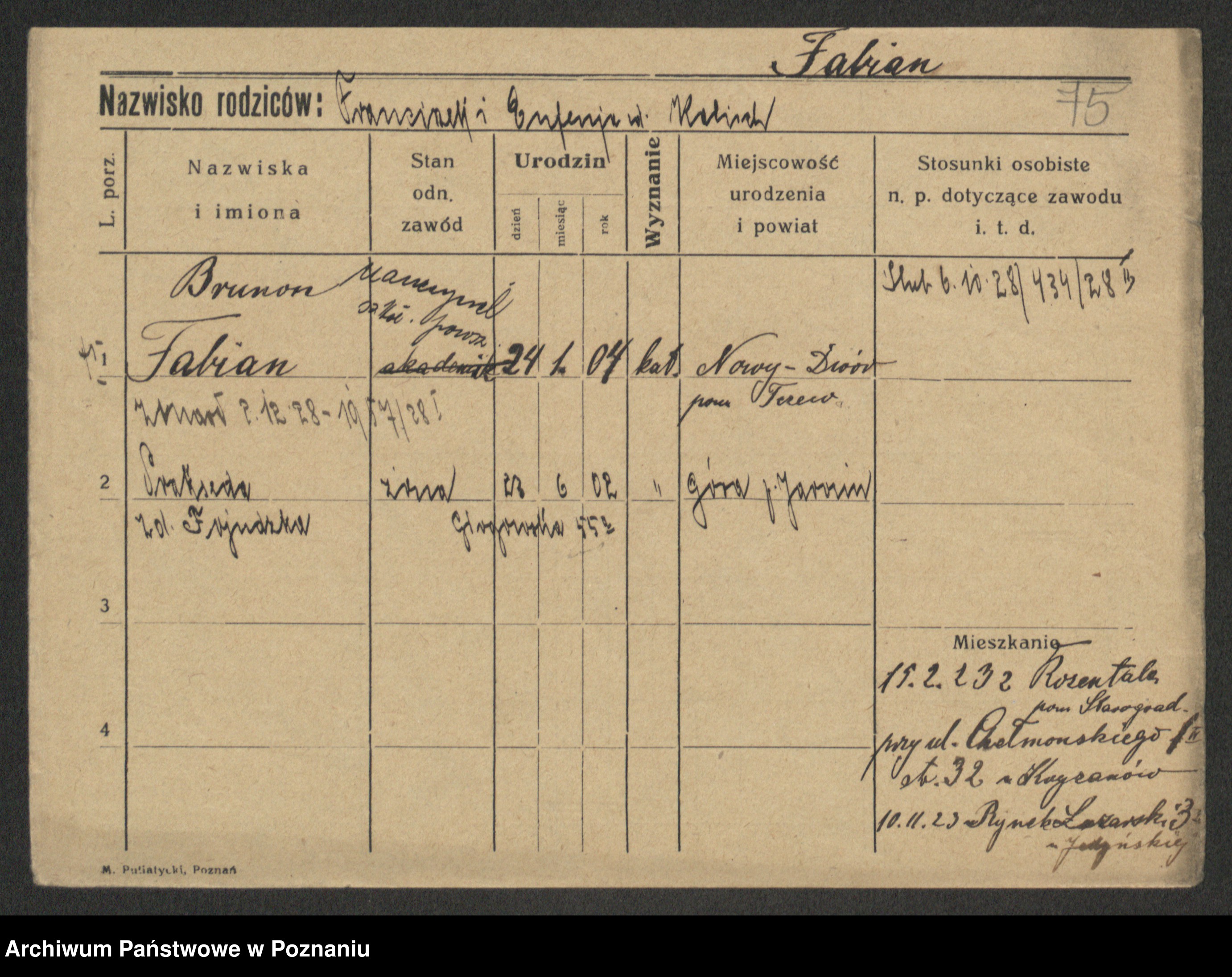 Podgląd karty osobowej dostępny jest po kliknięciu na nazwisko lub ikonkę karty. Można dokonywać powiększenia (ikony na górze) lub przechodzić między kolejnymi skanami (strzałki po bokach).